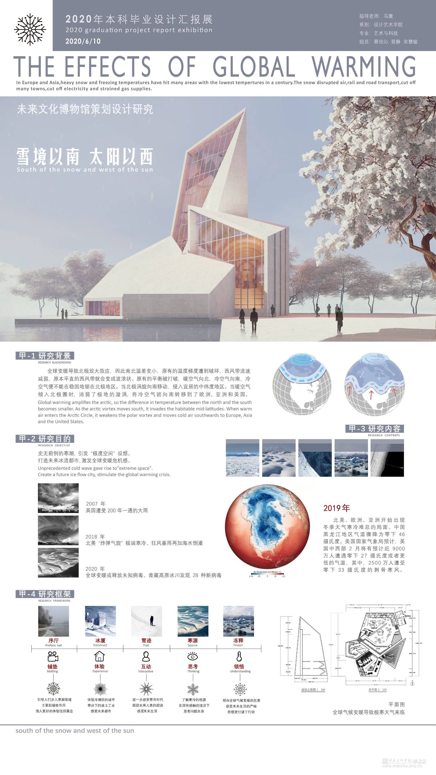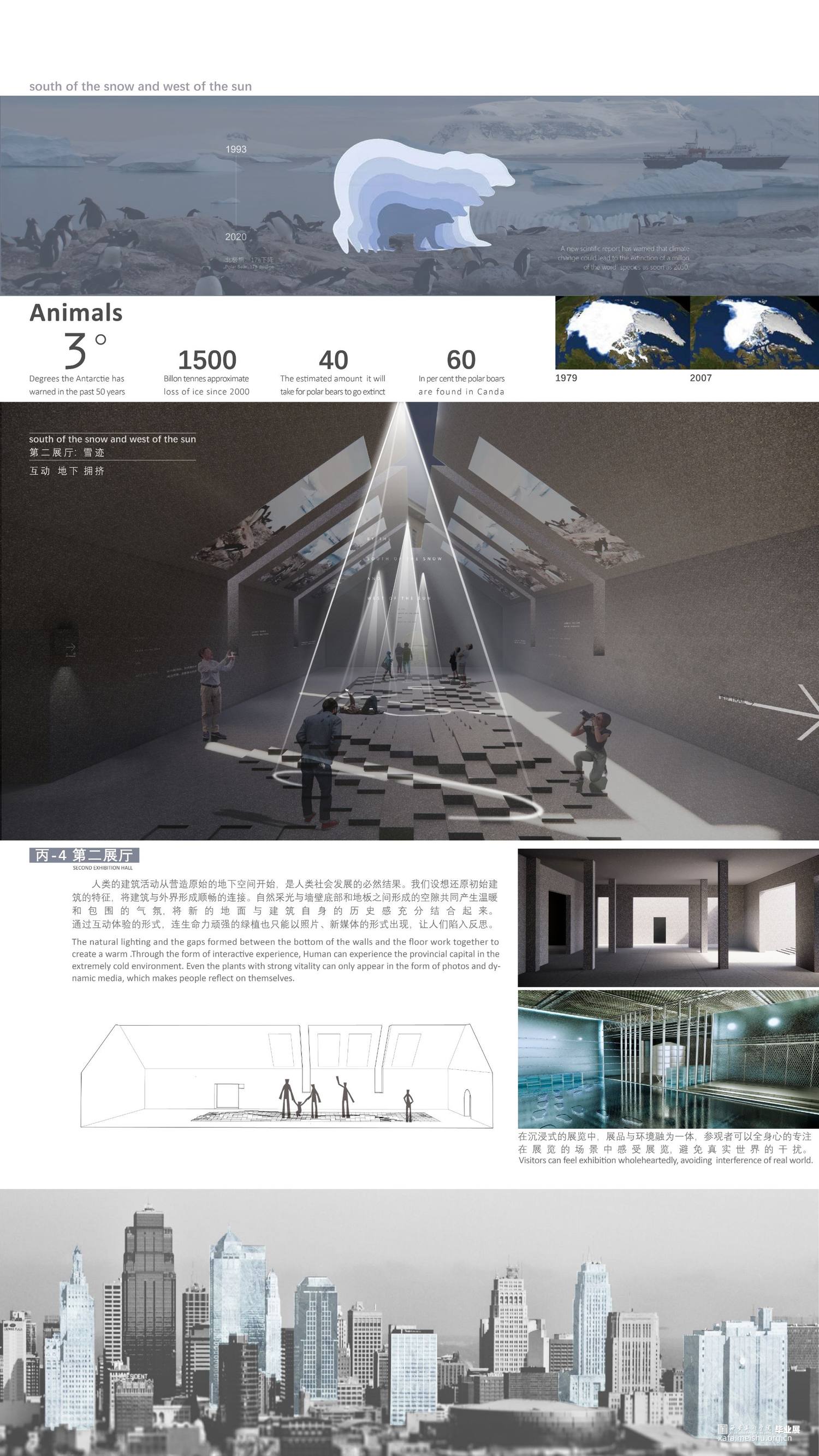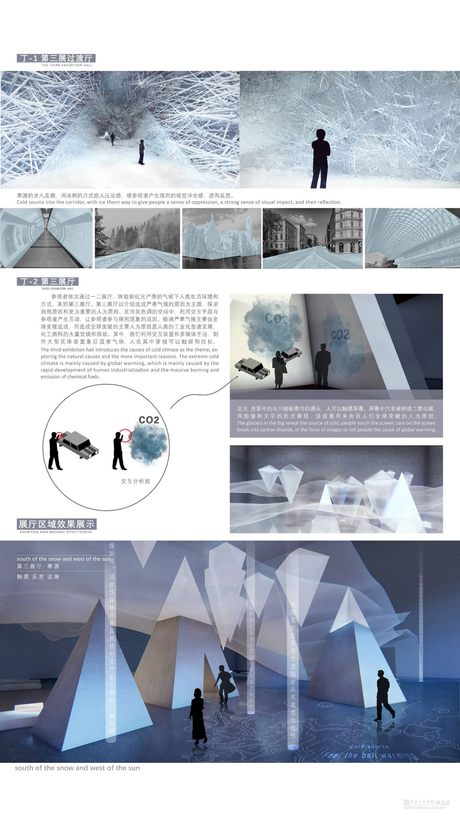 介绍造成严寒气候的原因为主题,探究自然原因和更为重要的人为原因。在灰冷色调的空间中,利用交互手段与观者产生互动,让观者参与探究现象的成因。
