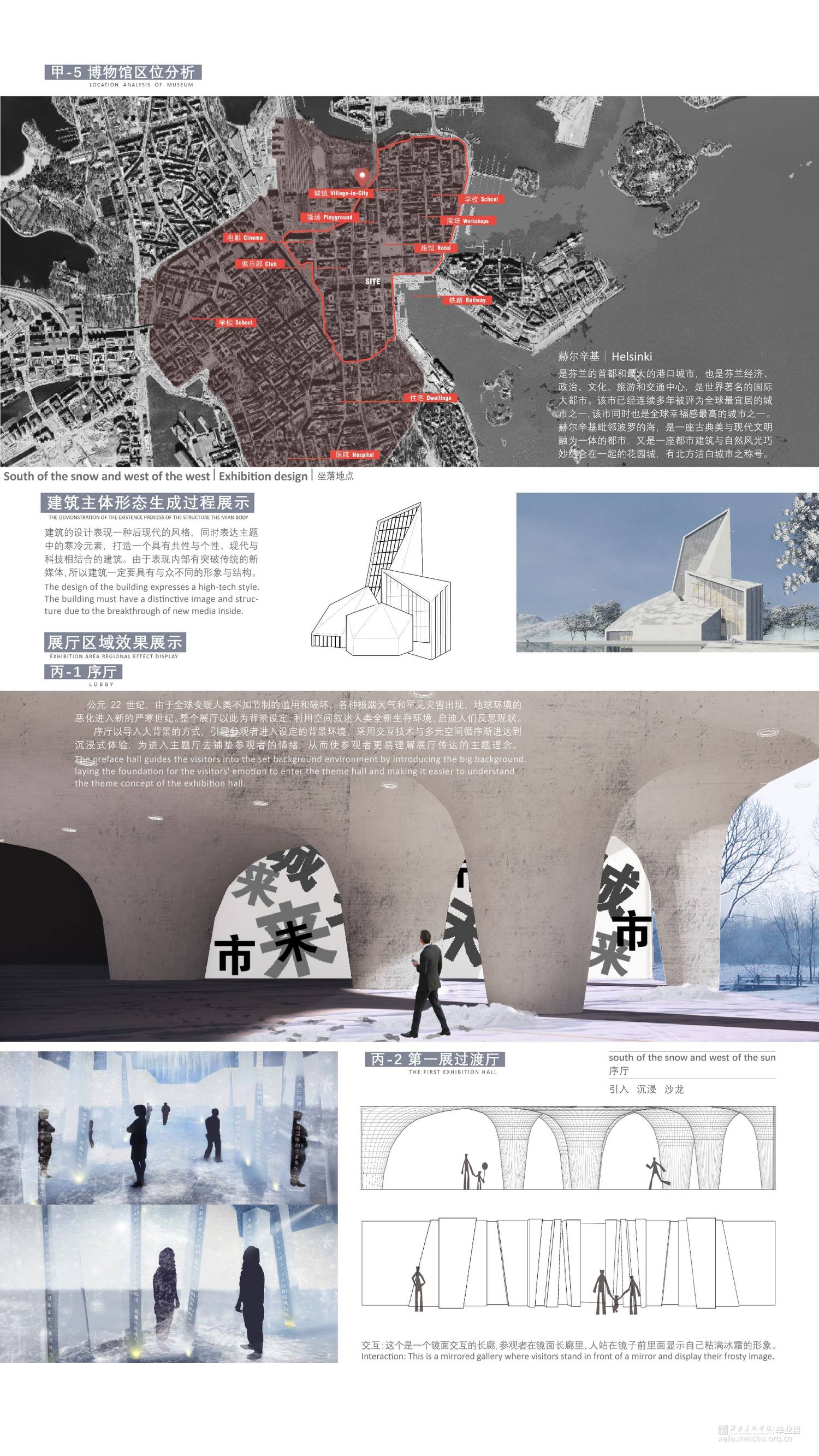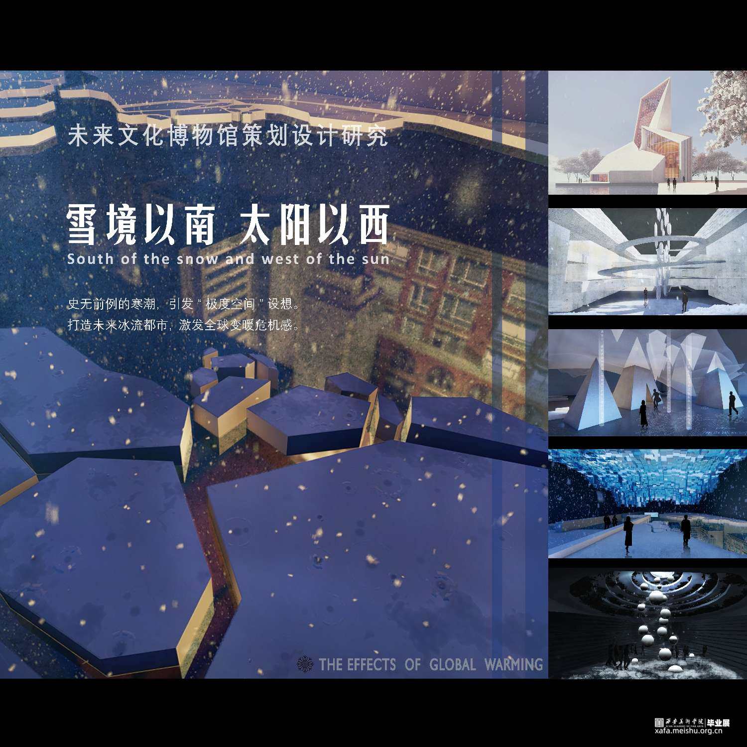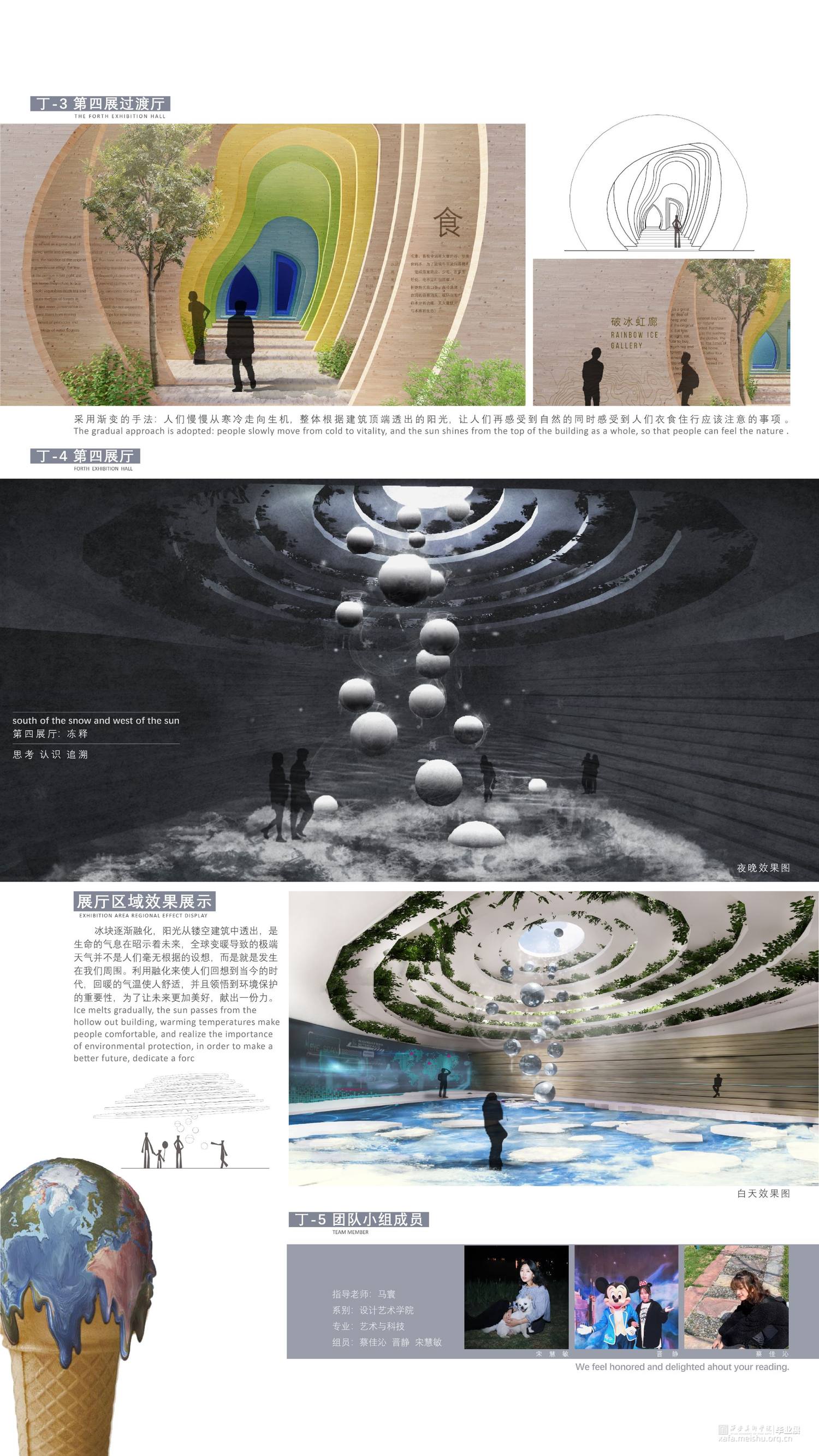 介绍造成严寒气候的原因为主题,探究自然原因和更为重要的人为原因。在灰冷色调的空间中,利用交互手段与观者产生互动,让观者参与探究现象的成因。
