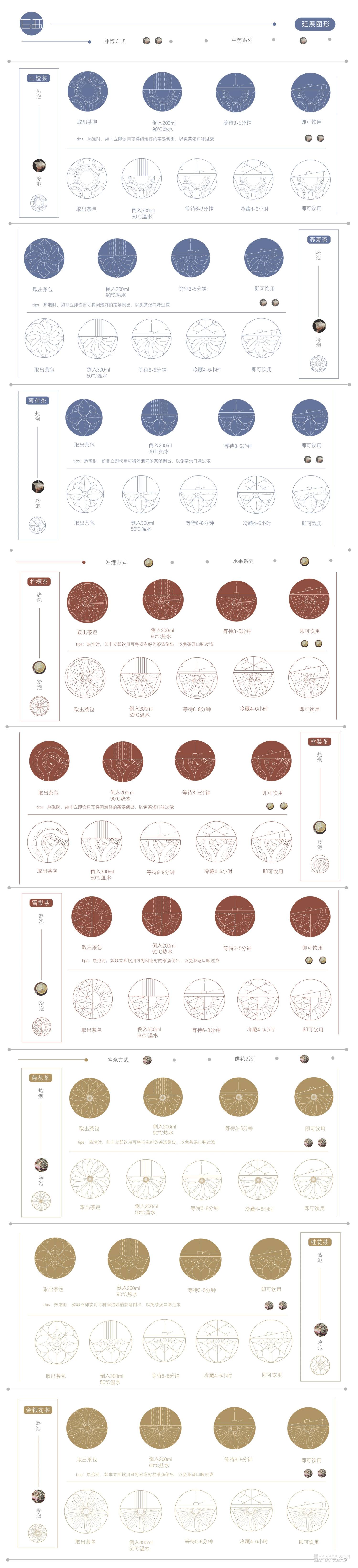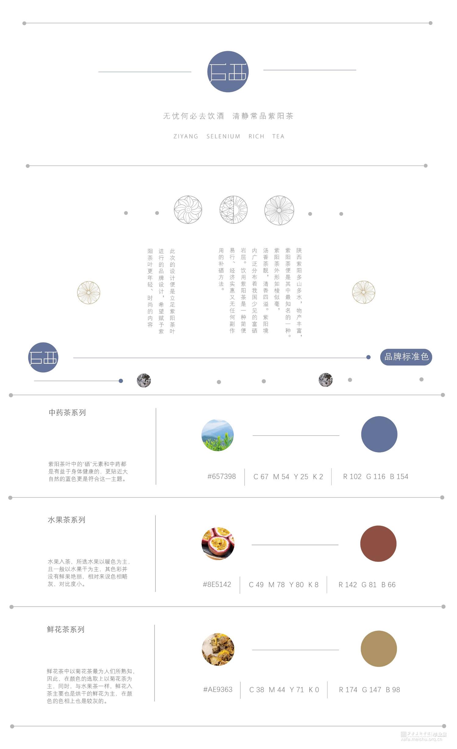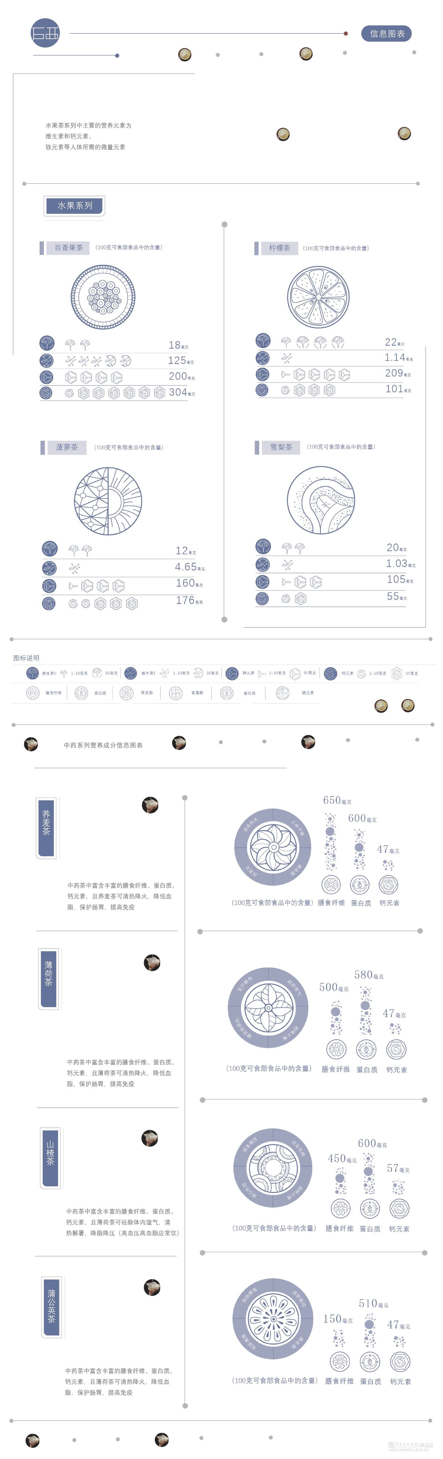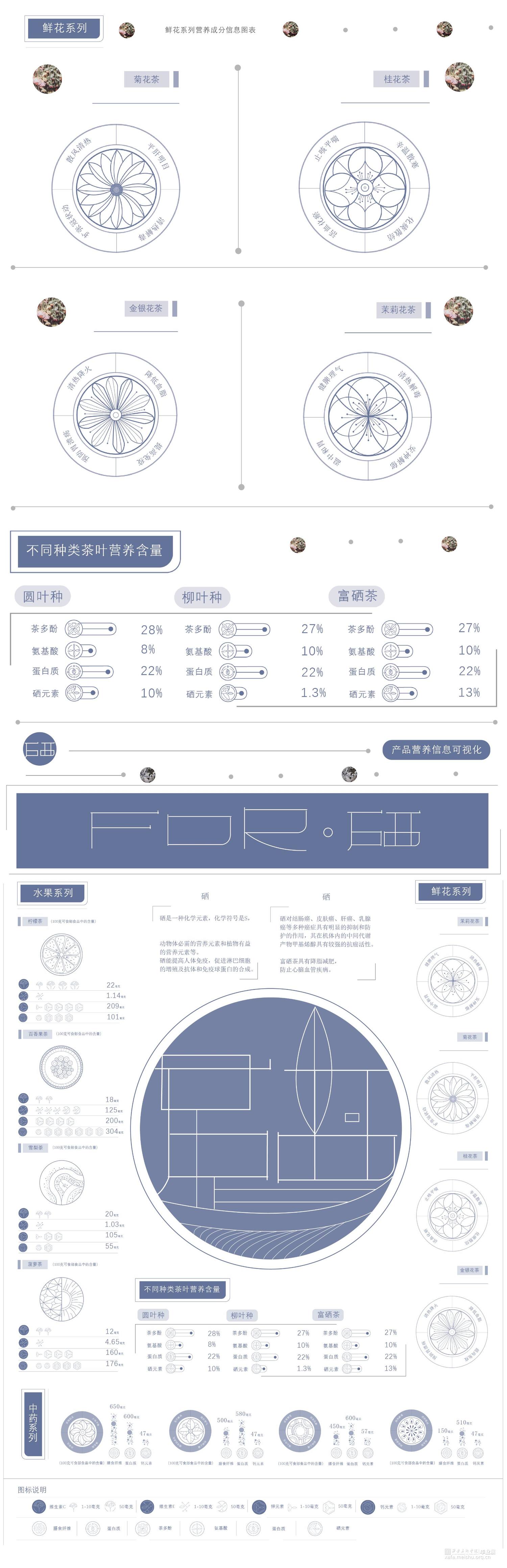 此次的设计便是立足紫阳茶叶进行的品牌设计,希望赋予紫阳茶叶更年轻、时尚的内容。我们将产品分为三大类:水果茶、中药茶、鲜花茶,分别对应年轻人群、亚健康人群、女性人群。在基本的视觉形象的设计上之外,为了将富硒茶和不同系列产品的营养成分视觉化,我们选择了信息图表为载体,方便受众直观明了的理解营养成分。