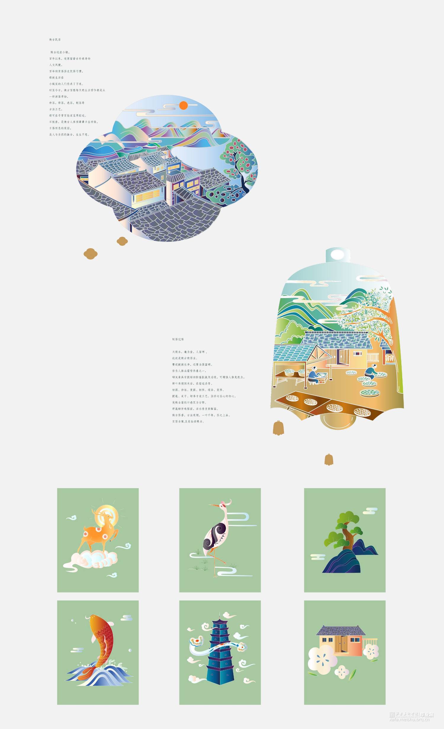 产品主视觉图的四张插画外观分别是扇子,葫芦,如意,铜铃。都是具有吉祥寓意的中国传统文化符号或是道教文化法器的剪影,具有祈福、祈盼吉祥的寓意和内涵。内包装的鹿鹤等和道教文化相关的元素,融入水,云,如意等元素加以装饰和丰富。在包装风格上体现质朴,国风。