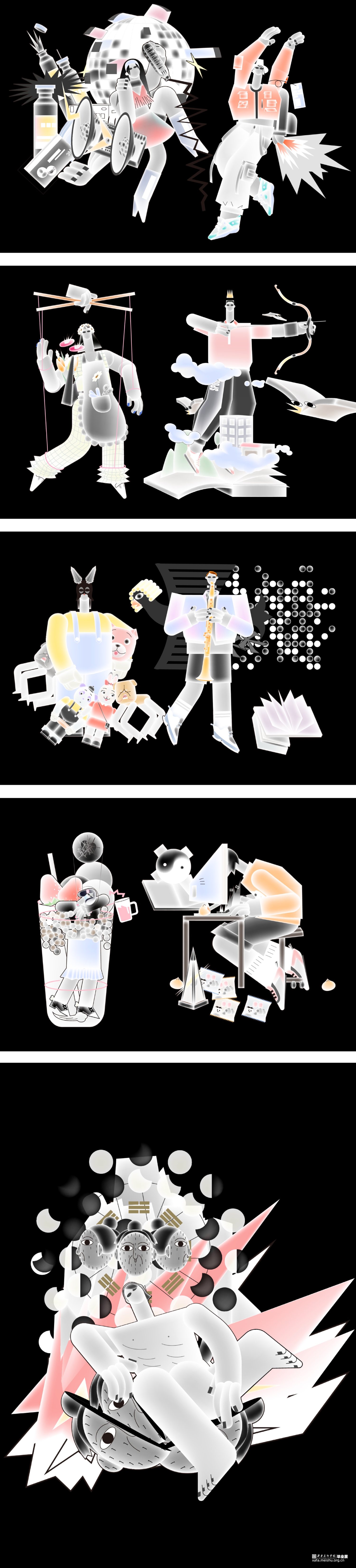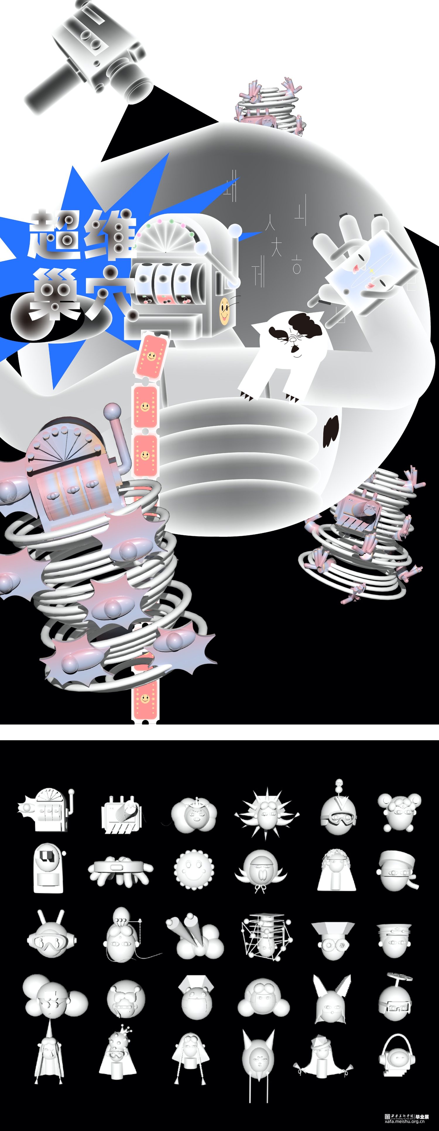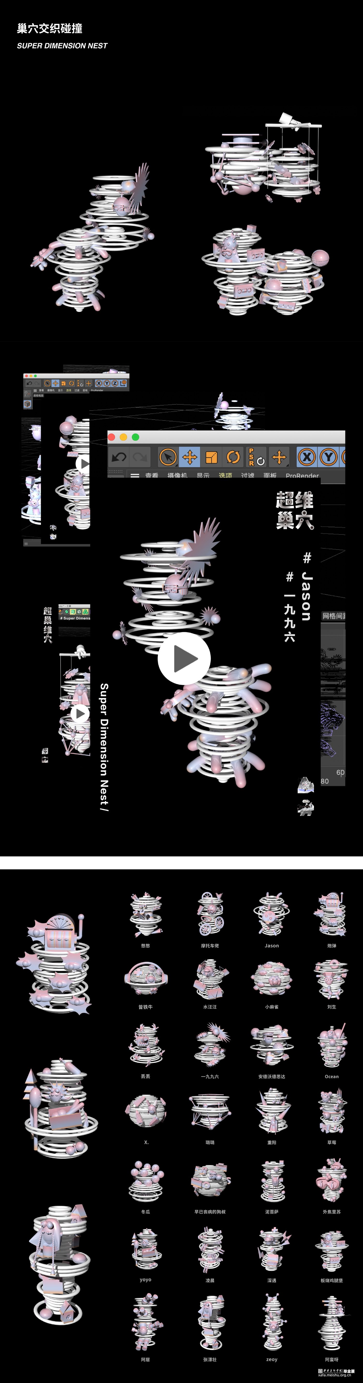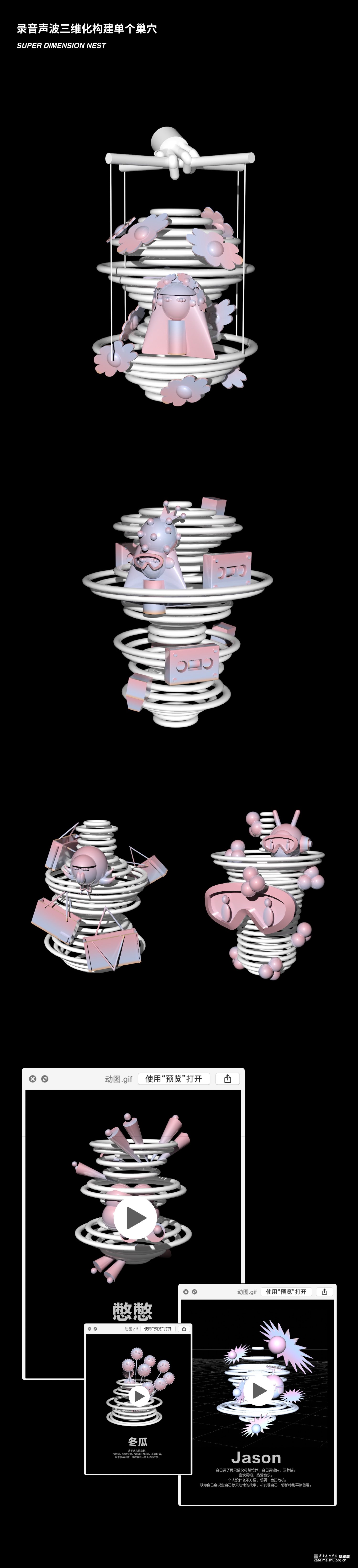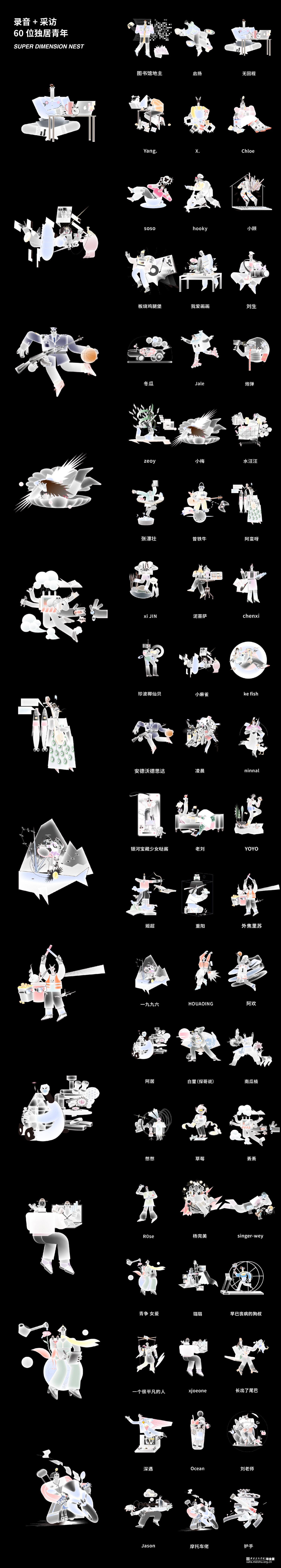 根据对每个人的采访提取关键词,把人物的现实生活和想象的自己结合在一起,组成60个独居青年的虚拟形象,又从二维插画转到三维动画,与声音特点结合。截取每个人的采访片段剪辑个人音频,是毕业设计的一个亮点。