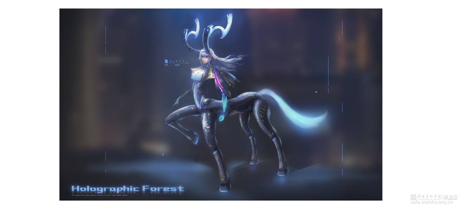 智能体执行官 Avril ,头上的鹿角可以使她察觉到周围难以发觉的电磁信息,同时也能起到警示周围的作用,鹿身的设计可以使她在城市里像森林里的鹿一样穿梭自如。在未来智能体的设计上,人类结合各种生物的优点