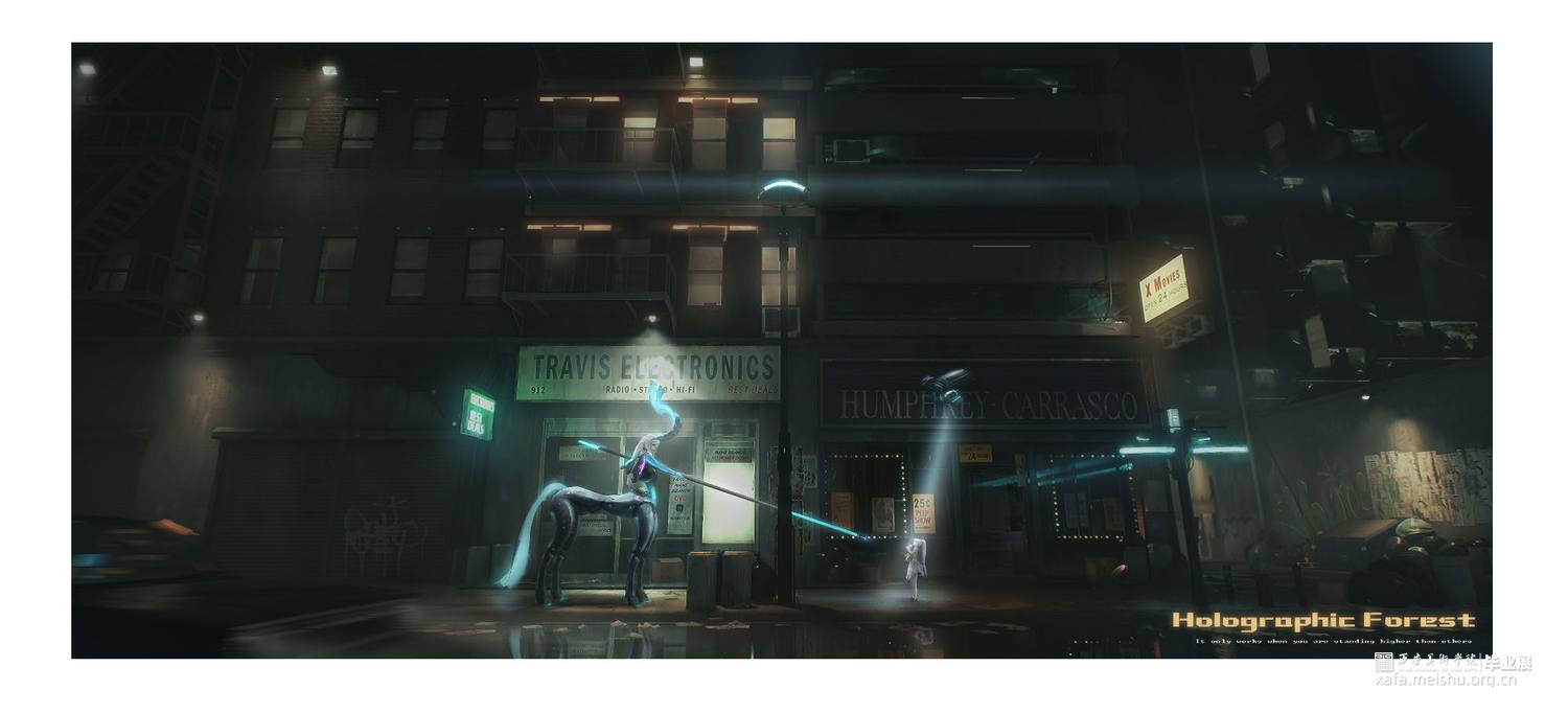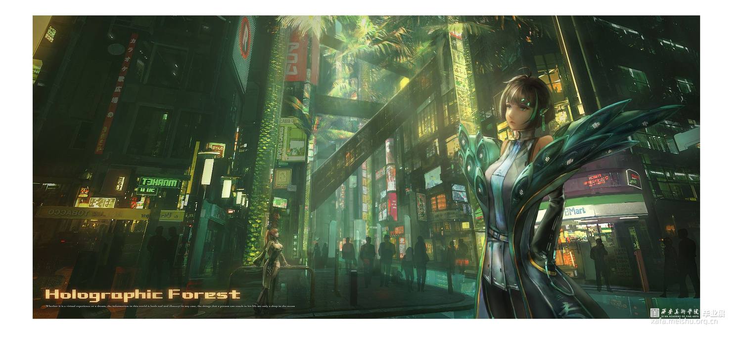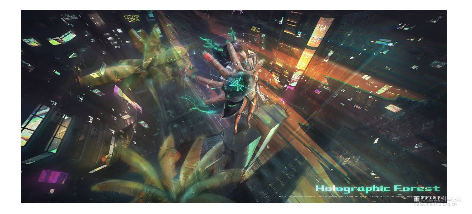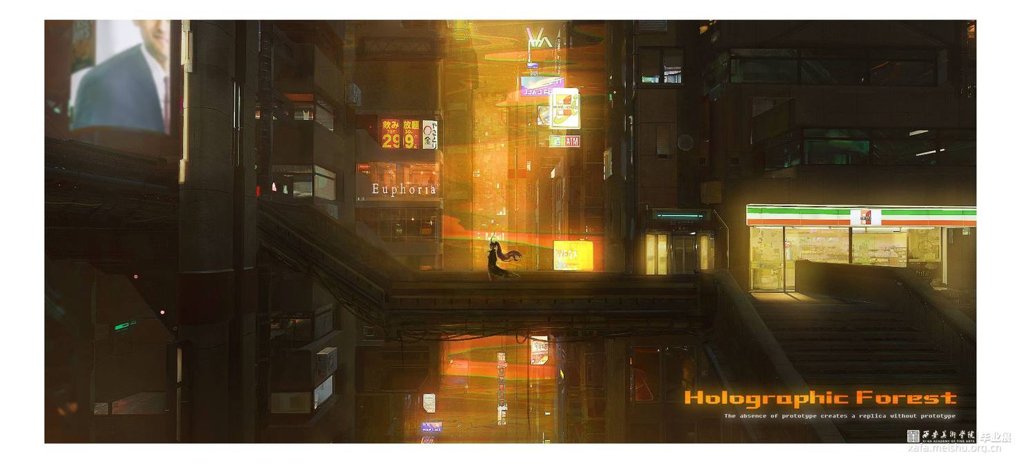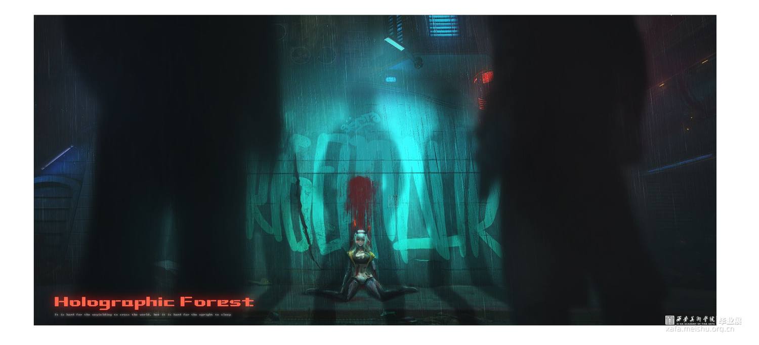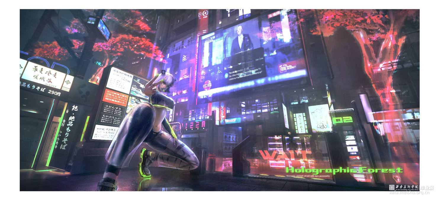 未来都市的傍晚,弥漫在高楼耸立的建筑物之间霓虹灯光芒闪烁。以及正在通过人行天桥的女孩。主要是对都市不同时间段的场景和霓虹街区进行展示,以及人们似乎对当前社会的不满、也有些许迷茫。