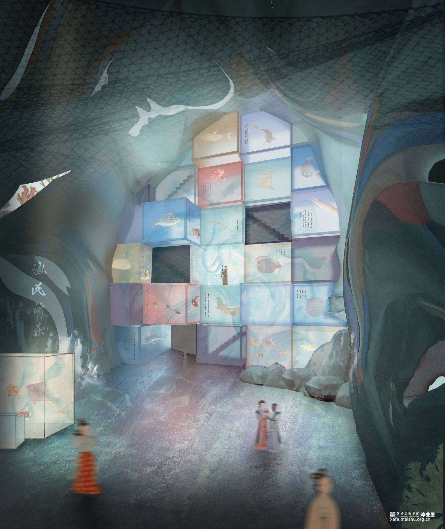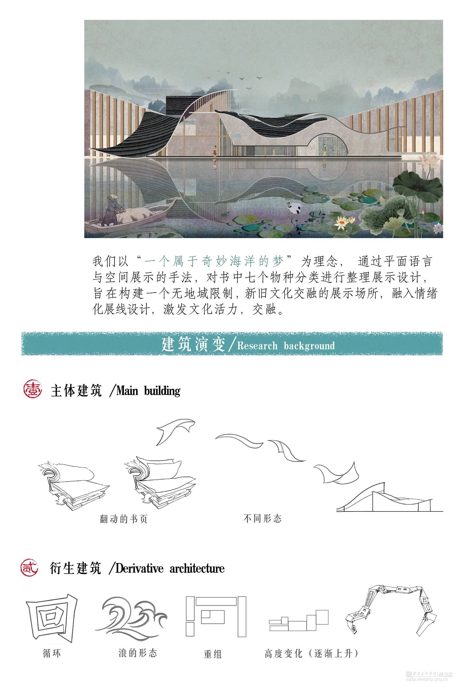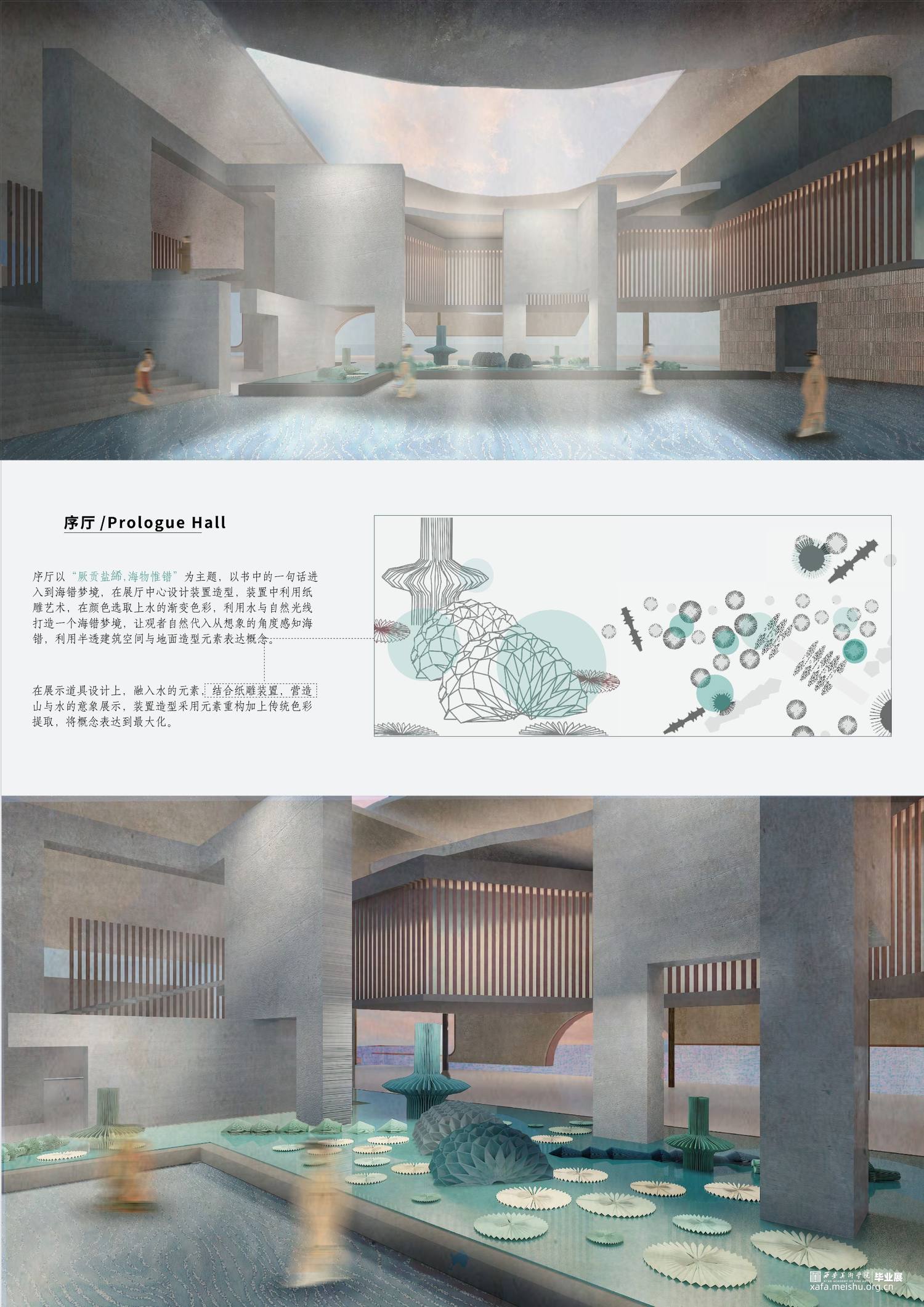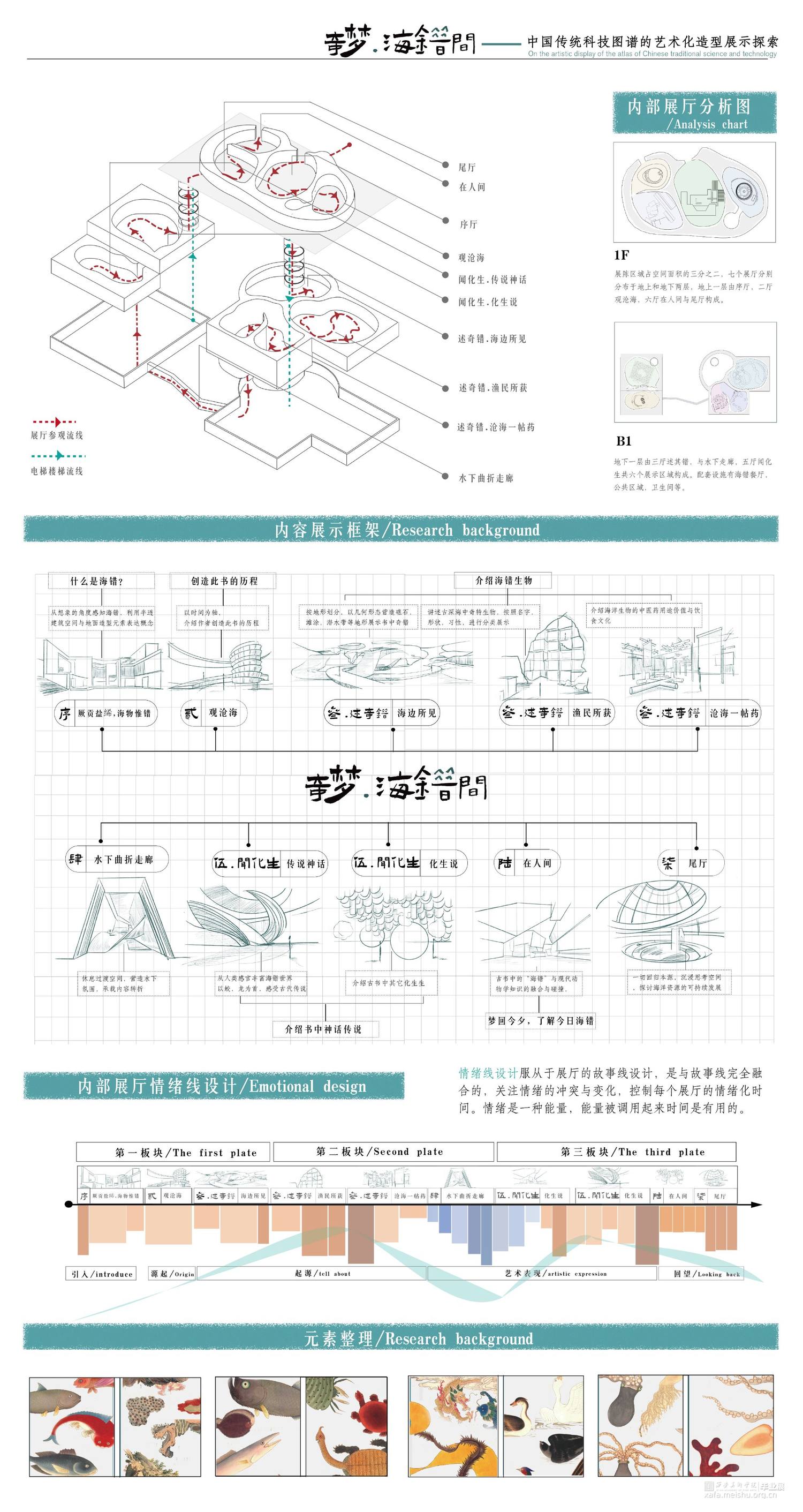 《海错图》是中国现存最早的一部关于海洋生物的科学画谱,我们初见时就被它丑萌可爱的画风所吸引,这种画风独特,图文并茂的记录形式在历史上是独一无二的。我们几经讨论以“一个属于奇妙海洋的梦”作为我们的创作出发点,通过平面语言与空间展示的手法,对《海错图》中七个物种分类进行整理展示设计,旨在构建一个无地域限制,新旧文化交融的展示场所,融入情绪化展线设计,激发文化活力,交融。在设计目标上将“内容艺术化造型展示+情绪化设计=文化创新展示”作为设计目标,结合书本的生物元素,归纳整理,提取元素,进行展馆建筑以及内部空间的设计构成。在区位上我们选择了西安作为我们的区域选址“奇梦.海错间”虽为宣讲古海洋生物知识的展示场所,但是我们的中心思想—让传统文化活起来的理念与古城西安不谋而合。在文旅融合的大背景下,通过持续深化“文化+”战略,打造出“西安年·最中国”文旅IP,让时尚鲜活的西安,越来越具有吸引力。建筑设计上,我们秉承“以梦与续存,古今交融”理念,提取书页在翻动时的造型与"回”字的理念,设计以水环绕的主体加衔接建筑的综合建筑体,表达以“现代”诠释“古今”,用建筑衔接“古今”。进入内部展厅,展陈区域占空间面积的三分之二,七个展厅分别分布于地上和地下两层,地上一层由序厅,二厅观沧海,六厅在人间与尾厅构成,地下一层由三厅述其错,与水下走廊,五厅闻化生共六个展示区域构成。配套设施有海错餐厅,公共区域,卫生间等。序厅以“厥贡盐絺,海物惟错”为主题,在展厅中心设计装置造型,利用水与自然光线打造一个海错梦境,让观者自然代入从想象的角度感知海错;第二展厅 - [观沧海] 以“创造此书的历程”为主题,以作者聂璜创作此书的时间流线为轴,在每一时间段,地点,遇到的人与事作为故事线,叙述《海错图》的创作由来,让观者逐渐进入海错梦境;第三展厅 - [述奇错] 以“从海错自身出发了解海错”为主题,以书本内容作为主旨内容,将书中七类生物就行归纳整理,第一小节 [海边所见] 是将海边生物按照地形的生存生长划分,以几何形态营造礁石,滩涂,潜水带等地形展示书中奇错,由海边逐渐进入深海世界;第二小节 [渔民所获] 由滩涂海边进入深海世界,探索古深海的海错生物,这些古深海中奇特生物,按照名字,形状,习性,进行分类展示,观者进入到一个由巨大渔网罩住的一个奇妙洞穴,在这些格子简中有不同种类的海洋生物,观者可以通过楼梯进入每一格子进行阅读了解;三小节 [沧海一帖药] 探索古深海生物的医药价值,这些古深海中奇特生物,从古至今都有极高的医药价值,在此小节我们从药膳角度从“药”与“吃”帮助观者趣味拓展,海错生物的奇妙之处。第五展厅 [闻化生] 是讲述书中奇妙传说的海错生物,这些生物真假不易,有些作者都反之怀疑自己的记录,正是这些不确定性让这个展区充满了奇特色彩。[神话传说] 主要是讲述两种传说生物,以蛟,龙为首,在展区的柱体结构上加入造型,形成两种结构交错向对,感受古代传说神秘。坐电梯回到地上一层,慢慢从奇妙梦境中“苏醒过来”,作为古代科技图谱,书中生物与当今海洋生物并没有什么大的差别,作为绝无仅有的奇书,《海错图》为我国海洋生物的研究与发展做出了卓越贡献,我们继续利用新媒体交互技术,将古书中的海洋生物与现有生物进行交叠存在,古书中的“海错”与现代动物学知识的融合与碰撞,展现海错图为现代海洋科学做出贡献。来到尾厅,这里既是休息区域也是展示区域。重塑“回”行概念,在空间造型上就行沿用,藤条元素,光线由顶面,照耀中心水域,一切回归本源,沉浸思考空间,探讨海洋资源的可持续发展。