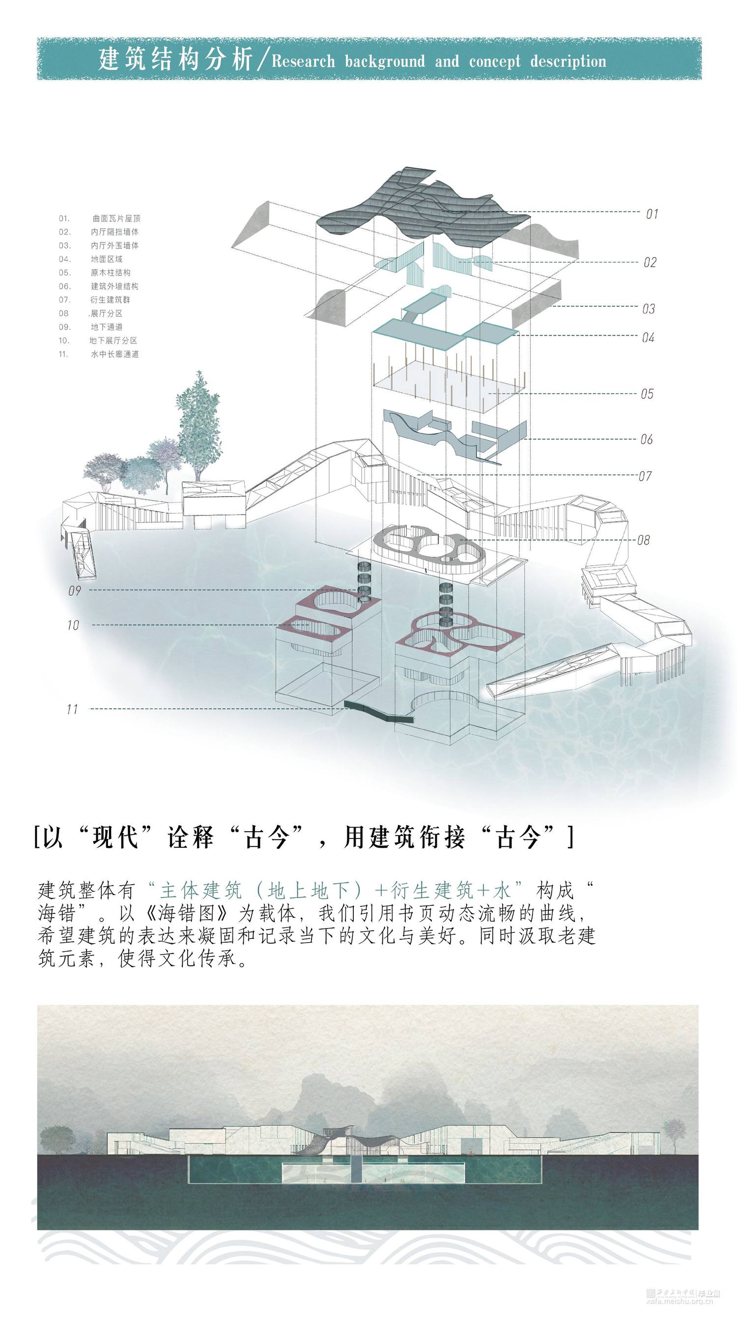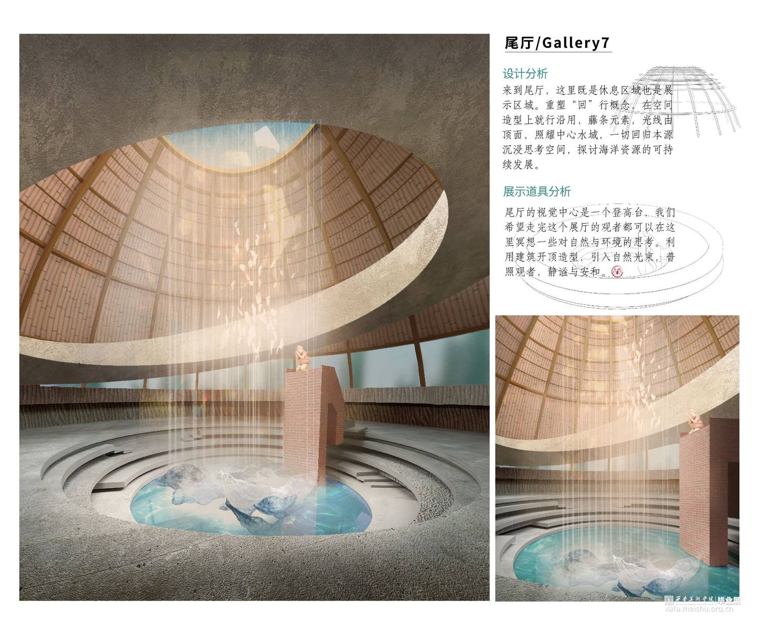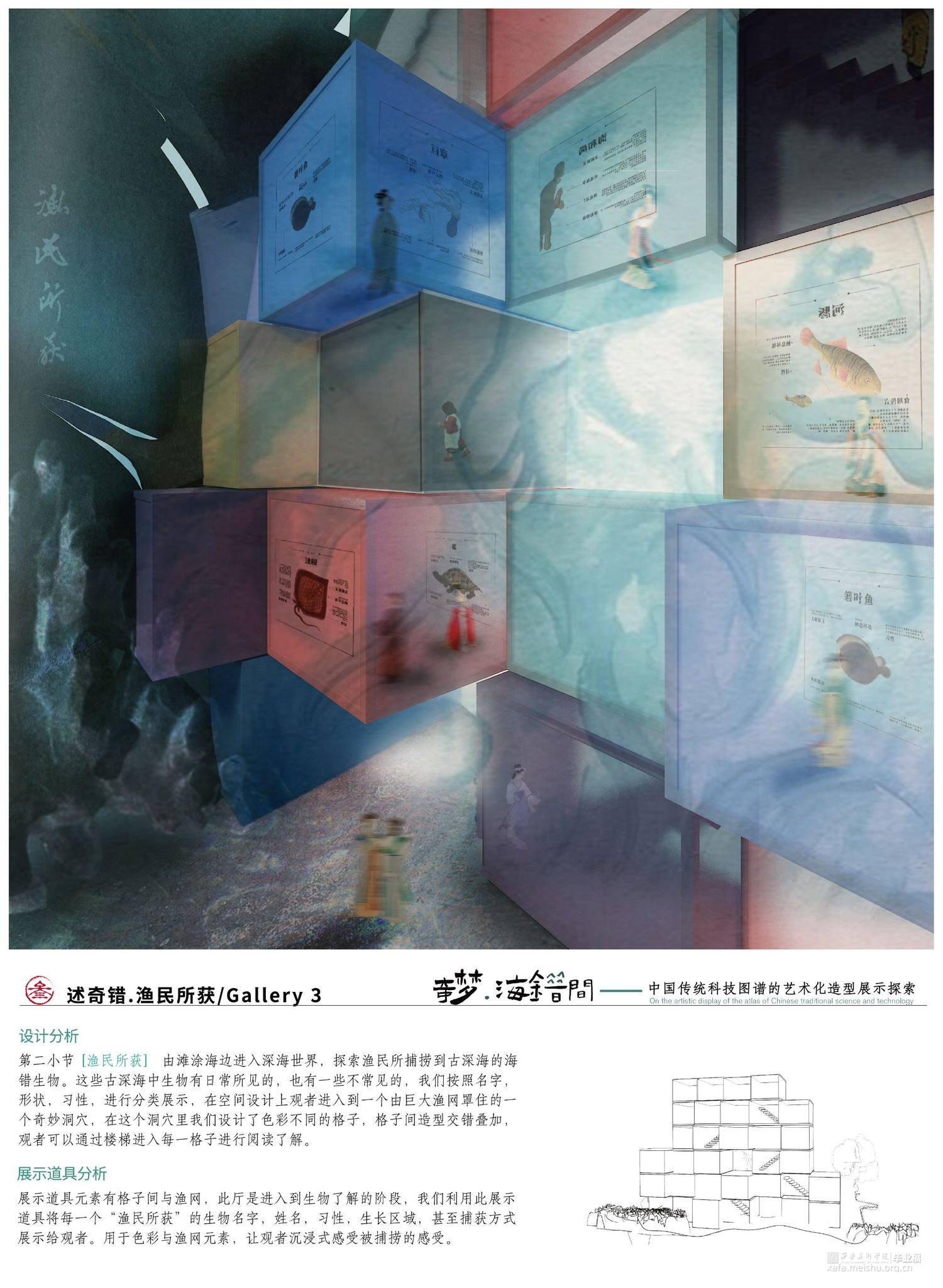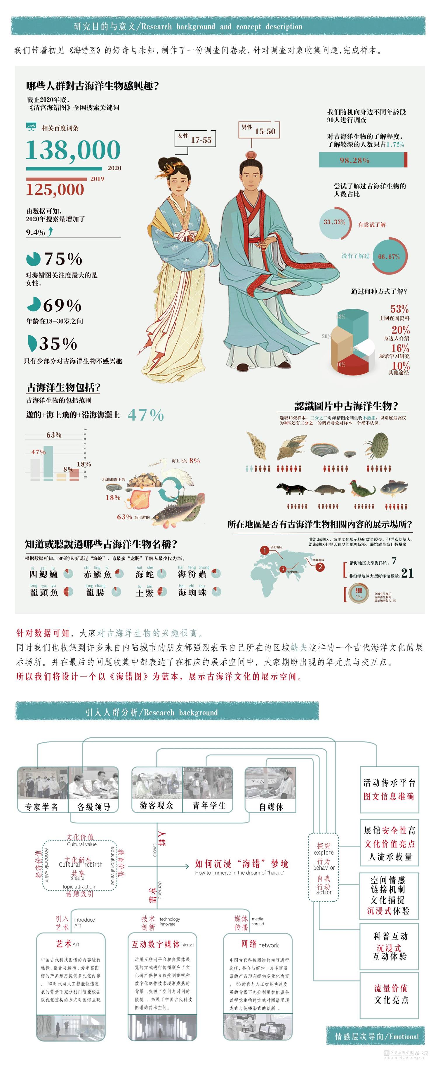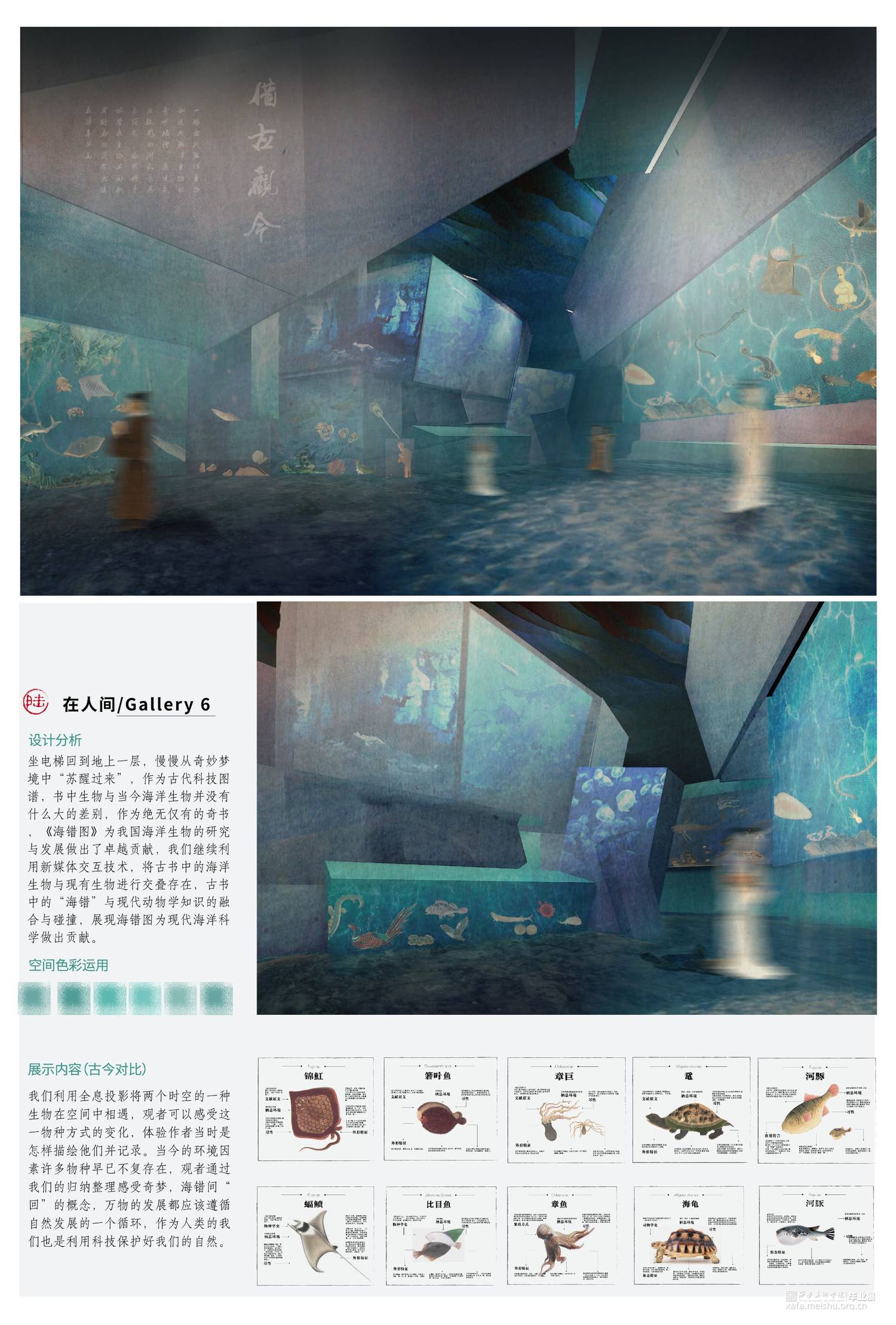 《海错图》是中国现存最早的一部关于海洋生物的科学画谱,我们初见时就被它丑萌可爱的画风所吸引,这种画风独特,图文并茂的记录形式在历史上是独一无二的。我们几经讨论以“一个属于奇妙海洋的梦”作为我们的创作出发点,通过平面语言与空间展示的手法,对《海错图》中七个物种分类进行整理展示设计,旨在构建一个无地域限制,新旧文化交融的展示场所,融入情绪化展线设计,激发文化活力,交融。在设计目标上将“内容艺术化造型展示+情绪化设计=文化创新展示”作为设计目标,结合书本的生物元素,归纳整理,提取元素,进行展馆建筑以及内部空间的设计构成。在区位上我们选择了西安作为我们的区域选址“奇梦.海错间”虽为宣讲古海洋生物知识的展示场所,但是我们的中心思想—让传统文化活起来的理念与古城西安不谋而合。在文旅融合的大背景下,通过持续深化“文化+”战略,打造出“西安年·最中国”文旅IP,让时尚鲜活的西安,越来越具有吸引力。建筑设计上,我们秉承“以梦与续存,古今交融”理念,提取书页在翻动时的造型与"回”字的理念,设计以水环绕的主体加衔接建筑的综合建筑体,表达以“现代”诠释“古今”,用建筑衔接“古今”。进入内部展厅,展陈区域占空间面积的三分之二,七个展厅分别分布于地上和地下两层,地上一层由序厅,二厅观沧海,六厅在人间与尾厅构成,地下一层由三厅述其错,与水下走廊,五厅闻化生共六个展示区域构成。配套设施有海错餐厅,公共区域,卫生间等。序厅以“厥贡盐絺,海物惟错”为主题,在展厅中心设计装置造型,利用水与自然光线打造一个海错梦境,让观者自然代入从想象的角度感知海错;第二展厅 - [观沧海] 以“创造此书的历程”为主题,以作者聂璜创作此书的时间流线为轴,在每一时间段,地点,遇到的人与事作为故事线,叙述《海错图》的创作由来,让观者逐渐进入海错梦境;第三展厅 - [述奇错] 以“从海错自身出发了解海错”为主题,以书本内容作为主旨内容,将书中七类生物就行归纳整理,第一小节 [海边所见] 是将海边生物按照地形的生存生长划分,以几何形态营造礁石,滩涂,潜水带等地形展示书中奇错,由海边逐渐进入深海世界;第二小节 [渔民所获] 由滩涂海边进入深海世界,探索古深海的海错生物,这些古深海中奇特生物,按照名字,形状,习性,进行分类展示,观者进入到一个由巨大渔网罩住的一个奇妙洞穴,在这些格子简中有不同种类的海洋生物,观者可以通过楼梯进入每一格子进行阅读了解;三小节 [沧海一帖药] 探索古深海生物的医药价值,这些古深海中奇特生物,从古至今都有极高的医药价值,在此小节我们从药膳角度从“药”与“吃”帮助观者趣味拓展,海错生物的奇妙之处。第五展厅 [闻化生] 是讲述书中奇妙传说的海错生物,这些生物真假不易,有些作者都反之怀疑自己的记录,正是这些不确定性让这个展区充满了奇特色彩。[神话传说] 主要是讲述两种传说生物,以蛟,龙为首,在展区的柱体结构上加入造型,形成两种结构交错向对,感受古代传说神秘。坐电梯回到地上一层,慢慢从奇妙梦境中“苏醒过来”,作为古代科技图谱,书中生物与当今海洋生物并没有什么大的差别,作为绝无仅有的奇书,《海错图》为我国海洋生物的研究与发展做出了卓越贡献,我们继续利用新媒体交互技术,将古书中的海洋生物与现有生物进行交叠存在,古书中的“海错”与现代动物学知识的融合与碰撞,展现海错图为现代海洋科学做出贡献。来到尾厅,这里既是休息区域也是展示区域。重塑“回”行概念,在空间造型上就行沿用,藤条元素,光线由顶面,照耀中心水域,一切回归本源,沉浸思考空间,探讨海洋资源的可持续发展。