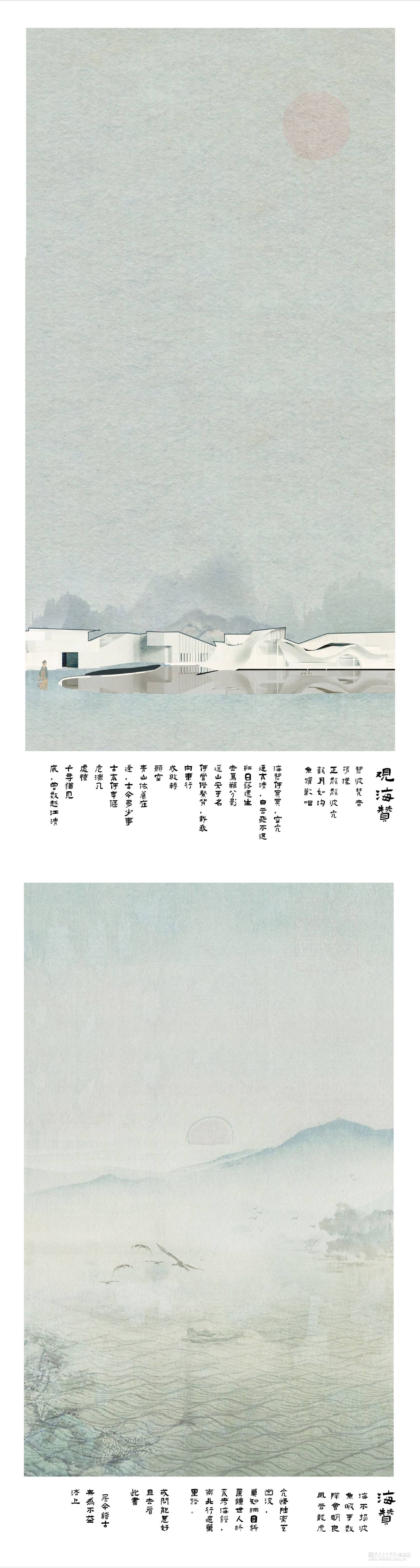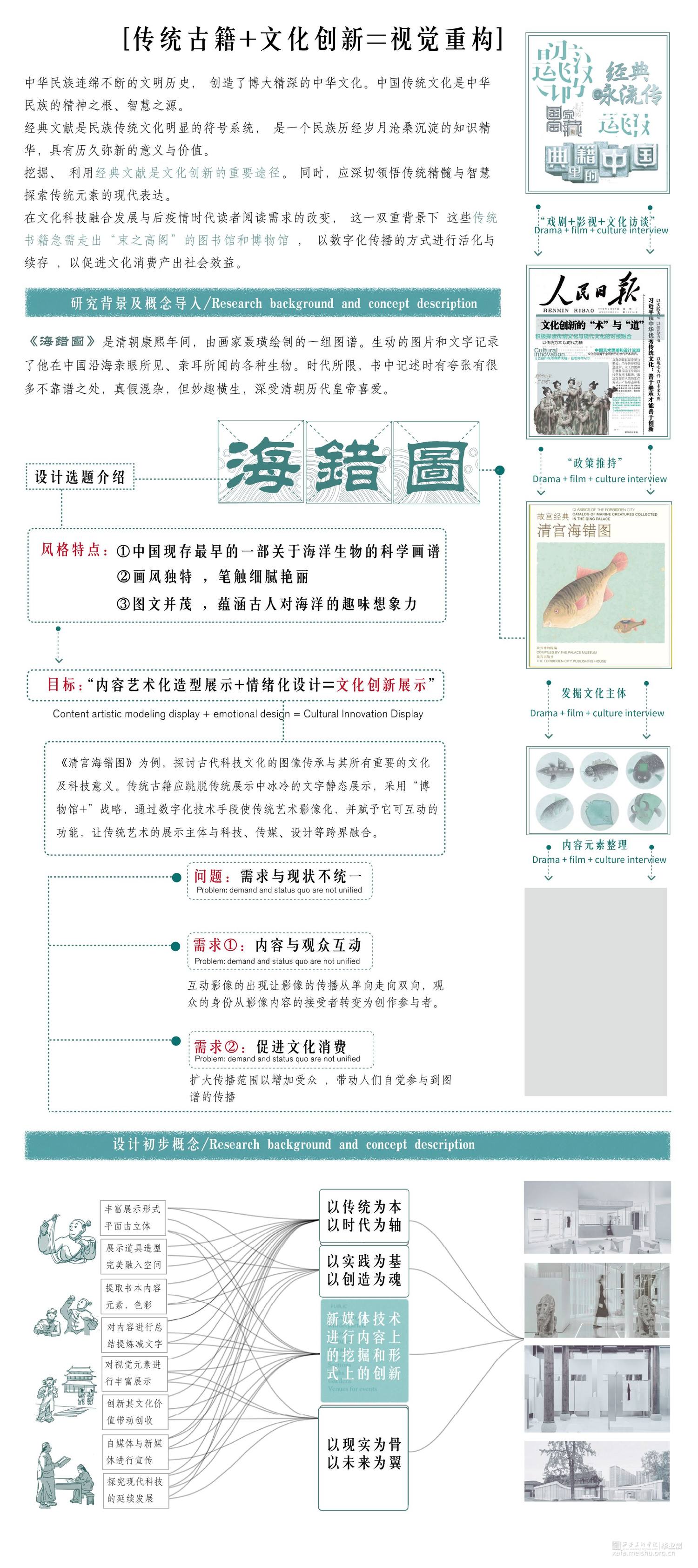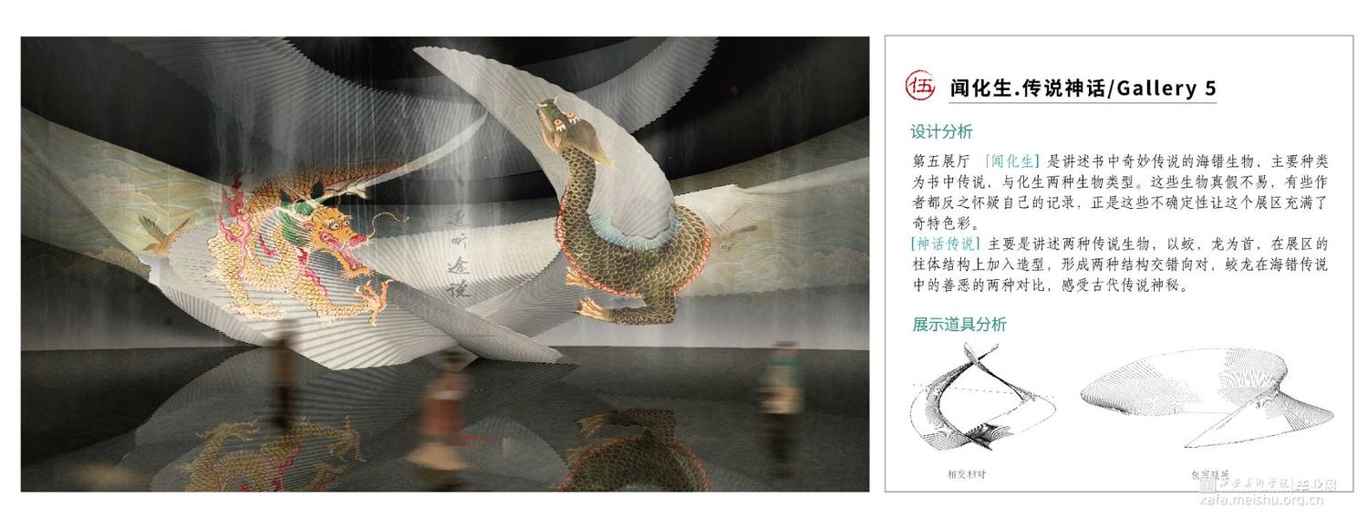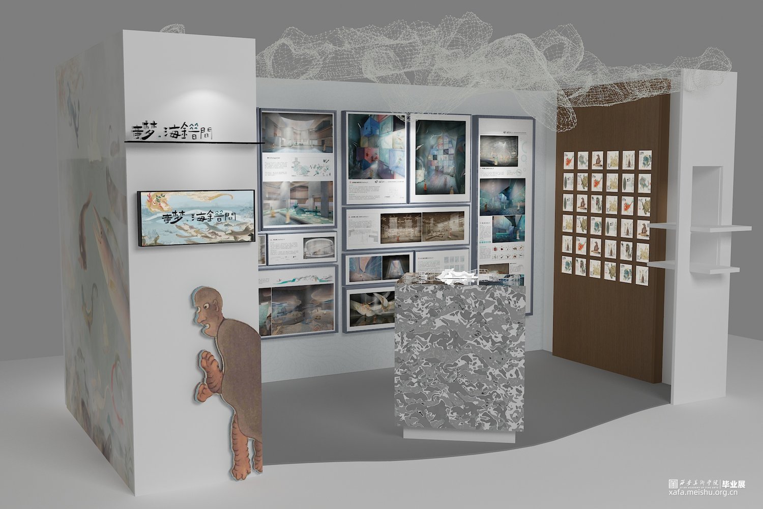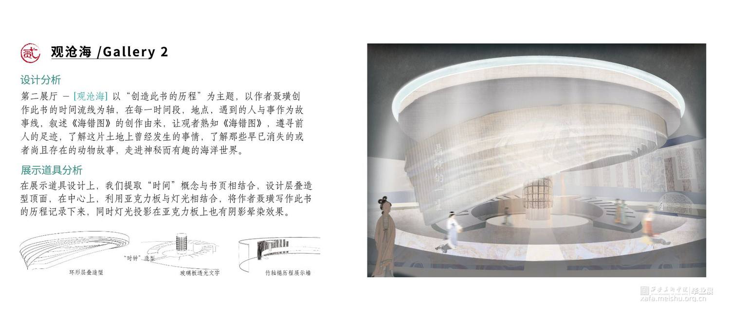 《海错图》是中国现存最早的一部关于海洋生物的科学画谱,我们初见时就被它丑萌可爱的画风所吸引,这种画风独特,图文并茂的记录形式在历史上是独一无二的。我们几经讨论以“一个属于奇妙海洋的梦”作为我们的创作出发点,通过平面语言与空间展示的手法,对《海错图》中七个物种分类进行整理展示设计,旨在构建一个无地域限制,新旧文化交融的展示场所,融入情绪化展线设计,激发文化活力,交融。在设计目标上将“内容艺术化造型展示+情绪化设计=文化创新展示”作为设计目标,结合书本的生物元素,归纳整理,提取元素,进行展馆建筑以及内部空间的设计构成。在区位上我们选择了西安作为我们的区域选址“奇梦.海错间”虽为宣讲古海洋生物知识的展示场所,但是我们的中心思想—让传统文化活起来的理念与古城西安不谋而合。在文旅融合的大背景下,通过持续深化“文化+”战略,打造出“西安年·最中国”文旅IP,让时尚鲜活的西安,越来越具有吸引力。建筑设计上,我们秉承“以梦与续存,古今交融”理念,提取书页在翻动时的造型与"回”字的理念,设计以水环绕的主体加衔接建筑的综合建筑体,表达以“现代”诠释“古今”,用建筑衔接“古今”。进入内部展厅,展陈区域占空间面积的三分之二,七个展厅分别分布于地上和地下两层,地上一层由序厅,二厅观沧海,六厅在人间与尾厅构成,地下一层由三厅述其错,与水下走廊,五厅闻化生共六个展示区域构成。配套设施有海错餐厅,公共区域,卫生间等。序厅以“厥贡盐絺,海物惟错”为主题,在展厅中心设计装置造型,利用水与自然光线打造一个海错梦境,让观者自然代入从想象的角度感知海错;第二展厅 - [观沧海] 以“创造此书的历程”为主题,以作者聂璜创作此书的时间流线为轴,在每一时间段,地点,遇到的人与事作为故事线,叙述《海错图》的创作由来,让观者逐渐进入海错梦境;第三展厅 - [述奇错] 以“从海错自身出发了解海错”为主题,以书本内容作为主旨内容,将书中七类生物就行归纳整理,第一小节 [海边所见] 是将海边生物按照地形的生存生长划分,以几何形态营造礁石,滩涂,潜水带等地形展示书中奇错,由海边逐渐进入深海世界;第二小节 [渔民所获] 由滩涂海边进入深海世界,探索古深海的海错生物,这些古深海中奇特生物,按照名字,形状,习性,进行分类展示,观者进入到一个由巨大渔网罩住的一个奇妙洞穴,在这些格子简中有不同种类的海洋生物,观者可以通过楼梯进入每一格子进行阅读了解;三小节 [沧海一帖药] 探索古深海生物的医药价值,这些古深海中奇特生物,从古至今都有极高的医药价值,在此小节我们从药膳角度从“药”与“吃”帮助观者趣味拓展,海错生物的奇妙之处。第五展厅 [闻化生] 是讲述书中奇妙传说的海错生物,这些生物真假不易,有些作者都反之怀疑自己的记录,正是这些不确定性让这个展区充满了奇特色彩。[神话传说] 主要是讲述两种传说生物,以蛟,龙为首,在展区的柱体结构上加入造型,形成两种结构交错向对,感受古代传说神秘。坐电梯回到地上一层,慢慢从奇妙梦境中“苏醒过来”,作为古代科技图谱,书中生物与当今海洋生物并没有什么大的差别,作为绝无仅有的奇书,《海错图》为我国海洋生物的研究与发展做出了卓越贡献,我们继续利用新媒体交互技术,将古书中的海洋生物与现有生物进行交叠存在,古书中的“海错”与现代动物学知识的融合与碰撞,展现海错图为现代海洋科学做出贡献。来到尾厅,这里既是休息区域也是展示区域。重塑“回”行概念,在空间造型上就行沿用,藤条元素,光线由顶面,照耀中心水域,一切回归本源,沉浸思考空间,探讨海洋资源的可持续发展。