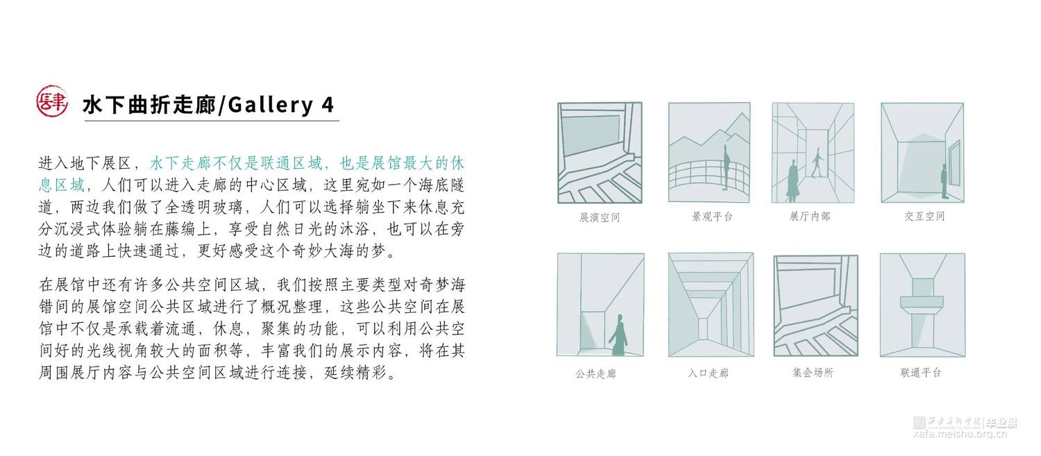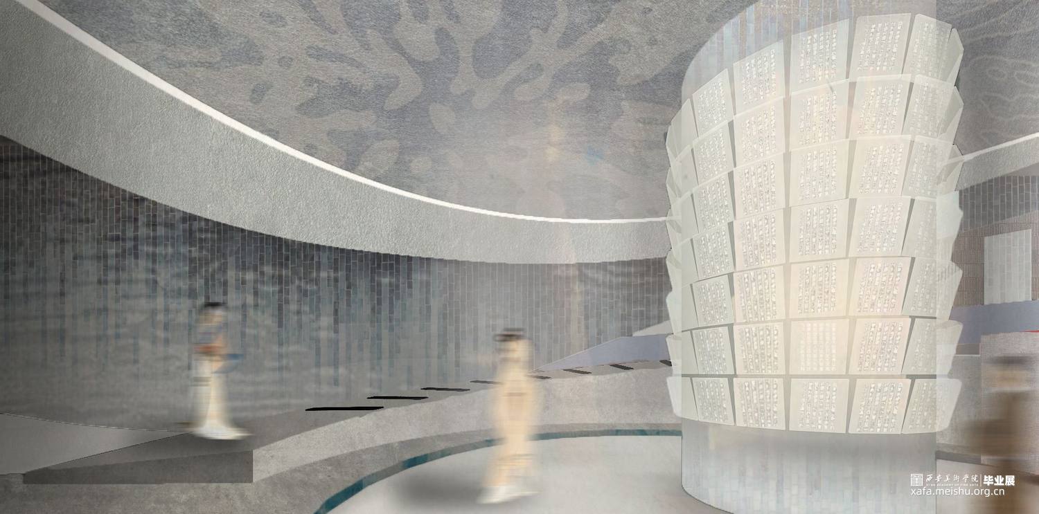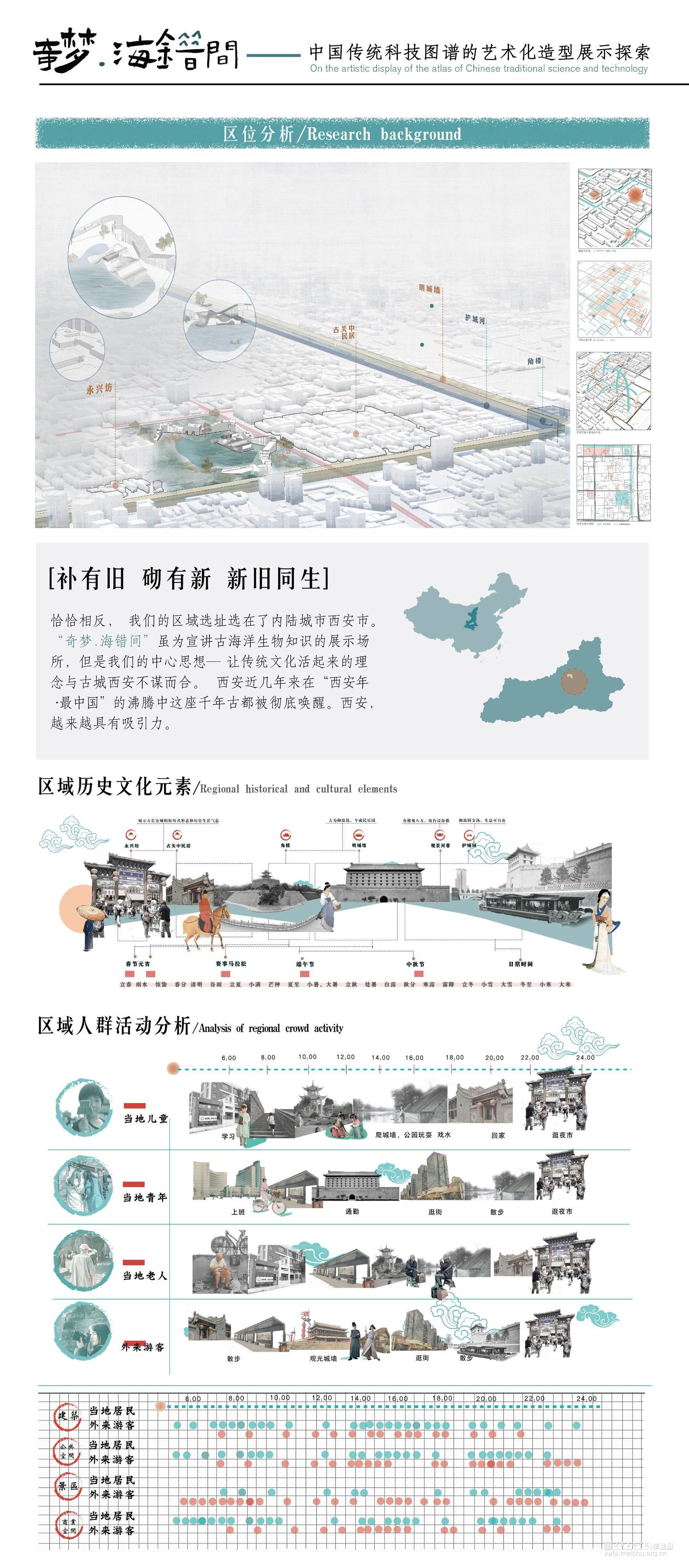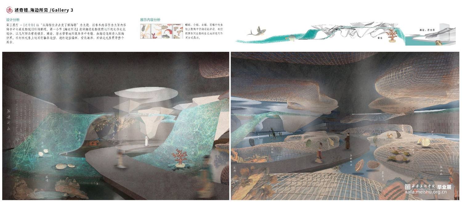 《海错图》是中国现存最早的一部关于海洋生物的科学画谱,我们初见时就被它丑萌可爱的画风所吸引,这种画风独特,图文并茂的记录形式在历史上是独一无二的。我们几经讨论以“一个属于奇妙海洋的梦”作为我们的创作出发点,通过平面语言与空间展示的手法,对《海错图》中七个物种分类进行整理展示设计,旨在构建一个无地域限制,新旧文化交融的展示场所,融入情绪化展线设计,激发文化活力,交融。在设计目标上将“内容艺术化造型展示+情绪化设计=文化创新展示”作为设计目标,结合书本的生物元素,归纳整理,提取元素,进行展馆建筑以及内部空间的设计构成。在区位上我们选择了西安作为我们的区域选址“奇梦.海错间”虽为宣讲古海洋生物知识的展示场所,但是我们的中心思想—让传统文化活起来的理念与古城西安不谋而合。在文旅融合的大背景下,通过持续深化“文化+”战略,打造出“西安年·最中国”文旅IP,让时尚鲜活的西安,越来越具有吸引力。建筑设计上,我们秉承“以梦与续存,古今交融”理念,提取书页在翻动时的造型与"回”字的理念,设计以水环绕的主体加衔接建筑的综合建筑体,表达以“现代”诠释“古今”,用建筑衔接“古今”。进入内部展厅,展陈区域占空间面积的三分之二,七个展厅分别分布于地上和地下两层,地上一层由序厅,二厅观沧海,六厅在人间与尾厅构成,地下一层由三厅述其错,与水下走廊,五厅闻化生共六个展示区域构成。配套设施有海错餐厅,公共区域,卫生间等。序厅以“厥贡盐絺,海物惟错”为主题,在展厅中心设计装置造型,利用水与自然光线打造一个海错梦境,让观者自然代入从想象的角度感知海错;第二展厅 - [观沧海] 以“创造此书的历程”为主题,以作者聂璜创作此书的时间流线为轴,在每一时间段,地点,遇到的人与事作为故事线,叙述《海错图》的创作由来,让观者逐渐进入海错梦境;第三展厅 - [述奇错] 以“从海错自身出发了解海错”为主题,以书本内容作为主旨内容,将书中七类生物就行归纳整理,第一小节 [海边所见] 是将海边生物按照地形的生存生长划分,以几何形态营造礁石,滩涂,潜水带等地形展示书中奇错,由海边逐渐进入深海世界;第二小节 [渔民所获] 由滩涂海边进入深海世界,探索古深海的海错生物,这些古深海中奇特生物,按照名字,形状,习性,进行分类展示,观者进入到一个由巨大渔网罩住的一个奇妙洞穴,在这些格子简中有不同种类的海洋生物,观者可以通过楼梯进入每一格子进行阅读了解;三小节 [沧海一帖药] 探索古深海生物的医药价值,这些古深海中奇特生物,从古至今都有极高的医药价值,在此小节我们从药膳角度从“药”与“吃”帮助观者趣味拓展,海错生物的奇妙之处。第五展厅 [闻化生] 是讲述书中奇妙传说的海错生物,这些生物真假不易,有些作者都反之怀疑自己的记录,正是这些不确定性让这个展区充满了奇特色彩。[神话传说] 主要是讲述两种传说生物,以蛟,龙为首,在展区的柱体结构上加入造型,形成两种结构交错向对,感受古代传说神秘。坐电梯回到地上一层,慢慢从奇妙梦境中“苏醒过来”,作为古代科技图谱,书中生物与当今海洋生物并没有什么大的差别,作为绝无仅有的奇书,《海错图》为我国海洋生物的研究与发展做出了卓越贡献,我们继续利用新媒体交互技术,将古书中的海洋生物与现有生物进行交叠存在,古书中的“海错”与现代动物学知识的融合与碰撞,展现海错图为现代海洋科学做出贡献。来到尾厅,这里既是休息区域也是展示区域。重塑“回”行概念,在空间造型上就行沿用,藤条元素,光线由顶面,照耀中心水域,一切回归本源,沉浸思考空间,探讨海洋资源的可持续发展。