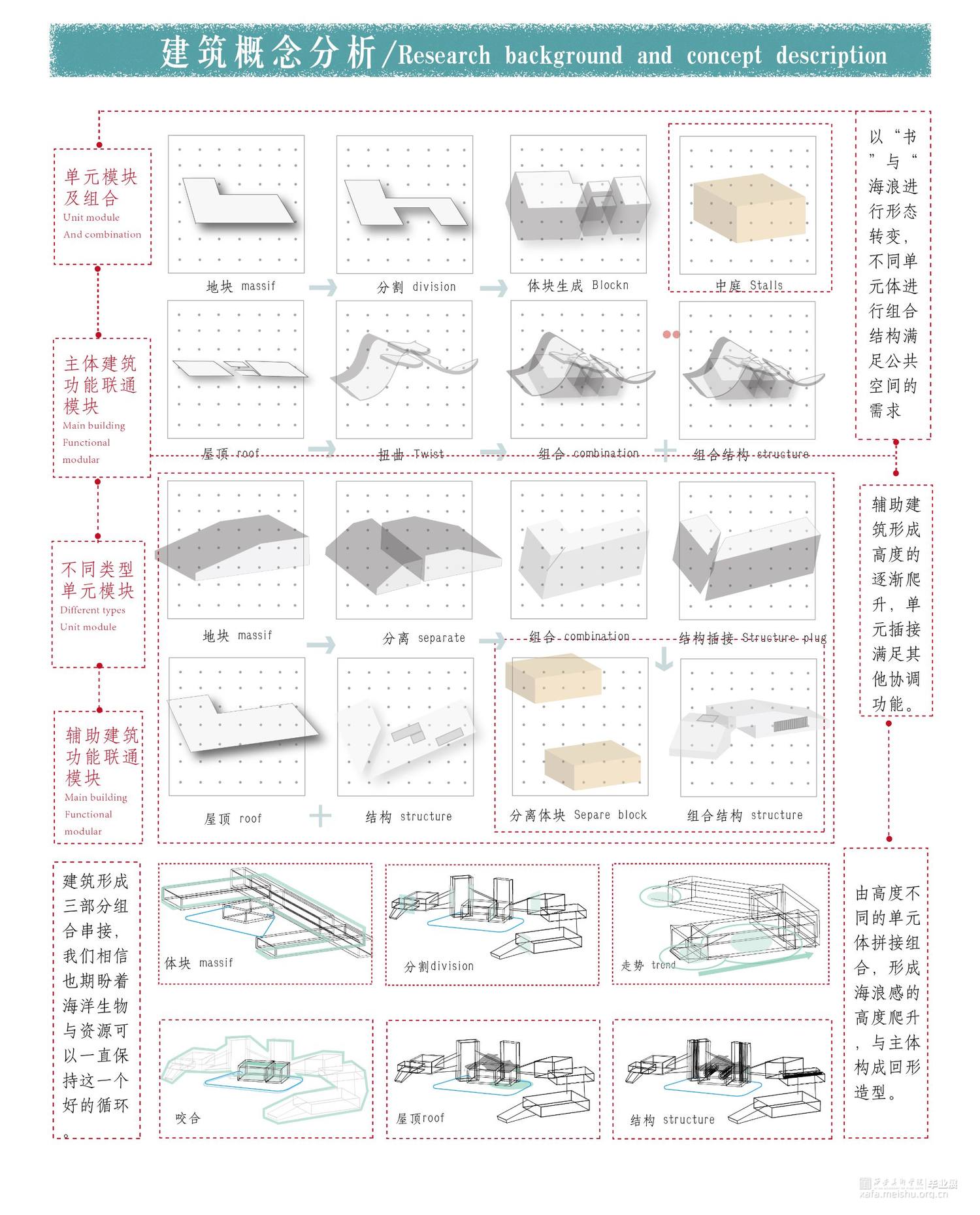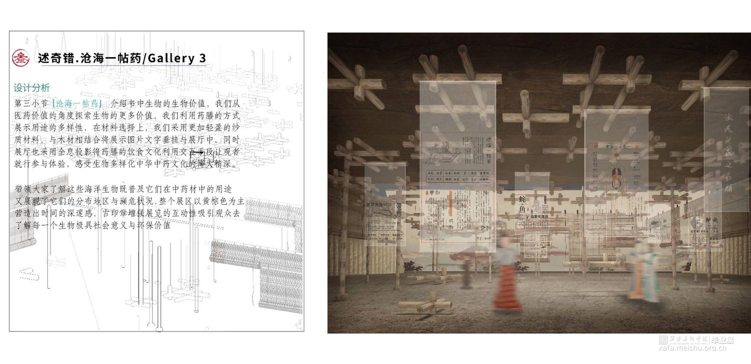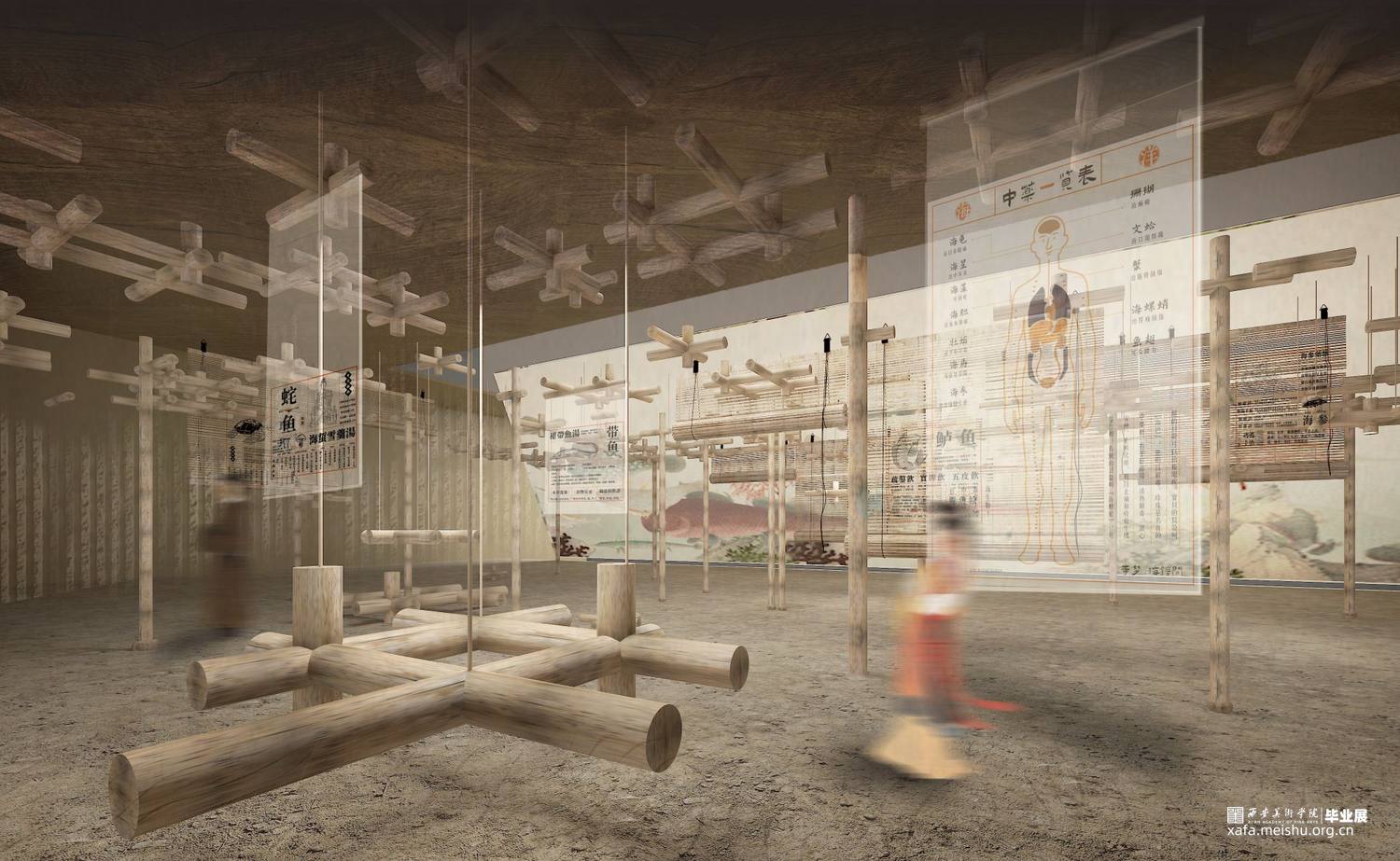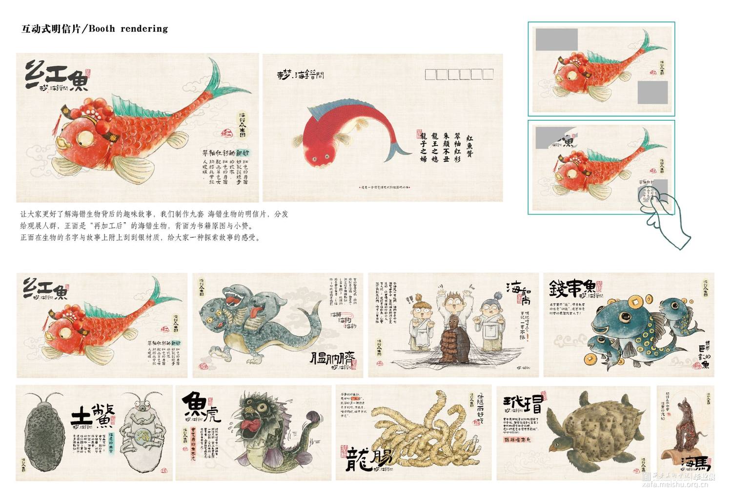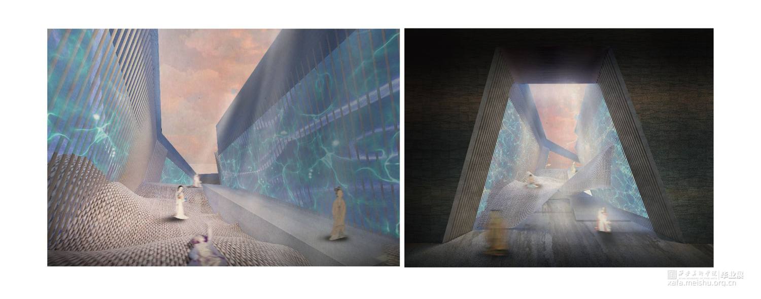 《海错图》是中国现存最早的一部关于海洋生物的科学画谱,我们初见时就被它丑萌可爱的画风所吸引,这种画风独特,图文并茂的记录形式在历史上是独一无二的。我们几经讨论以“一个属于奇妙海洋的梦”作为我们的创作出发点,通过平面语言与空间展示的手法,对《海错图》中七个物种分类进行整理展示设计,旨在构建一个无地域限制,新旧文化交融的展示场所,融入情绪化展线设计,激发文化活力,交融。在设计目标上将“内容艺术化造型展示+情绪化设计=文化创新展示”作为设计目标,结合书本的生物元素,归纳整理,提取元素,进行展馆建筑以及内部空间的设计构成。在区位上我们选择了西安作为我们的区域选址“奇梦.海错间”虽为宣讲古海洋生物知识的展示场所,但是我们的中心思想—让传统文化活起来的理念与古城西安不谋而合。在文旅融合的大背景下,通过持续深化“文化+”战略,打造出“西安年·最中国”文旅IP,让时尚鲜活的西安,越来越具有吸引力。建筑设计上,我们秉承“以梦与续存,古今交融”理念,提取书页在翻动时的造型与"回”字的理念,设计以水环绕的主体加衔接建筑的综合建筑体,表达以“现代”诠释“古今”,用建筑衔接“古今”。进入内部展厅,展陈区域占空间面积的三分之二,七个展厅分别分布于地上和地下两层,地上一层由序厅,二厅观沧海,六厅在人间与尾厅构成,地下一层由三厅述其错,与水下走廊,五厅闻化生共六个展示区域构成。配套设施有海错餐厅,公共区域,卫生间等。序厅以“厥贡盐絺,海物惟错”为主题,在展厅中心设计装置造型,利用水与自然光线打造一个海错梦境,让观者自然代入从想象的角度感知海错;第二展厅 - [观沧海] 以“创造此书的历程”为主题,以作者聂璜创作此书的时间流线为轴,在每一时间段,地点,遇到的人与事作为故事线,叙述《海错图》的创作由来,让观者逐渐进入海错梦境;第三展厅 - [述奇错] 以“从海错自身出发了解海错”为主题,以书本内容作为主旨内容,将书中七类生物就行归纳整理,第一小节 [海边所见] 是将海边生物按照地形的生存生长划分,以几何形态营造礁石,滩涂,潜水带等地形展示书中奇错,由海边逐渐进入深海世界;第二小节 [渔民所获] 由滩涂海边进入深海世界,探索古深海的海错生物,这些古深海中奇特生物,按照名字,形状,习性,进行分类展示,观者进入到一个由巨大渔网罩住的一个奇妙洞穴,在这些格子简中有不同种类的海洋生物,观者可以通过楼梯进入每一格子进行阅读了解;三小节 [沧海一帖药] 探索古深海生物的医药价值,这些古深海中奇特生物,从古至今都有极高的医药价值,在此小节我们从药膳角度从“药”与“吃”帮助观者趣味拓展,海错生物的奇妙之处。第五展厅 [闻化生] 是讲述书中奇妙传说的海错生物,这些生物真假不易,有些作者都反之怀疑自己的记录,正是这些不确定性让这个展区充满了奇特色彩。[神话传说] 主要是讲述两种传说生物,以蛟,龙为首,在展区的柱体结构上加入造型,形成两种结构交错向对,感受古代传说神秘。坐电梯回到地上一层,慢慢从奇妙梦境中“苏醒过来”,作为古代科技图谱,书中生物与当今海洋生物并没有什么大的差别,作为绝无仅有的奇书,《海错图》为我国海洋生物的研究与发展做出了卓越贡献,我们继续利用新媒体交互技术,将古书中的海洋生物与现有生物进行交叠存在,古书中的“海错”与现代动物学知识的融合与碰撞,展现海错图为现代海洋科学做出贡献。来到尾厅,这里既是休息区域也是展示区域。重塑“回”行概念,在空间造型上就行沿用,藤条元素,光线由顶面,照耀中心水域,一切回归本源,沉浸思考空间,探讨海洋资源的可持续发展。