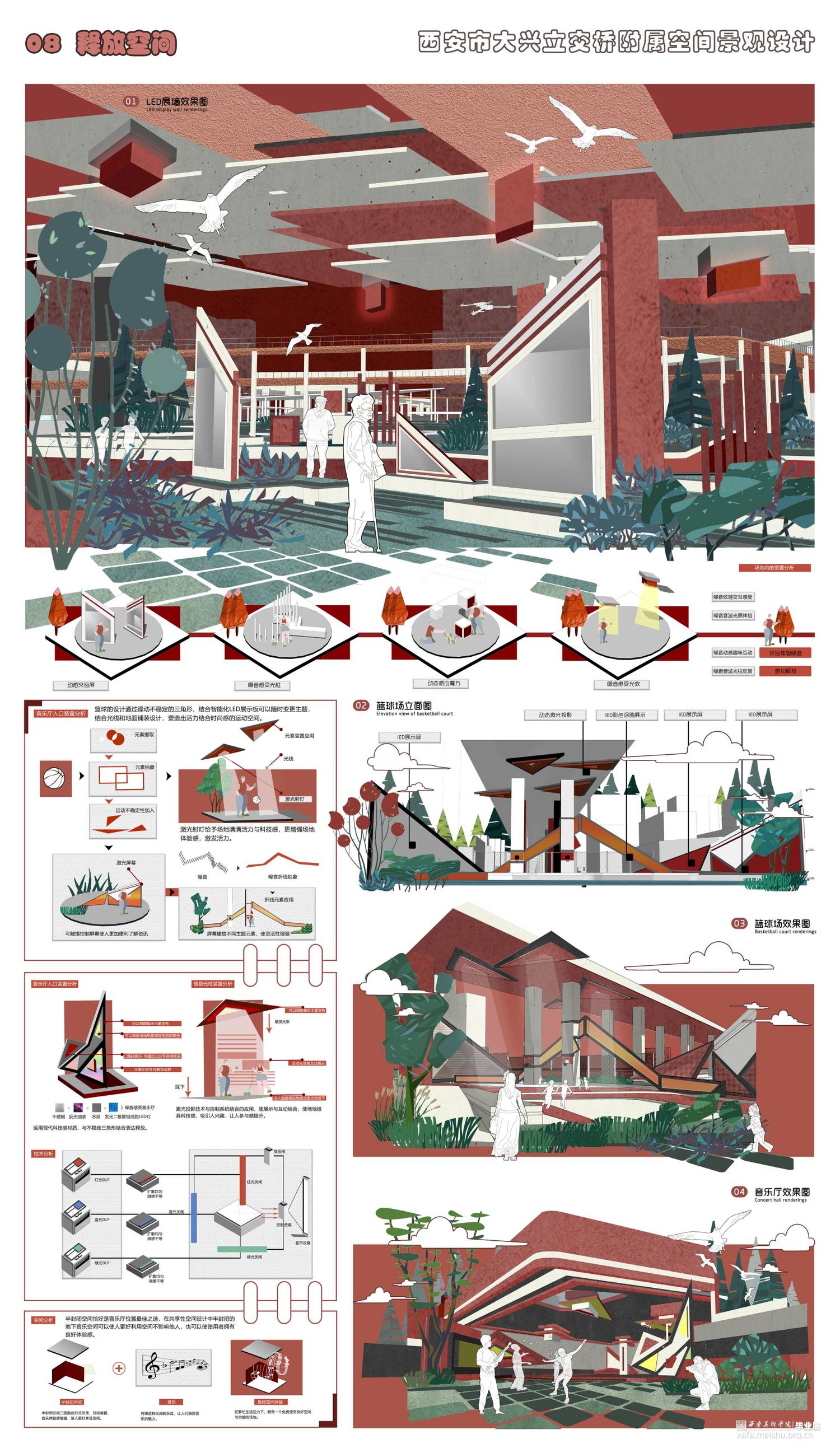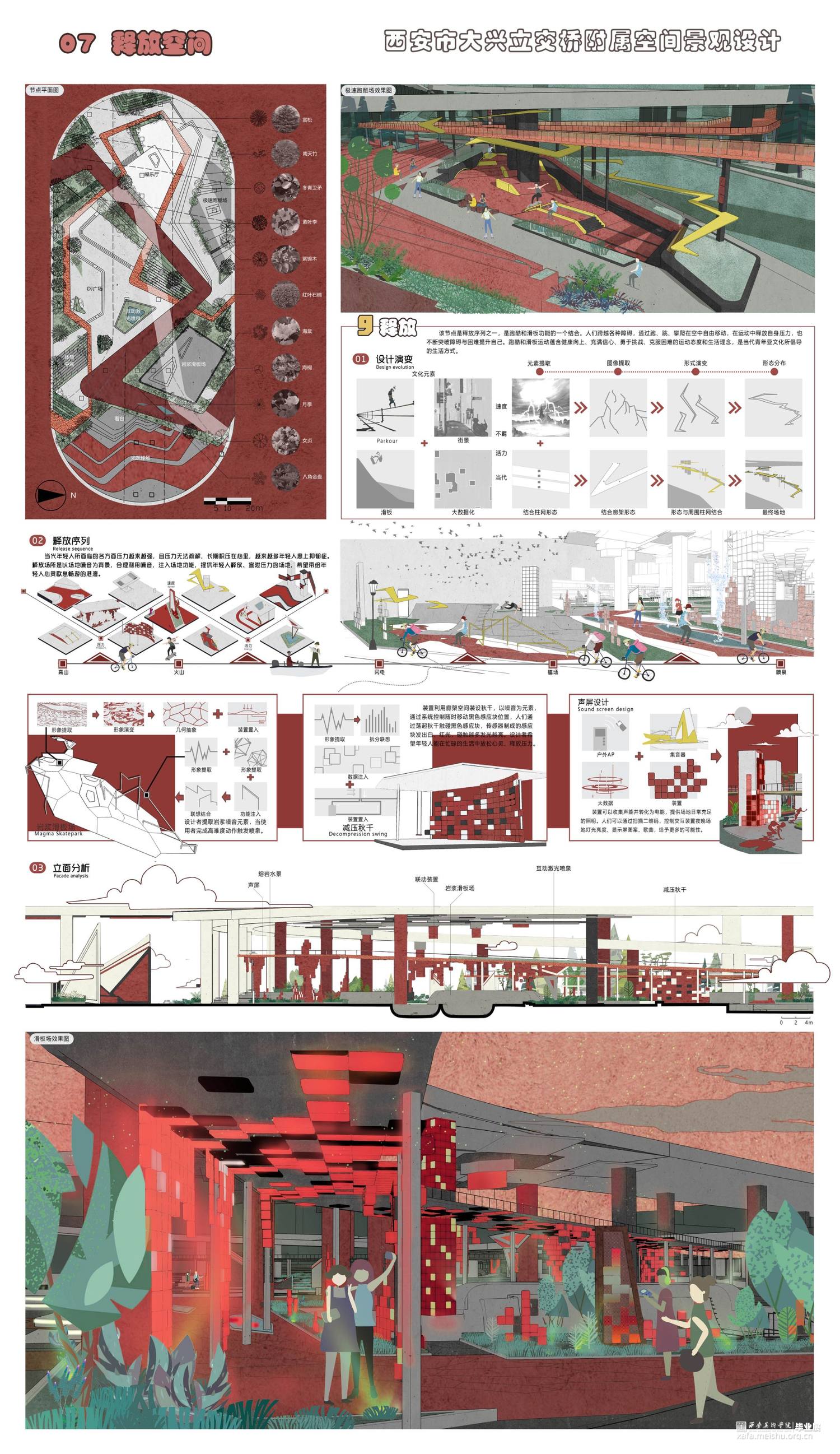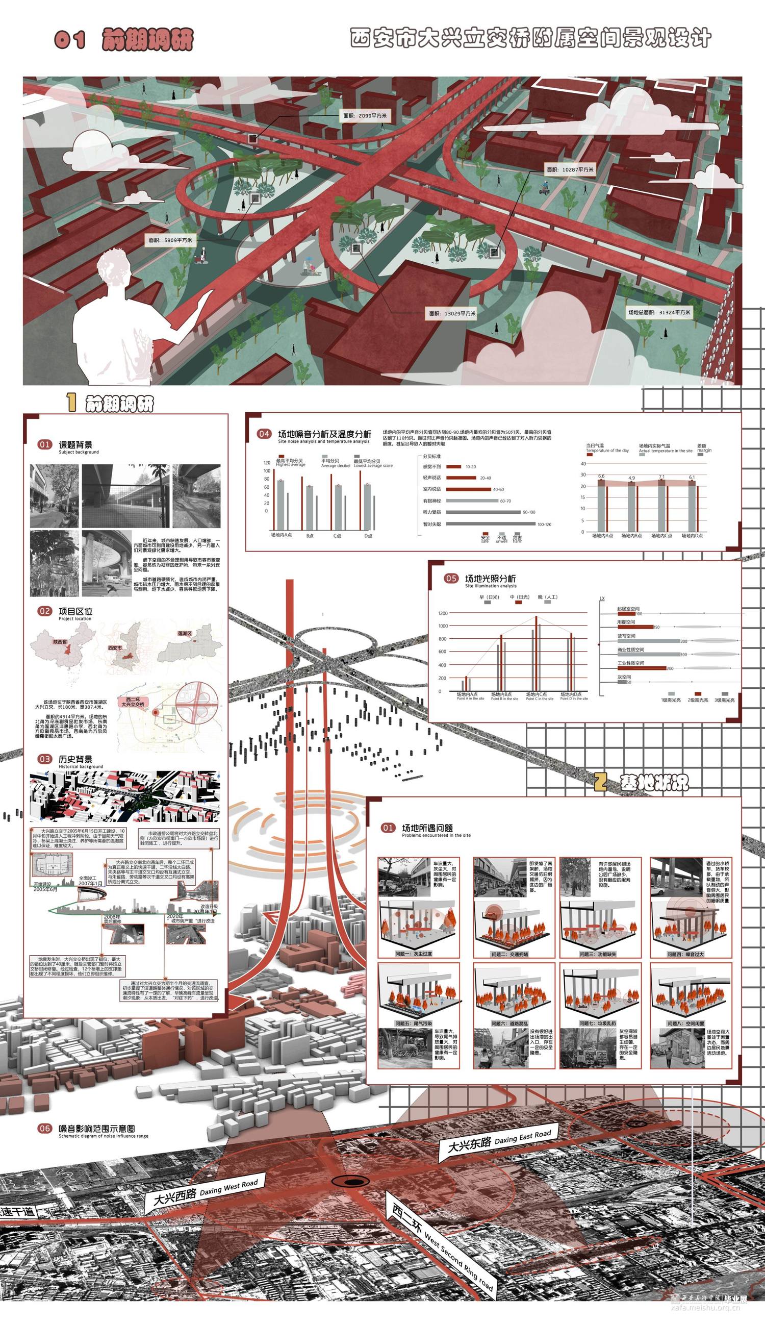 高架桥的出现给人们出行解决了许多问题,与此同时由它的背光面引发的问题也不断增多。人们对于高架桥初始的想法是用它的受光面来解决城市交通拥挤的问题,但由于高架桥而形成的桥下灰色空间却变得难以利用,成为城市的消极空间,这个消极空间存在着光线、高度受限的问题,同时由于四周及上方都是市政交通,也存在着灰尘大、噪声严重的问题。高架桥下消极空间的出现,不仅使周围居民出行出现问题,也使得经过这个场地的人们存在着一定的安全隐患,加上城市的可利用空间越来越少,如何利用高架桥下的消极空间显得尤为重要。此次设计,旨在将高架桥下