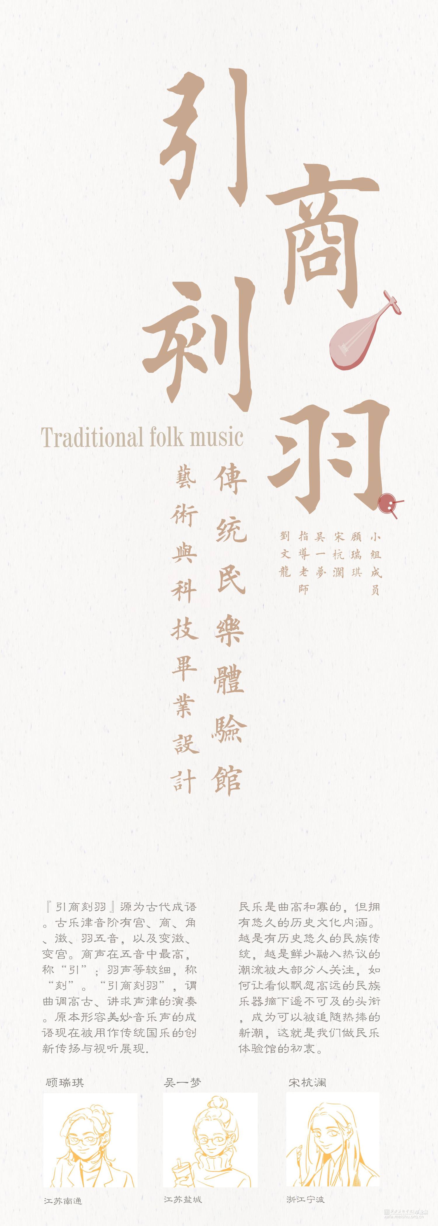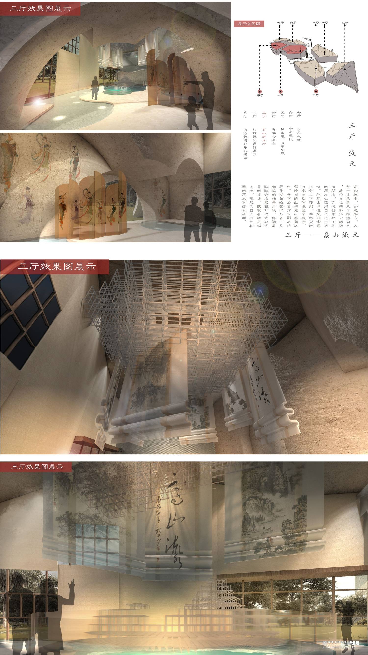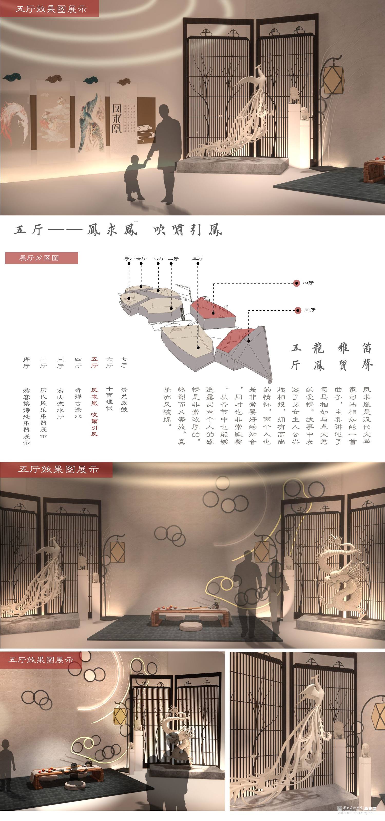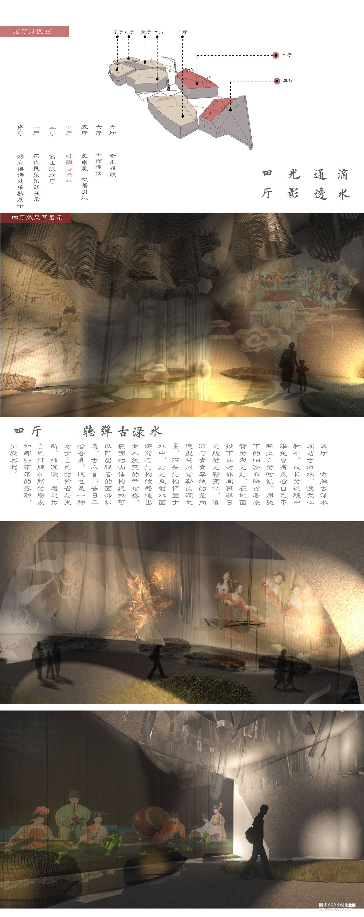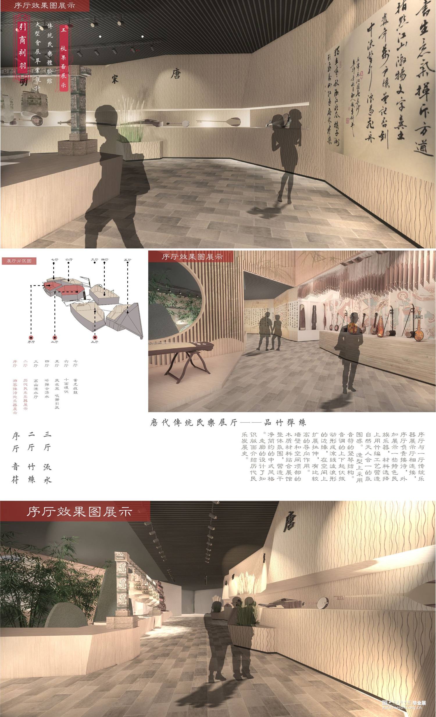 在大时代的发展下结合多媒体的传播融合,迎合大众审美,我们所做的设计在传统文化展示方向上创新再造,寻求一条有文化内涵又让大众所感兴趣的民乐展示空间。