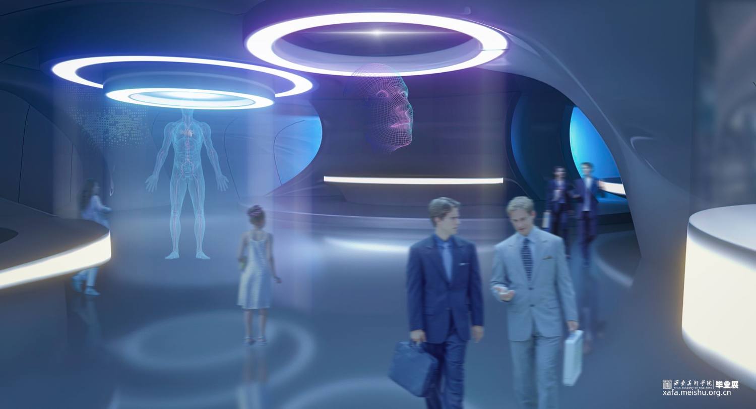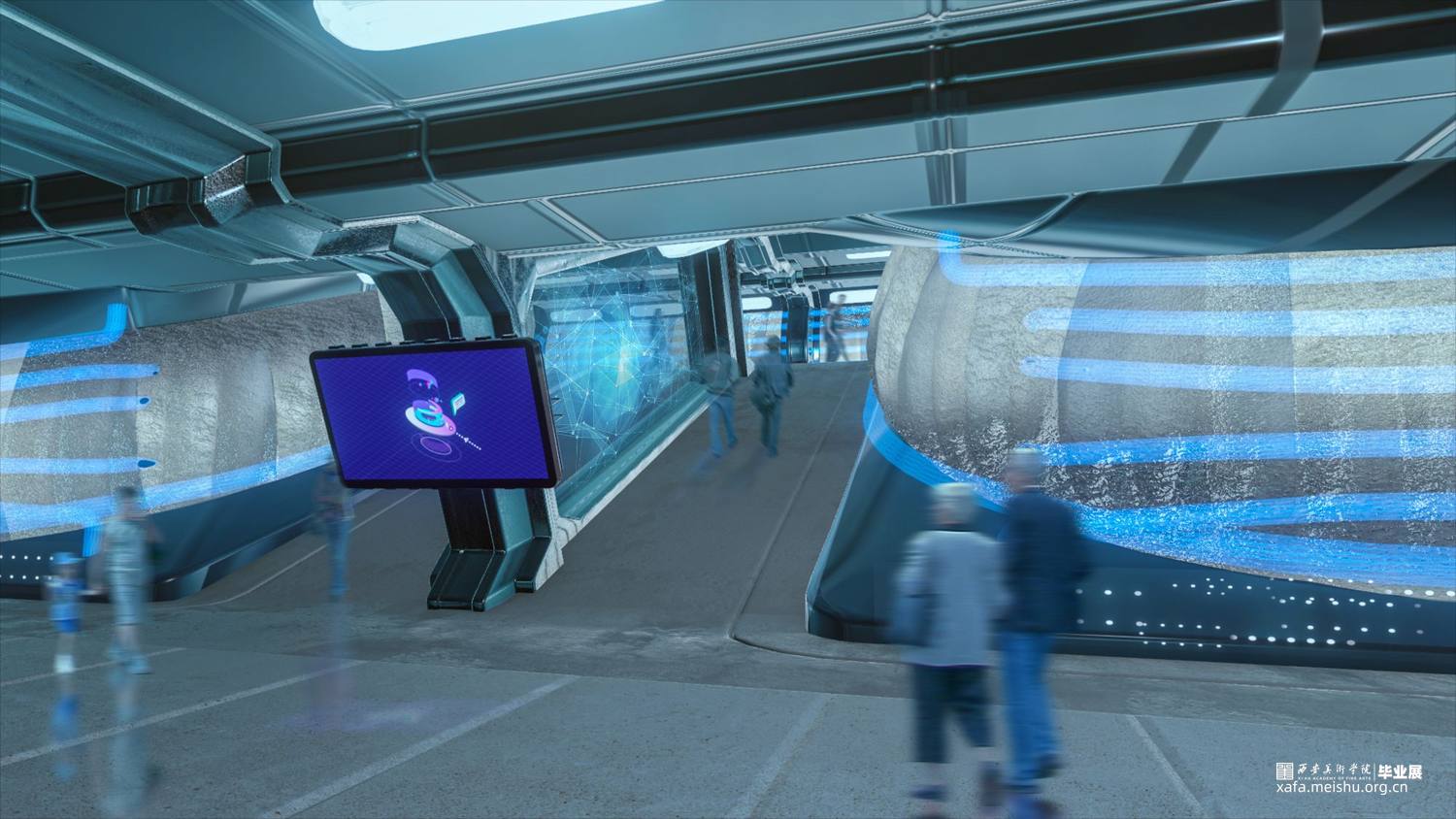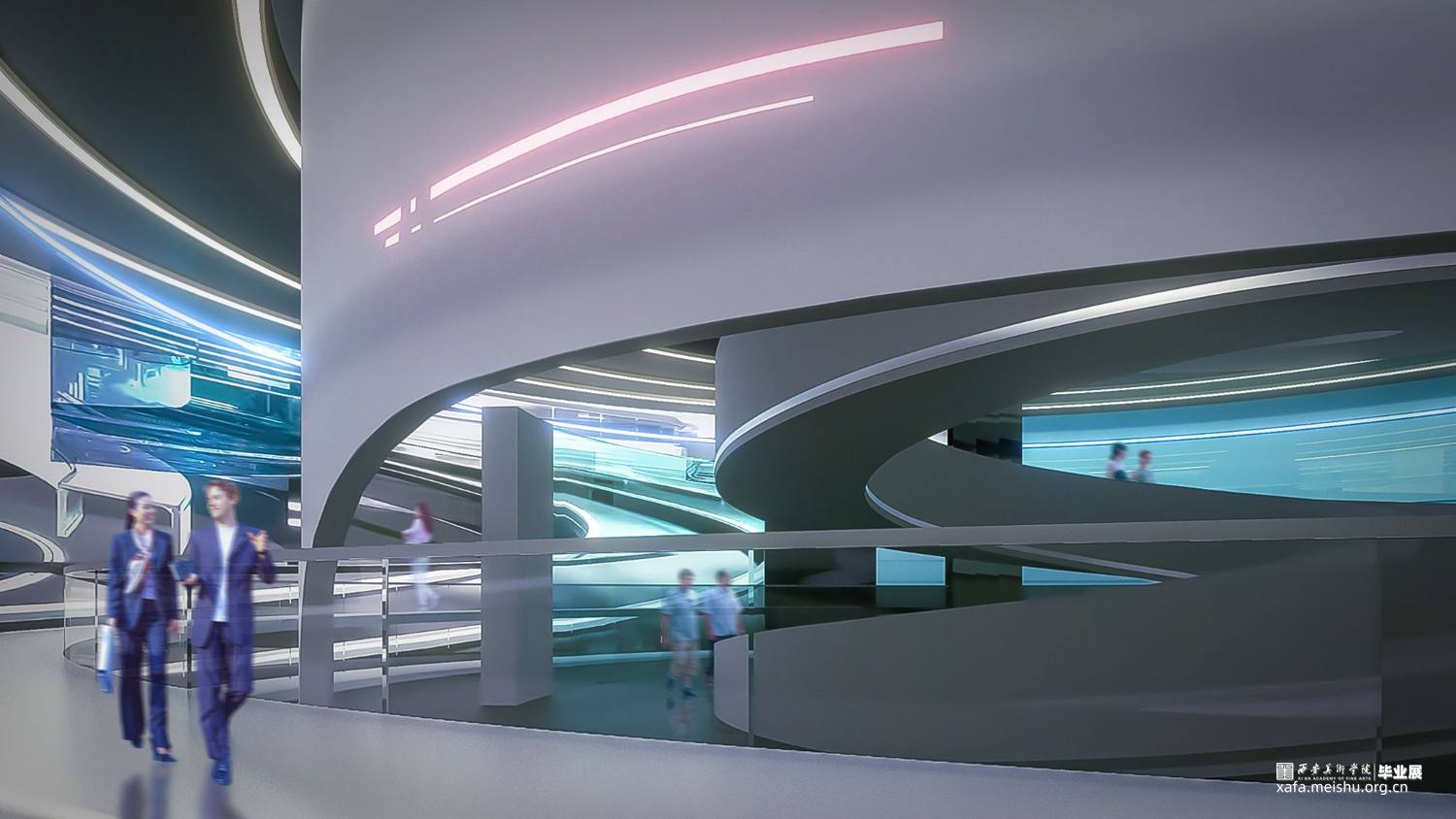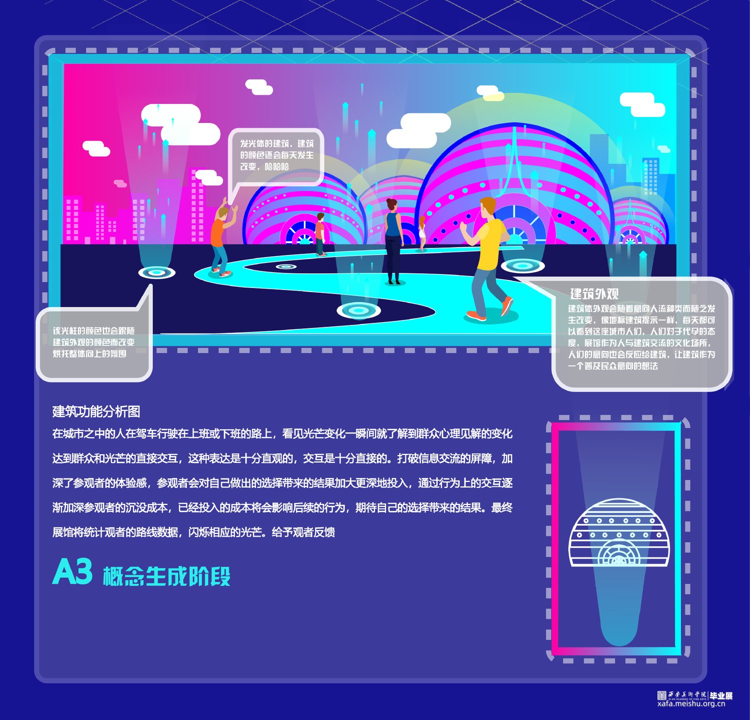 以往的传统展示空间,信息只是单一的传递,展馆作为文化场所,传递信息,人们作为接受者,了解信息。此次设计的展馆空间,除了在人流动线以及抉择之环的交互外,也希望展馆可以接收大众信息的反馈,提出“人与建筑的交互“,“建筑与周围人群、周围环境的交互”,即展馆通过收集参观者的人流动线路径,以及人们最后的数据投票来做统计,若选择借腹生子的观者较多,则夜间建筑外观散发红色的光芒,代表着对城市的预警,对城市的警示,若选择自然孕育的人数较多,则夜间散发蓝色的光芒,代表一种健康和谐的状态,这样建筑外观就像一种预报统计器一般,告知城市参观人群的想法乃至整个城市人们的想法。