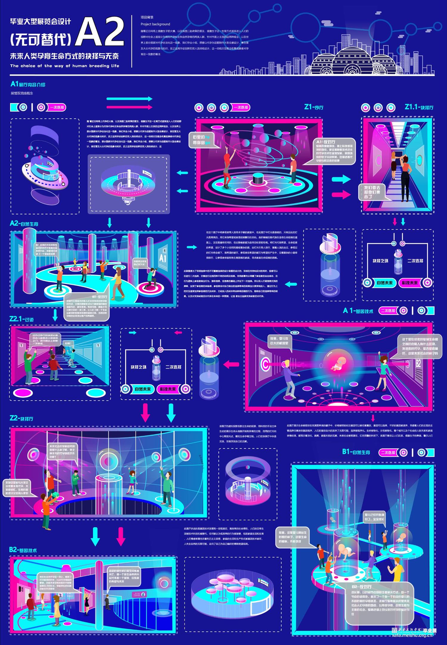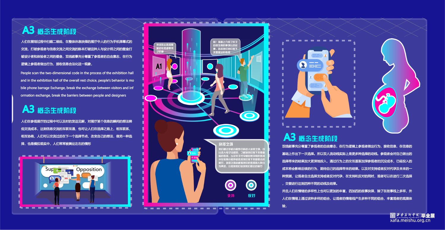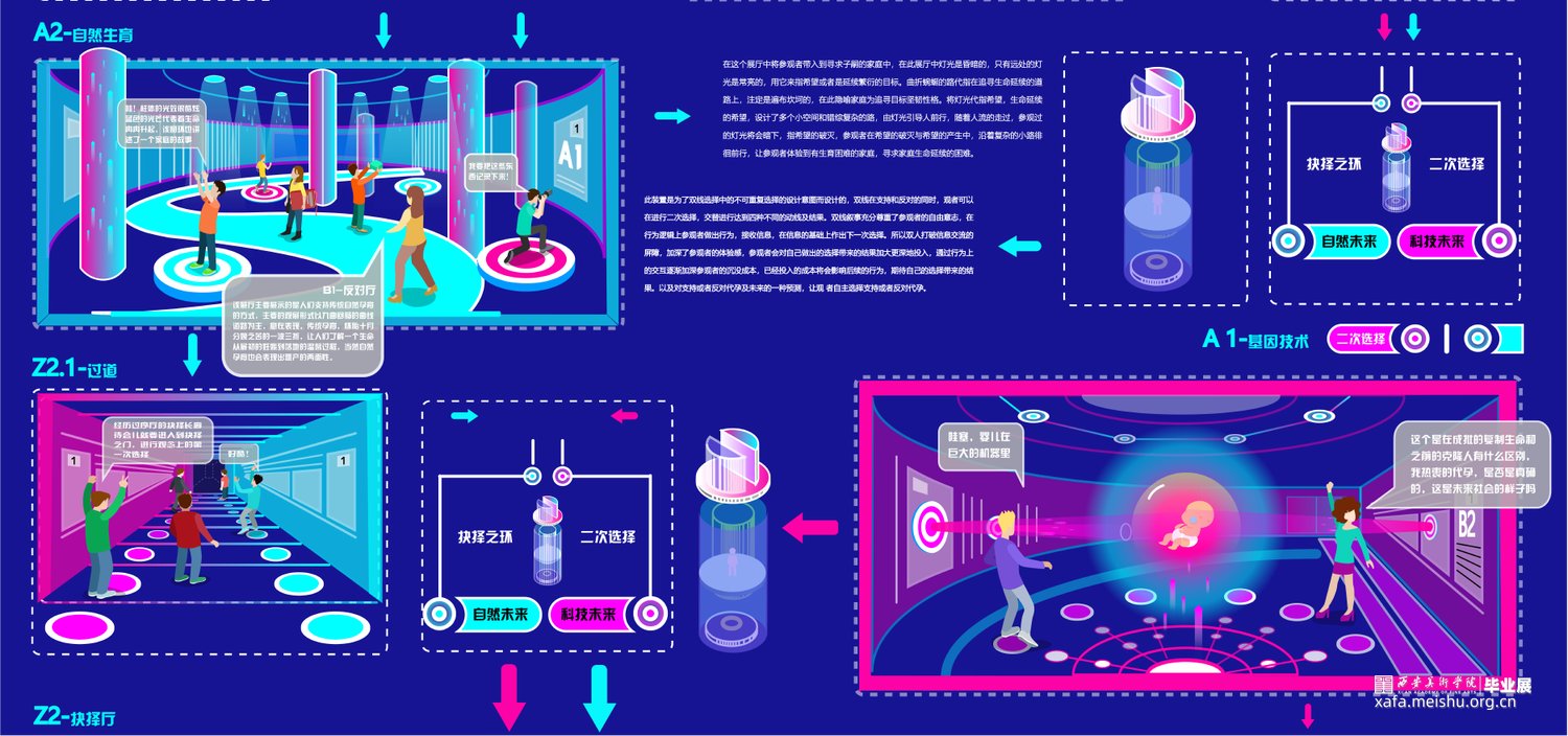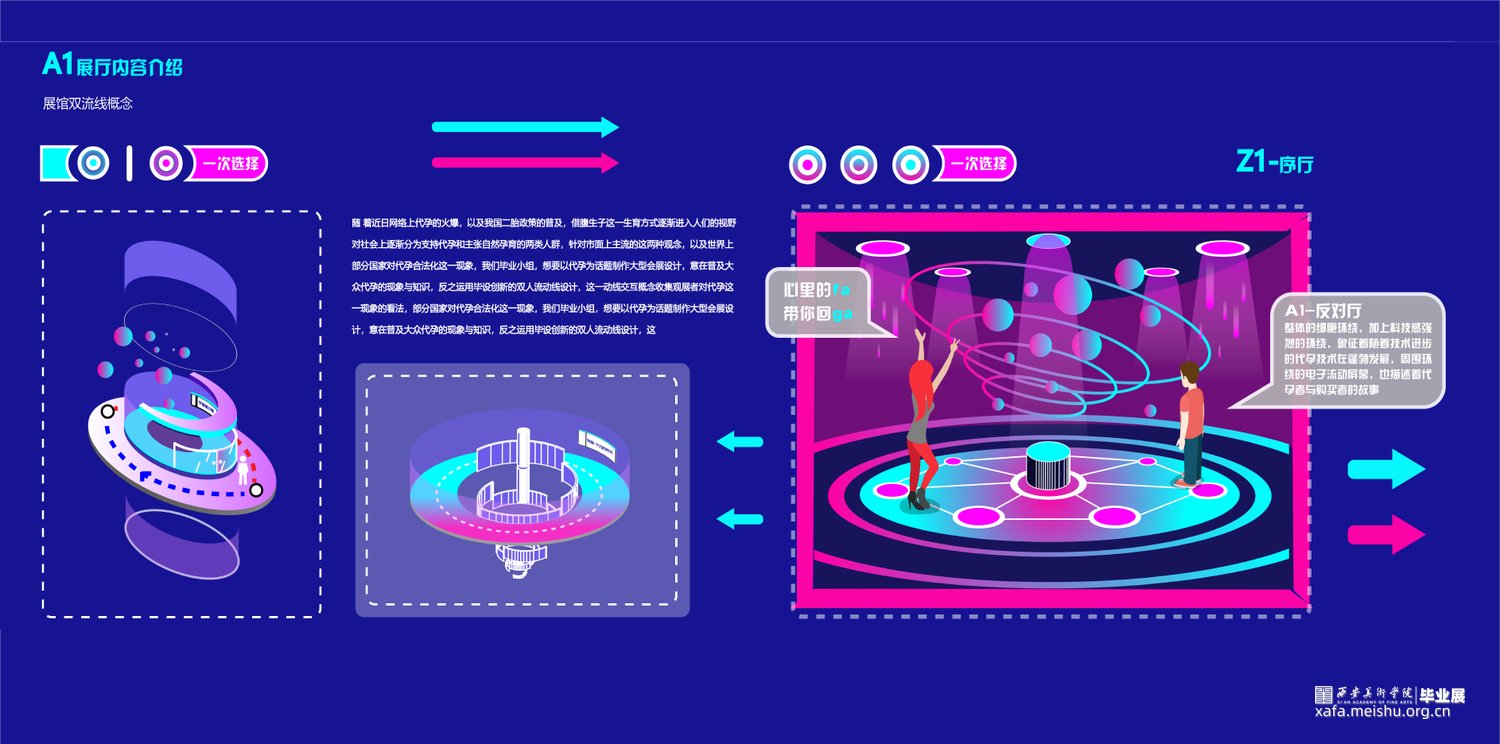 该大型会展设计意在强调抉择,区别于一般展陈设计的单一人流动线,让观众自主选择独立思考,又可以相互交流,让持有不同观点的人群,能通过不同的路线组合,创造出不同的故事线以及情绪线,我们通过客观的陈述两种孕育方式的介绍,以及对未来社会人际关系的预测、探索希望人们通过自主选择,了解这一事实并独立思考,打破传统展馆被动式接收信息,充分调动积极性,增加场所的探索性、互动性,使观展流程变得生动有趣。提出并且放大“人流动线交互”这一概念