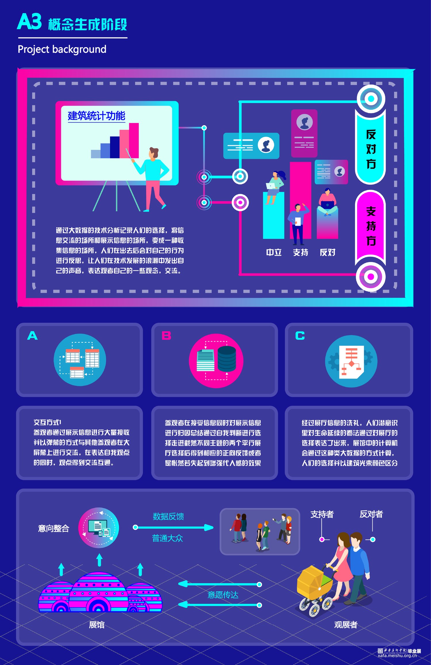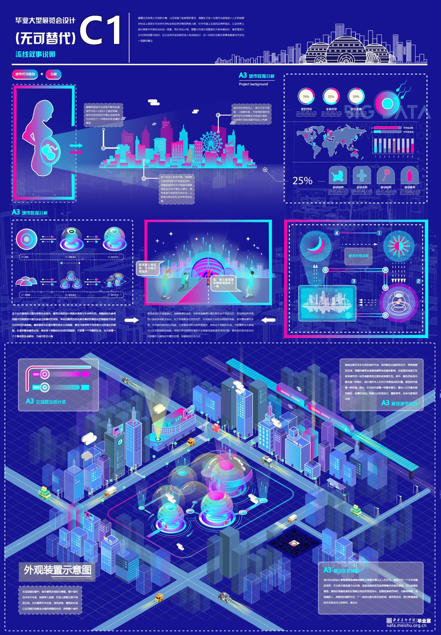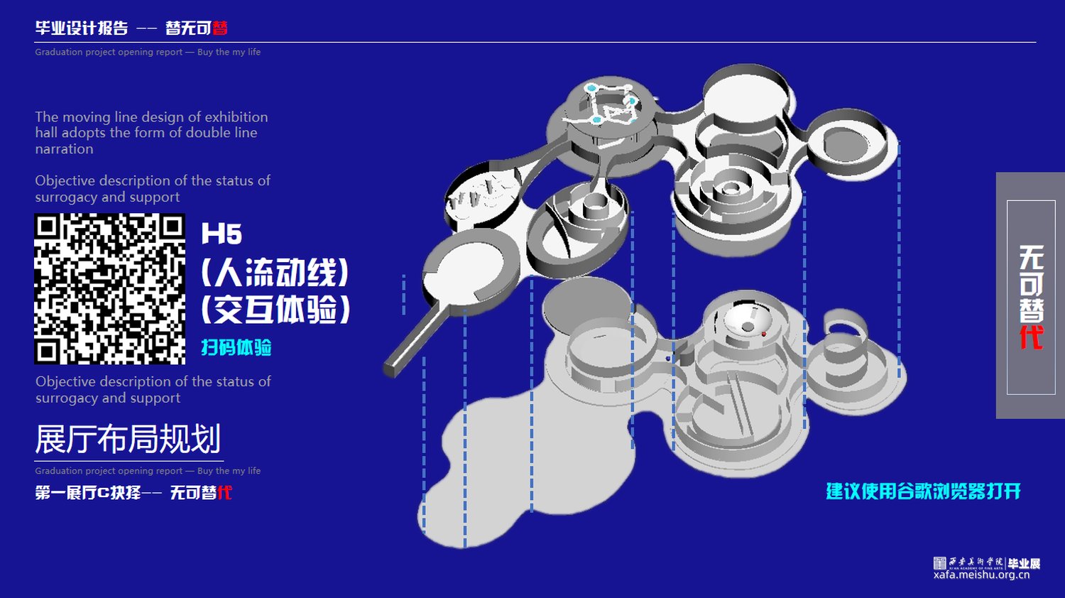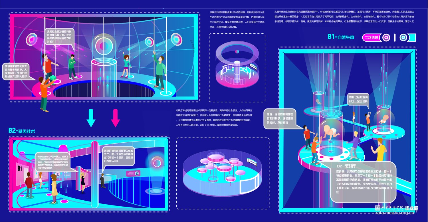 该大型会展设计意在强调抉择,区别于一般展陈设计的单一人流动线,让观众自主选择独立思考,又可以相互交流,让持有不同观点的人群,能通过不同的路线组合,创造出不同的故事线以及情绪线,我们通过客观的陈述两种孕育方式的介绍,以及对未来社会人际关系的预测、探索希望人们通过自主选择,了解这一事实并独立思考,打破传统展馆被动式接收信息,充分调动积极性,增加场所的探索性、互动性,使观展流程变得生动有趣。提出并且放大“人流动线交互”这一概念