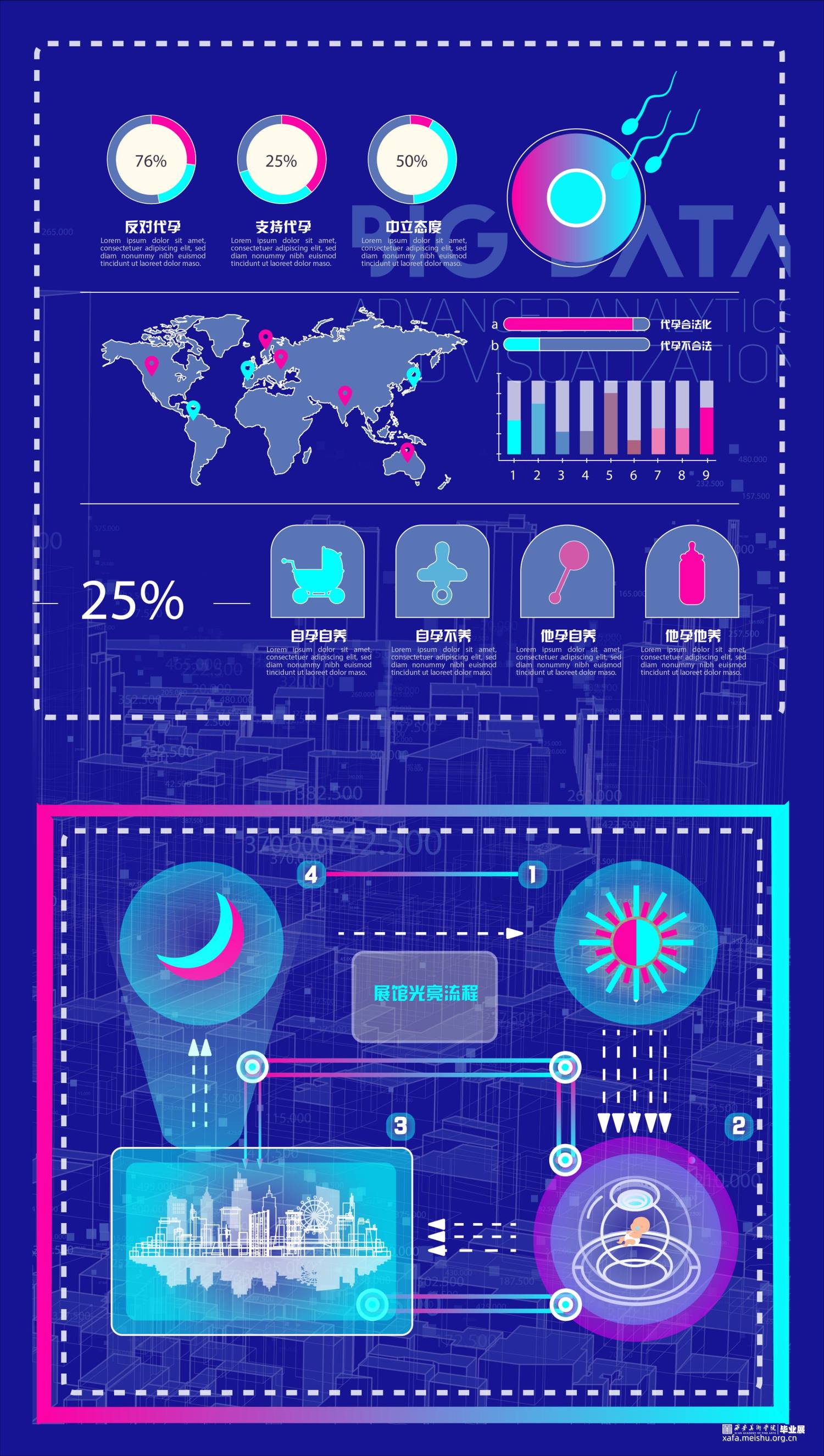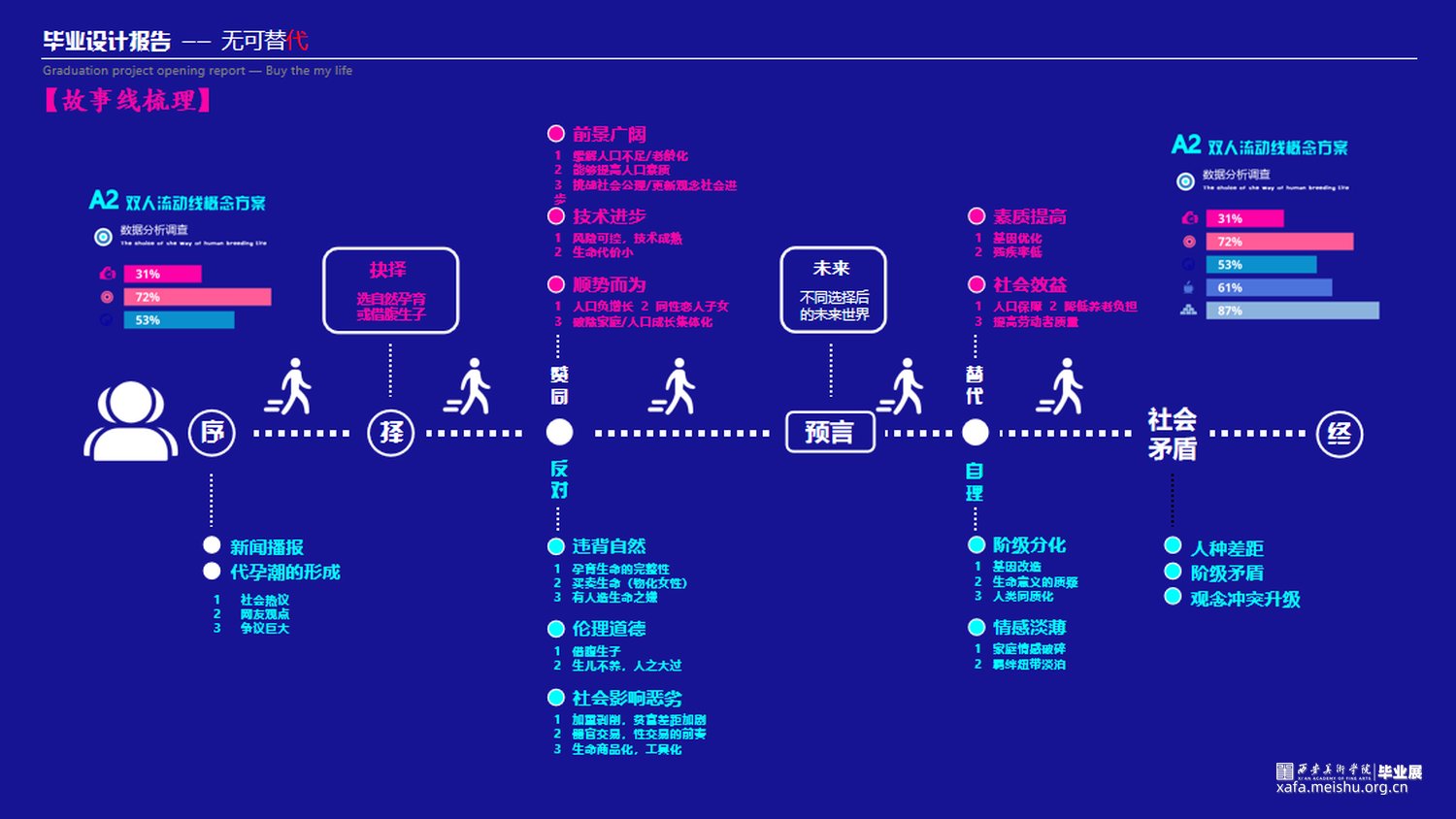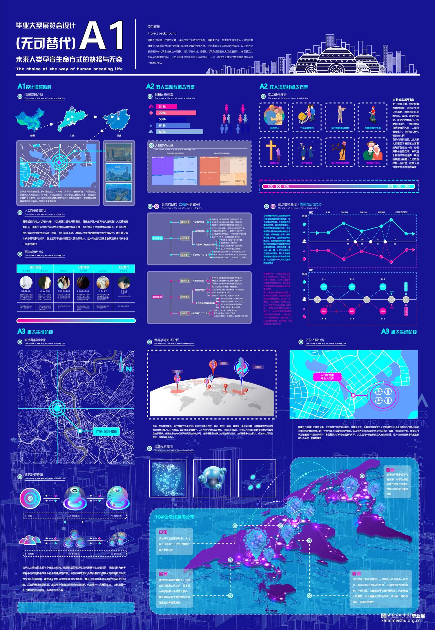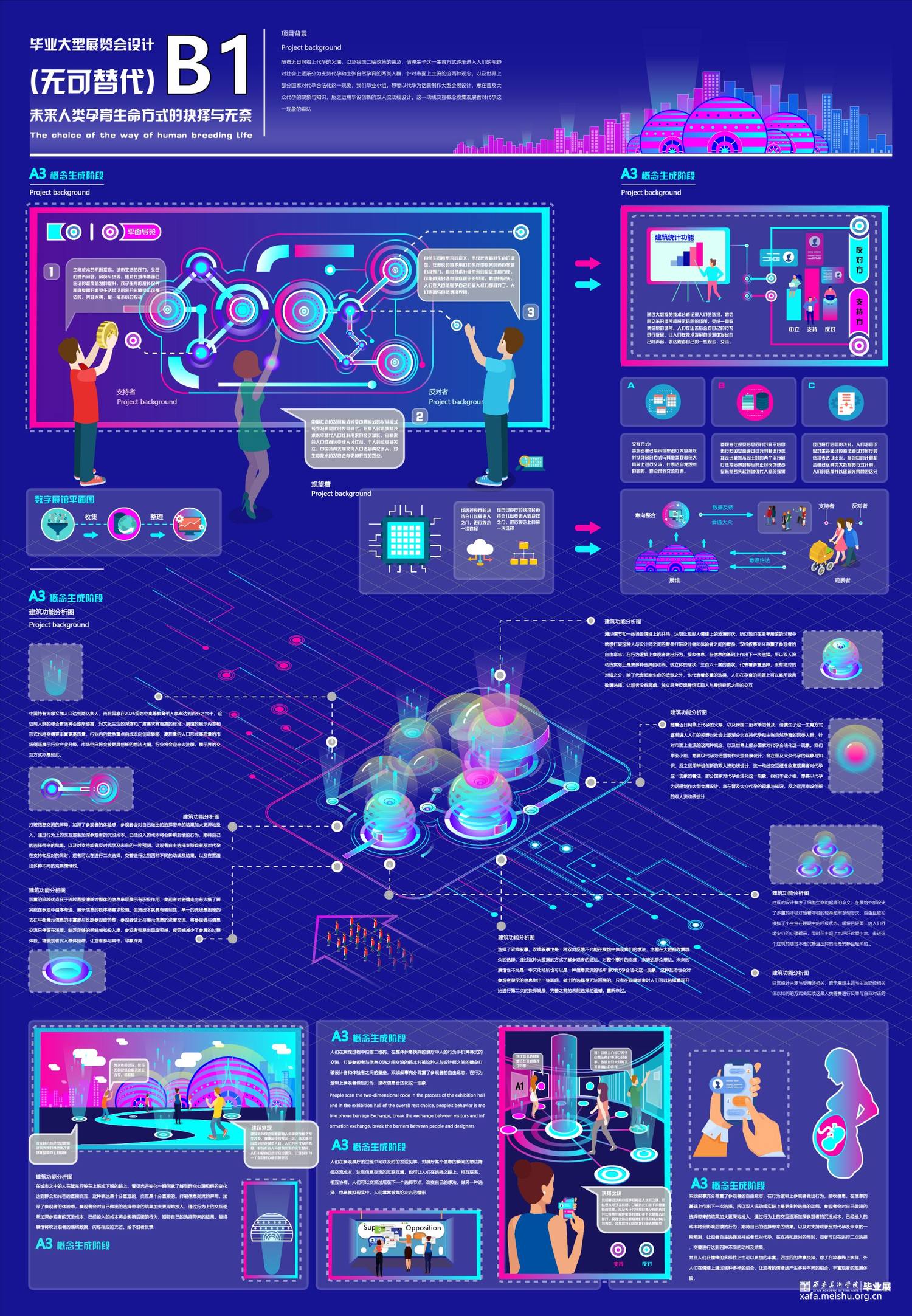 该大型会展设计意在强调抉择,区别于一般展陈设计的单一人流动线,让观众自主选择独立思考,又可以相互交流,让持有不同观点的人群,能通过不同的路线组合,创造出不同的故事线以及情绪线,我们通过客观的陈述两种孕育方式的介绍,以及对未来社会人际关系的预测、探索希望人们通过自主选择,了解这一事实并独立思考,打破传统展馆被动式接收信息,充分调动积极性,增加场所的探索性、互动性,使观展流程变得生动有趣。提出并且放大“人流动线交互”这一概念