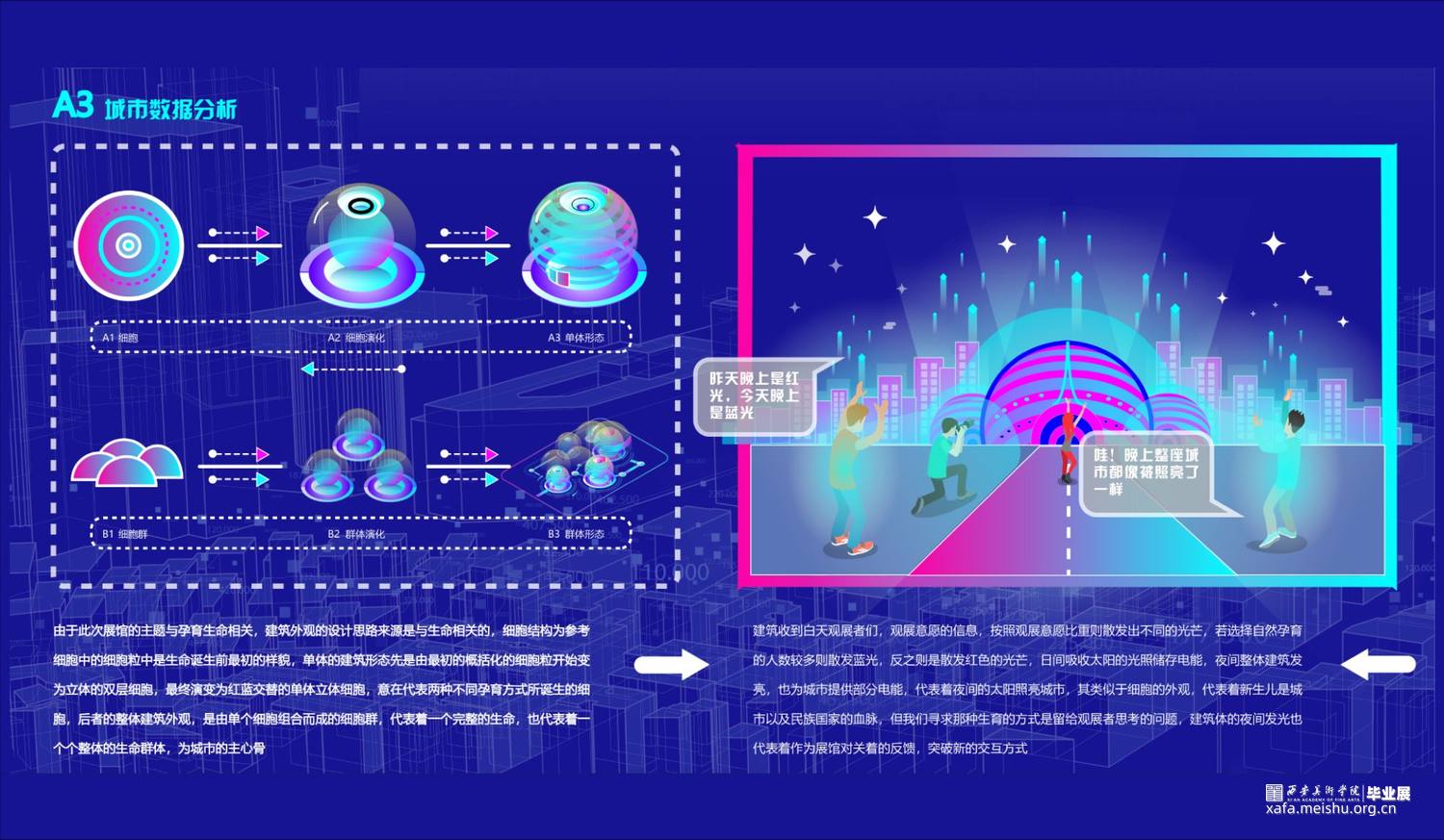 我们认为建筑外观的光体还有其他寓意,建筑外观白天通过吸收太阳光,来为晚上的光照供能,为周围建筑供电,其建筑形态又类似于细胞体的组合象征着生命,意在表达,新生婴儿是整个城市乃至民族的未来与希望,但选择哪种孕育生命的方式,需要人们反思、思考、选择。