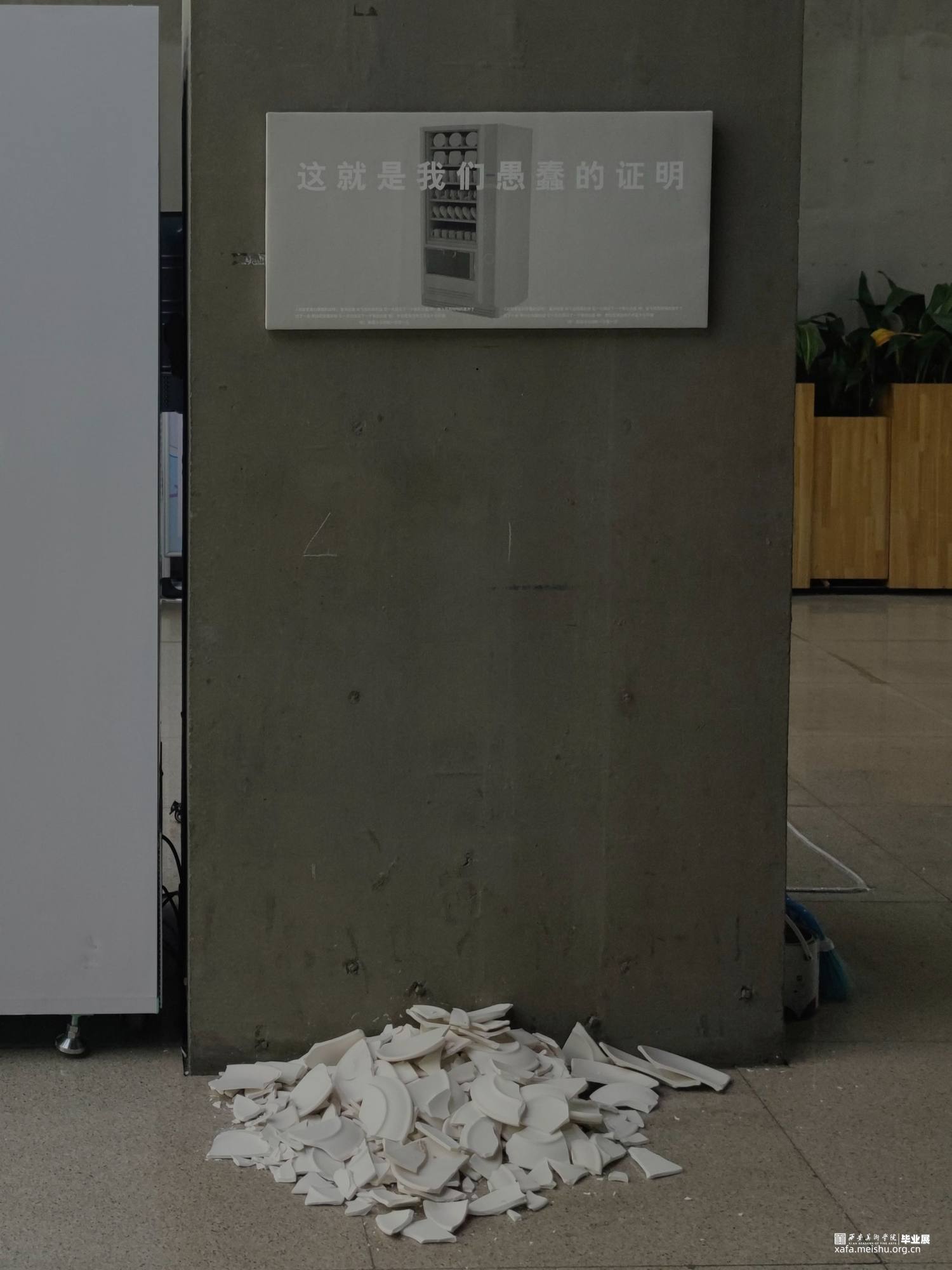 我们的这个毕业设计作品并不只是一个“咵嚓”一下碎掉就没有后续的作品,而是暗示整个消费主义的缩影:在快速发展的商业社会体系里,如果不注意节约,仅仅是满足一时一刻的消费快感,那么这一套消费系统就显得有些荒诞。作品名字之所以取名《这就是我们愚蠢的证明》,正是想给这套商业系统进行一次艺术方式上的提醒,让受众看到之后,对物质主义、消费时代有所惊醒和一丝丝刺痛,从而希望引发参与者更深入的思考。