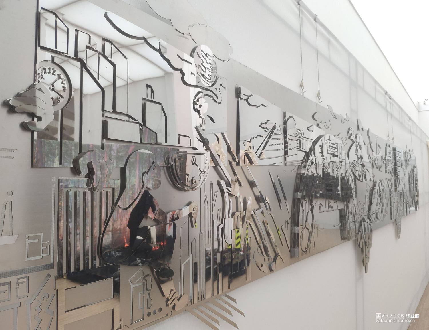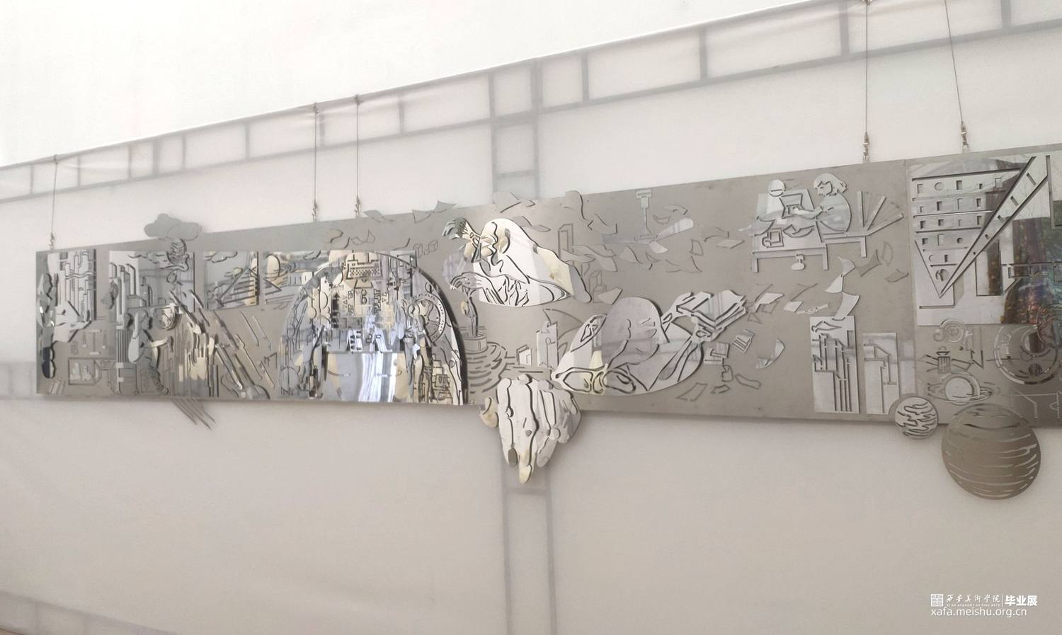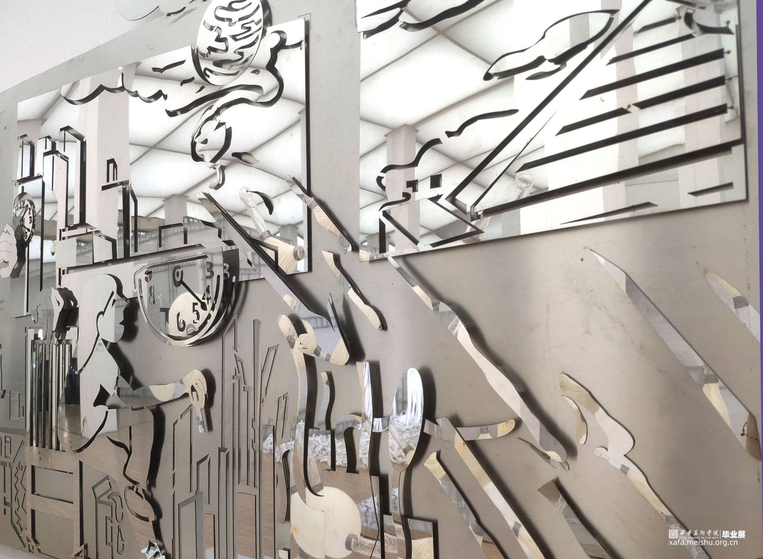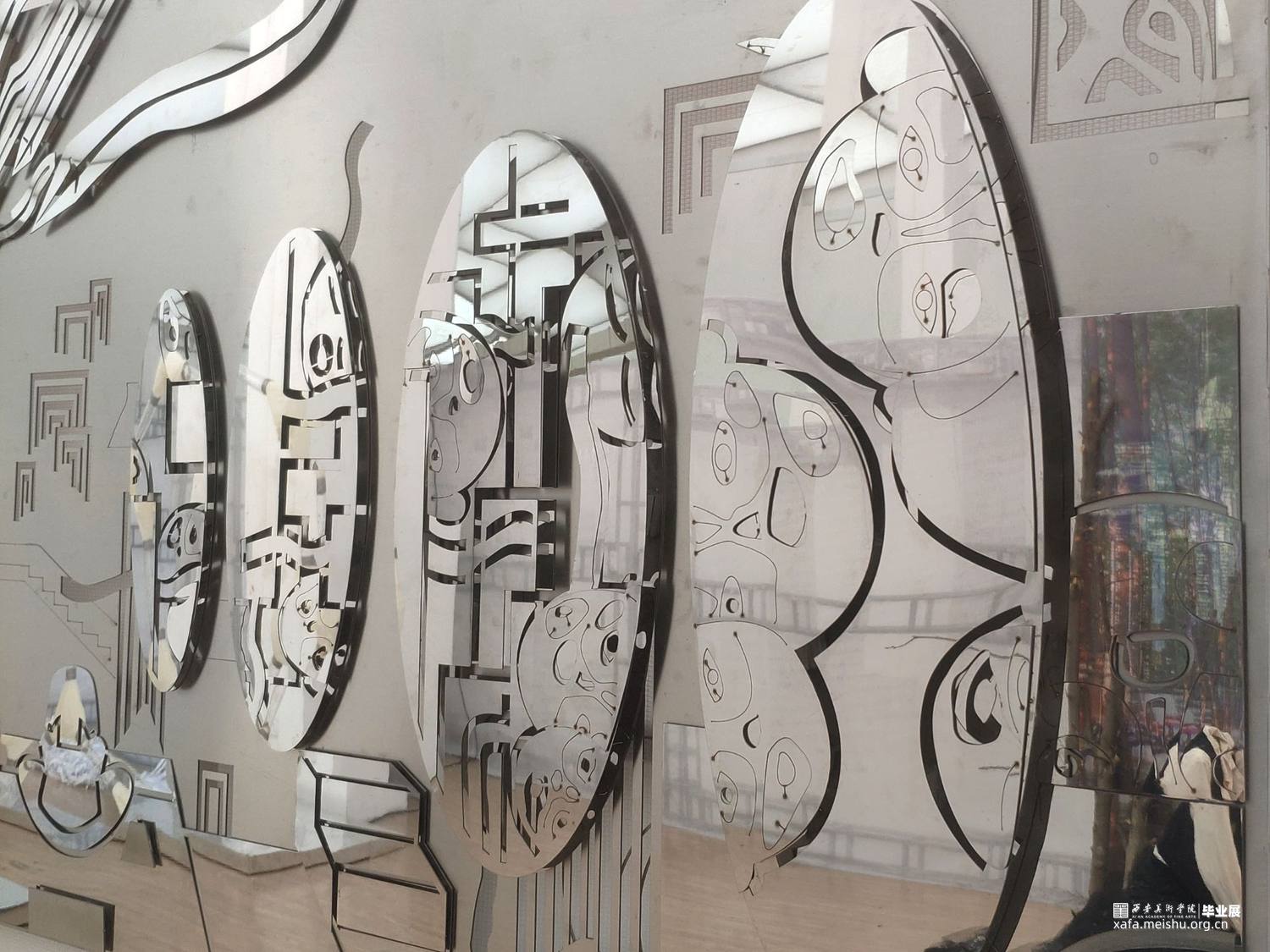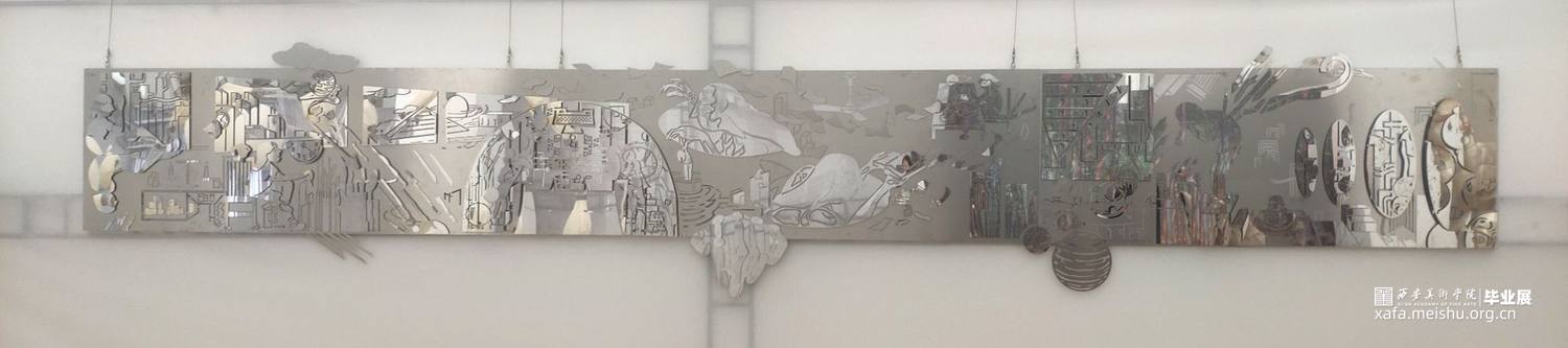 以拉丝钢和镜面不锈钢两种金属板材为主要制作材料,通过激光切割和多层次板材叠压拼接的技术来实现作品,几何元素图形的丰富组合营造出跃动的画面空间感