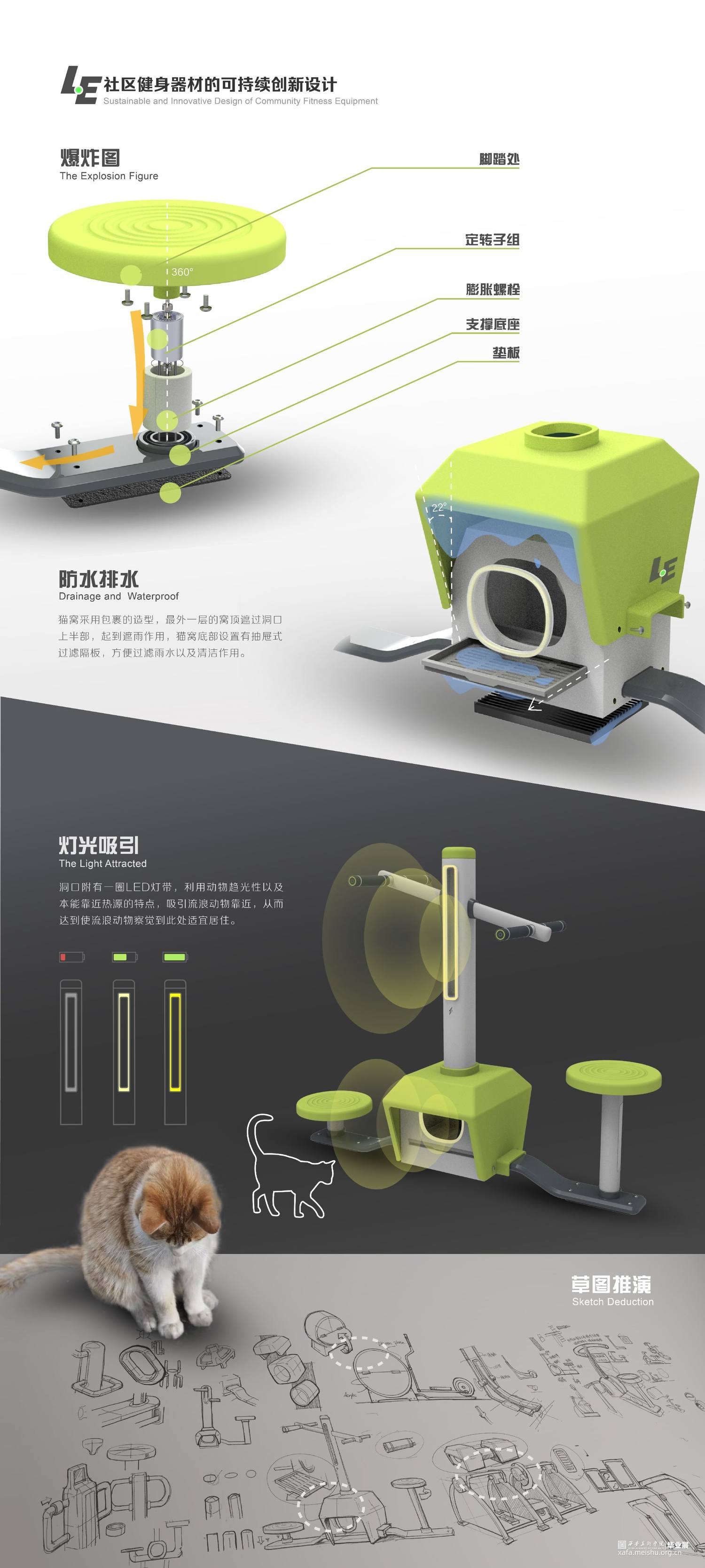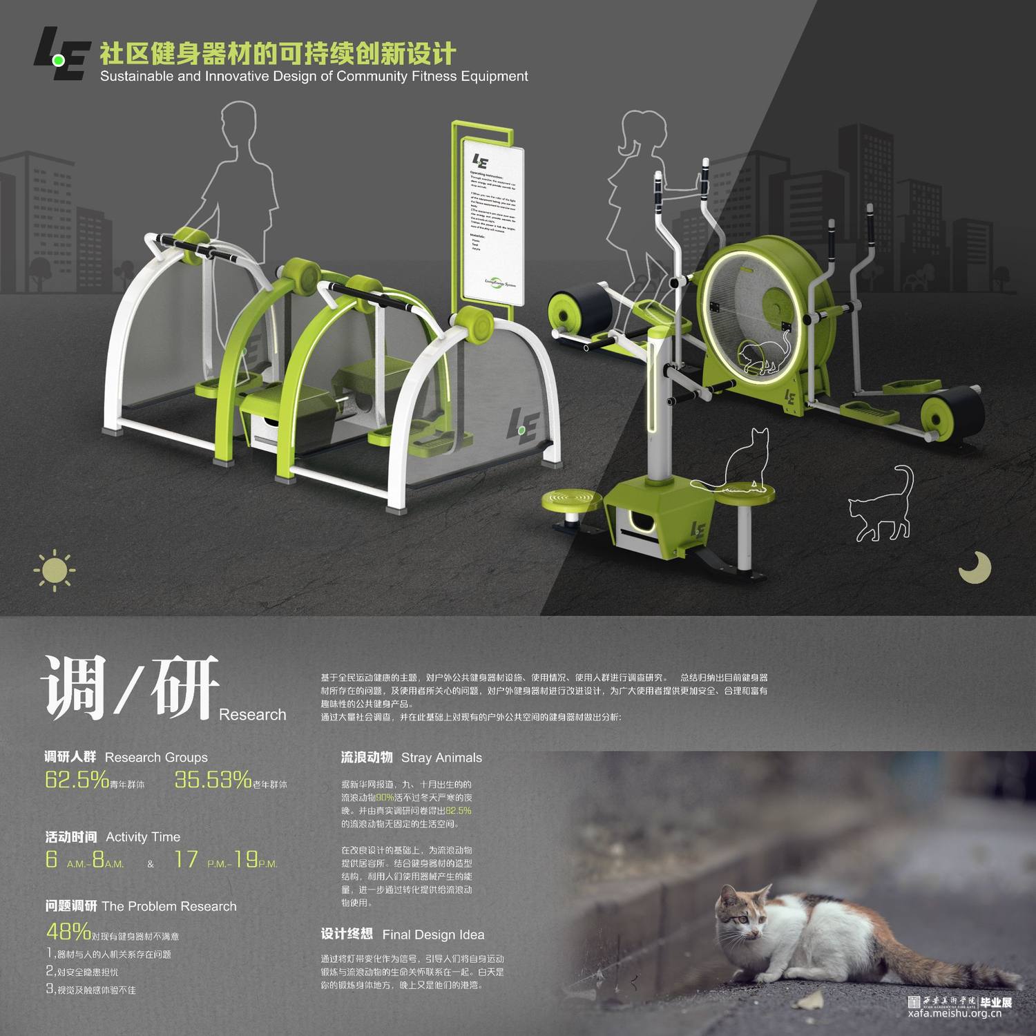根据调查得到的结果作为探索开发新型创新性健身器材类型的依据,将视角放在人与物与自然和谐共处的基础上,在健身器材上做更多情感化设计,例如利用适当的空间作为流浪动物的居容所,达到进一步利用公共空间的目的。使人们将自己的运动锻炼与流浪动物联系到一起,以激发人群的同理心,让人们意识到自己的运动可以为流浪动物提供帮助,进而主动地去运动锻炼。
