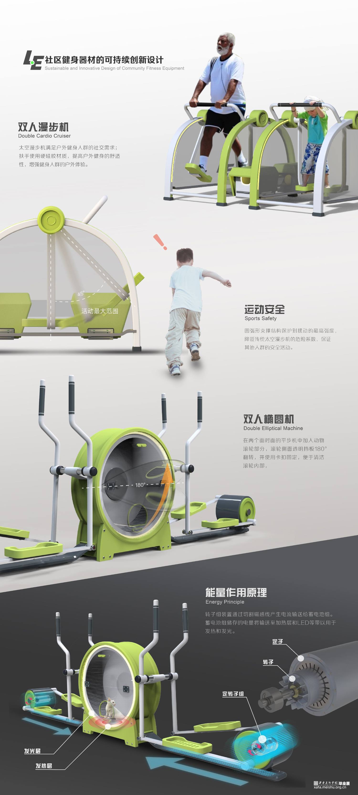基于全民运动健康的主题,对户外公共健身器材设施、使用情况、使用人群进行调查研究。 总结归纳出目前健身器材所存在的问题,及使用者所关心的问题,对户外健身器材进行改进设计,为广大使用者提供更加安全、合理和富有趣味性的公共健身产品。