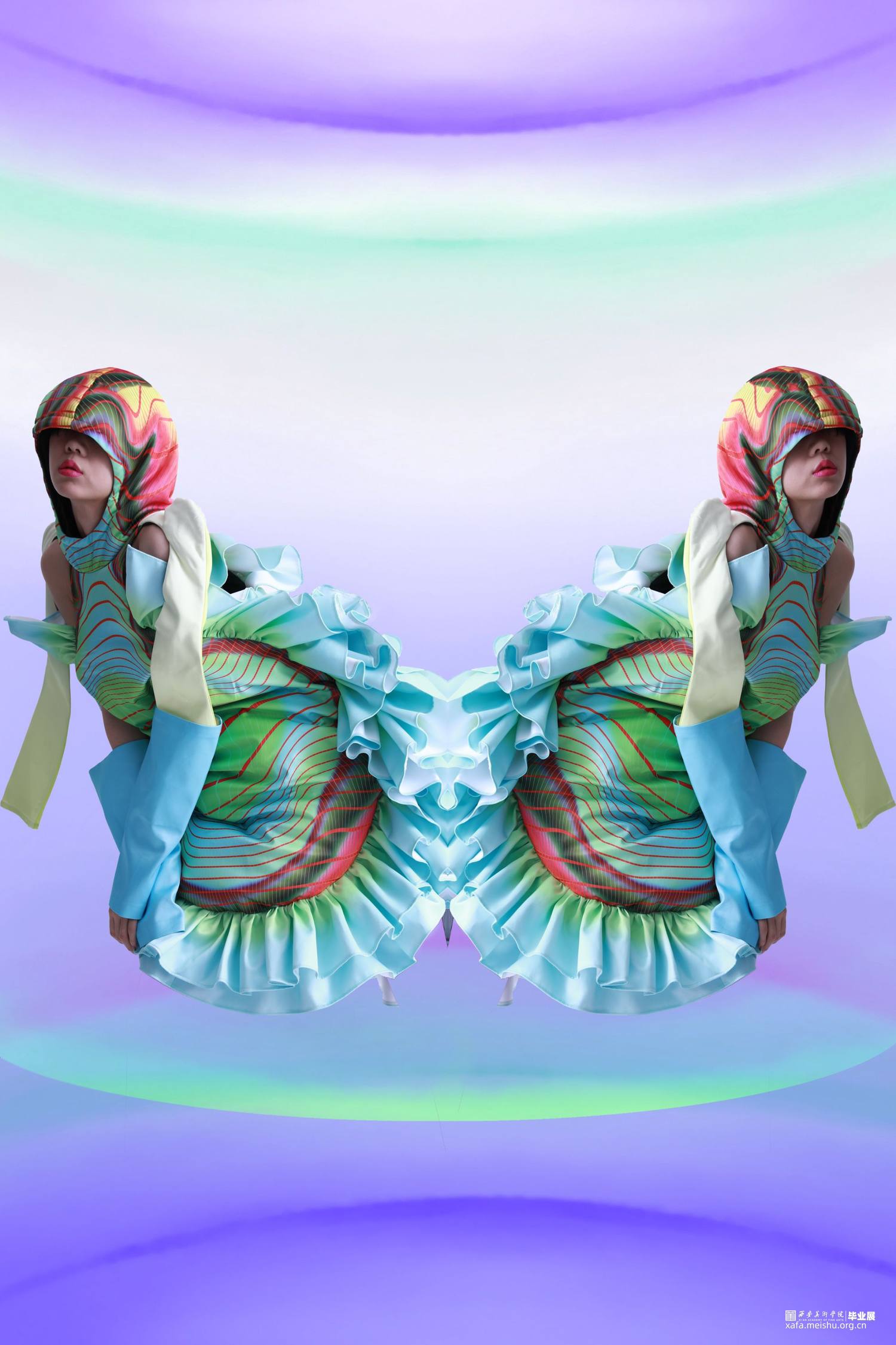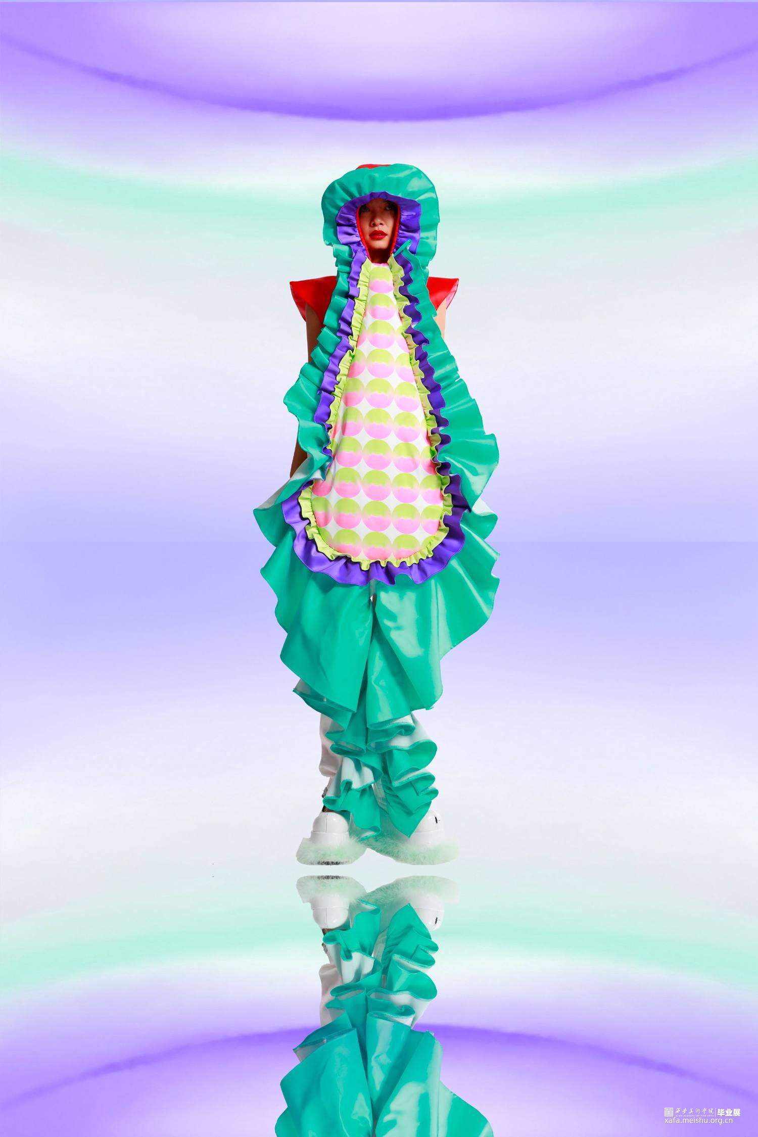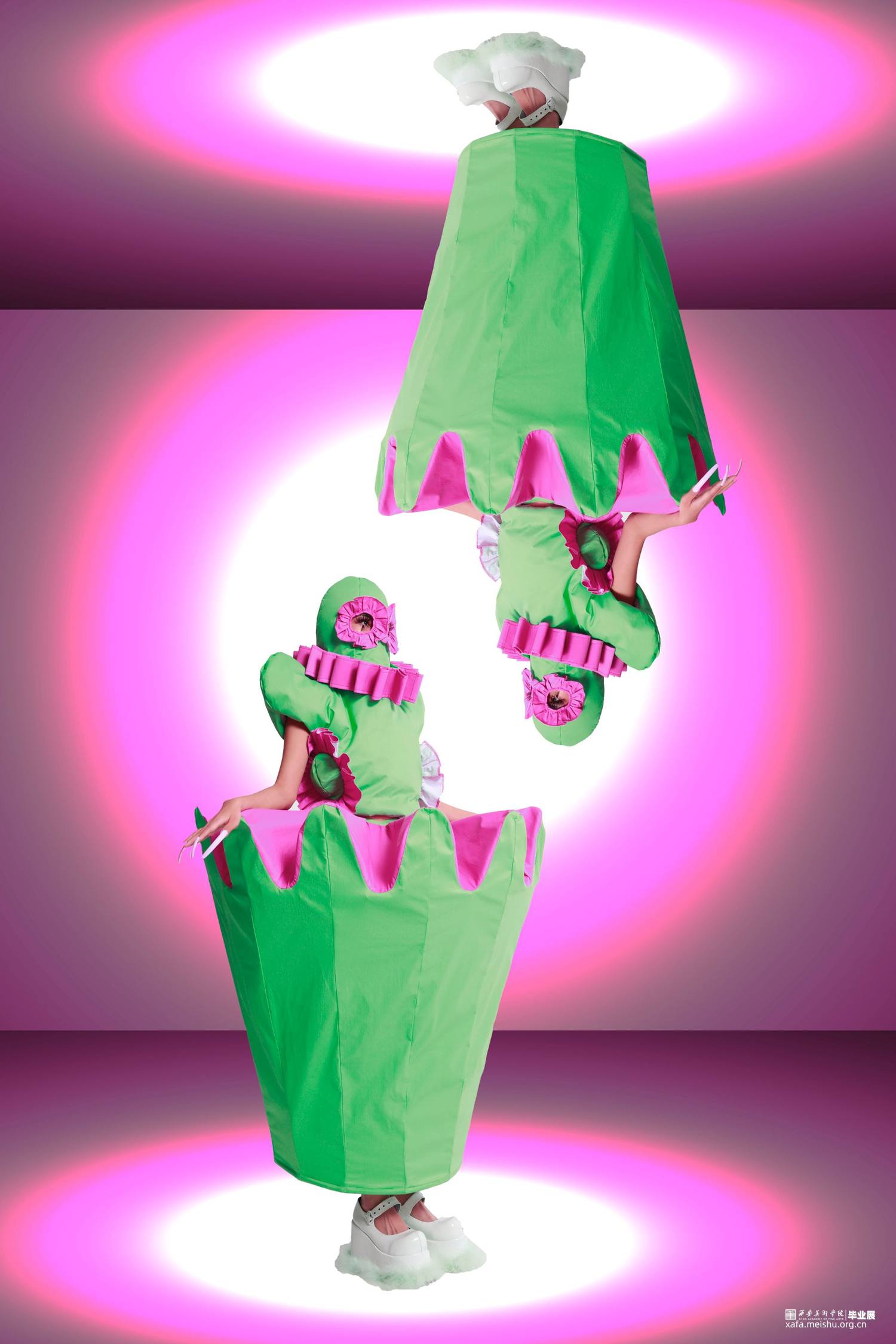 此次系列我们选取了消费主义社会下食物的代表,例如冰淇淋,蛋糕等,我们将六套衣服的造型从我们选取的食物中提取进行变形和设计。