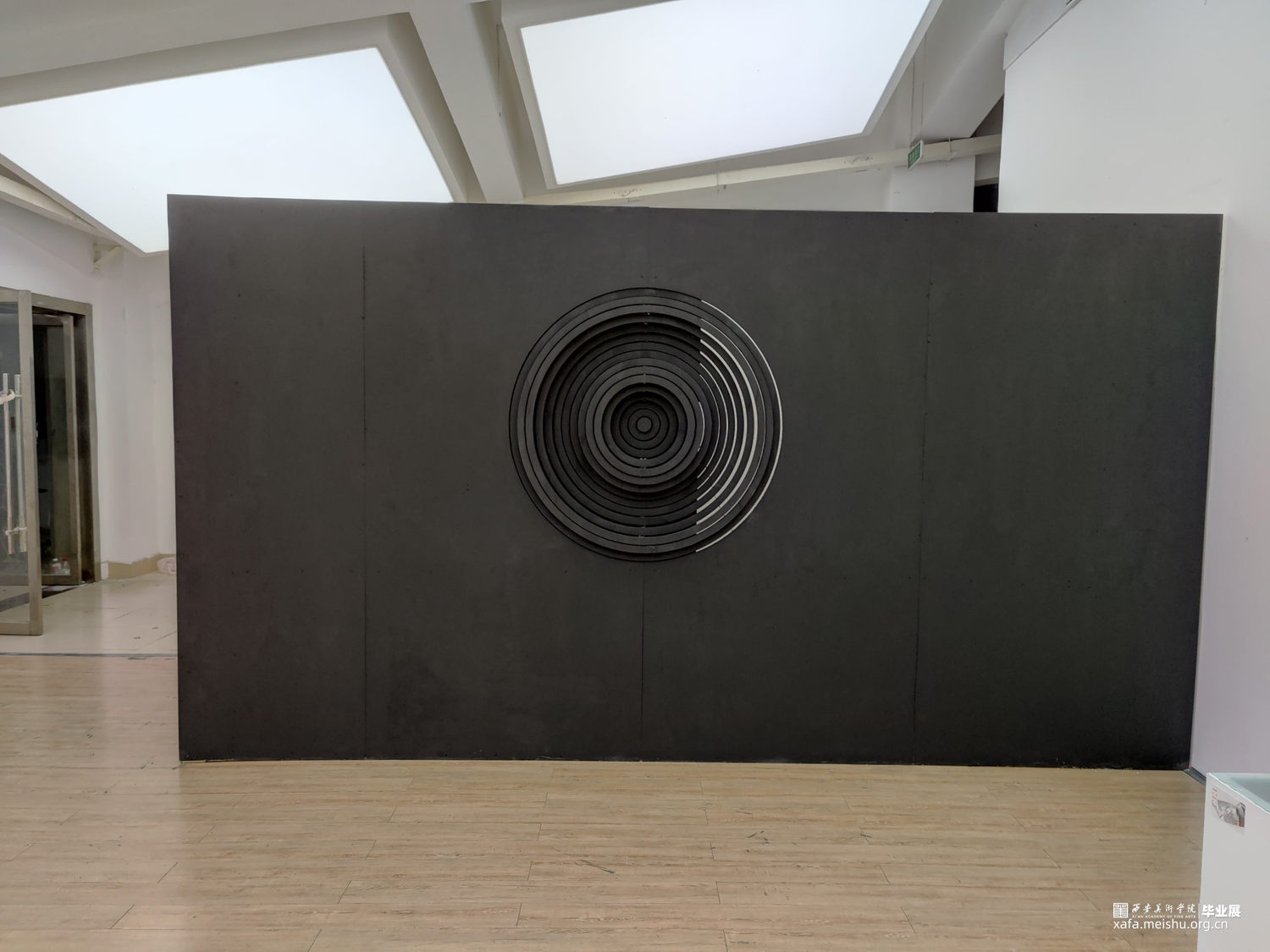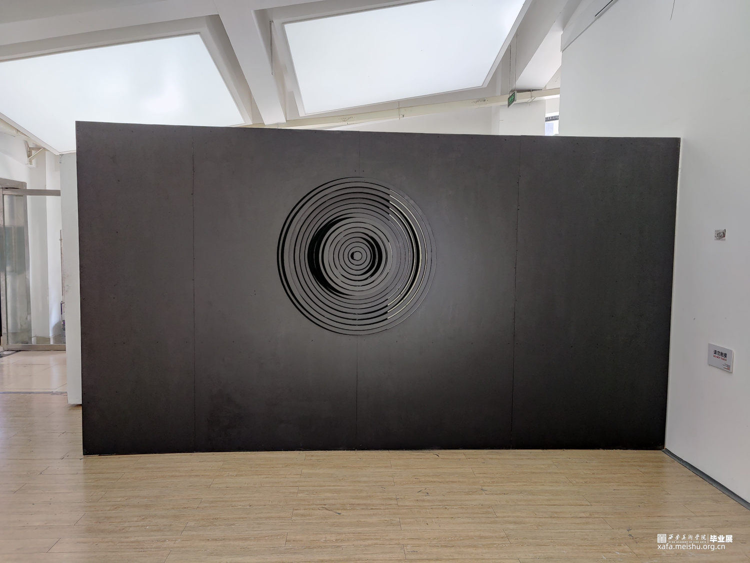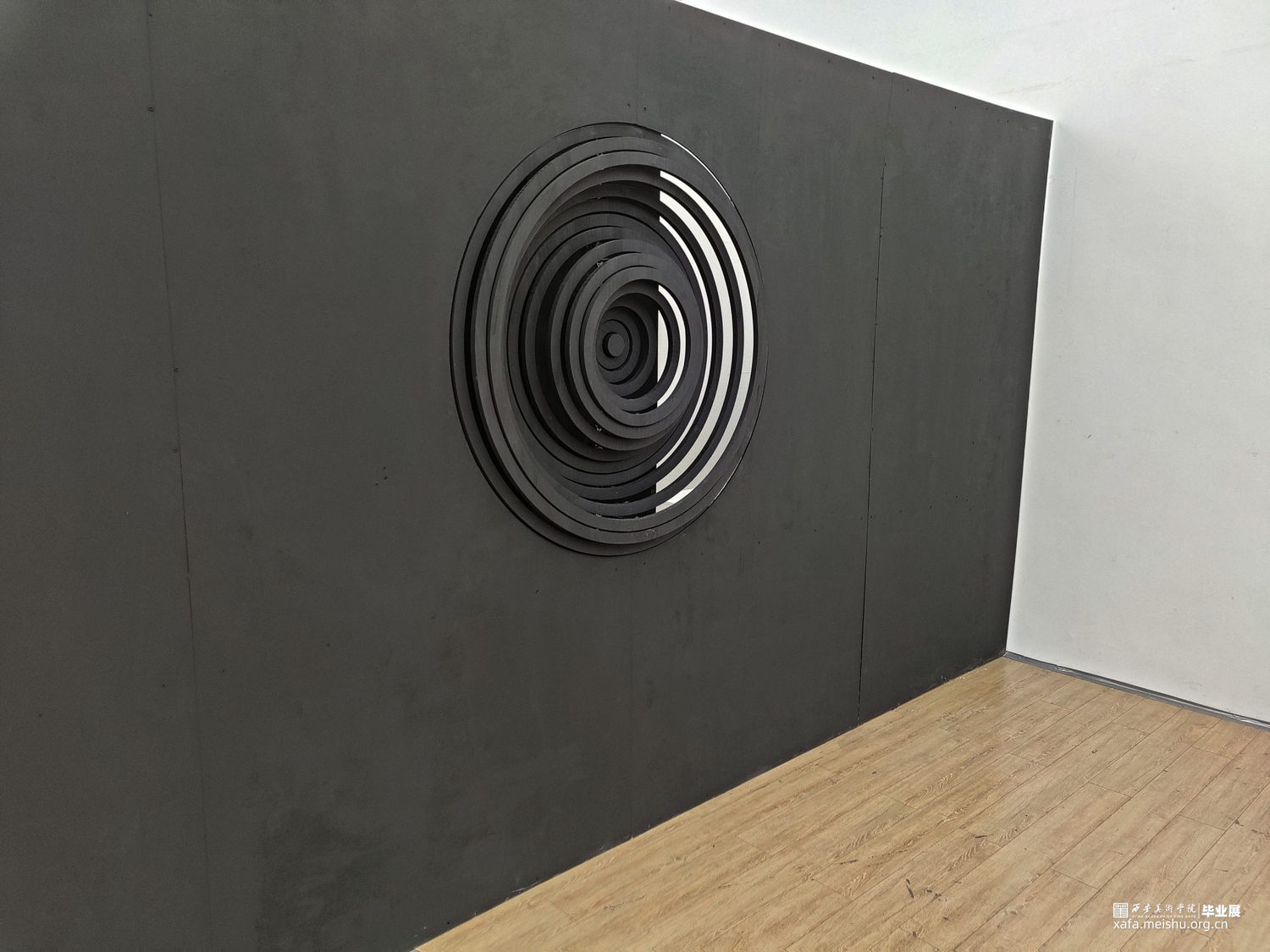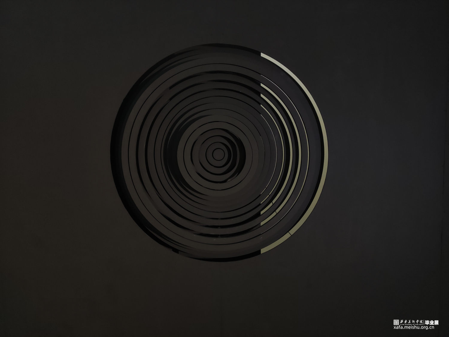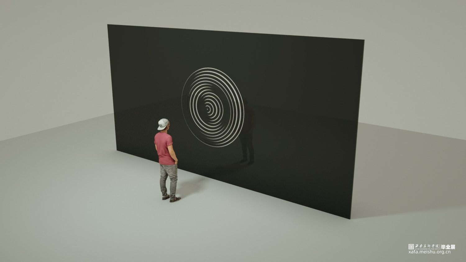 18世纪的思想家埃德蒙 · 伯克认为,“痛苦与危险在并不伤害到人类自身或者有所缓和的情况下,激发心灵从而感觉到的最强烈的情感,那就是崇高感。”他相信痛苦远比快乐更强大、更有冲击力,就像我们被黑洞这样危险的东西所吸引一样。黑洞是科学领域中的一种不明物质,这类物质的陌生感,带给我们神秘的想象和畏惧,因为我们不知道它的属性及和我们的厉害关系,而激发我们深入持久的探索发现。尼采说“当你凝视深渊时,深渊也在凝视你”。纯黑色的墙与白色展厅呼应,在墙中凿开永不停歇的漩涡,漩涡向你迎面扑来,又坍缩成深渊,将你拖入其危险 那的完全不可知的内部强吸引力的黑洞中。这似乎是我们最黑暗的感觉,我们所有的恐惧脆弱和说不清道不明的情绪都被困在无尽的漩涡中。低鸣的声音咆哮着,与我们心脏跳动的声音相呼应,朝着自己想象中最狂野的角落,一个完全不可知的内部世界。“可确定宇宙中暗物质占全部物质总质量的85%”——弗里兹·扎维奇,宇宙是黑色的宁静的,仿佛反应了一种无事物的状态,但暗物质的概念告诉我们,空是实际上是一个可转换的空间,一个中间空间,它和时间有很大的关系,暗物质的质量使得空间扭曲,让原本寂静的空间里产生了时间,正是时间的诞生才让昏黑宇宙讲述我们的故事,在这里一切皆有可能,什么事情都还没有发生,这是一个实现自我的空间。