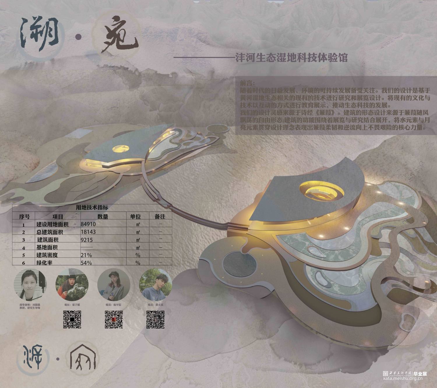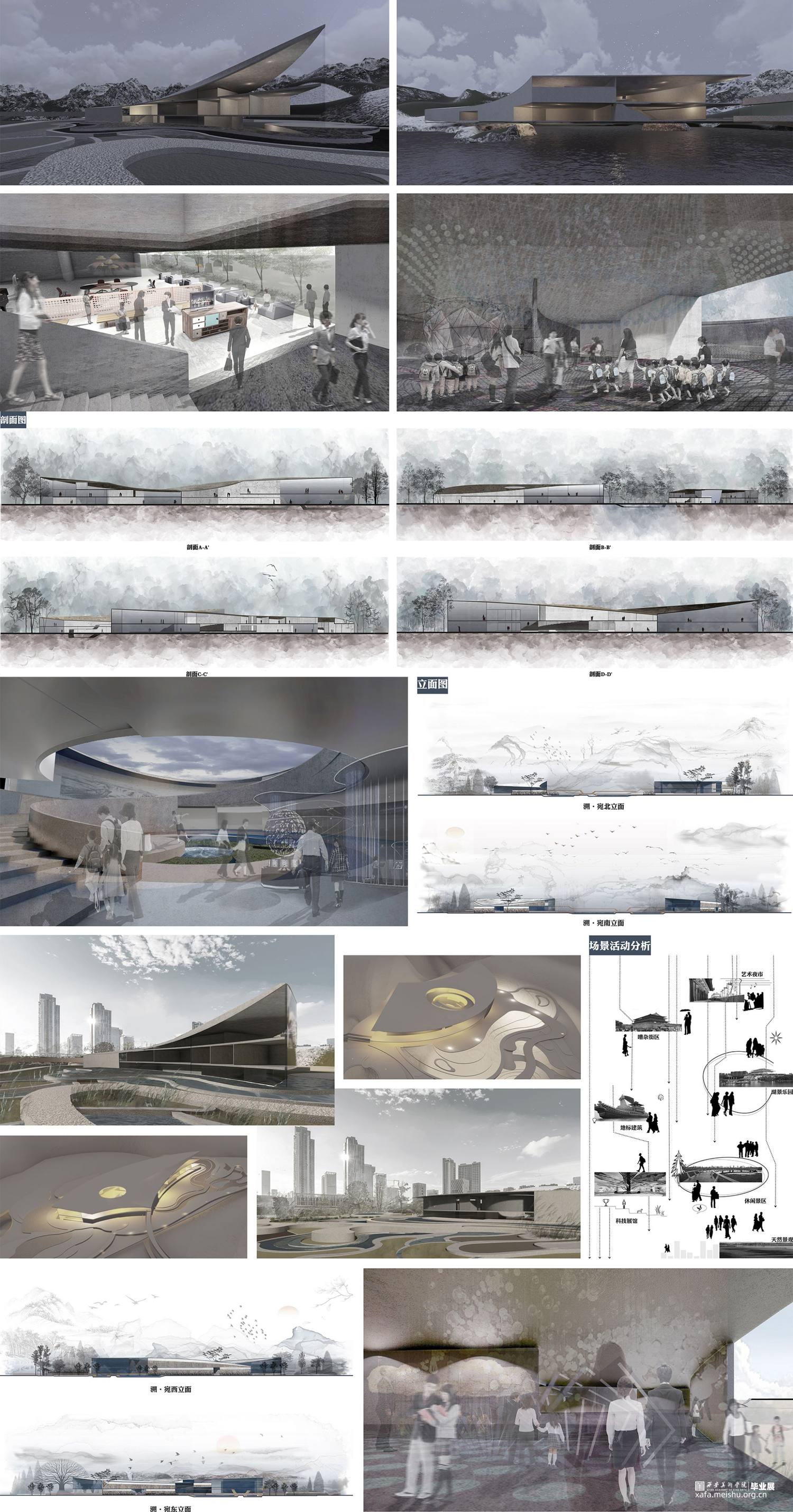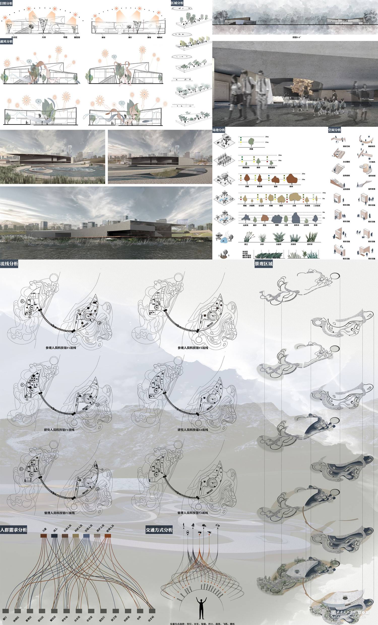 我们的设计灵感来源于诗经《蒹葭》。溯在金文中有水和月的表达,宛在金文中有家的意义。文字历史发展到今天赋予了它们更新的含义:溯表达了逆着水流的方向走追求根源或回想的意义,宛表达了曲折向上发展和飘渺幽美意境的意义。建筑的形态设计就来源于蒹葭随风飘荡的自由形态。建筑的功能围绕着展览与研究结合展开,将水元素与月亮元素贯穿设计理念,表现出蒹葭柔韧和逆流向上不畏艰险的核心力量。溯·宛的设计意义在于对于历史的追溯,对于现状的记录,对于未来的展望。