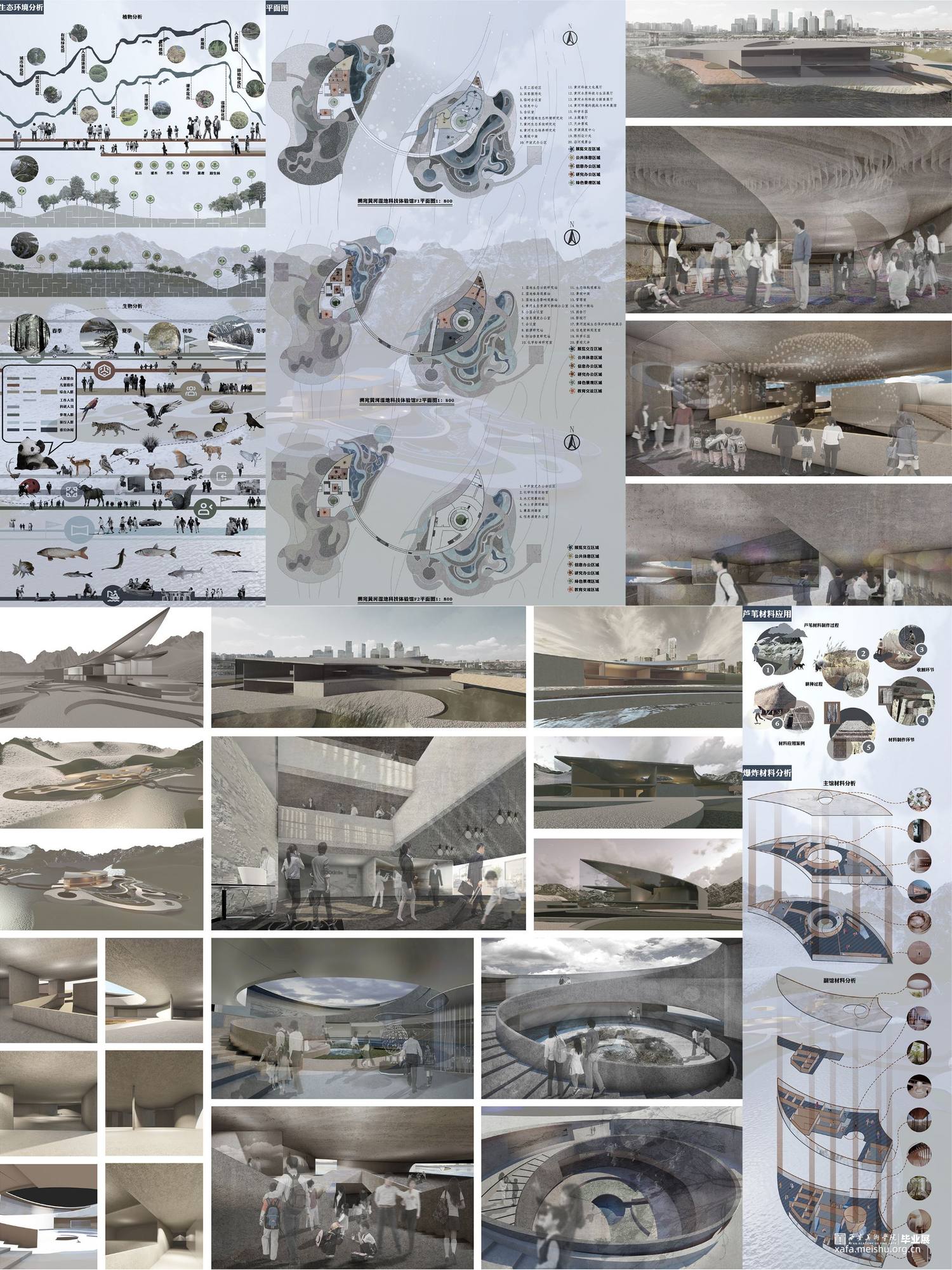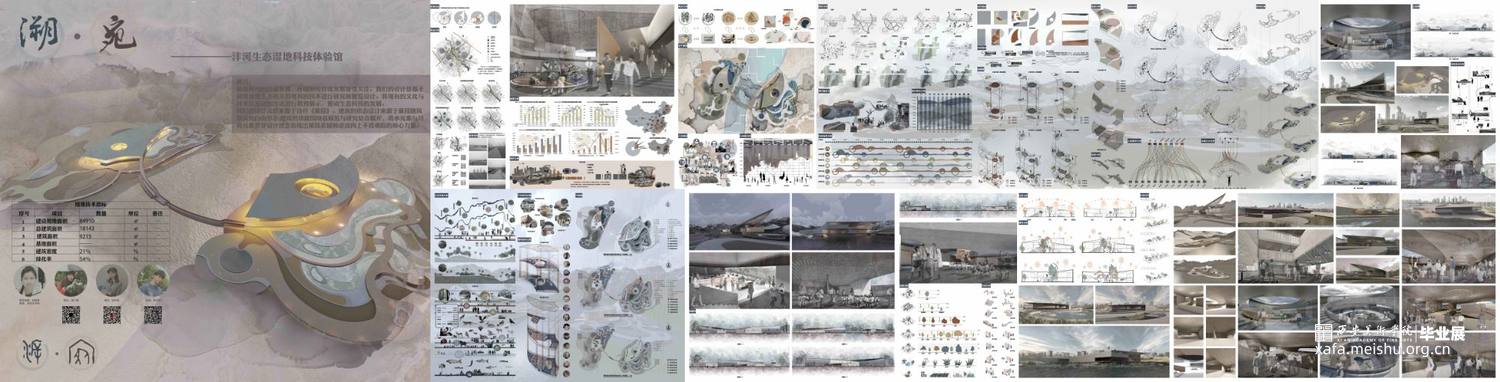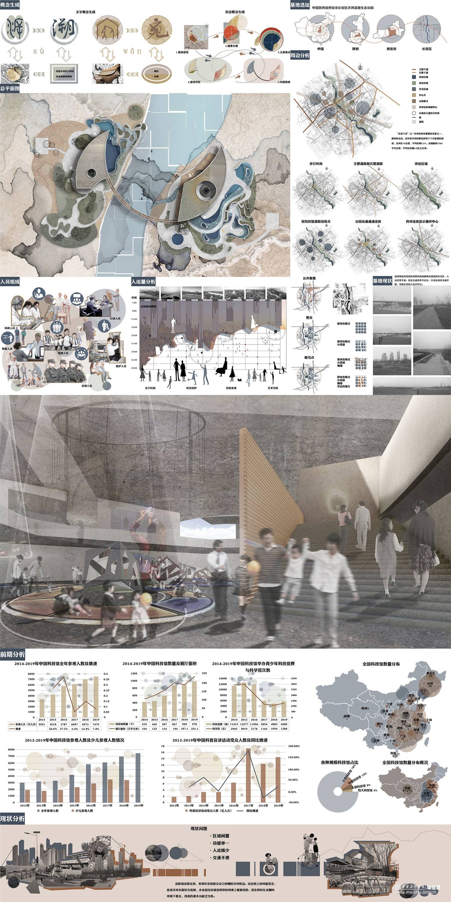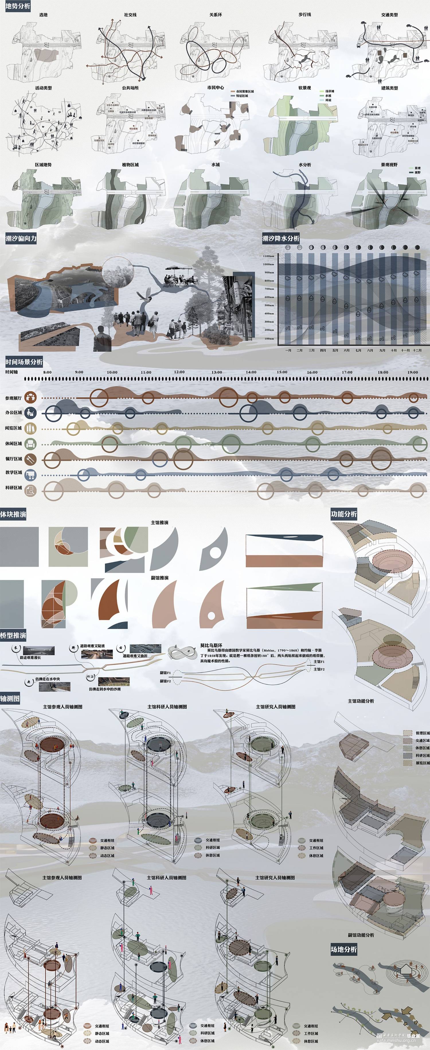 我们的设计灵感来源于诗经《蒹葭》。溯在金文中有水和月的表达,宛在金文中有家的意义。文字历史发展到今天赋予了它们更新的含义:溯表达了逆着水流的方向走追求根源或回想的意义,宛表达了曲折向上发展和飘渺幽美意境的意义。建筑的形态设计就来源于蒹葭随风飘荡的自由形态。建筑的功能围绕着展览与研究结合展开,将水元素与月亮元素贯穿设计理念,表现出蒹葭柔韧和逆流向上不畏艰险的核心力量。溯·宛的设计意义在于对于历史的追溯,对于现状的记录,对于未来的展望。