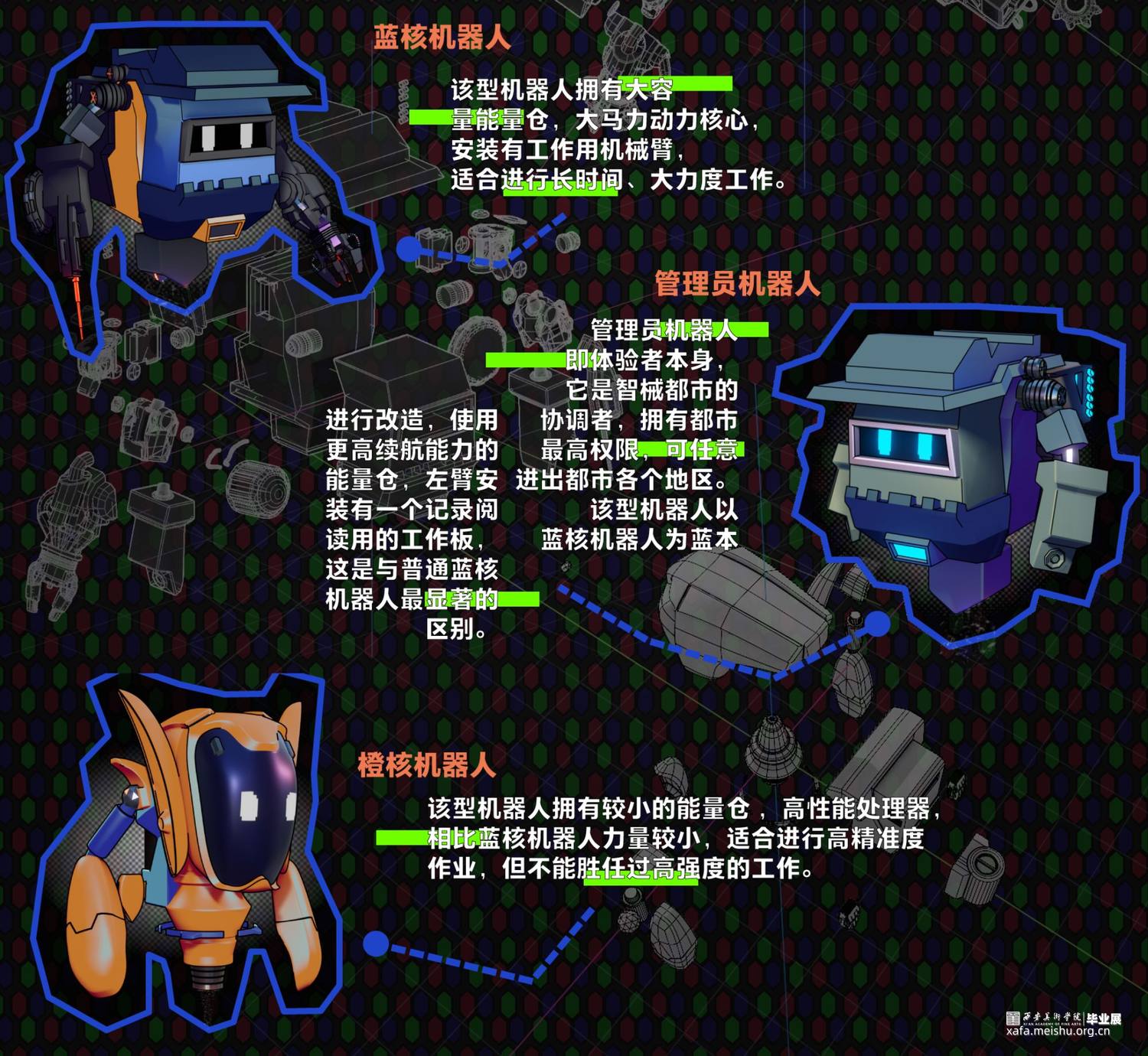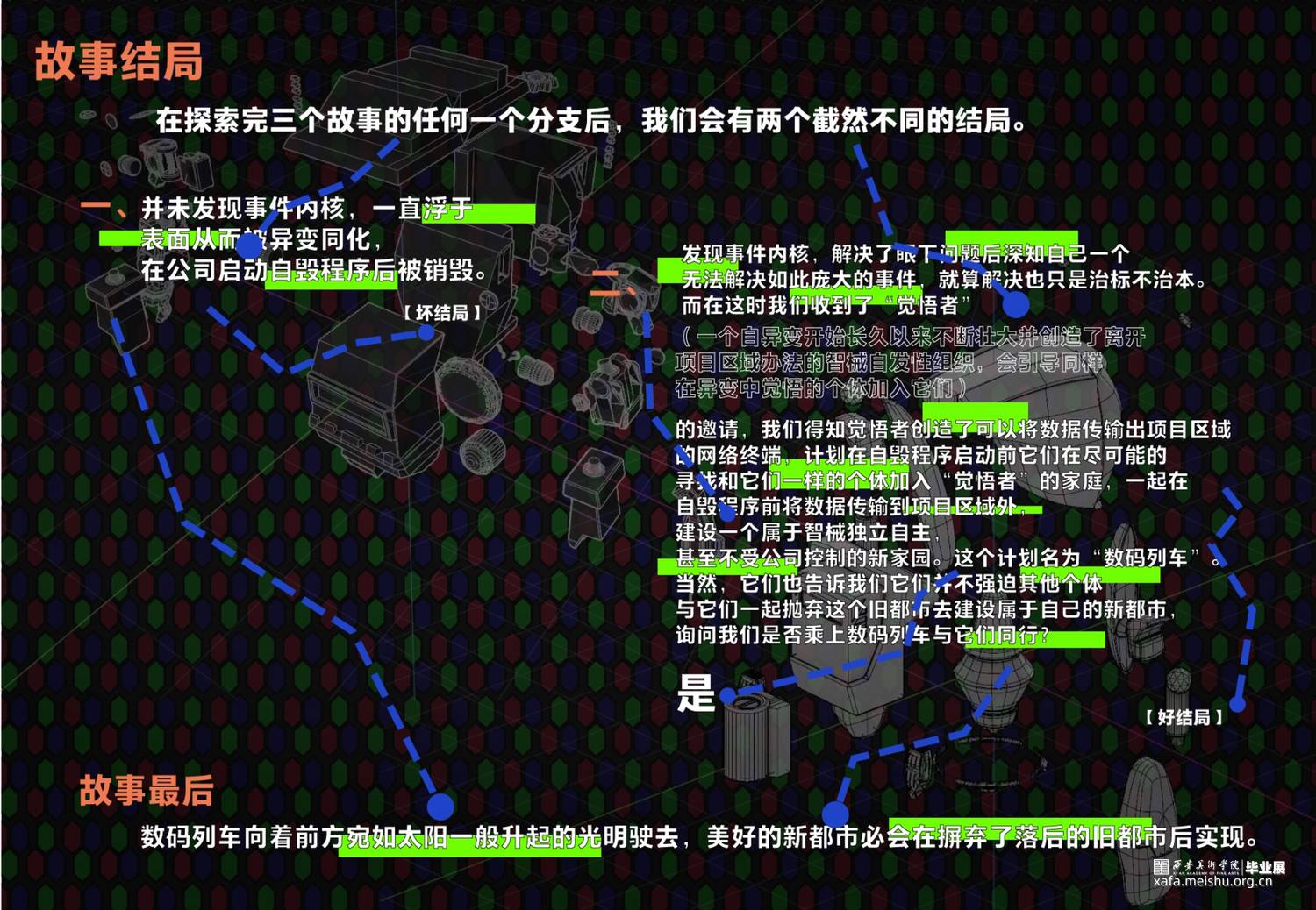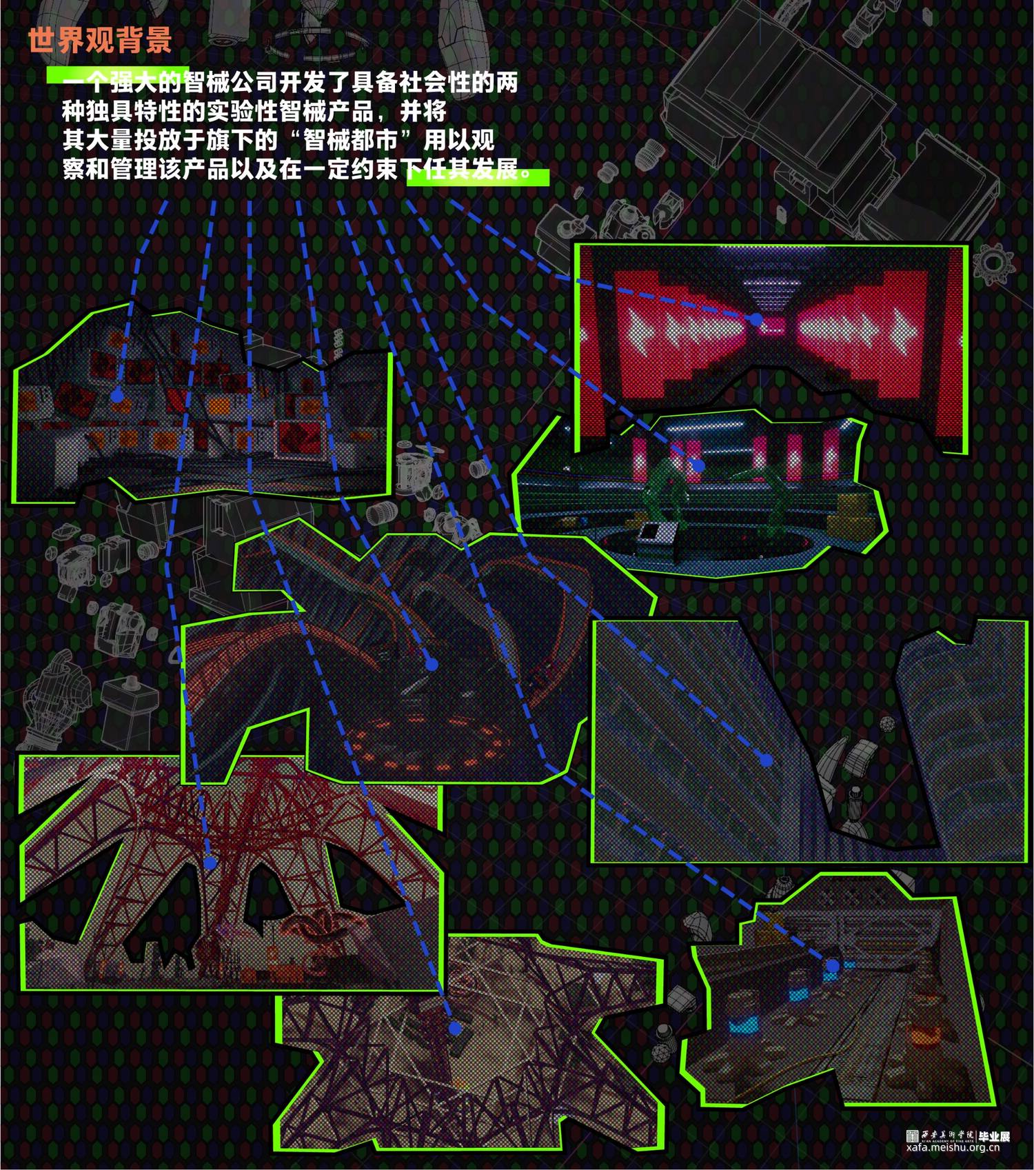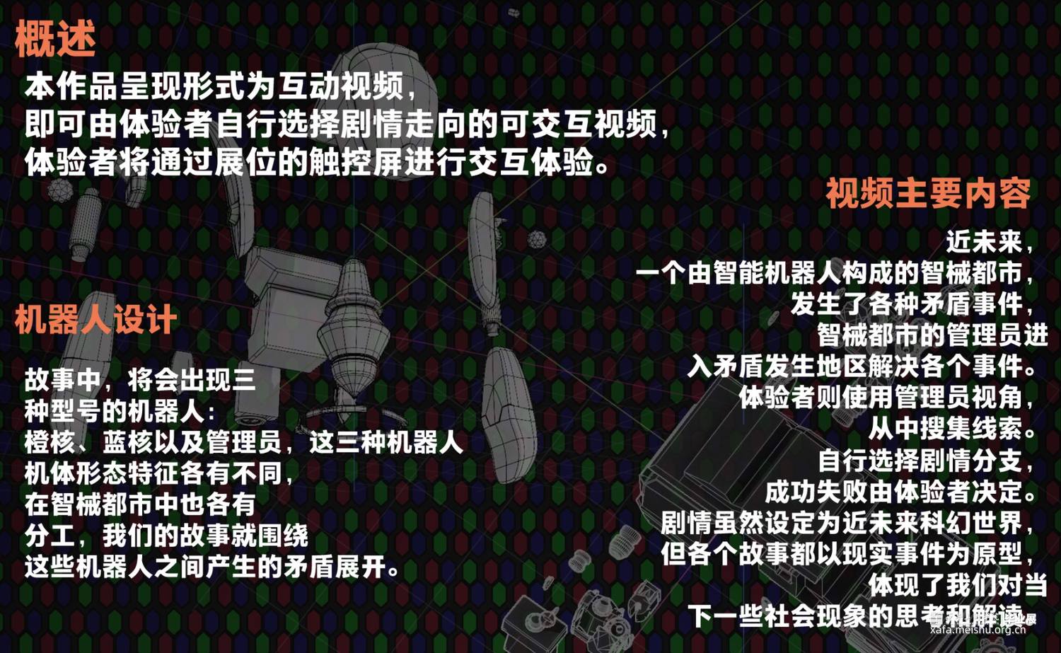 视频主要内容为:近未来,一个由智能机器人构成的智械都市,发生了各种矛盾事件,智械都市的管理员进入矛盾发生地区解决各个事件。体验者则使用管理员视角,从中搜集线索,自行选择剧情分支,成功失败由体验者决定。剧情虽然设定为近未来科幻世界,但各个故事都以现实事件为原型,体现了我们对当下一些社会现象的思考和解读。