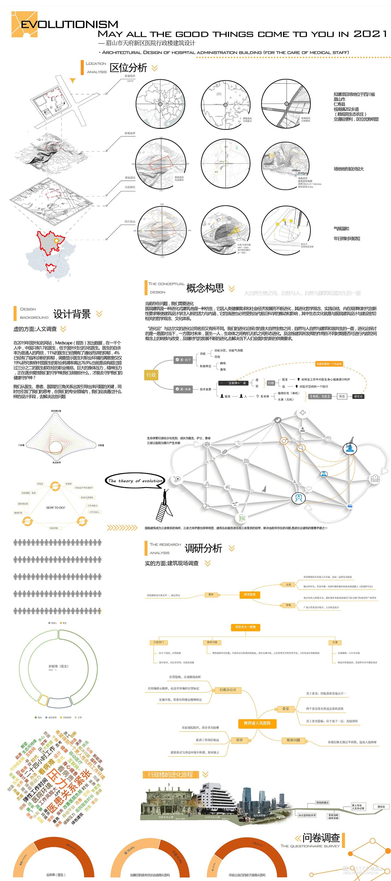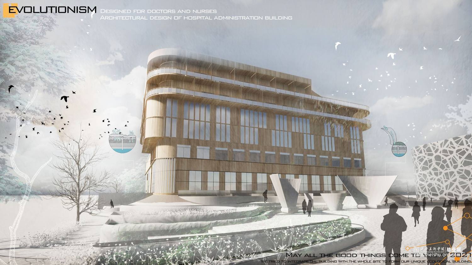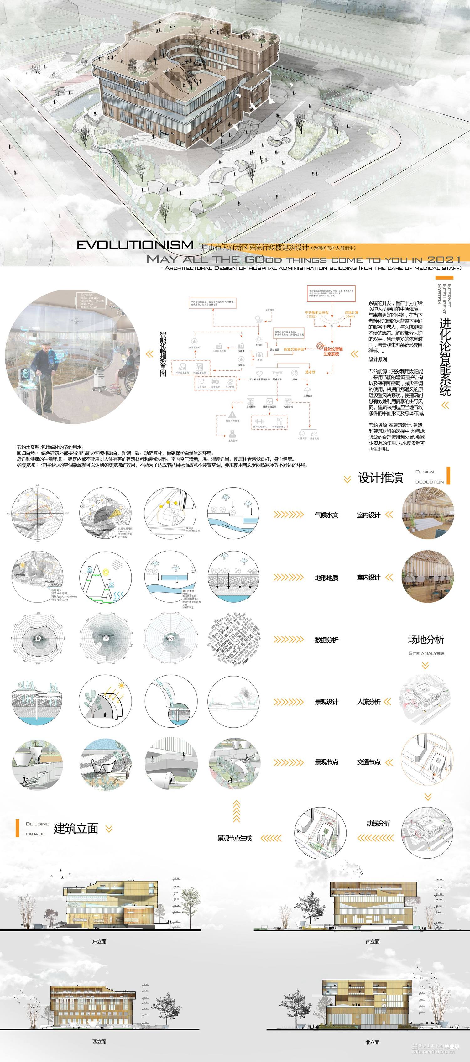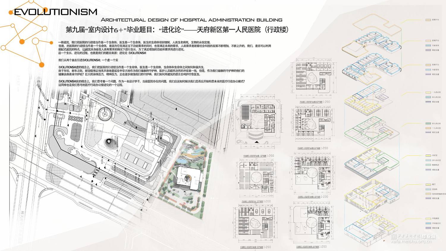 进化论”与达尔文的进化论同名但又有所不同。我们的进化论探讨的是大自然生物之间,自然与人自然与建筑和谐共生的一面,进化论探讨的是一是面对当下,一方面对未来,医生—人,生命体之间有机无机之间形态进化。及这栋建筑所发挥的作用在不同时期是否可进行内部空间概念上的转换与改变,及随时代的发展不断的进化,去解决当下人们会面对的新的供需要求。