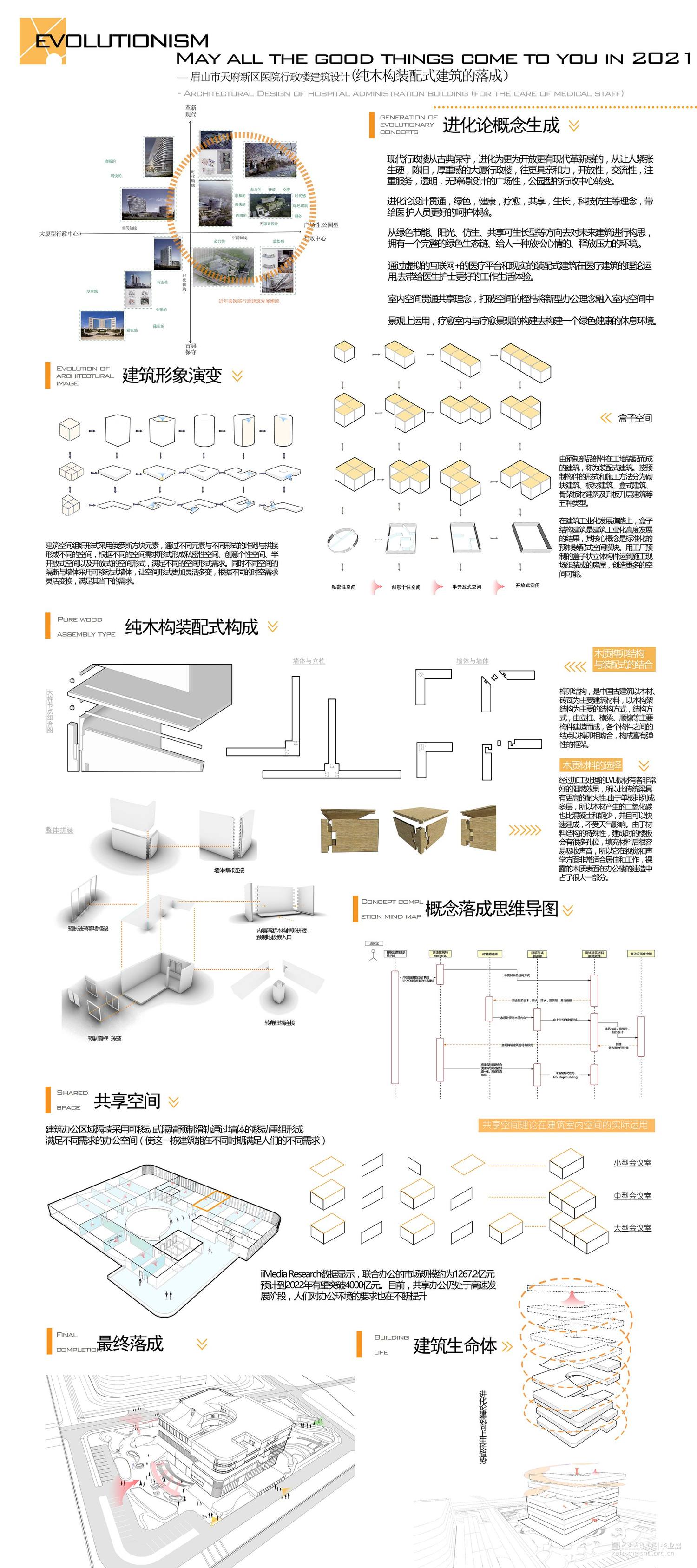 一栋建筑,我们把医院的行政楼当作是一个生命体。医生是一个生命体,医生的生命体很好理解,人类生老病死,生物的永恒定理。 但是,把医院的行政楼当作是一个生命体,是因为它在满足当下功能需求的同时,也要满足未来的需求,人类需求是随着社会科技的发展不断增加、不断上升的,我们是否可以利用装配式建筑的特点,让j建筑本身能在人类有需求的情况下进行生长、为了满足增加的功能和需求而进行进化。这一个生长、进化的过程。也就是我们的题目来源:进化论 EVOLUTIONISM。