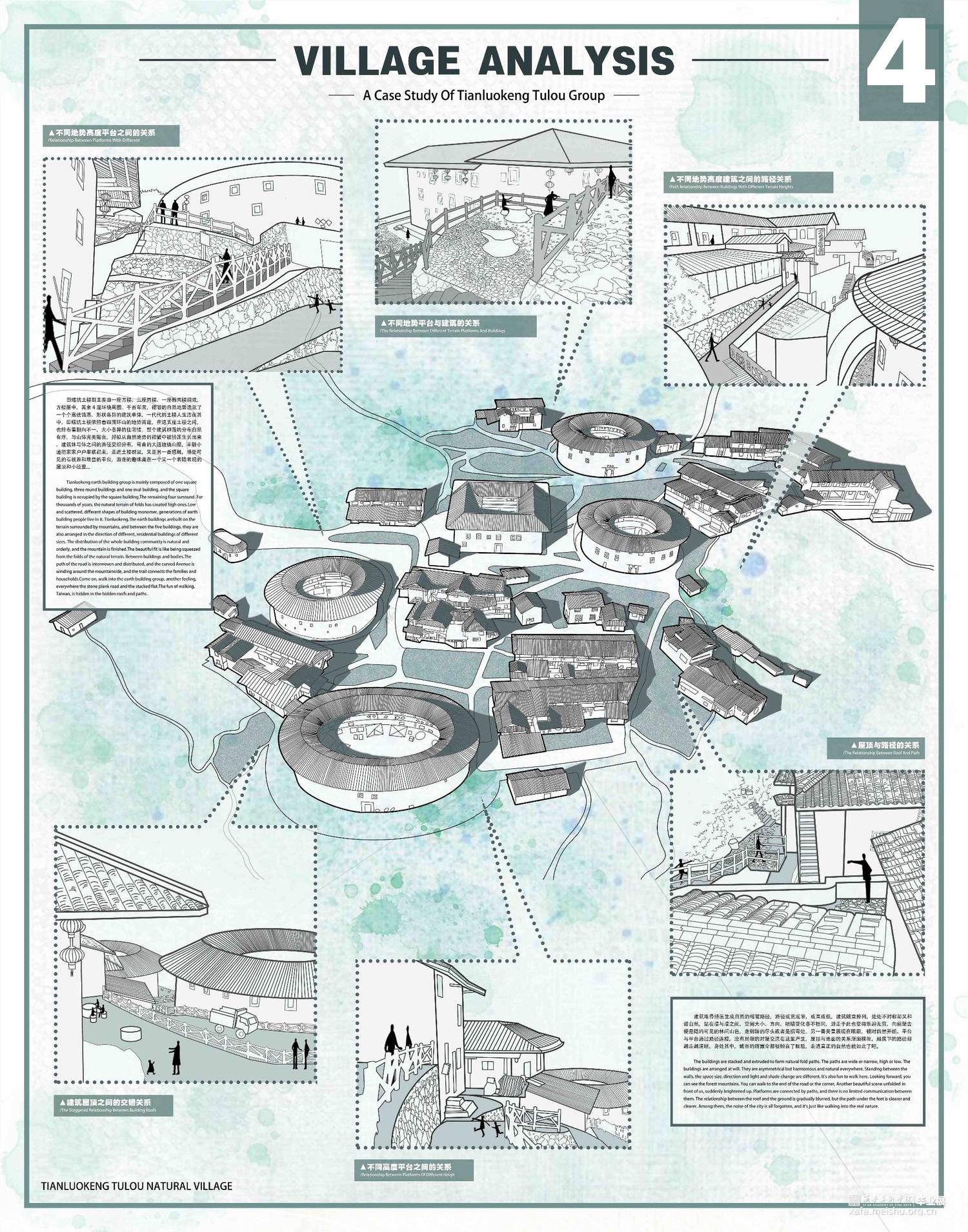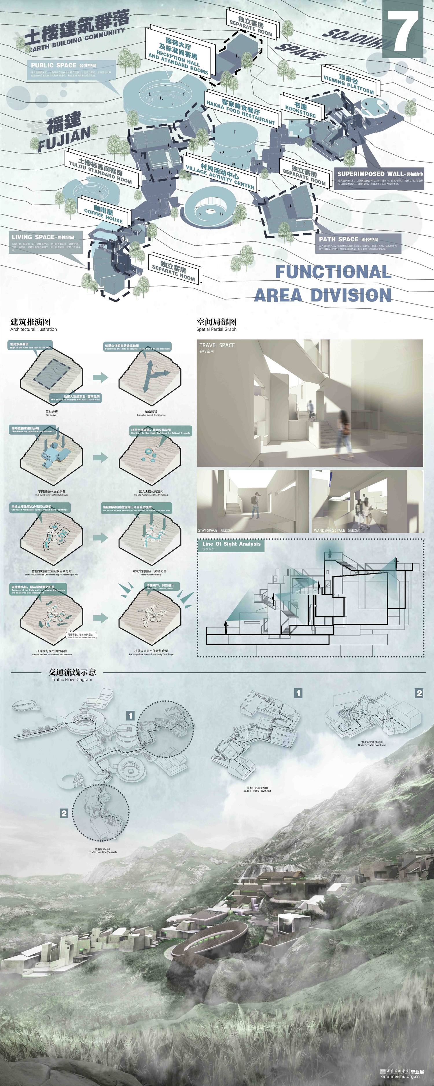 设计作品对福建省土楼传统文化进行了一定程度的剖析和理解,构架出基于土楼及土楼多层次巷道空间而生成的建筑群落空间,空间设计的具体落脚点在于旅居空间上,其中设计了多个具有象征性和代表性的节点,希望以此搭建起沟通自然性地域空间和城市人群尤其是城市青年人群的“桥梁”。