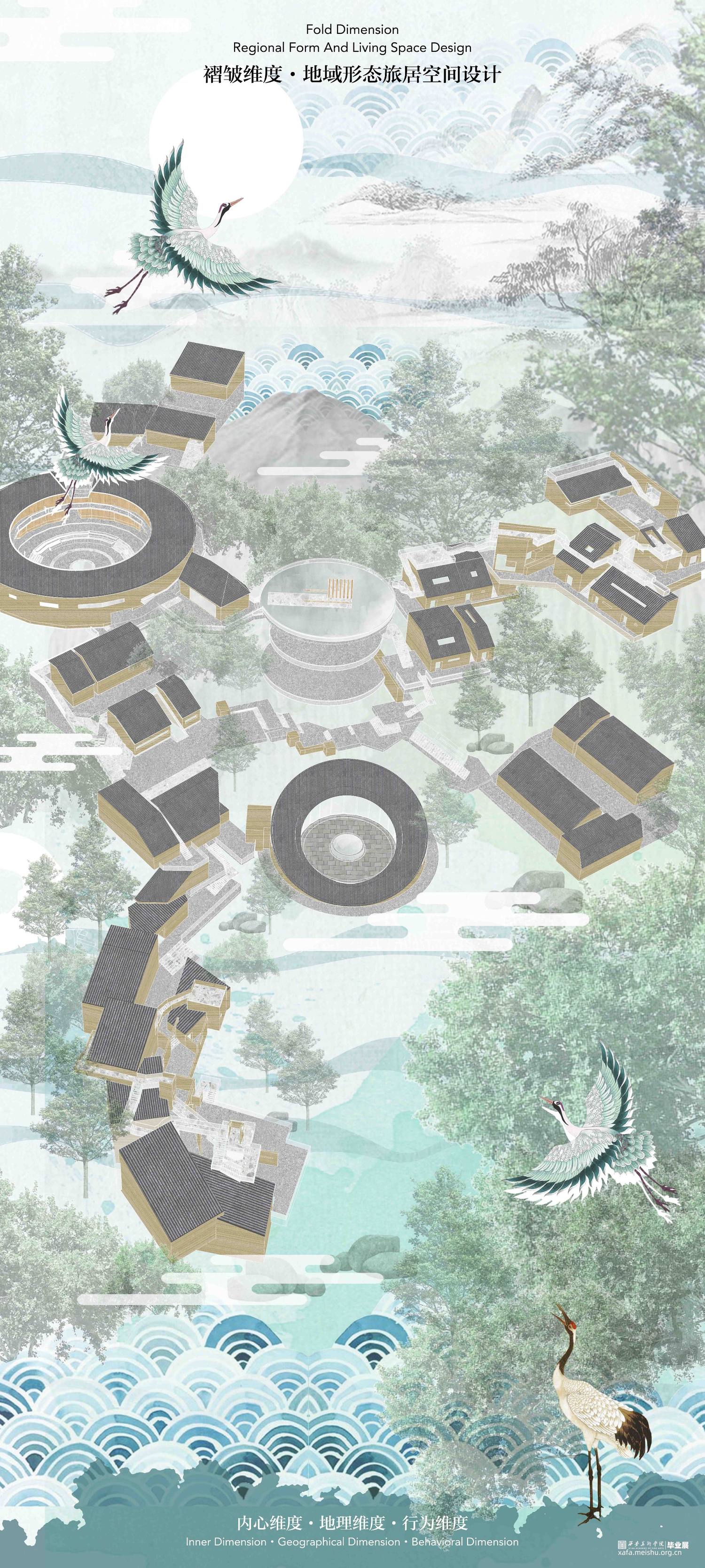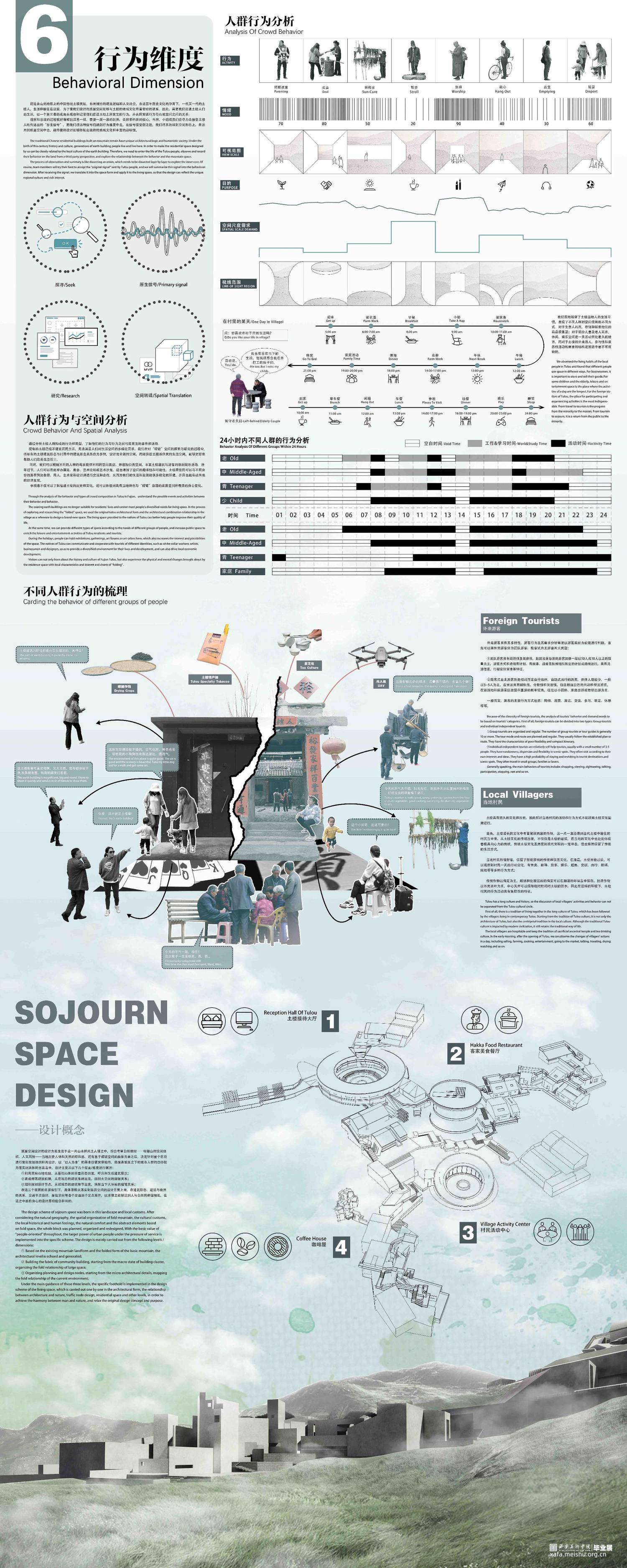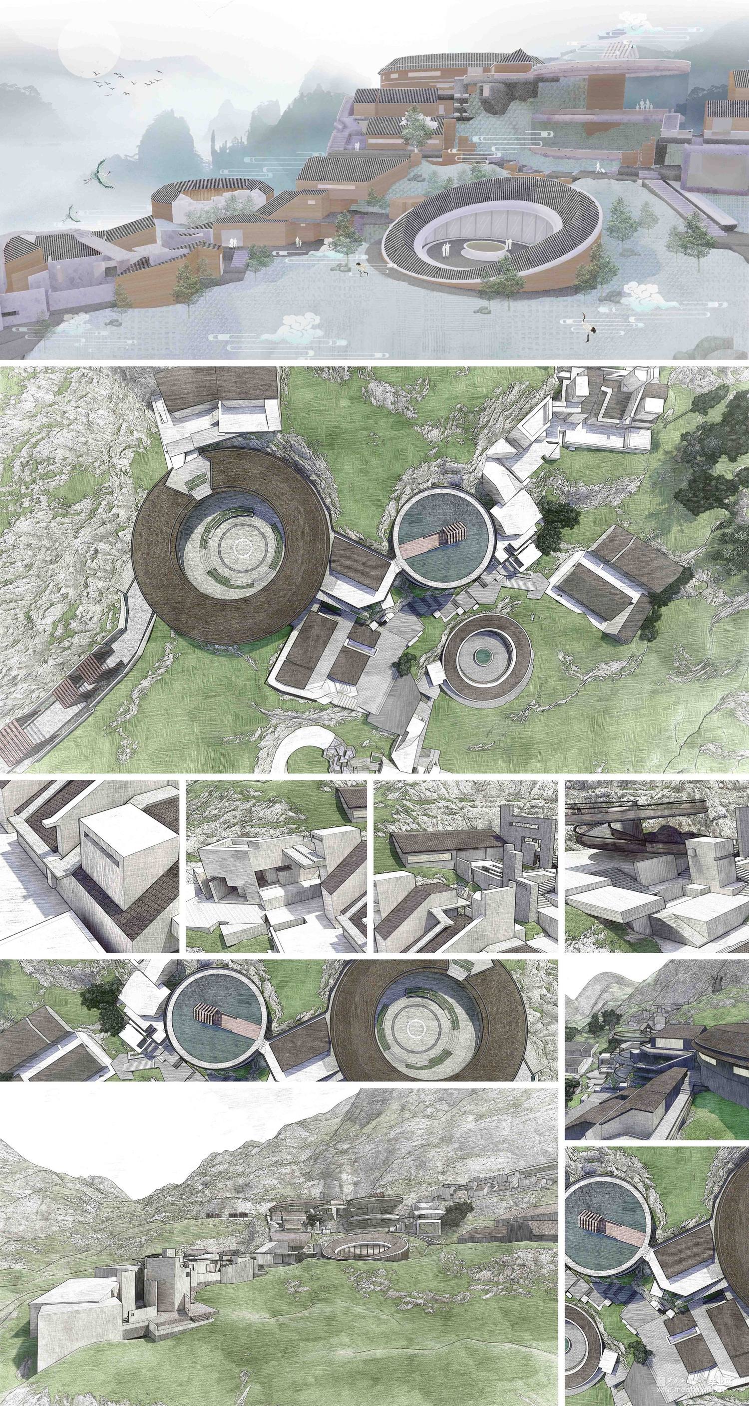 设计作品是基于福建省土楼传统文化及建筑空间调研和相关要素,生发出的建筑群落旅居空间设计。在此之中,以传承和保护传统建筑生态文化、追求创新并发展建筑空间新形态为目的,进行相关空间探索,发掘并研究多种新样态建筑语言,从相关节点空间——路空间、转折空间、自然生态空间等等进行设计;