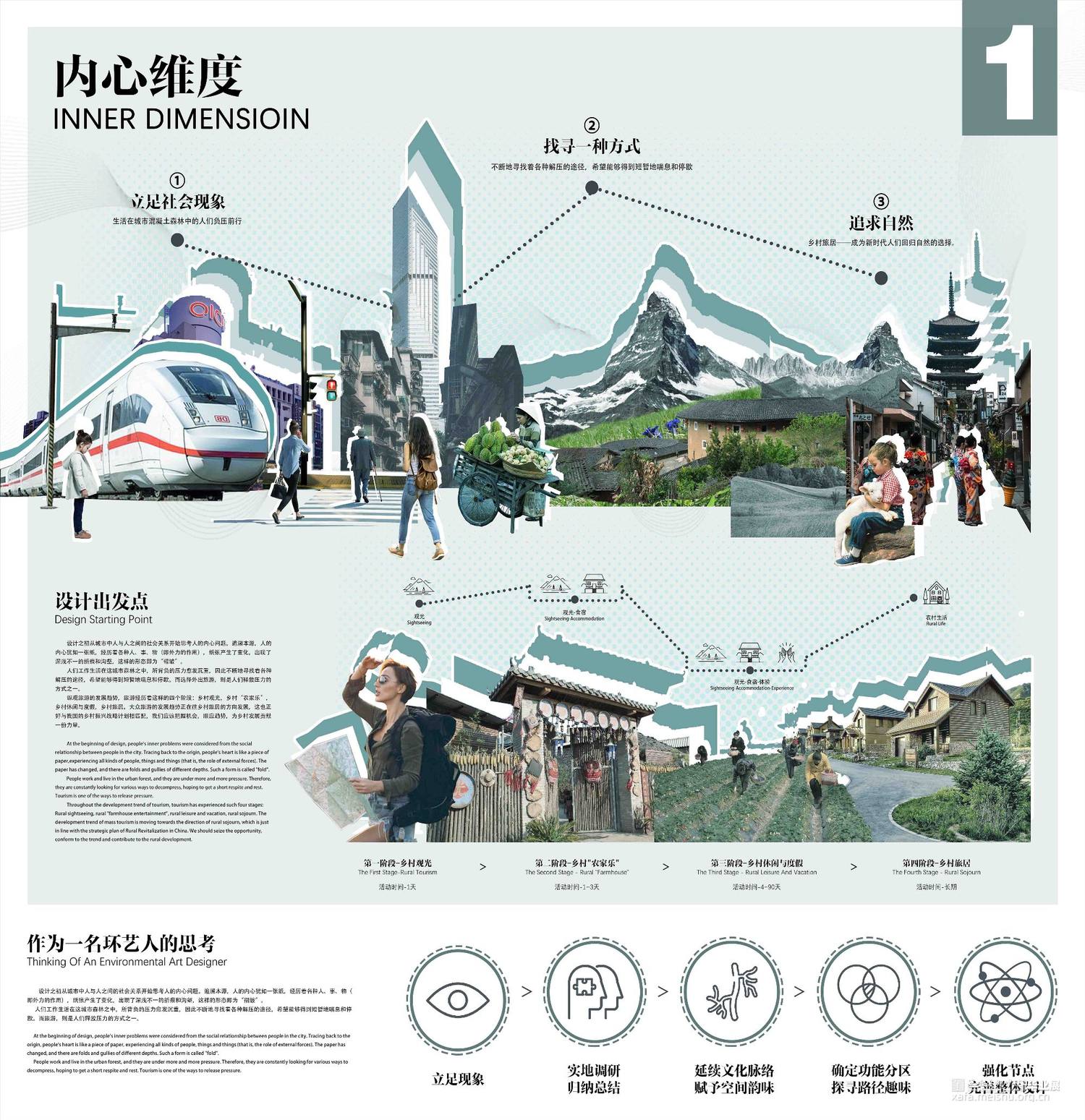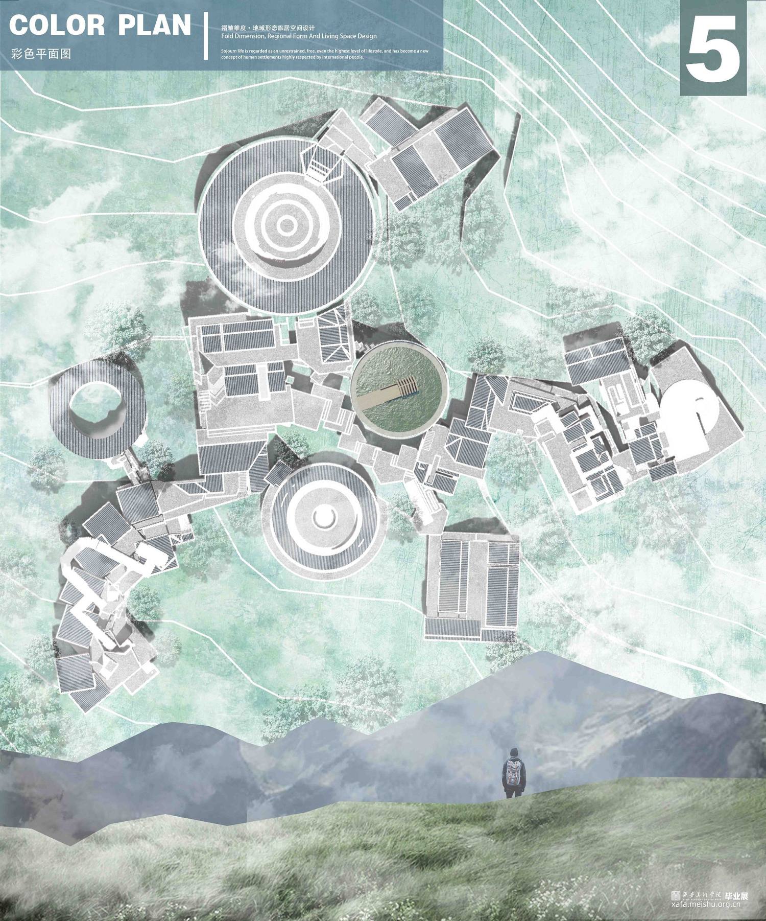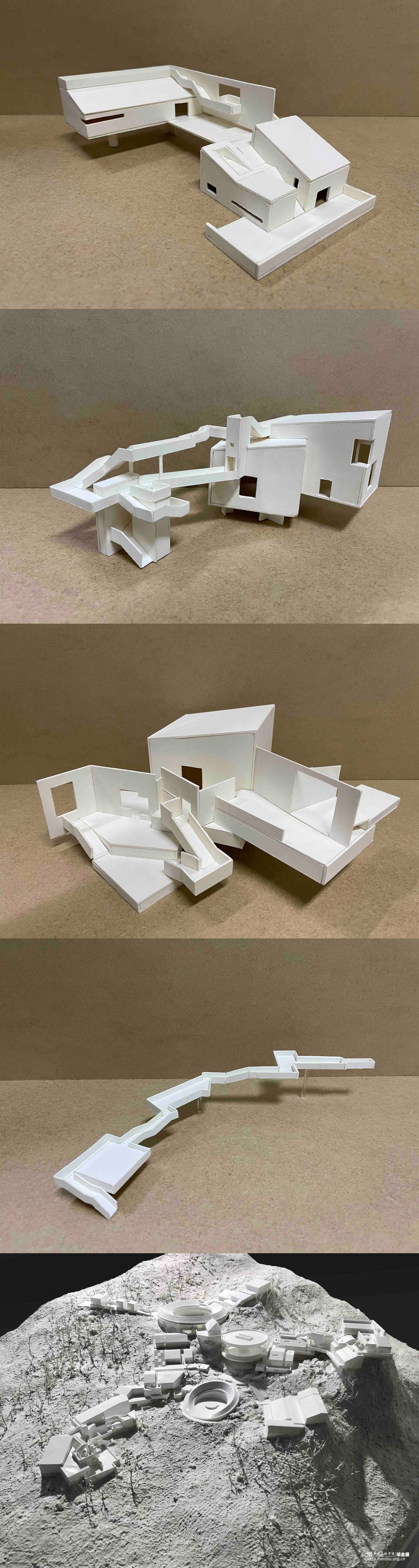设计作品是基于福建省土楼传统文化及建筑空间调研和相关要素,生发出的建筑群落旅居空间设计。在此之中,以传承和保护传统建筑生态文化、追求创新并发展建筑空间新形态为目的,进行相关空间探索,发掘并研究多种新样态建筑语言,从相关节点空间——路空间、转折空间、自然生态空间等等进行设计;