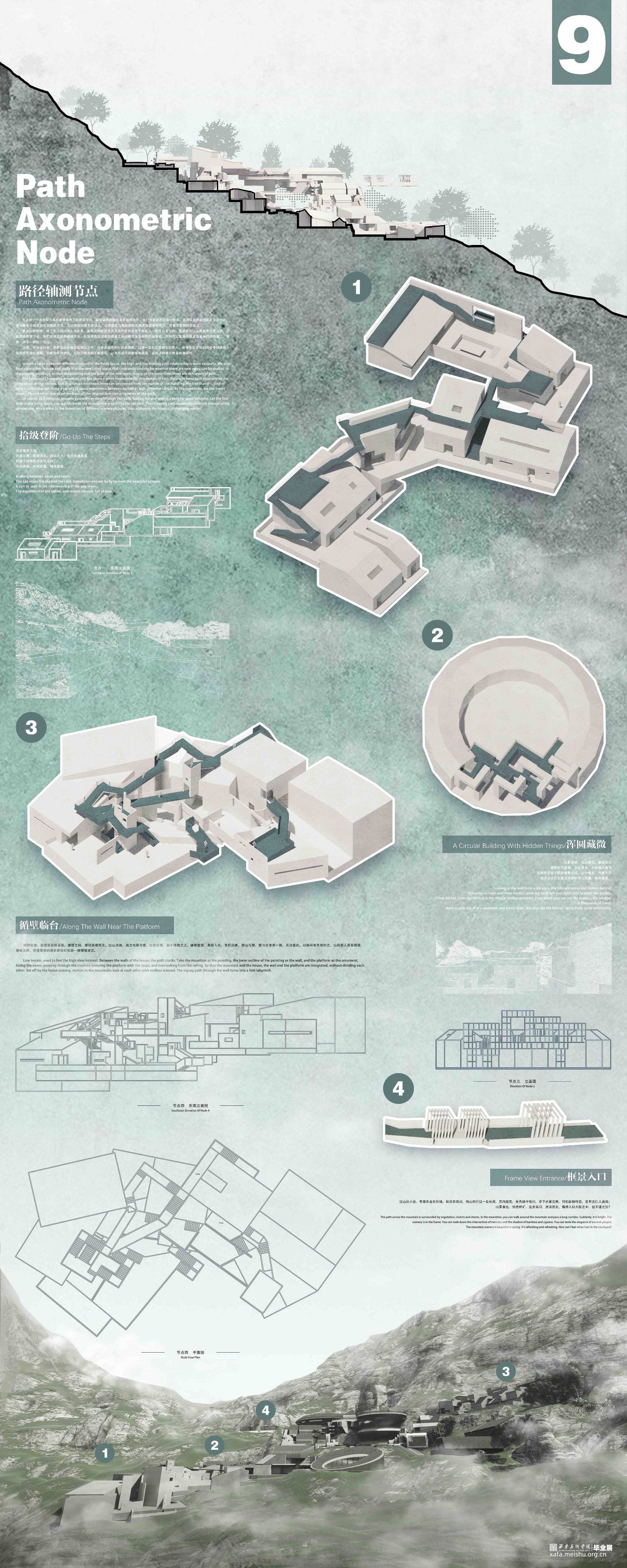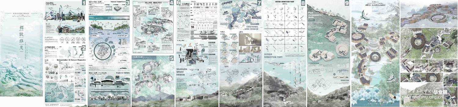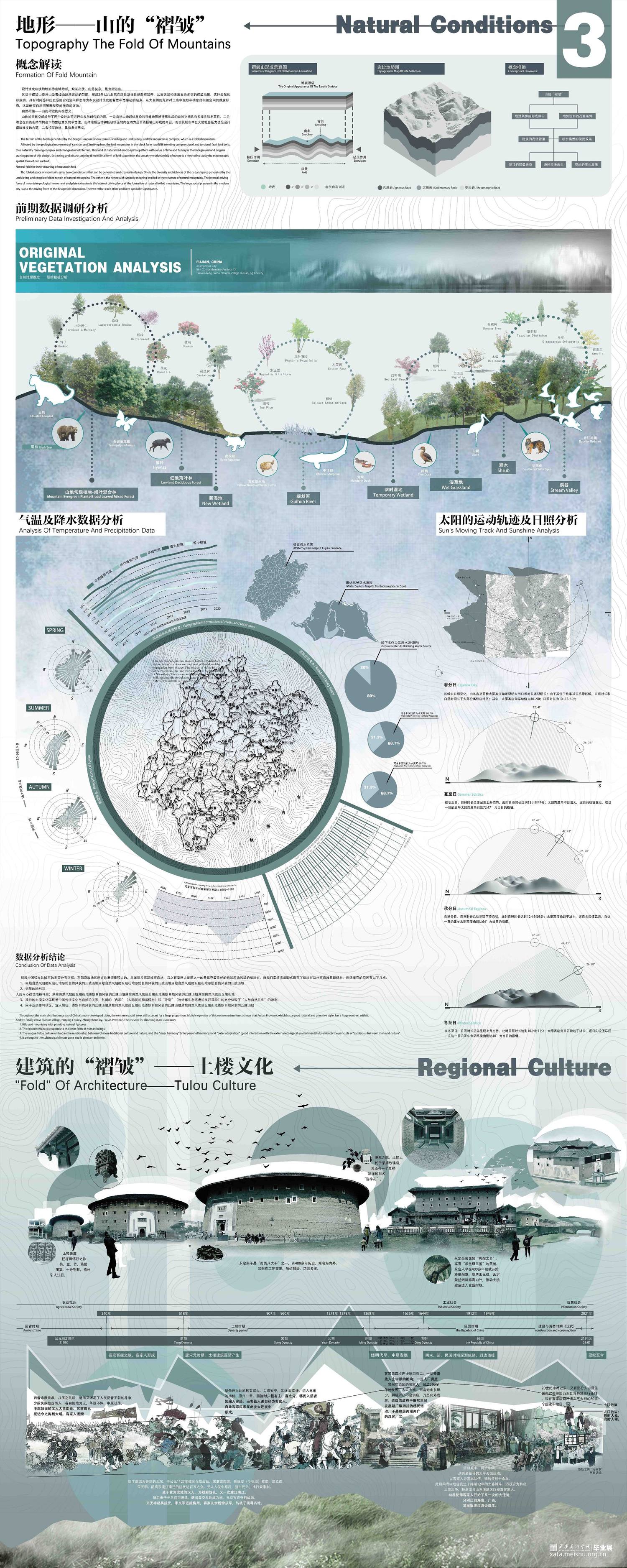 在作品的1-3张版面当中,详细梳理了团队成员前往土楼文化圈的体验感受和调研数据,对当地的特色文化环境及特殊空间构造进行了一定的观察和探索,确定了设计方向点和落地点,并描摹出了地形褶皱关系与空间关系;而在4-7张版面当中,我们对现有空间的多层次褶皱进行了深入设计,搭建出了系列性的建筑群落空间;在8-9张版面当中,我们对相关的节点要素进行了类型学的分析和研究,详细探讨了多节点组合嵌套关系的诸多可能性,对设计语言再一次进行了更新和迭代,将设计更进一步深化;而在最后附录的效果图展示当中,我们呈现出了具体且丰富的设计成果,设计充分落实了对土楼传统民居的空间的吸收发展和再创新,展现出作品褶皱空间的多层次性和可塑性。