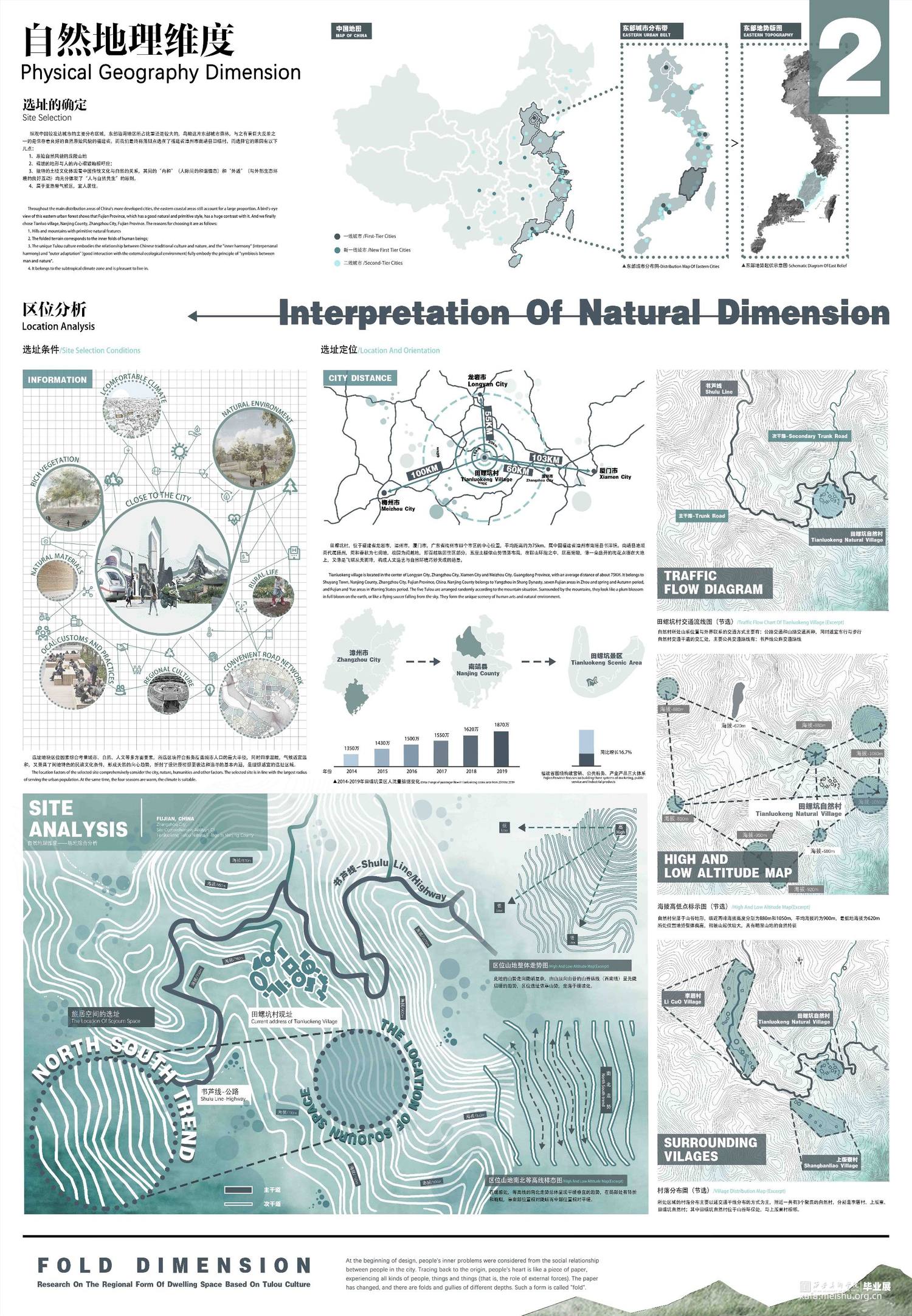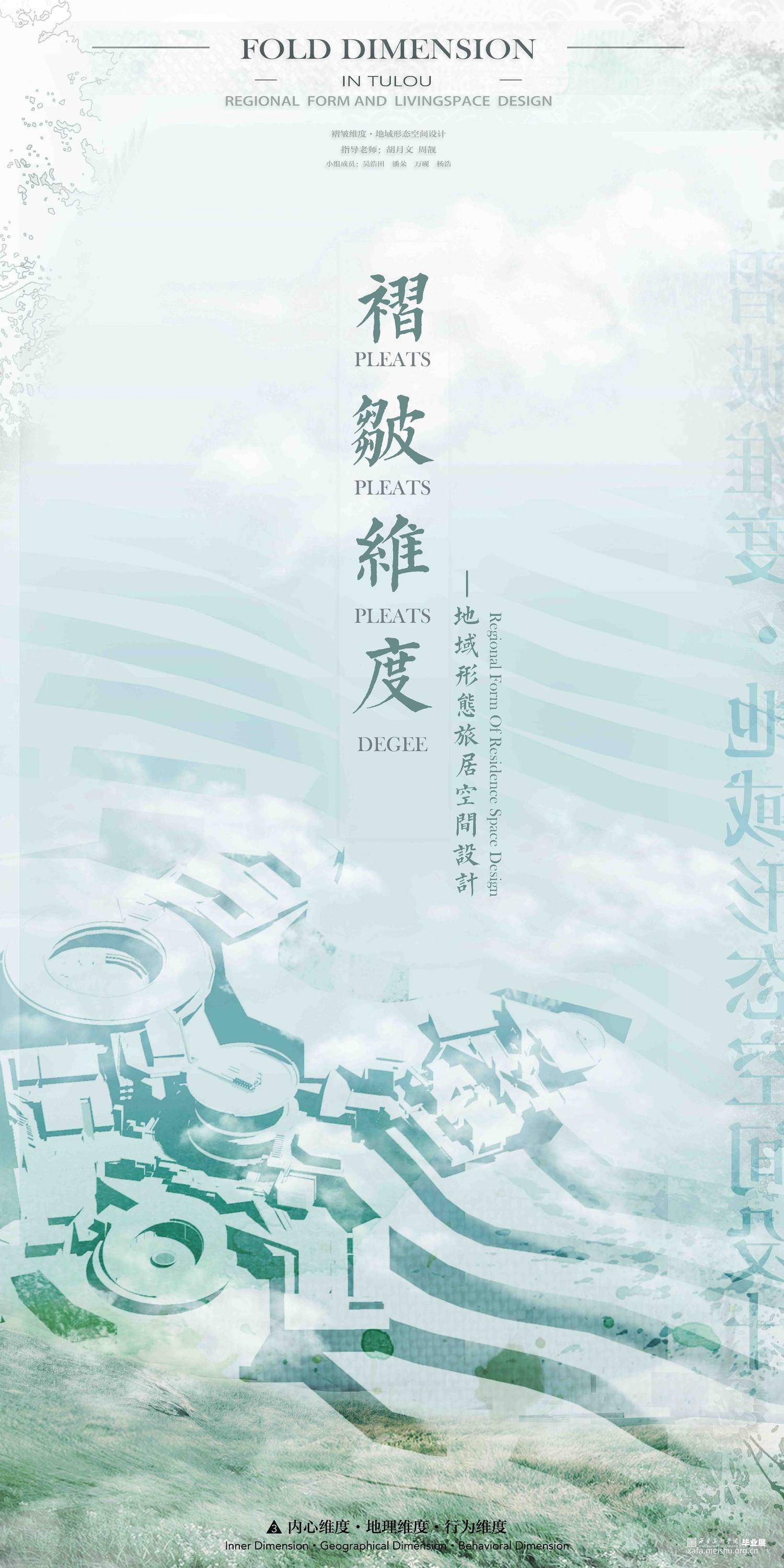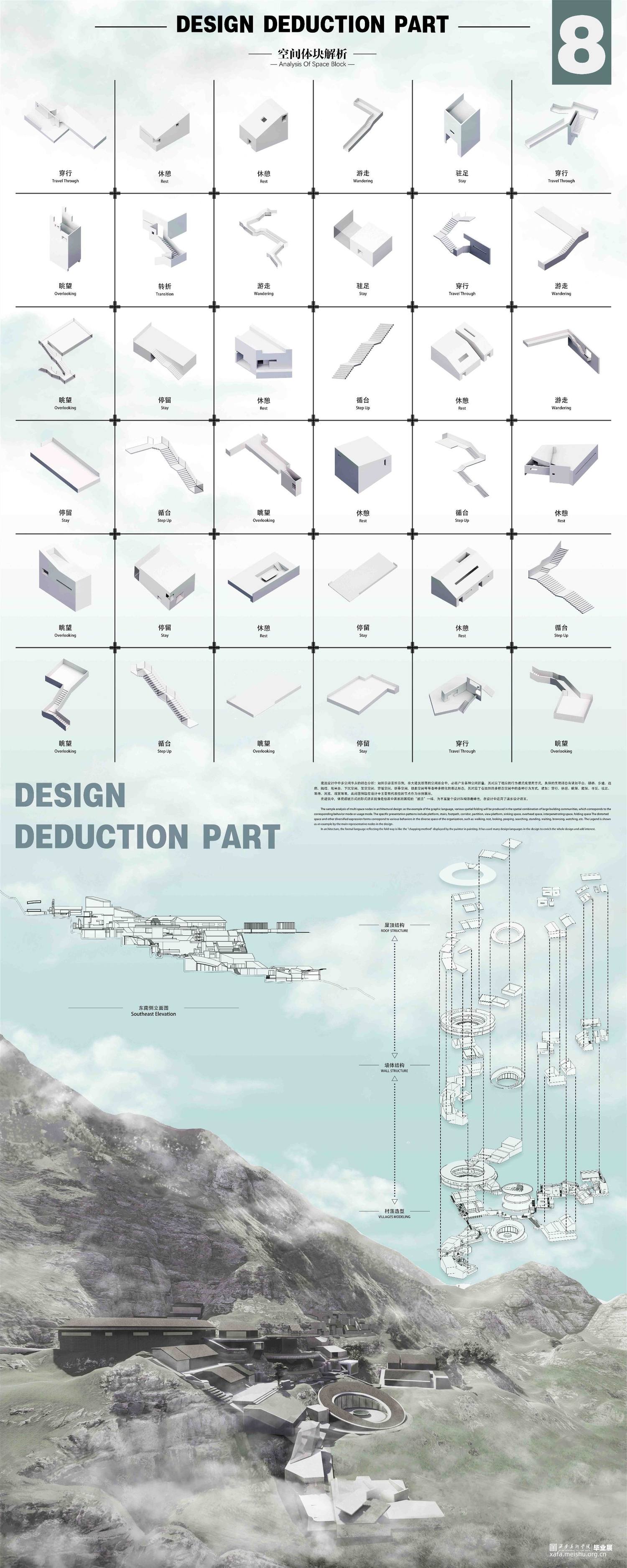 在作品的1-3张版面当中,详细梳理了团队成员前往土楼文化圈的体验感受和调研数据,对当地的特色文化环境及特殊空间构造进行了一定的观察和探索,确定了设计方向点和落地点,并描摹出了地形褶皱关系与空间关系;而在4-7张版面当中,我们对现有空间的多层次褶皱进行了深入设计,搭建出了系列性的建筑群落空间;在8-9张版面当中,我们对相关的节点要素进行了类型学的分析和研究,详细探讨了多节点组合嵌套关系的诸多可能性,对设计语言再一次进行了更新和迭代,将设计更进一步深化;而在最后附录的效果图展示当中,我们呈现出了具体且丰富的设计成果,设计充分落实了对土楼传统民居的空间的吸收发展和再创新,展现出作品褶皱空间的多层次性和可塑性。