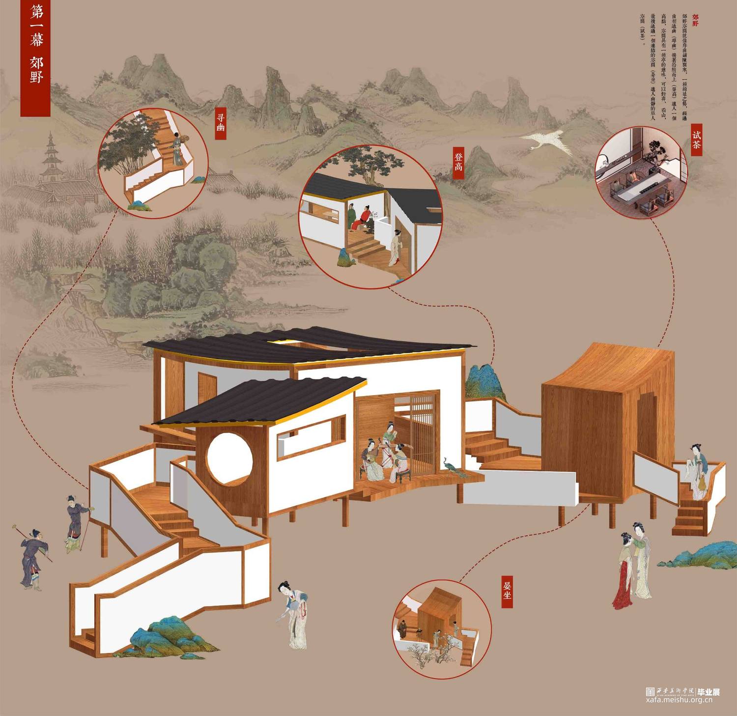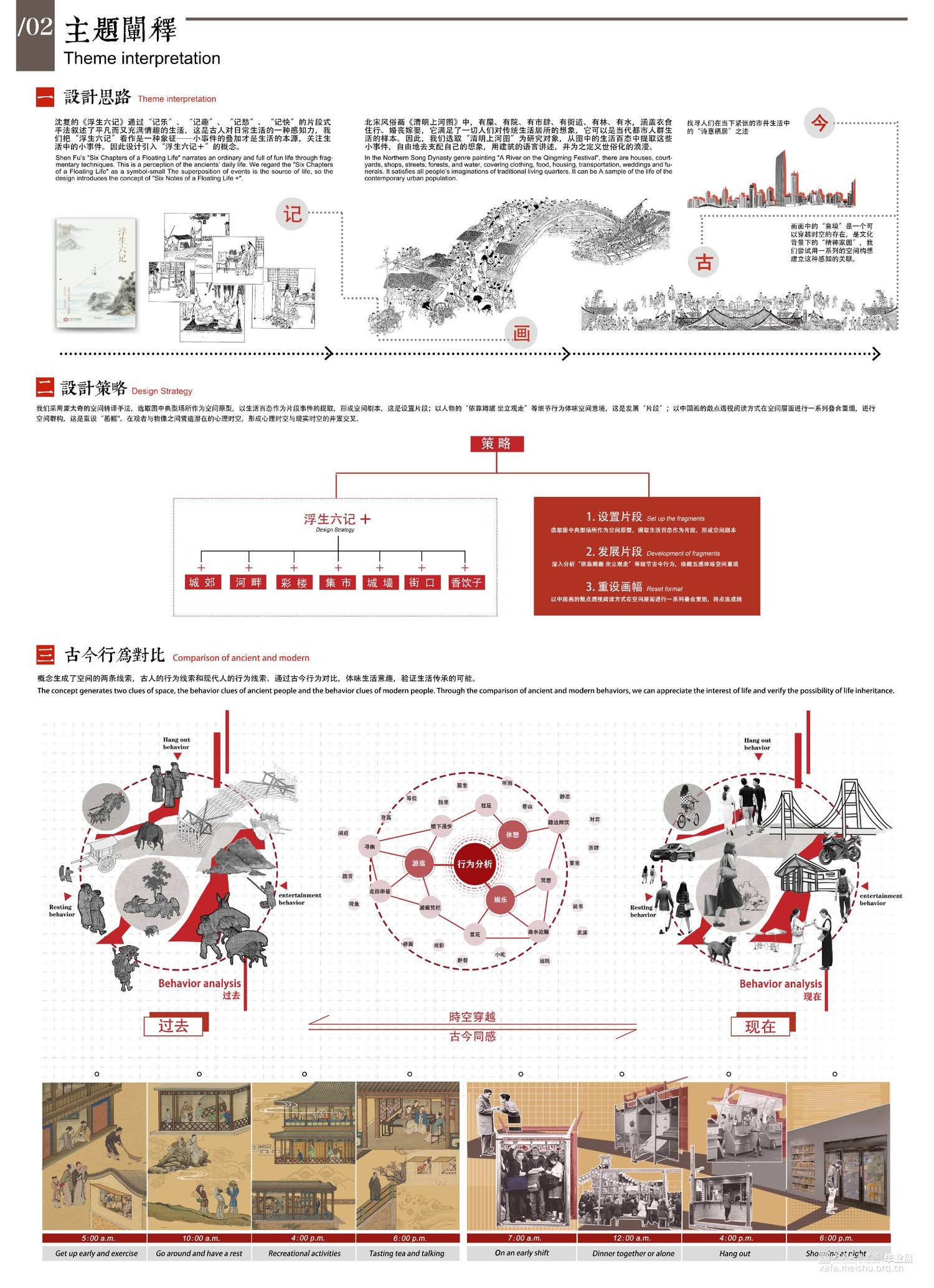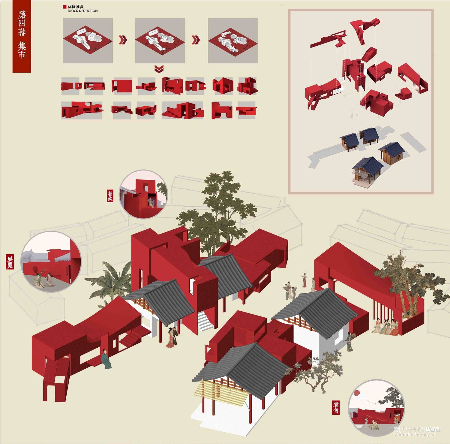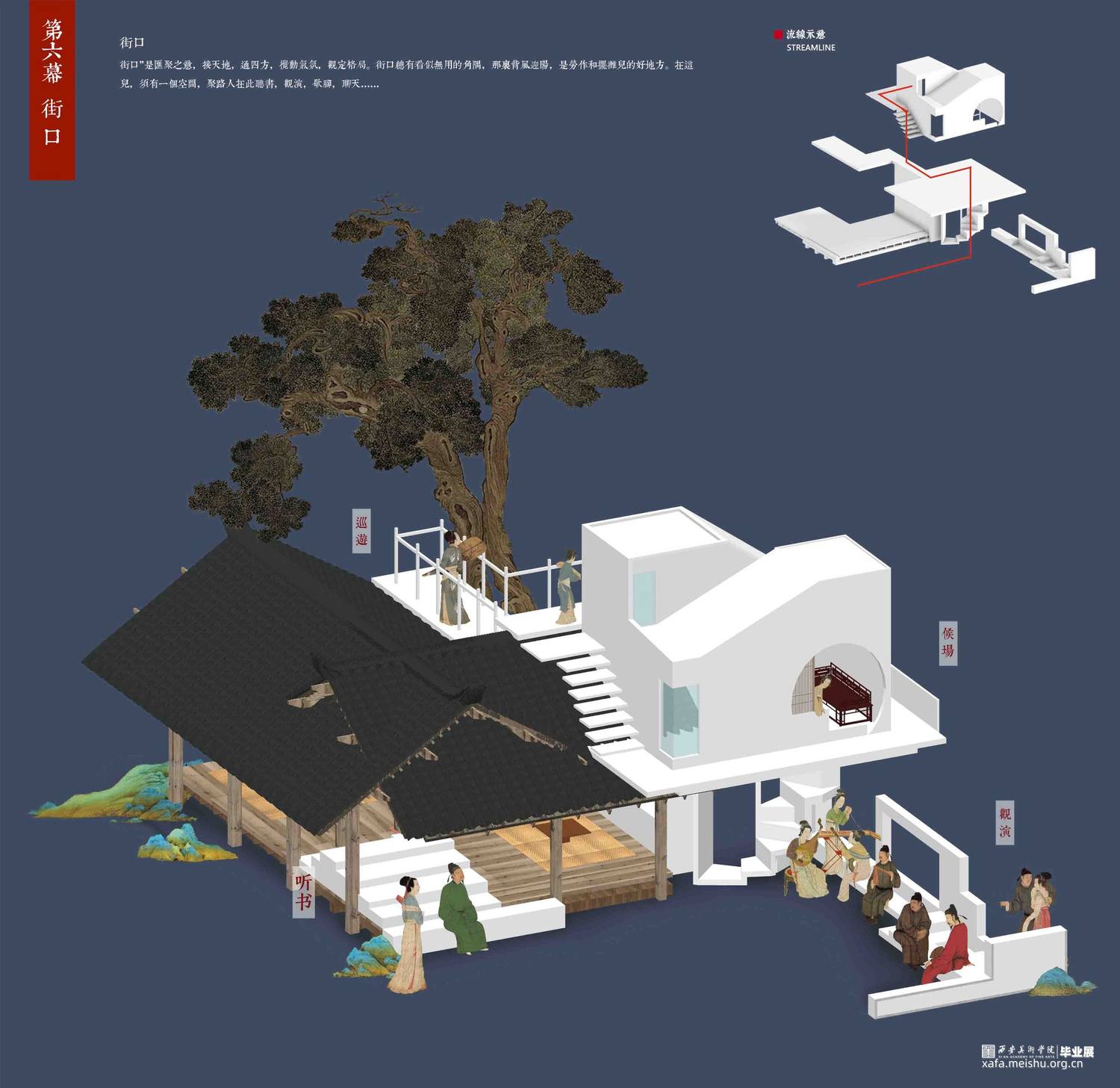 设计以北宋风俗画《清明上河图》市井生活空间为研究脚本,通过叙事性空间设计手法探究人居行为与社交文化,找寻现世生活中的“诗意栖居”之法。