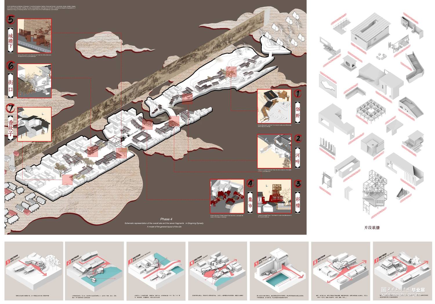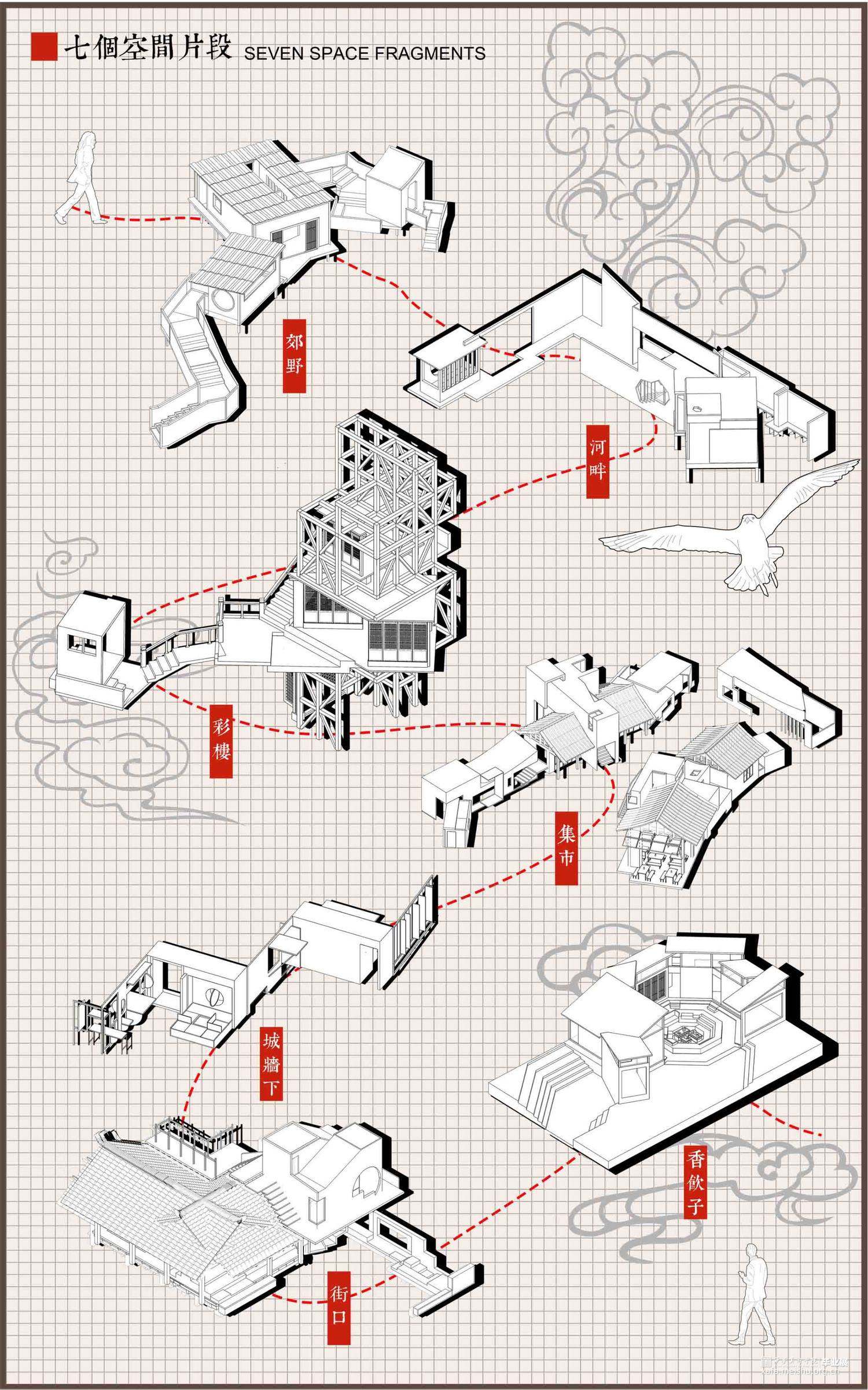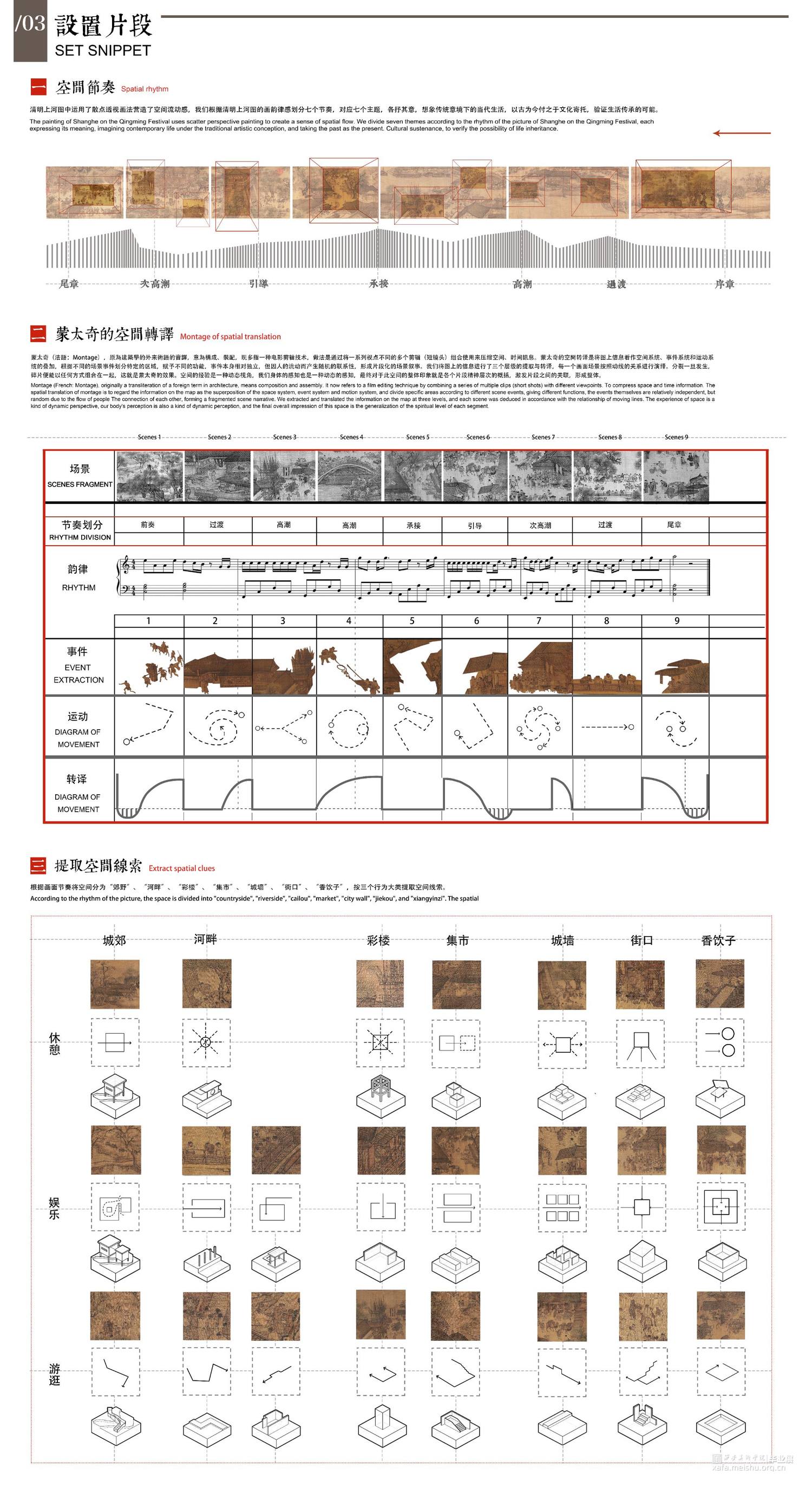 在原有绘制画幅的民俗文化与生活百态中提取事件——设置“片段”;发展“片段”;重设“画幅”三个步骤完成设计构架。设计采用蒙太奇的空间转译手法,选取图中典型场所“郊野”“河畔”“彩楼”“集市”“城墙下”“街口”“香饮子”等作为空间原型,契入生活百态作为片段事件的叙事空间剧本,扑捉画幅中人物的“倚、靠、蹲、踞、坐、立、观、走”等行为细节体味空间意境,将中国画的散点透视阅读方式在空间层面进行系列叠合重组加以空间群构,纾解设计的空间叙事空间形态关系。