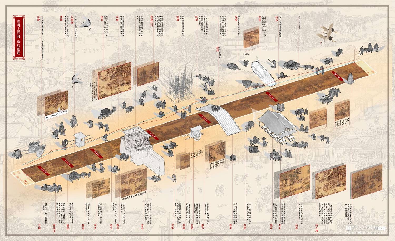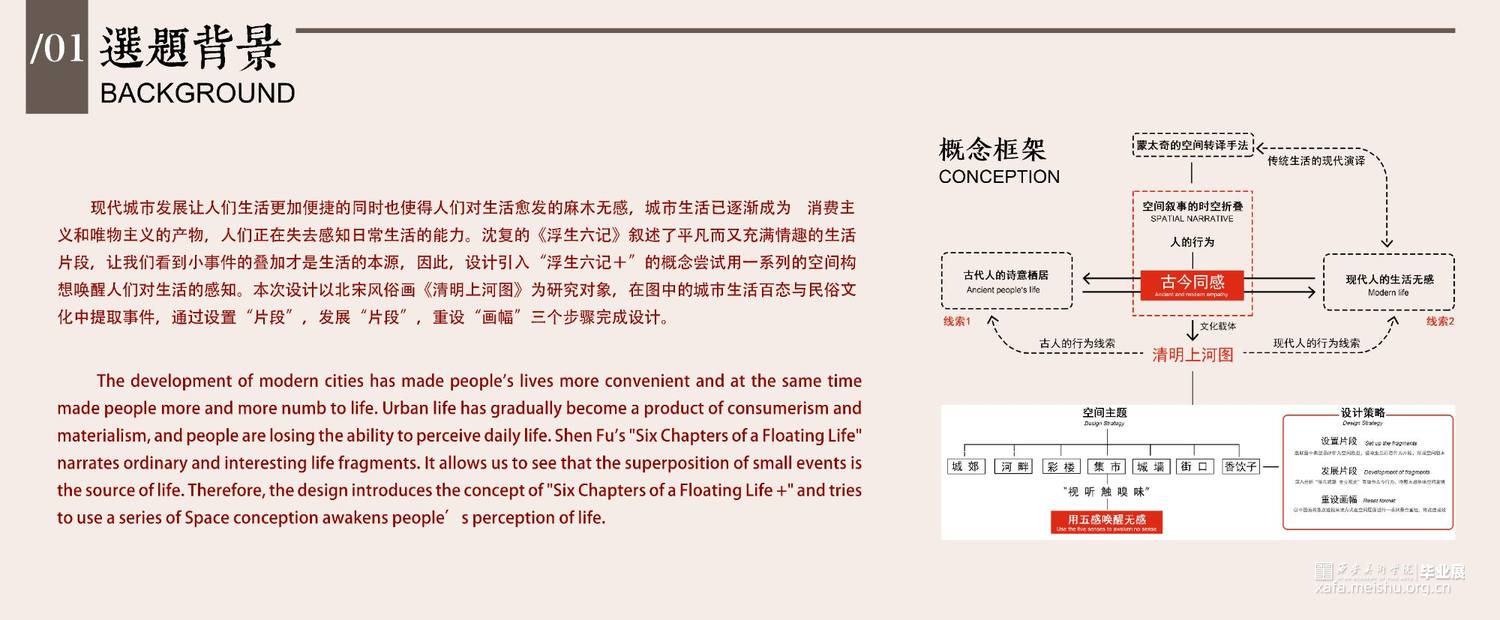 在观者与物像之间营造历史的心理时空与现世时空的并置,即清明上河图可见的市井与生活的烟火气是近千年的历史回眸。而设计目的以期回望传统,环视当下;凭吊古人所感,感怀传统叙事意境下深沉的生活意趣。