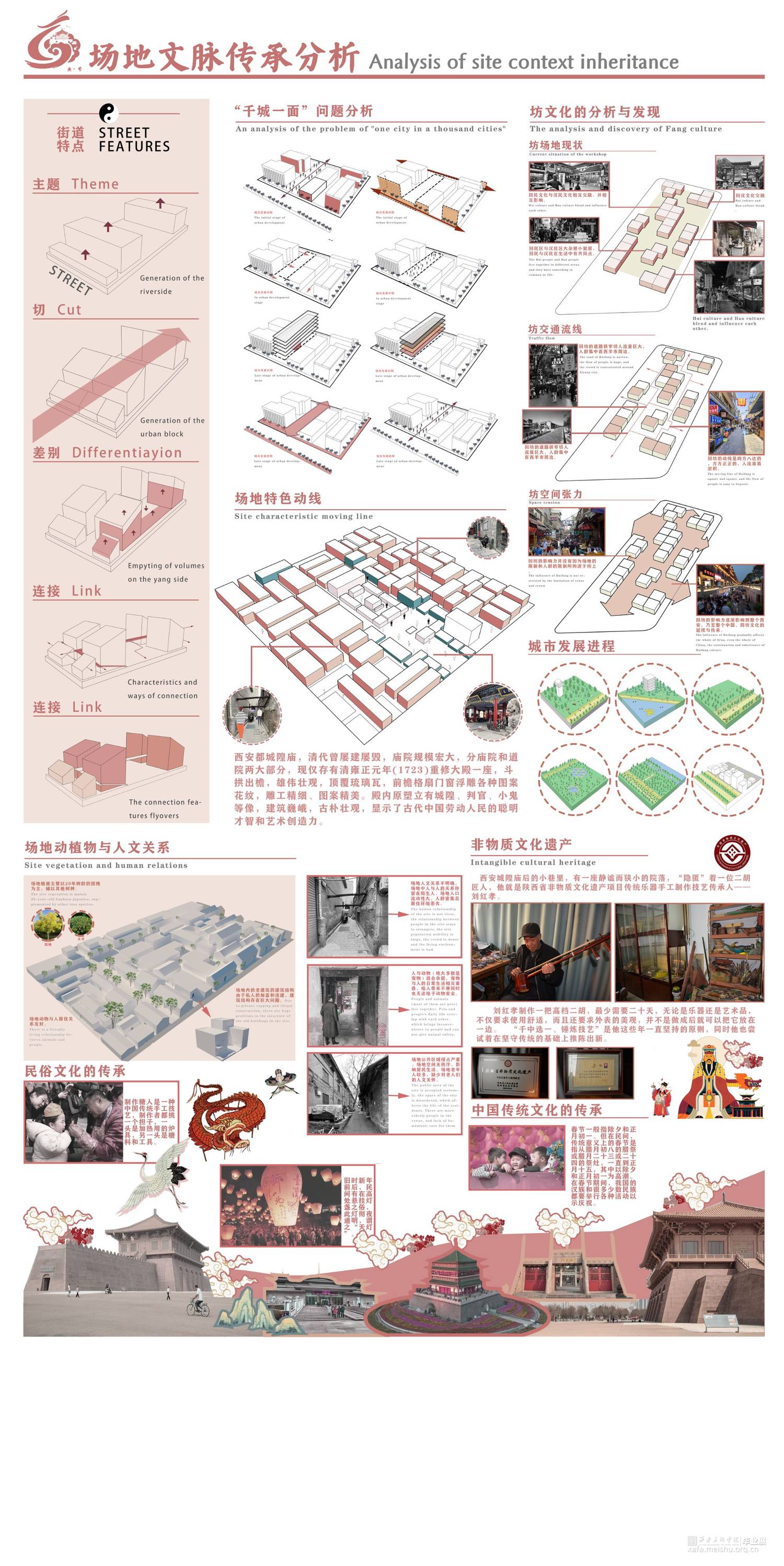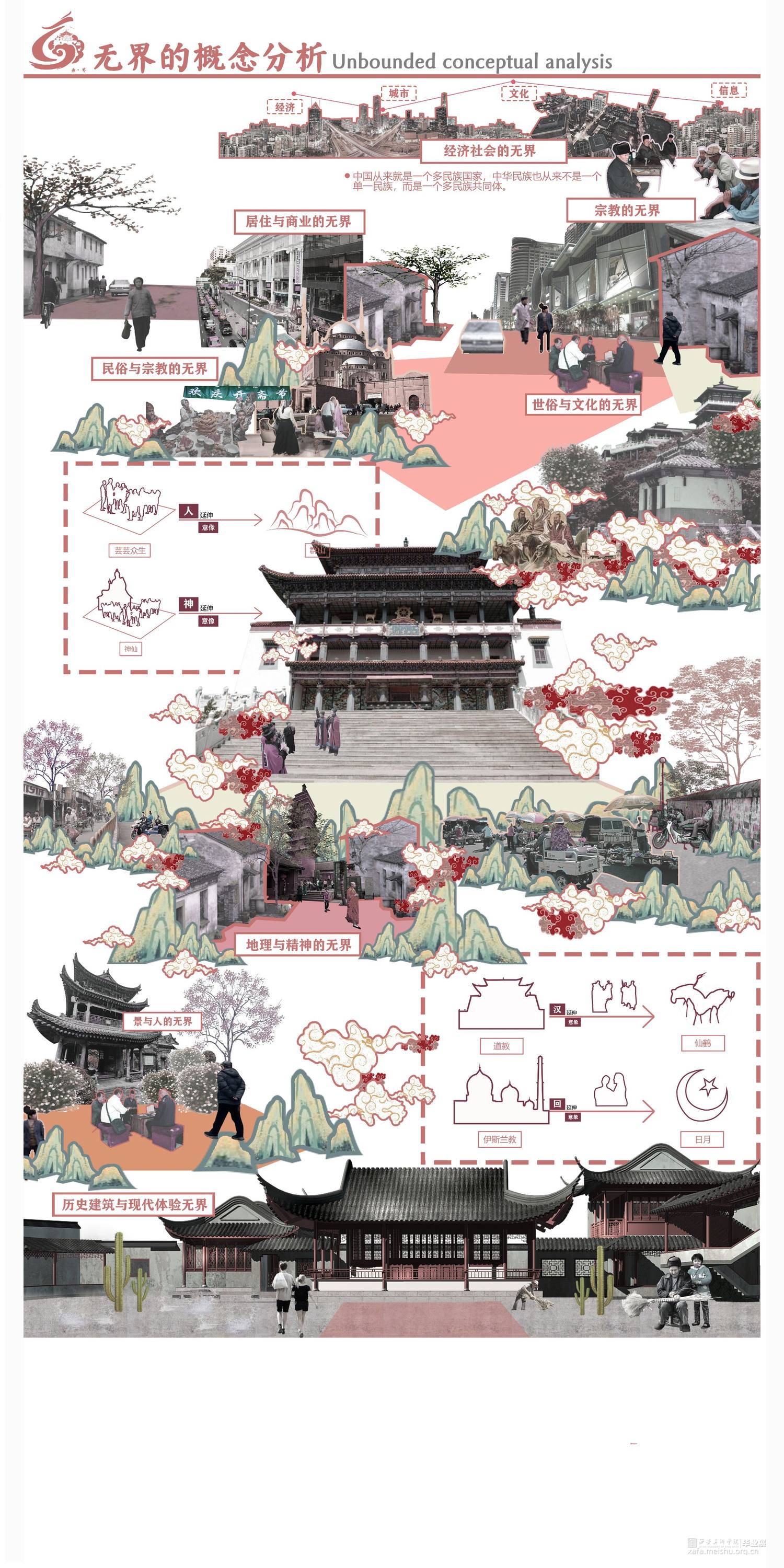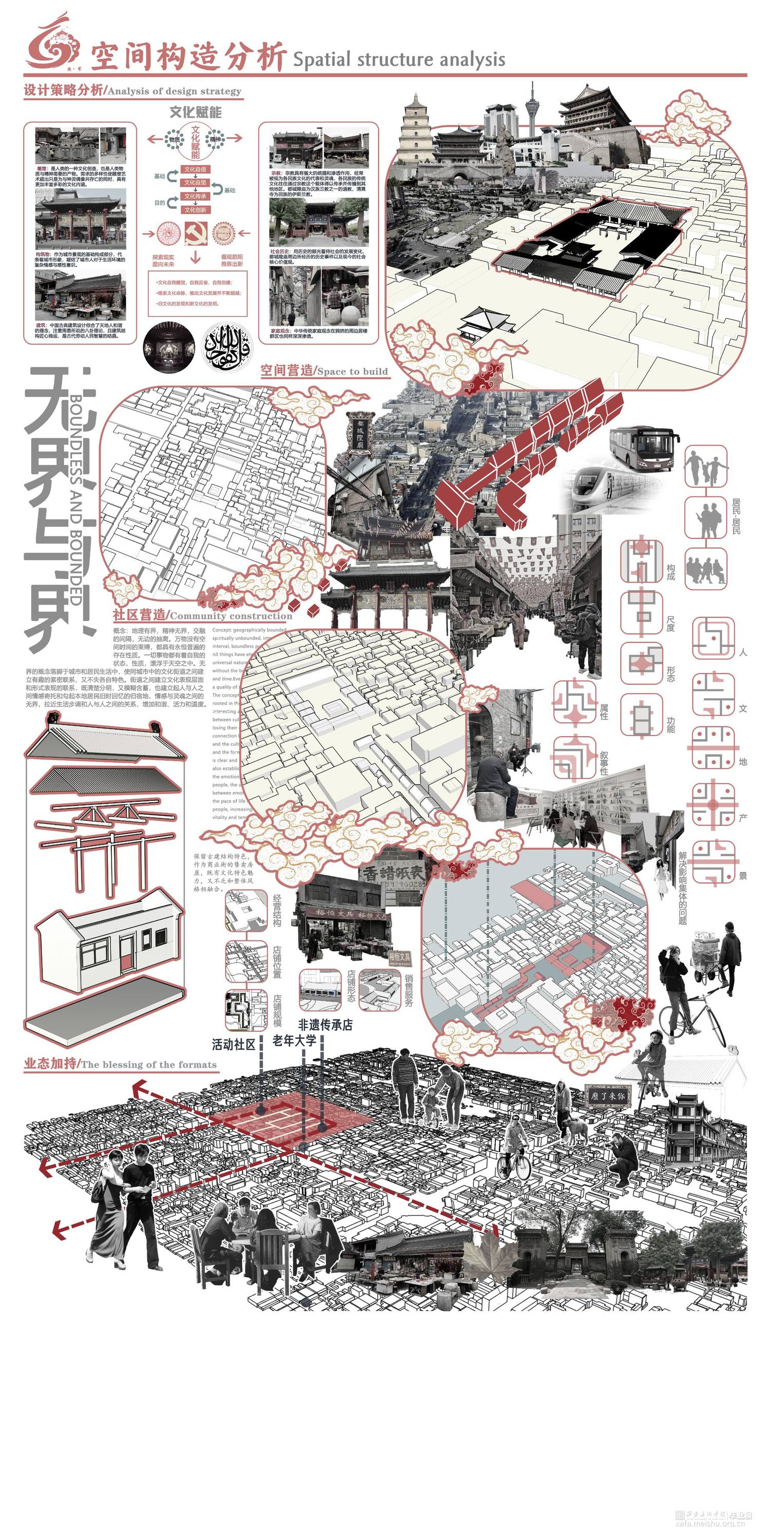 我们小组选取了西安传统街道——庙后街街区,针对场地存在的人地矛盾,人群需求的不同等等问题,我们通过引申道教的无界概念进行设计。道生一一生二二生三三生万物,场地原有的道教、儒教、伊斯兰教三教混杂,我们在中国传统本土宗教道教的教义中找到道生万物的思想,包容却又不是一味的包含。