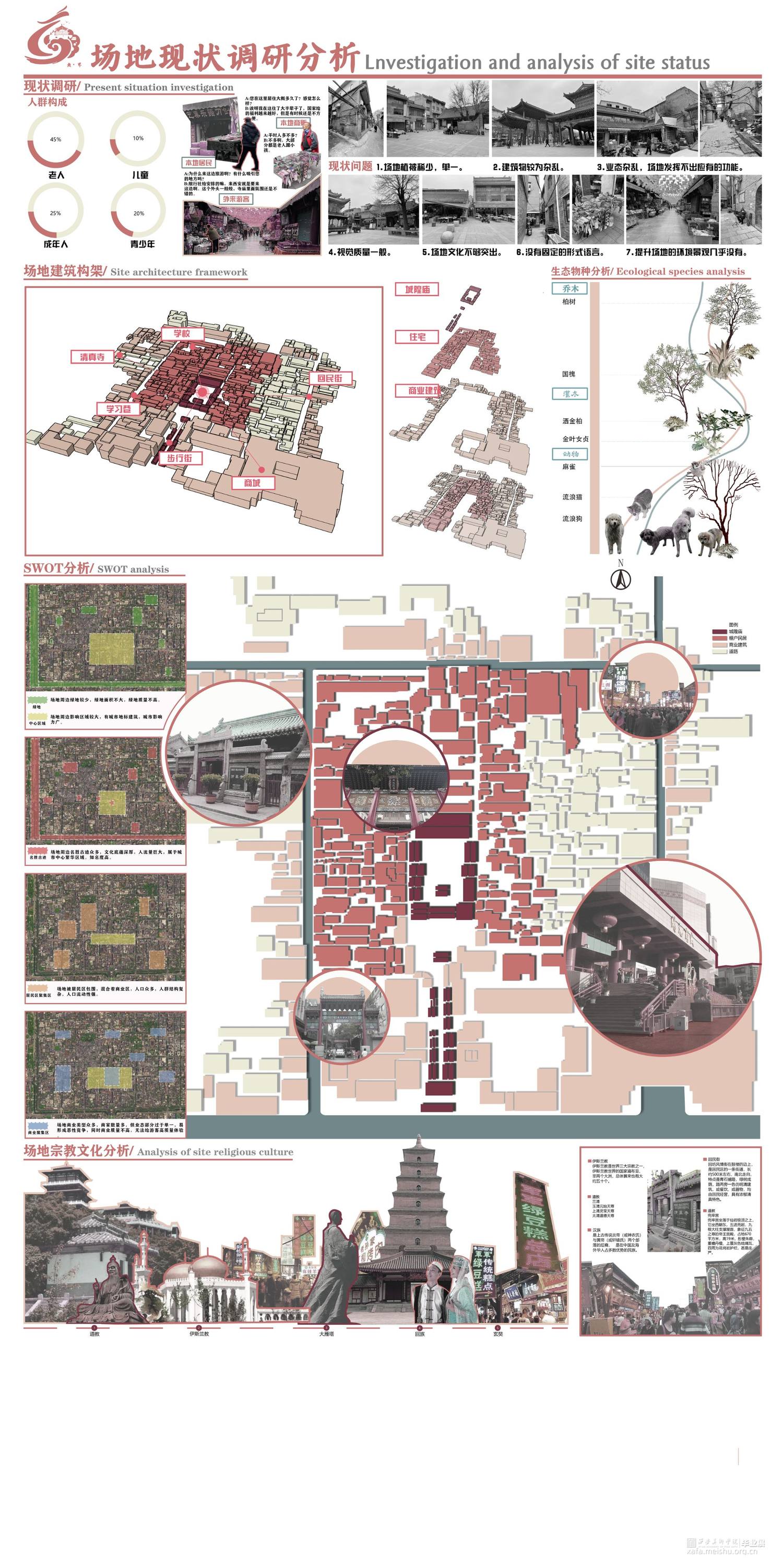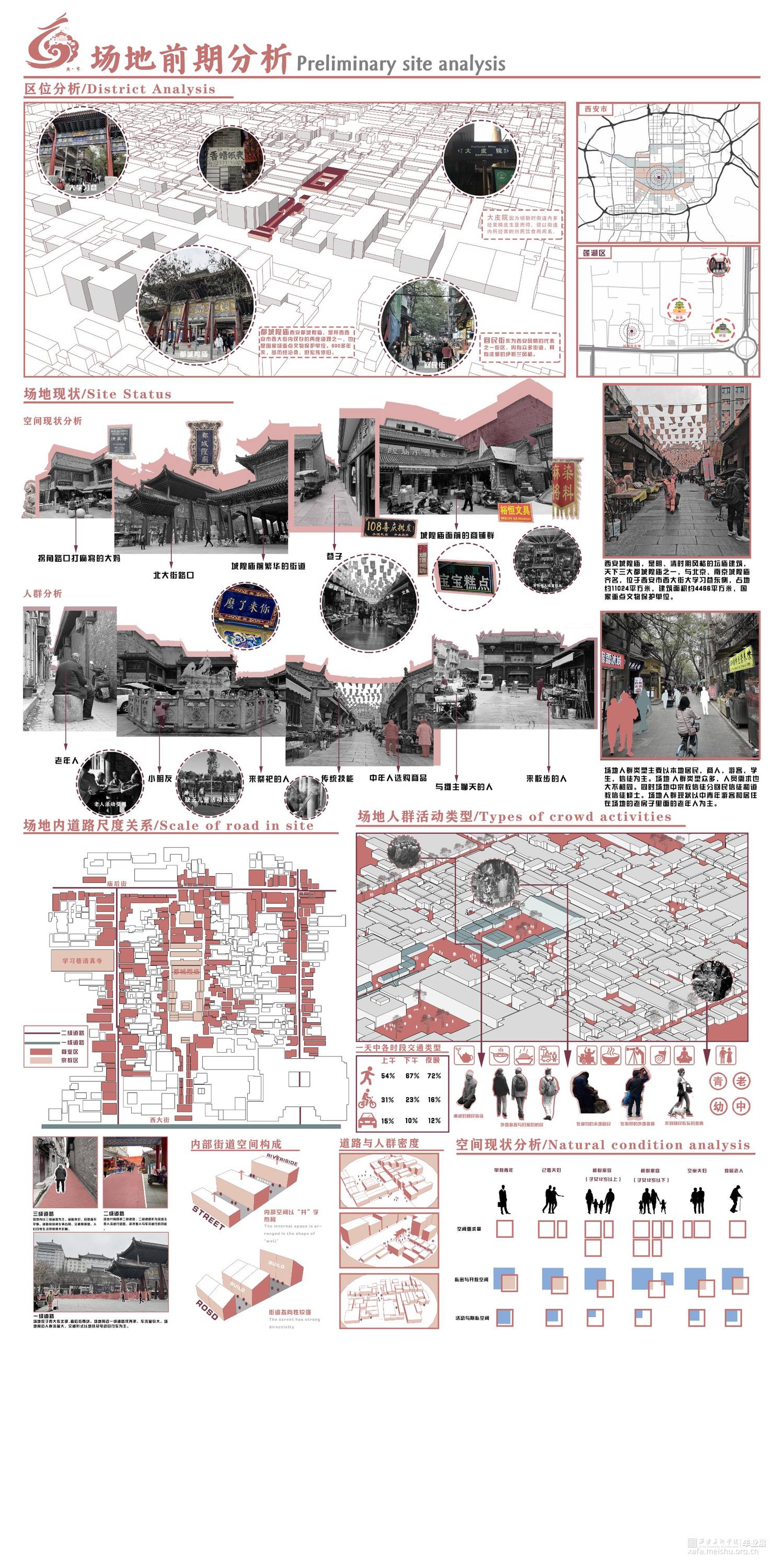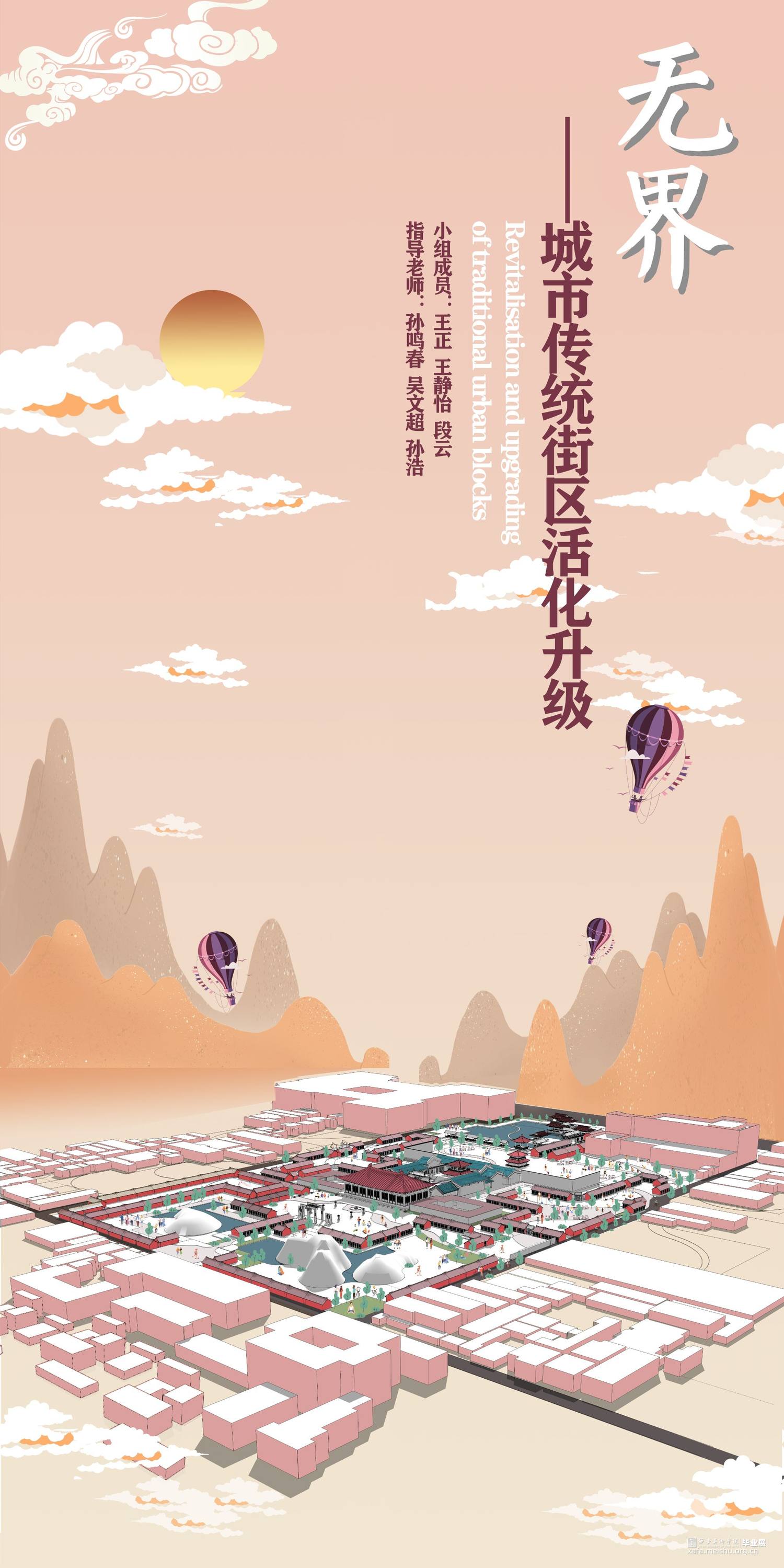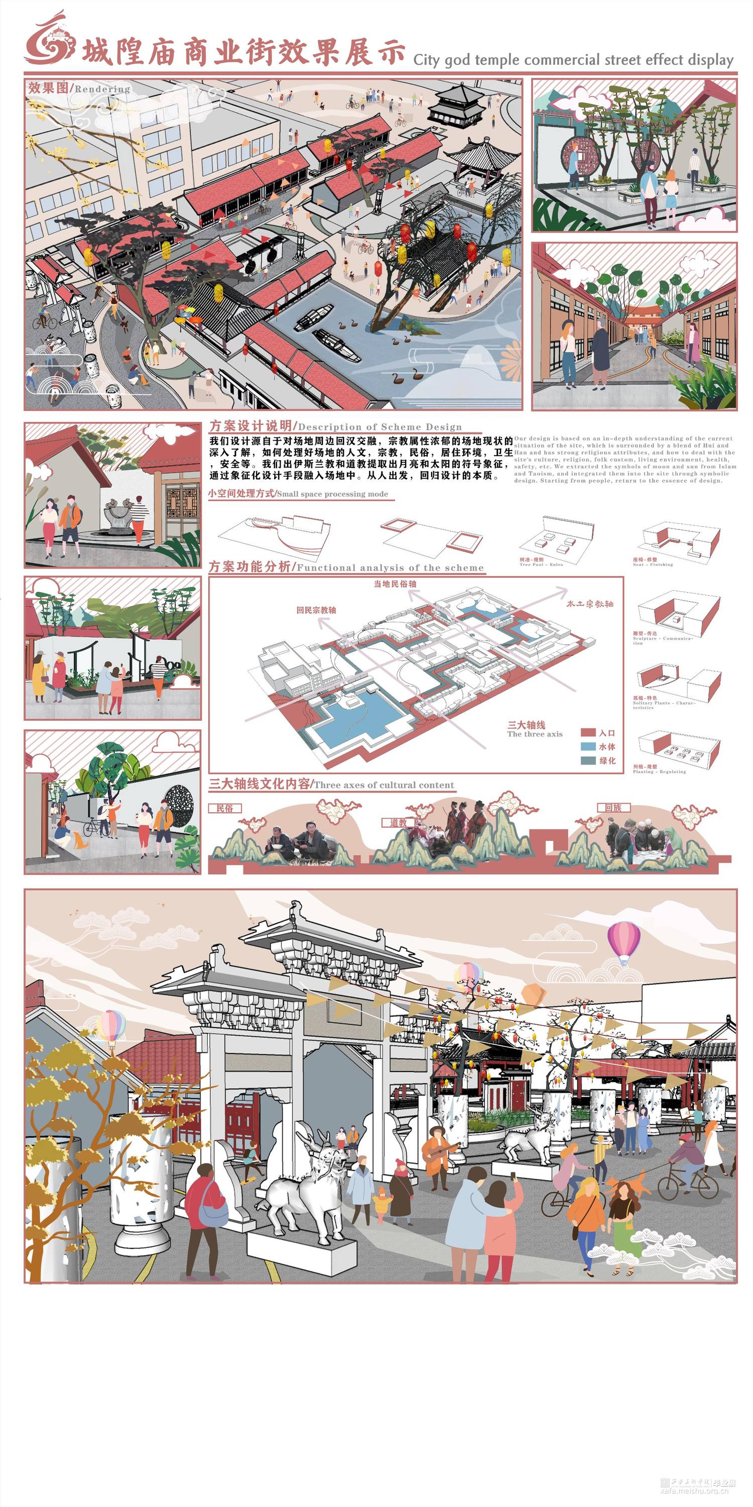 我们小组选取了西安传统街道——庙后街街区,针对场地存在的人地矛盾,人群需求的不同等等问题,我们通过引申道教的无界概念进行设计。道生一一生二二生三三生万物,场地原有的道教、儒教、伊斯兰教三教混杂,我们在中国传统本土宗教道教的教义中找到道生万物的思想,包容却又不是一味的包含。