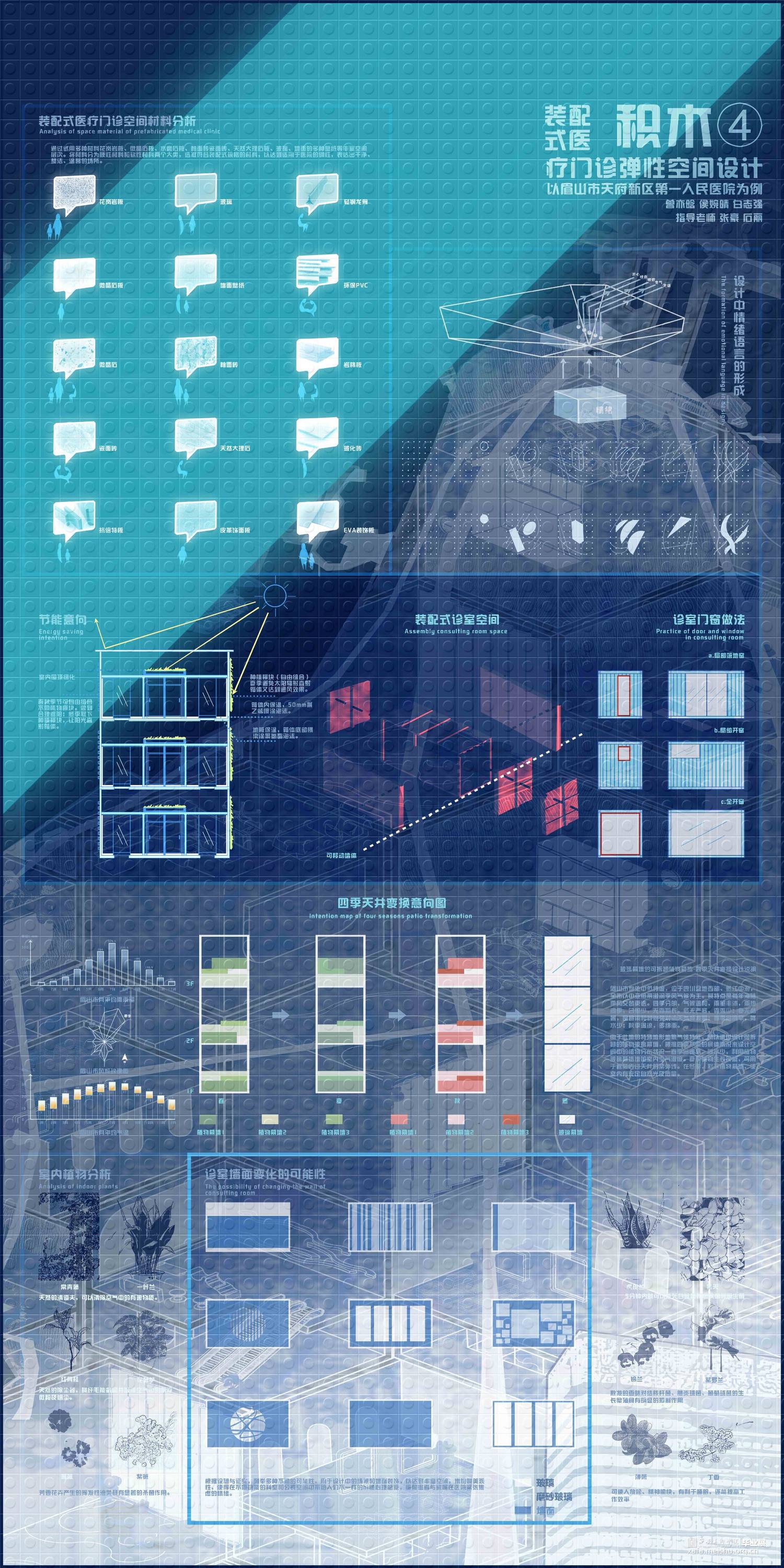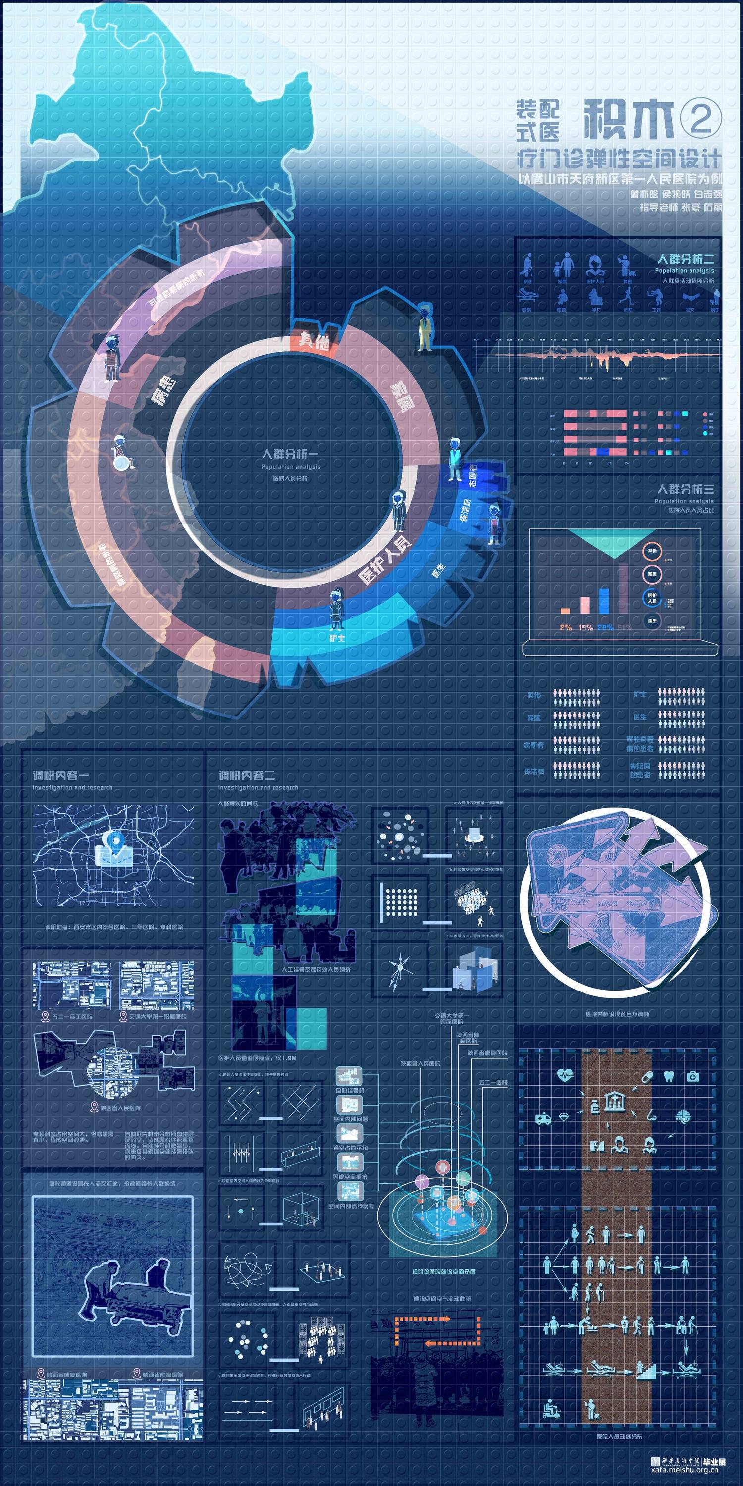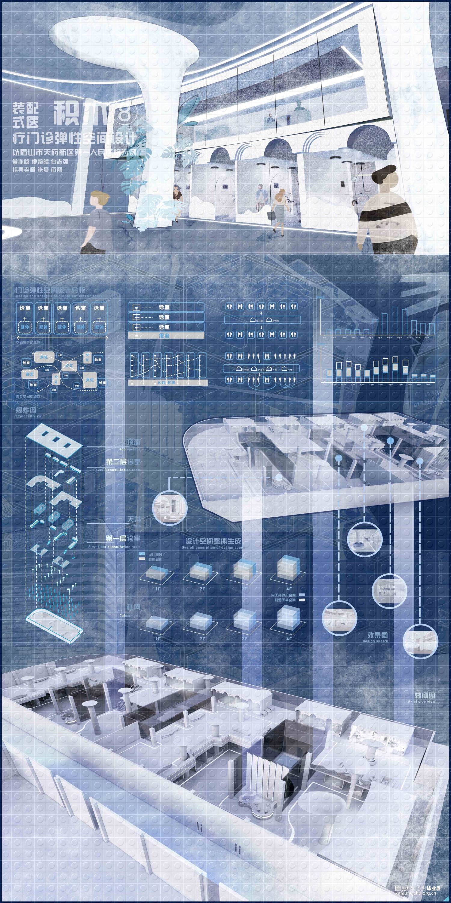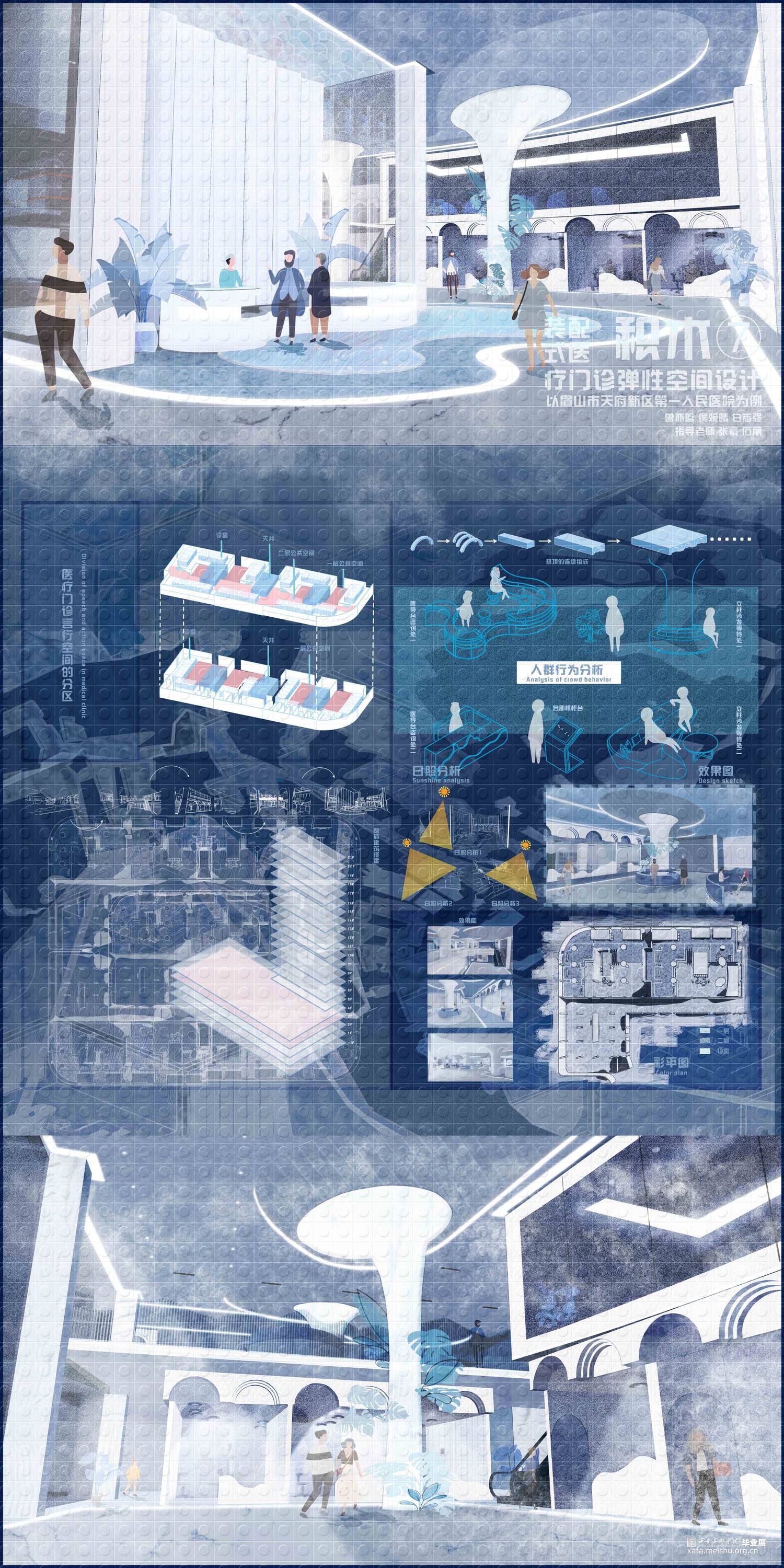 《积木—装配式医疗门诊弹性空间设计》项目位于四川眉山市天府新区,秉承眉山市天府新区第一人民医院的设计理念:“济世之舟,乘风破浪,上善之水,泽惠四方”,方案以水之状饰医院之形,通过水联想到与之相关的事物——涟漪、船、桥等,汲取水的颜色:蓝与白——充满静且谧平和的颜色作为室内的主色调。以“积木”可拼接、易拆卸、更便捷的造型方式形成设计逻辑,贯彻装配式诊疗空间的理念,将“弹性空间”的概念融入设计之中,赋予整个医院设计另一种发展和可能。使其诊疗空间在未来功能多变的不同情境下——医疗等级事件发生时能迅速反应,分割出
