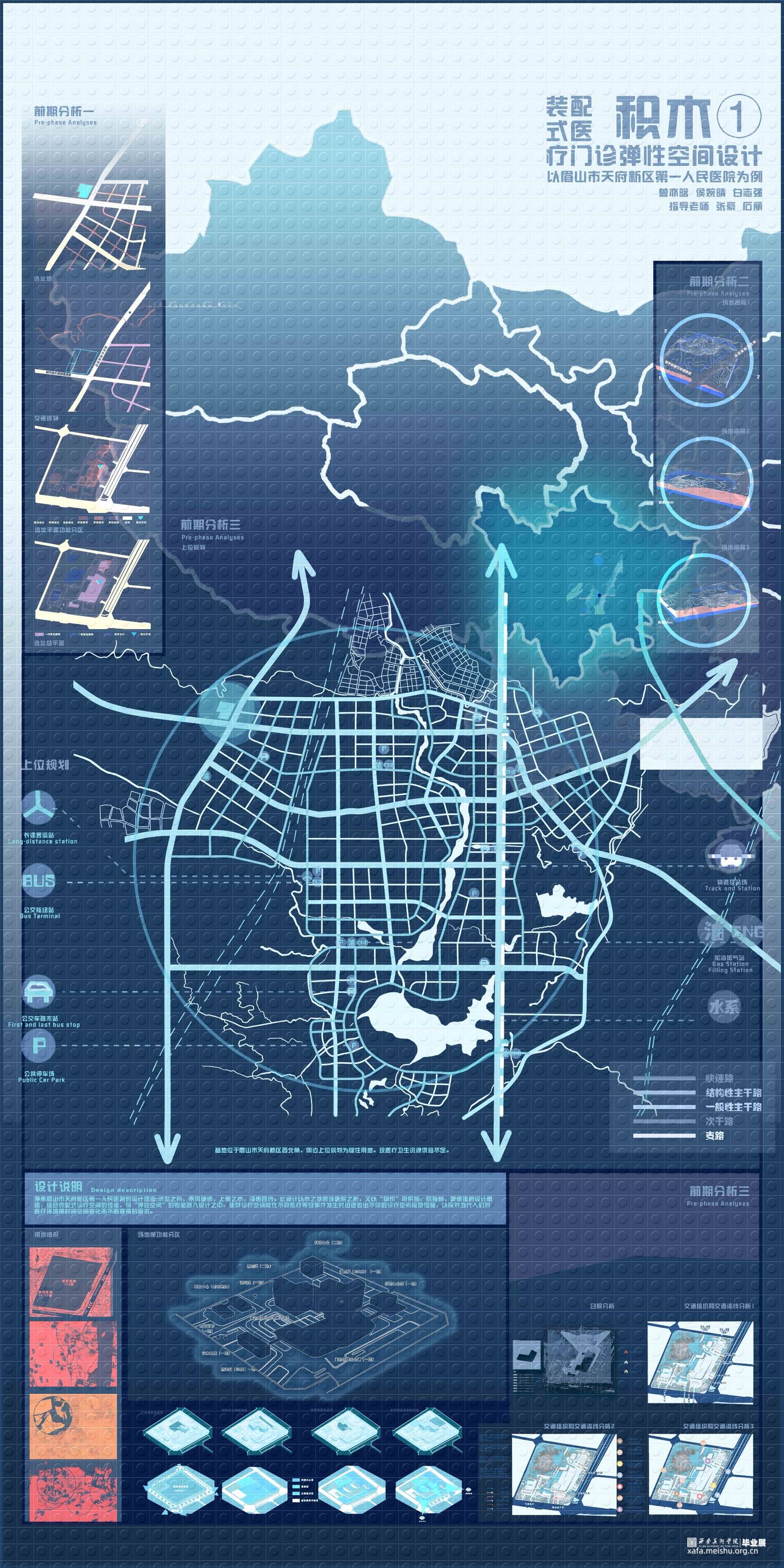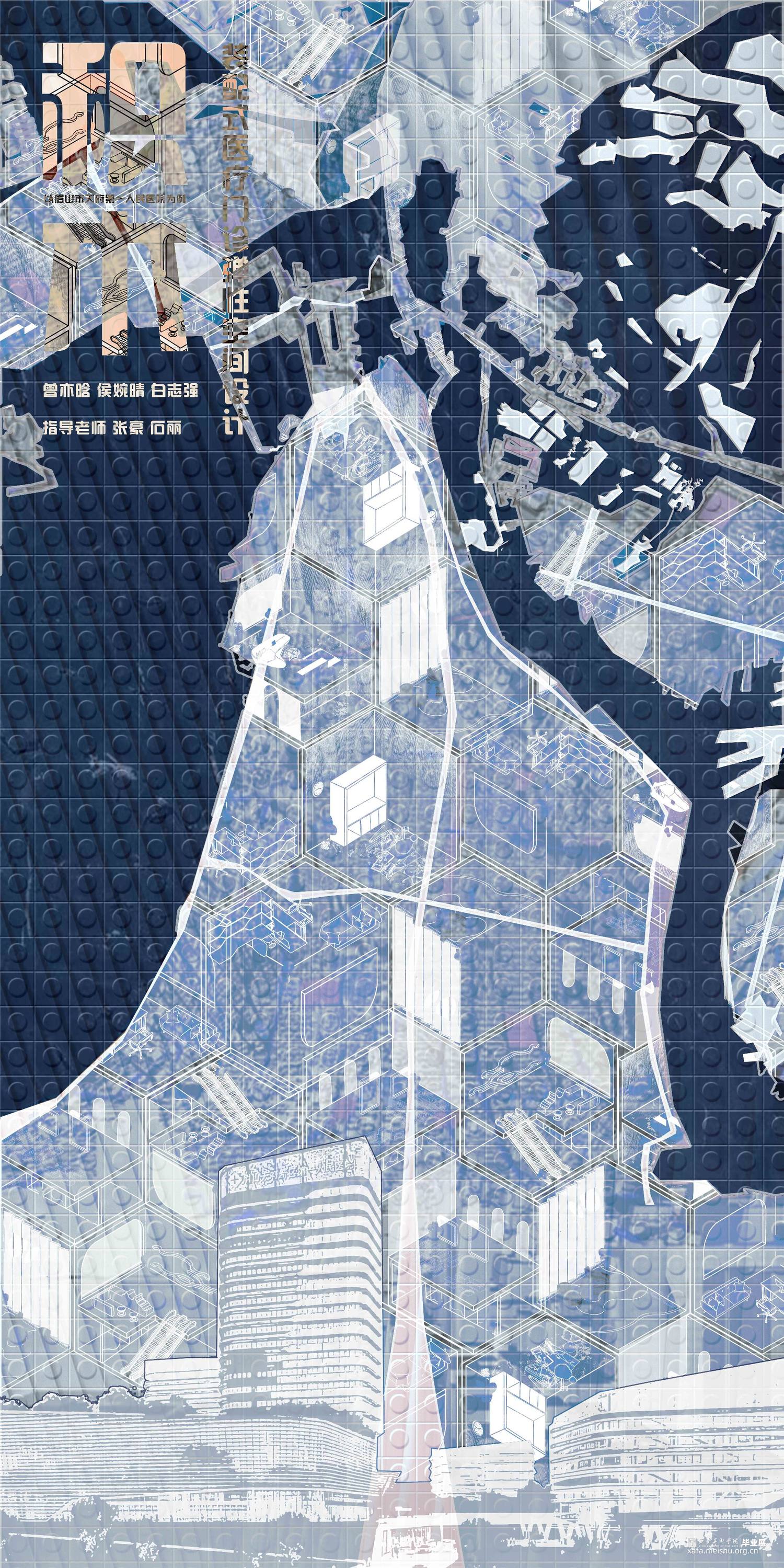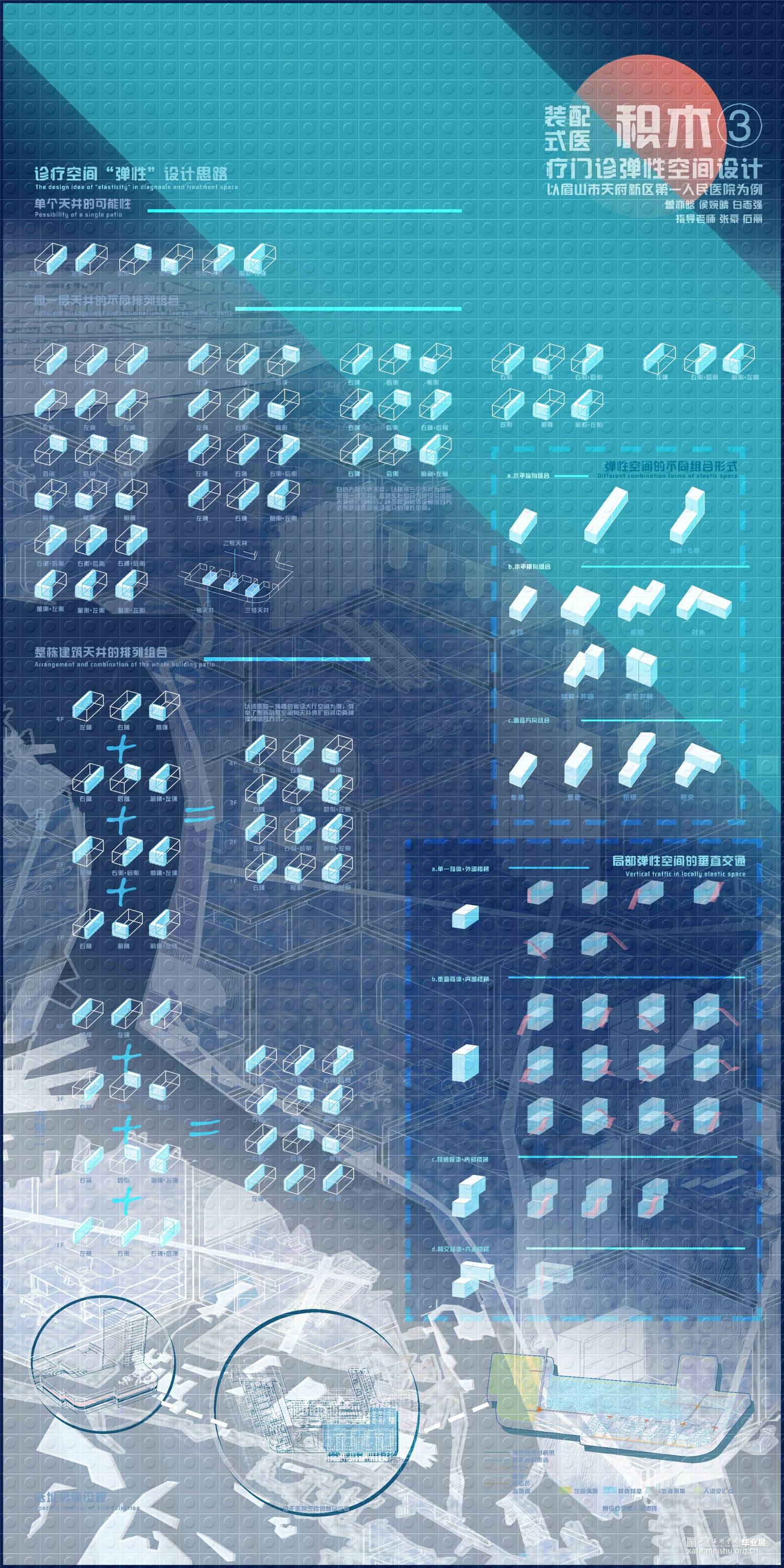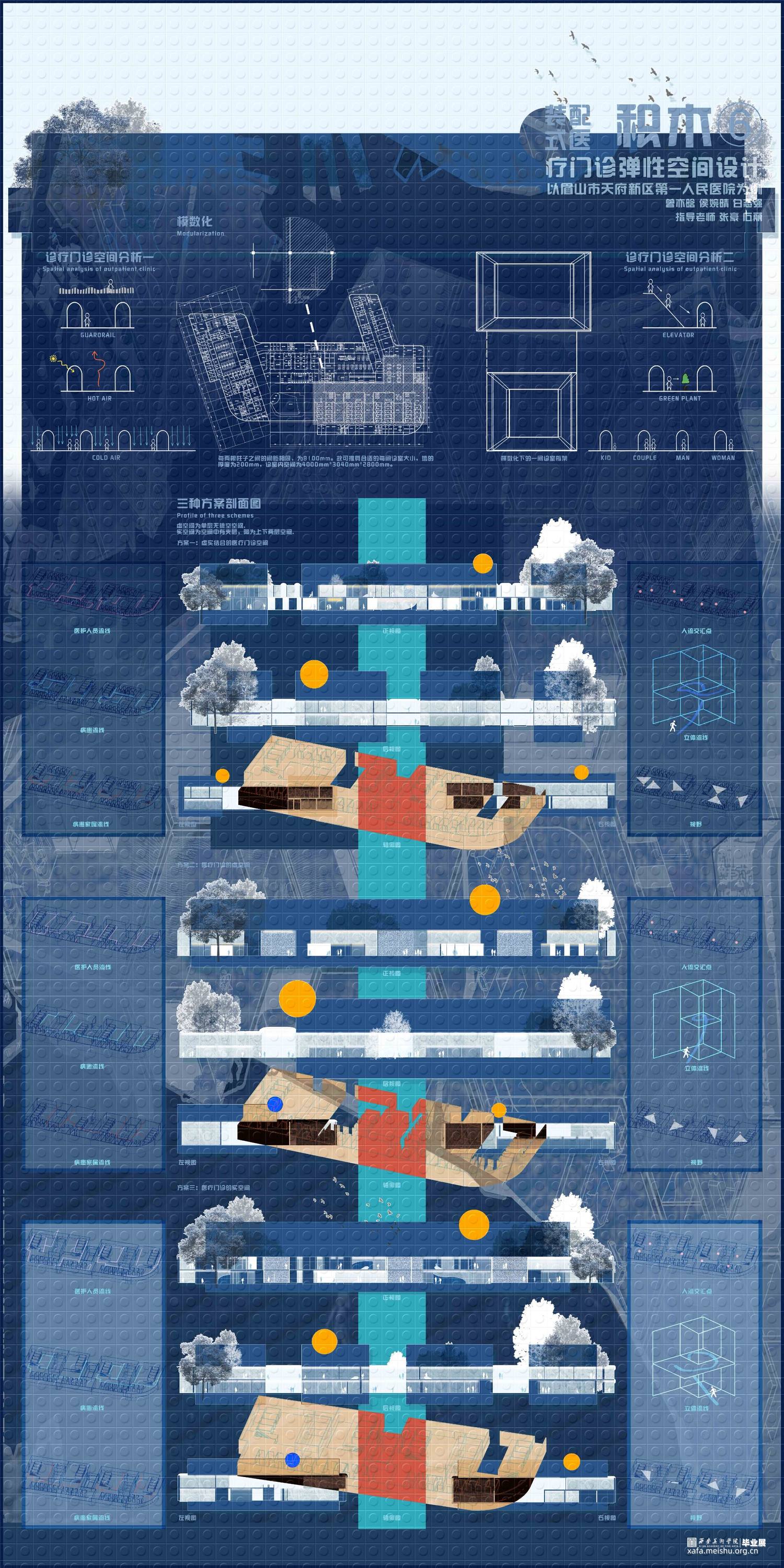 《积木—装配式医疗门诊弹性空间设计》项目位于四川眉山市天府新区,秉承眉山市天府新区第一人民医院的设计理念:“济世之舟,乘风破浪,上善之水,泽惠四方”,方案以水之状饰医院之形,通过水联想到与之相关的事物——涟漪、船、桥等,汲取水的颜色:蓝与白——充满静且谧平和的颜色作为室内的主色调。以“积木”可拼接、易拆卸、更便捷的造型方式形成设计逻辑,贯彻装配式诊疗空间的理念,将“弹性空间”的概念融入设计之中,赋予整个医院设计另一种发展和可能。使其诊疗空间在未来功能多变的不同情境下——医疗等级事件发生时能迅速反应,分割出