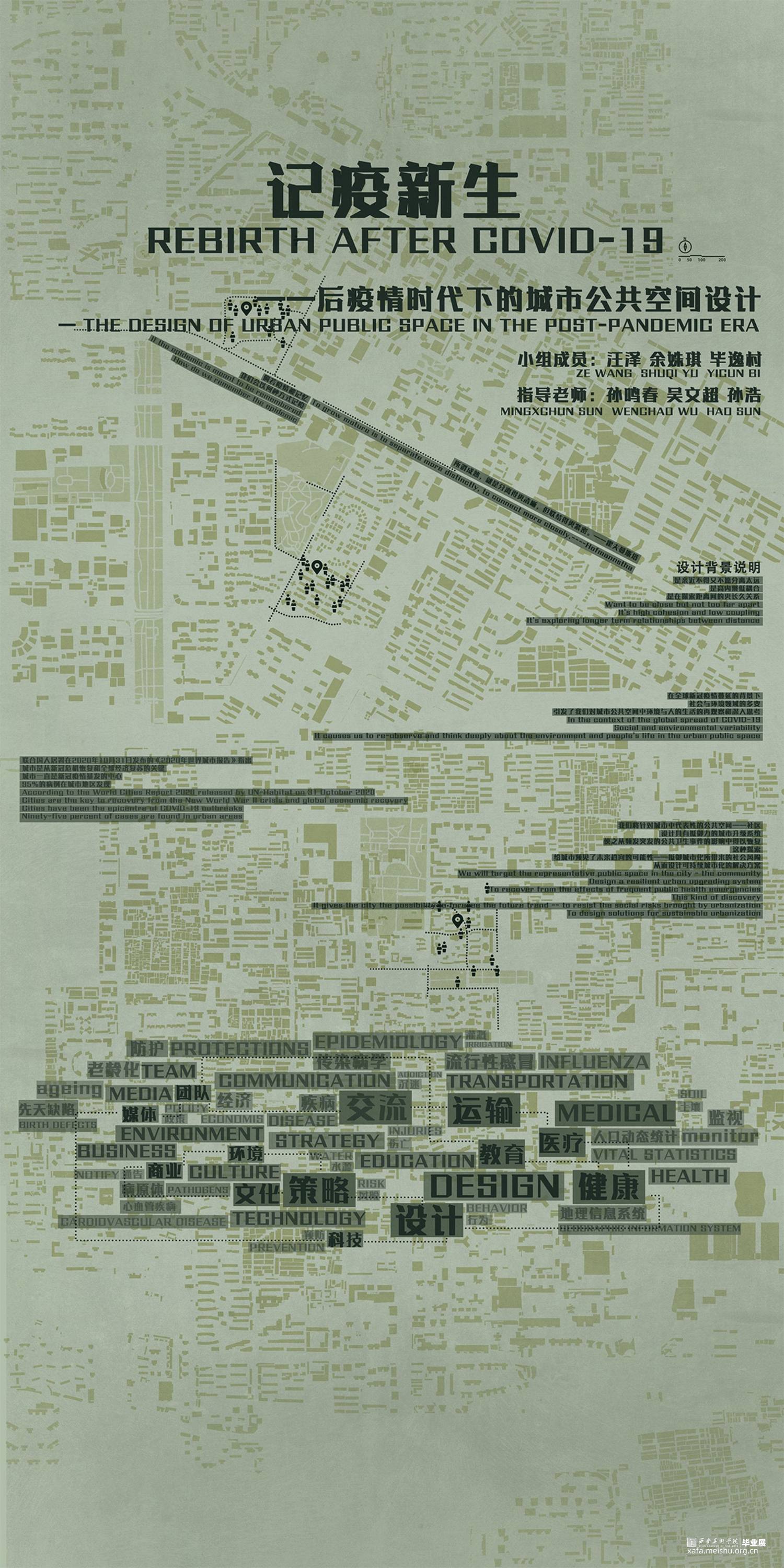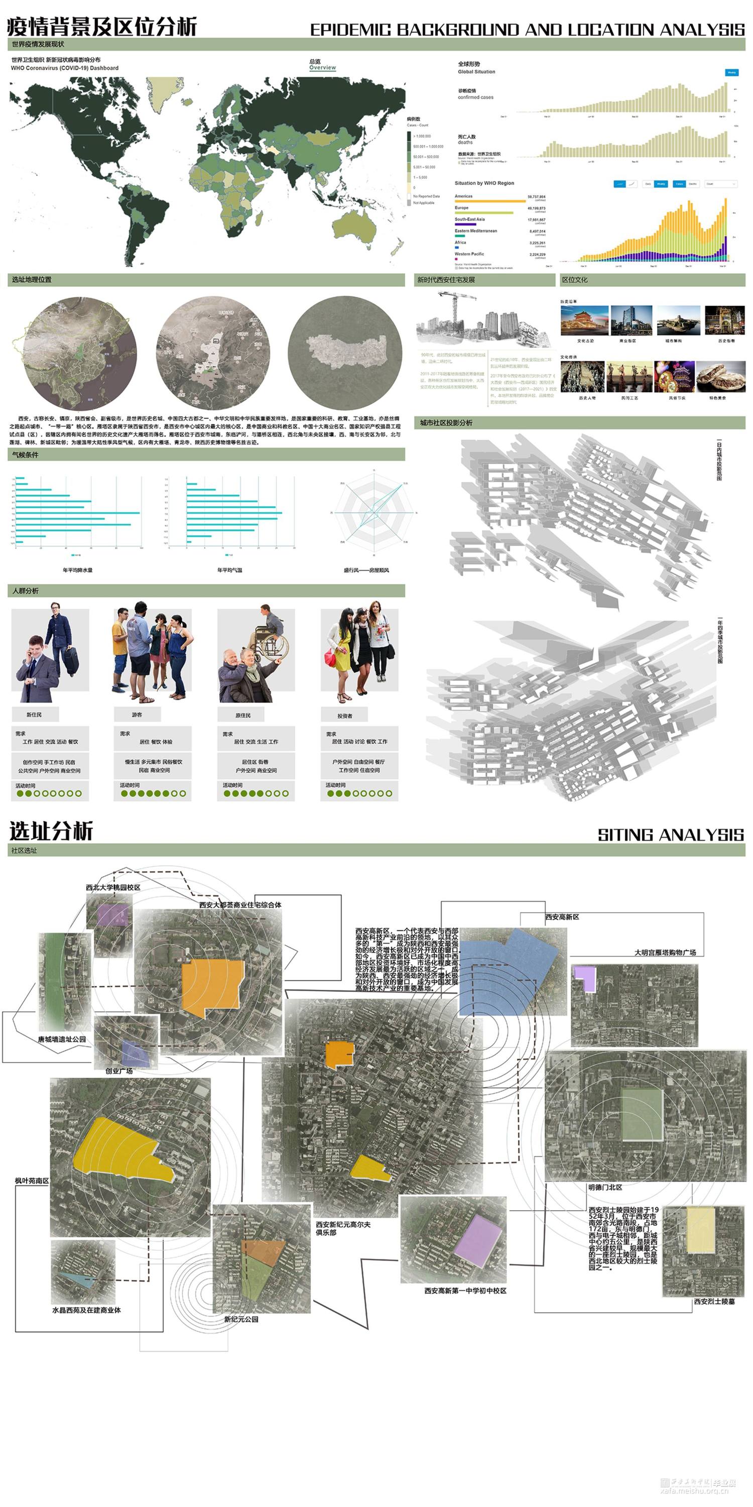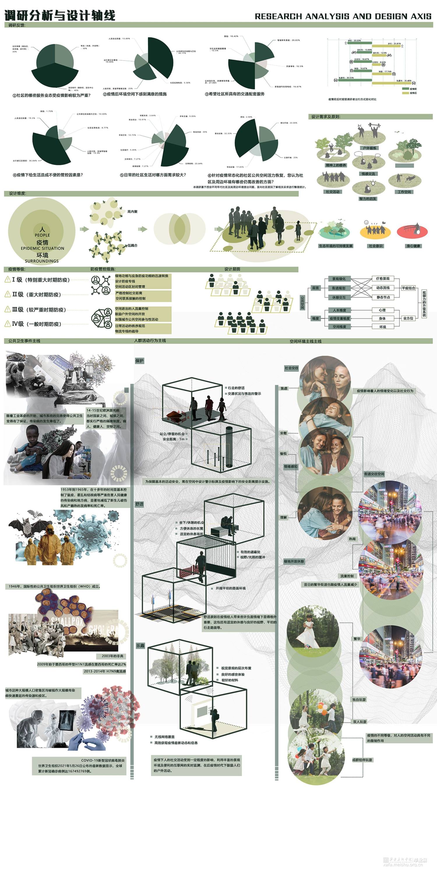 本毕业设计以“平战结合”方式构建突发公共卫生事件规划体系的设计应对策略,通过梳理全球疫情背景、区位分析、实地调研等方法,从疫情本身、人的活动和环境空间三个维度展开三方面轴线的探索,选取西安市三个不同年代的社区进行设计与研究,从而引导后疫情时代下的城市公共空间设计,引用奥地利散文家Hofmannsthal的一句话:To grow mature is to separate more distinctly, to connect more closely.(所谓成熟,就是分离的更加清晰,而联结的更加紧密),后疫情时代下,人与人之间的关系亦是如此,是亲近不得又不愿分离太远,是高内聚低耦合,探寻距离间更长久的关系,发掘城市公共空间的面对频繁突发公共卫生事件的抵御力,使之从频发突发的公共卫生事件的影响中得以恢复,这种探索,给城市预见了未来趋向的可能性——抵御城市化所带来的社会风险,从而设计可持续城市化的解决方案。