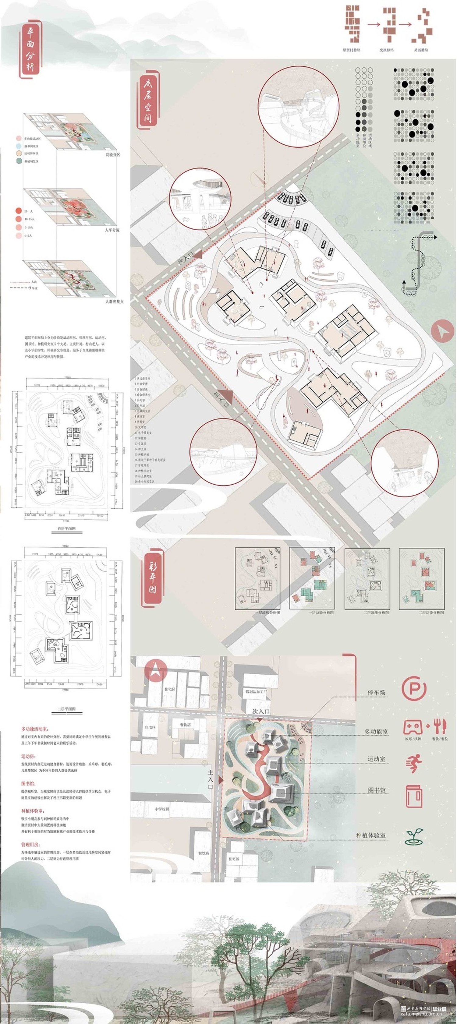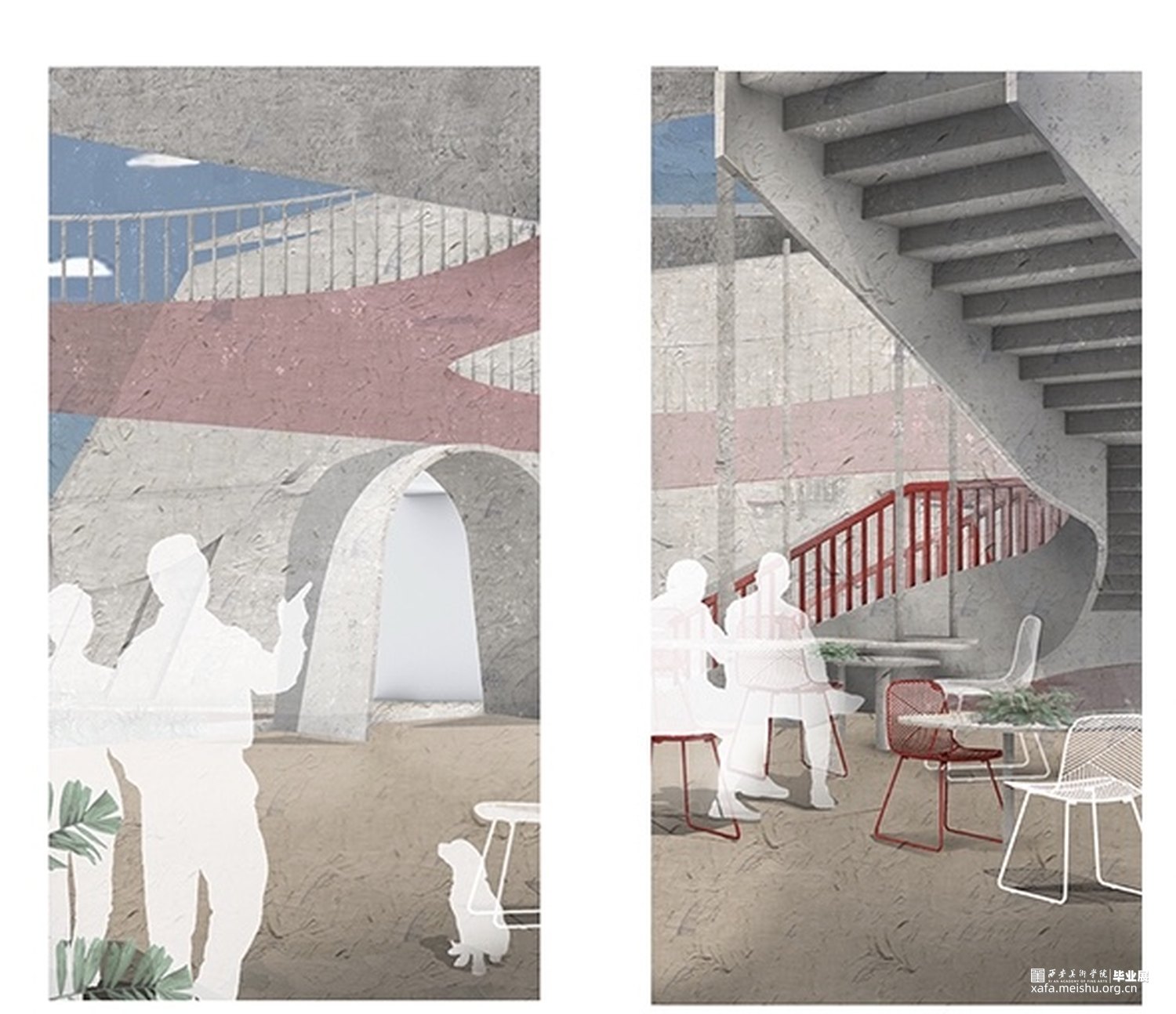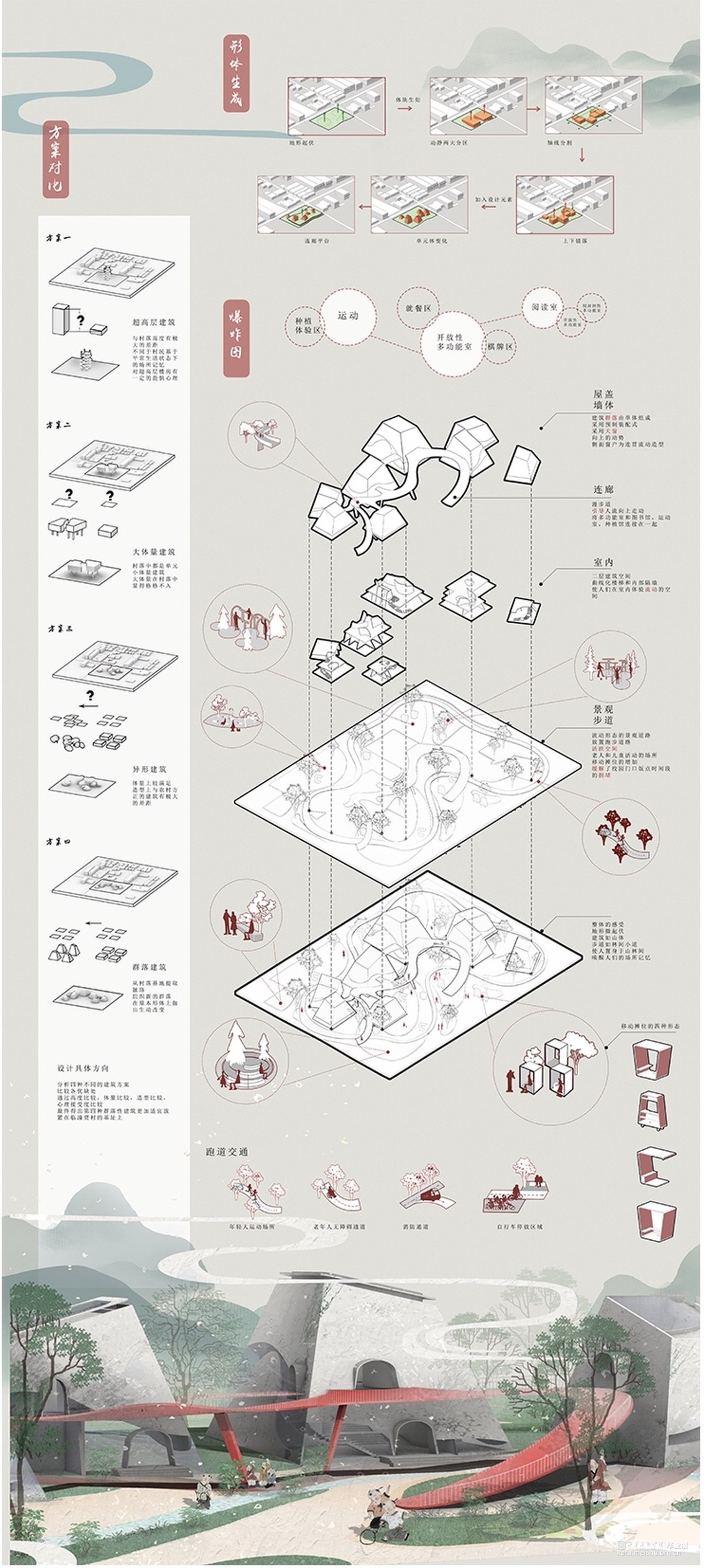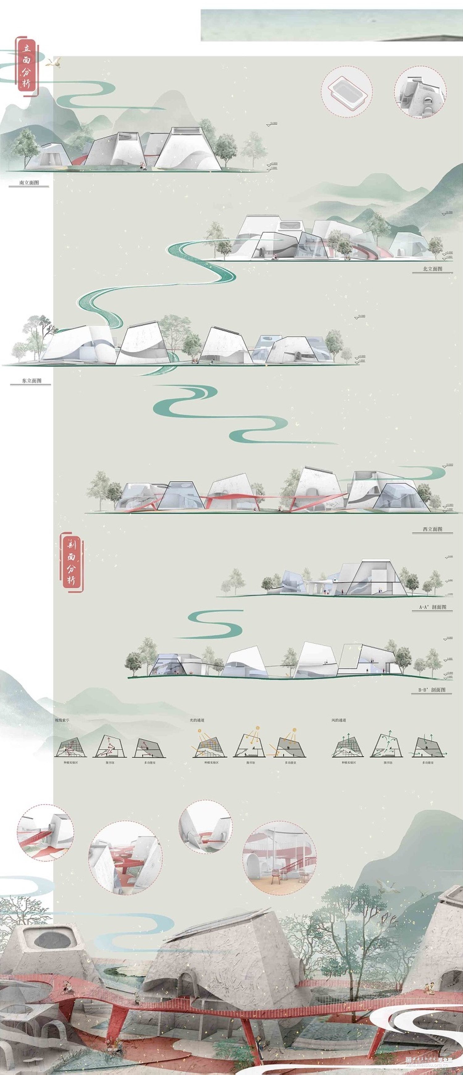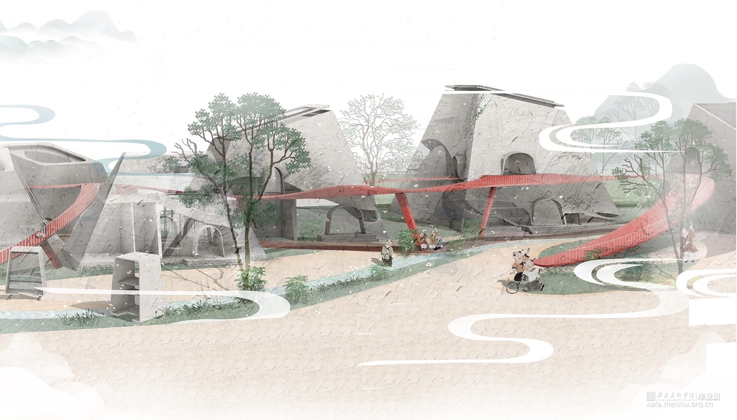 研究依托现代符号学、文化地理学等知识结构,将关中地区传统村落的肌理特征解读纳入本土语境之下,将《山海经》中夸父逐日的故事元素进行提取,抽象出“向上””坚持不懈“的精神,以及故事图像化后的”山脉“”跌宕起伏“,转化为空间中的语言,同时平面设计中结合当地贾村的建筑脉络肌理,形象上考虑村民心理接受度及场所记忆,不过于跳脱贾村的建筑形制,同文化、规则进行一种回溯式的语义还原,提炼出人为扰动较小、贴近历史原真、益于自组织活力恢复、多功能多普适性的开发策略。并在其弥补配套设施的基础上,在建筑当中提取并涉入极具地域特色的元素和当地特有的文化,激发非典型性农村的趣味性和独特风貌。满足平常村民需求基础上,并为未来推动农村的引入游客模式,最大化发挥活动空间的利用价值。
