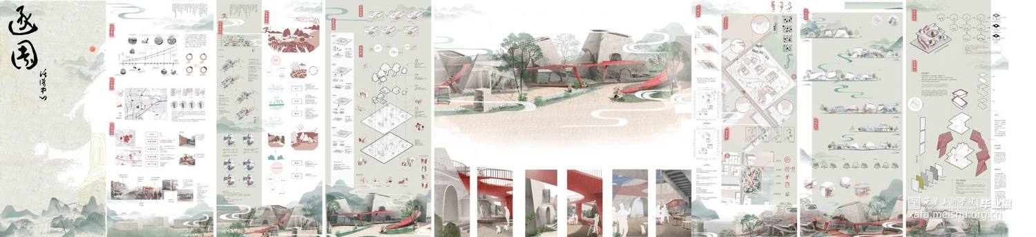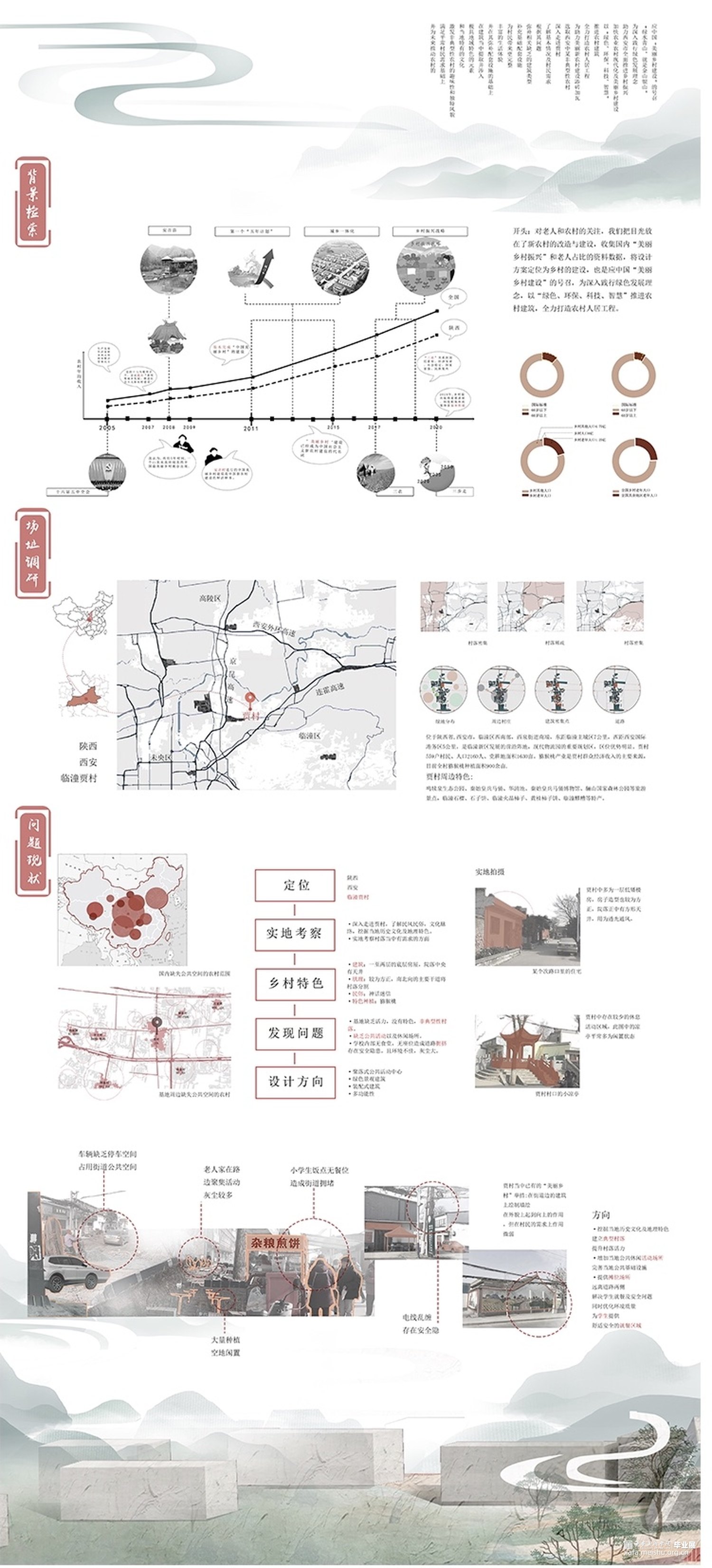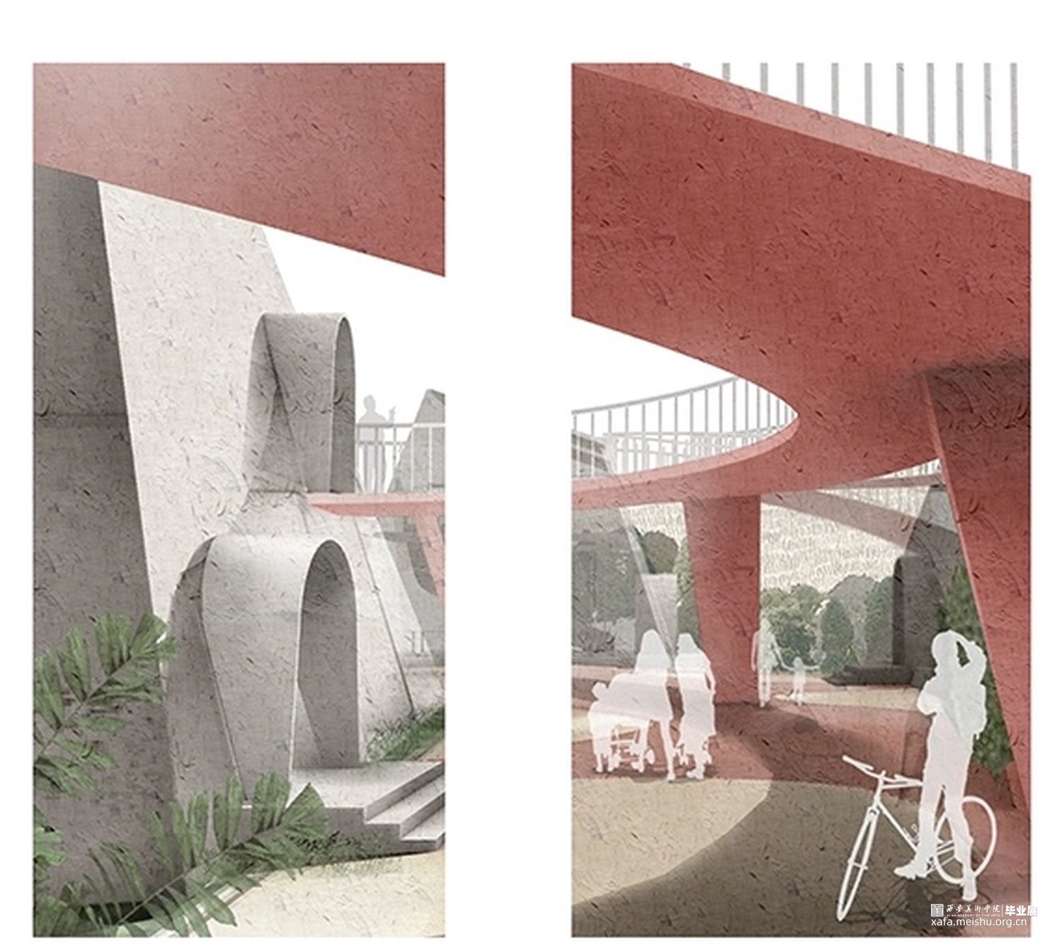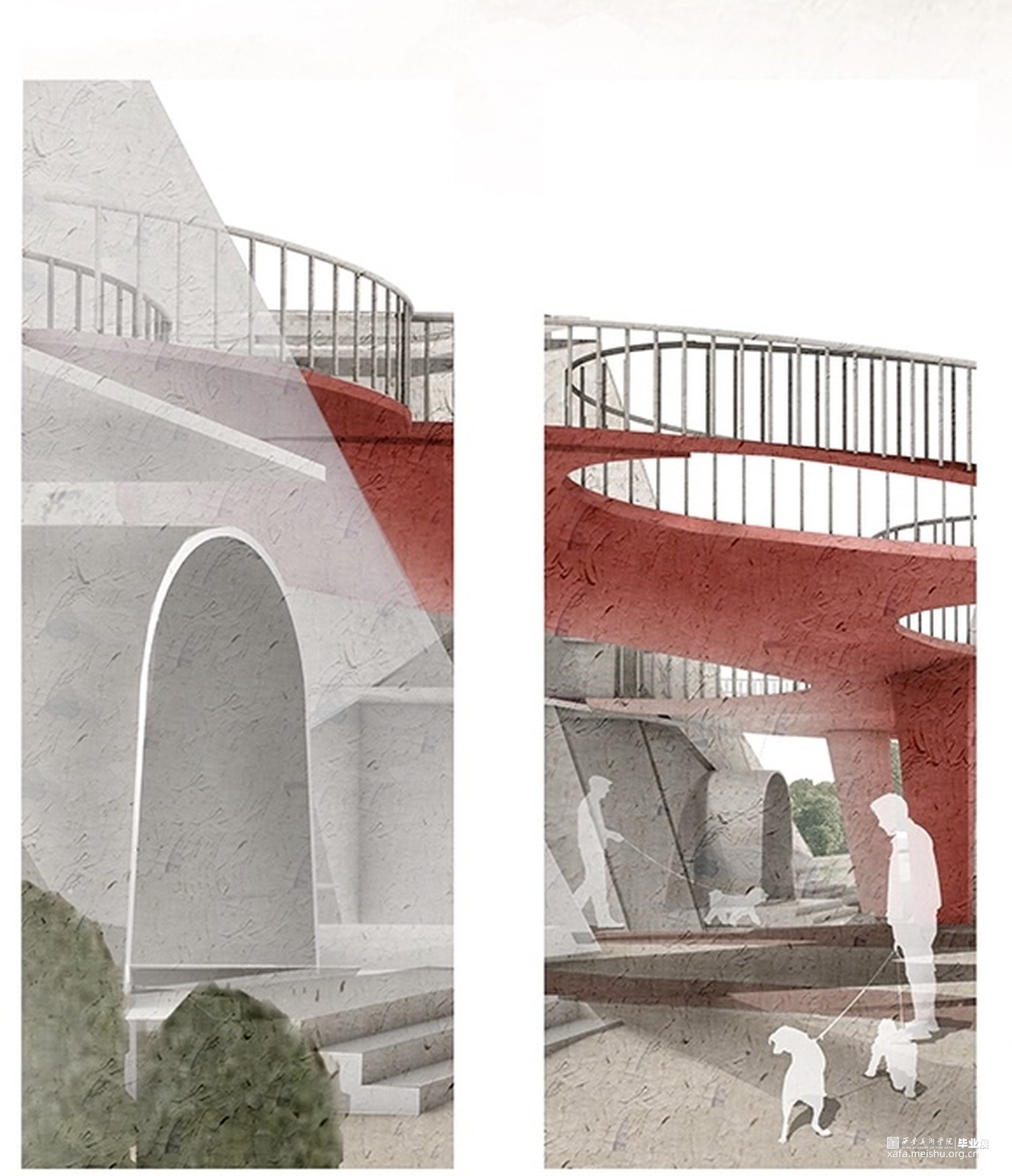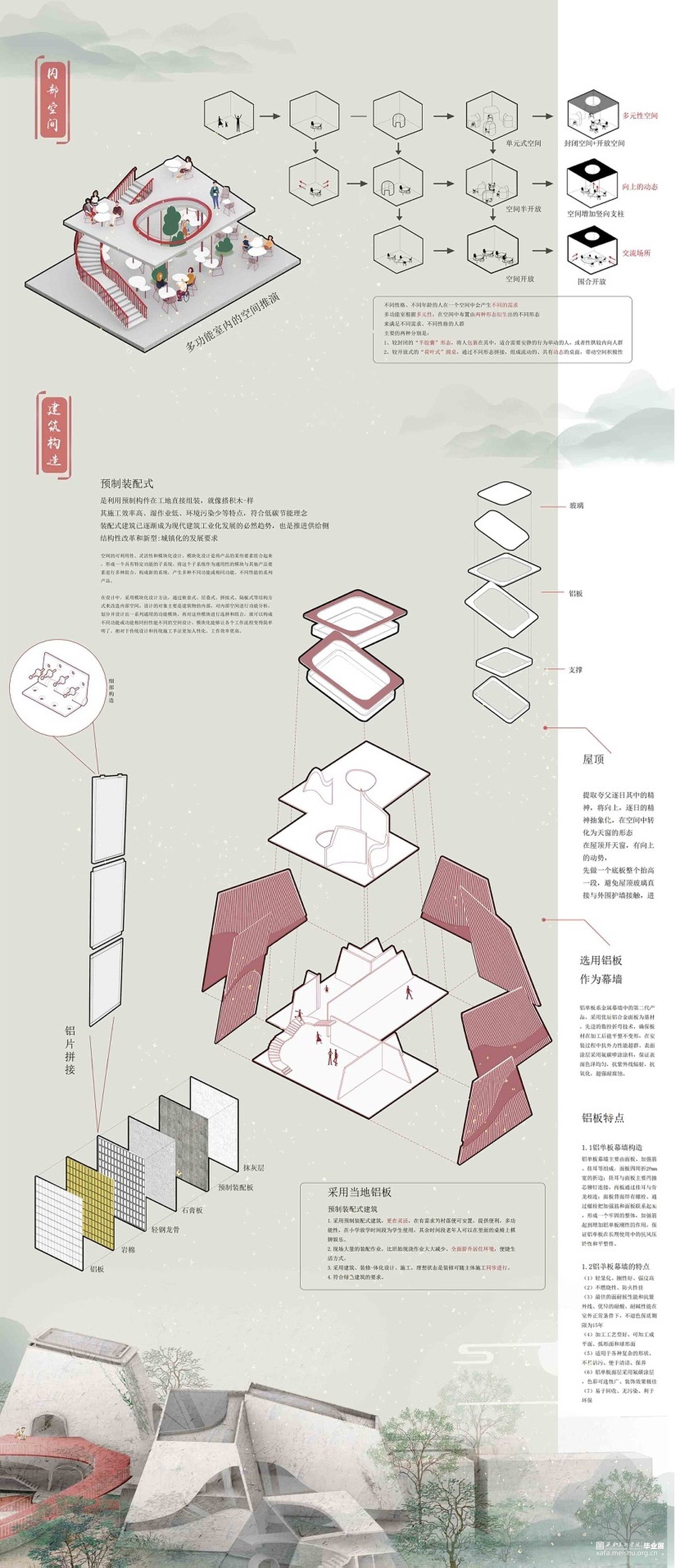 研究依托现代符号学、文化地理学等知识结构,将关中地区传统村落的肌理特征解读纳入本土语境之下,将《山海经》中夸父逐日的故事元素进行提取,抽象出“向上””坚持不懈“的精神,以及故事图像化后的”山脉“”跌宕起伏“,转化为空间中的语言,同时平面设计中结合当地贾村的建筑脉络肌理,形象上考虑村民心理接受度及场所记忆,不过于跳脱贾村的建筑形制,同文化、规则进行一种回溯式的语义还原,提炼出人为扰动较小、贴近历史原真、益于自组织活力恢复、多功能多普适性的开发策略。并在其弥补配套设施的基础上,在建筑当中提取并涉入极具地域特色的元素和当地特有的文化,激发非典型性农村的趣味性和独特风貌。满足平常村民需求基础上,并为未来推动农村的引入游客模式,最大化发挥活动空间的利用价值。