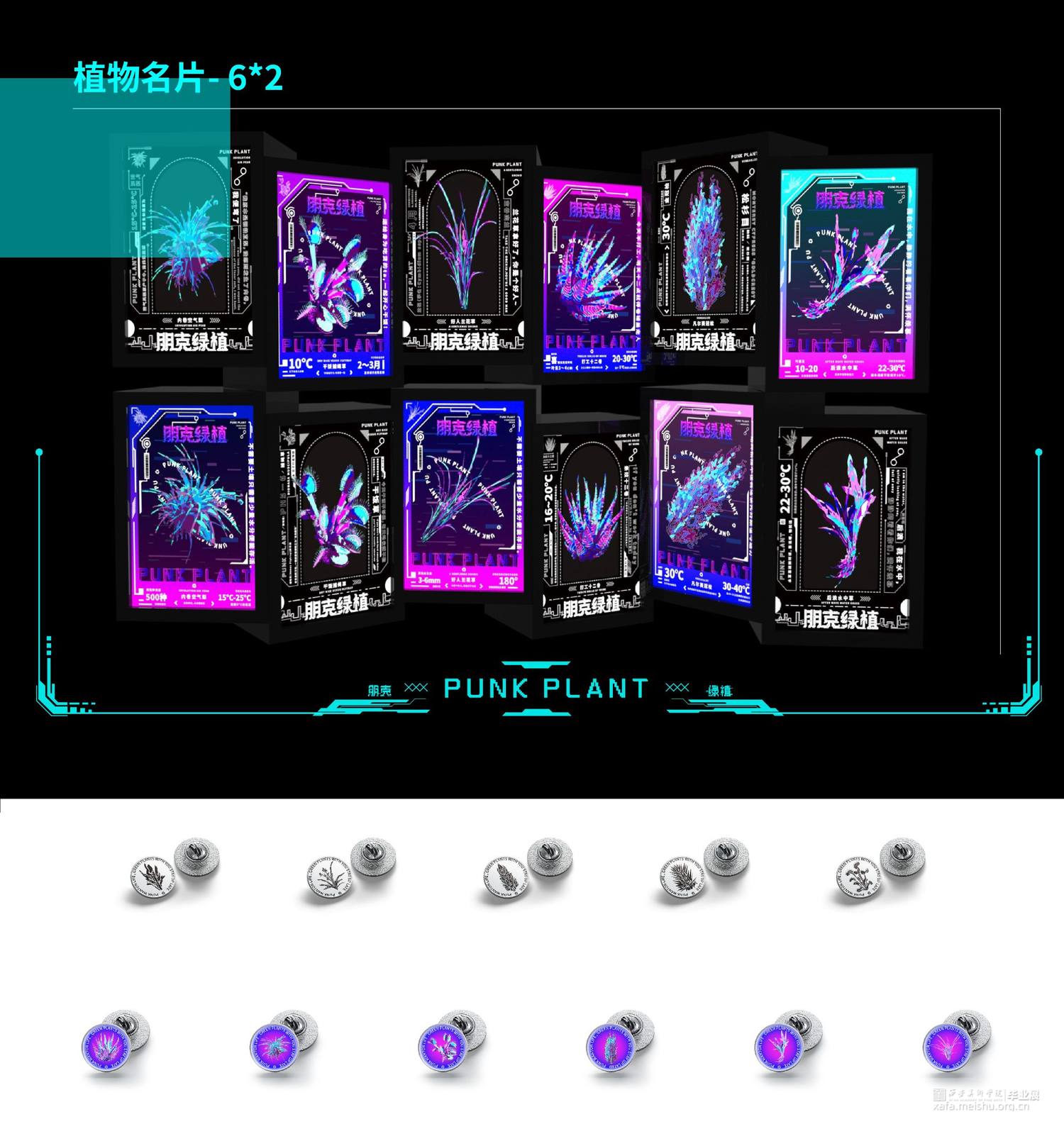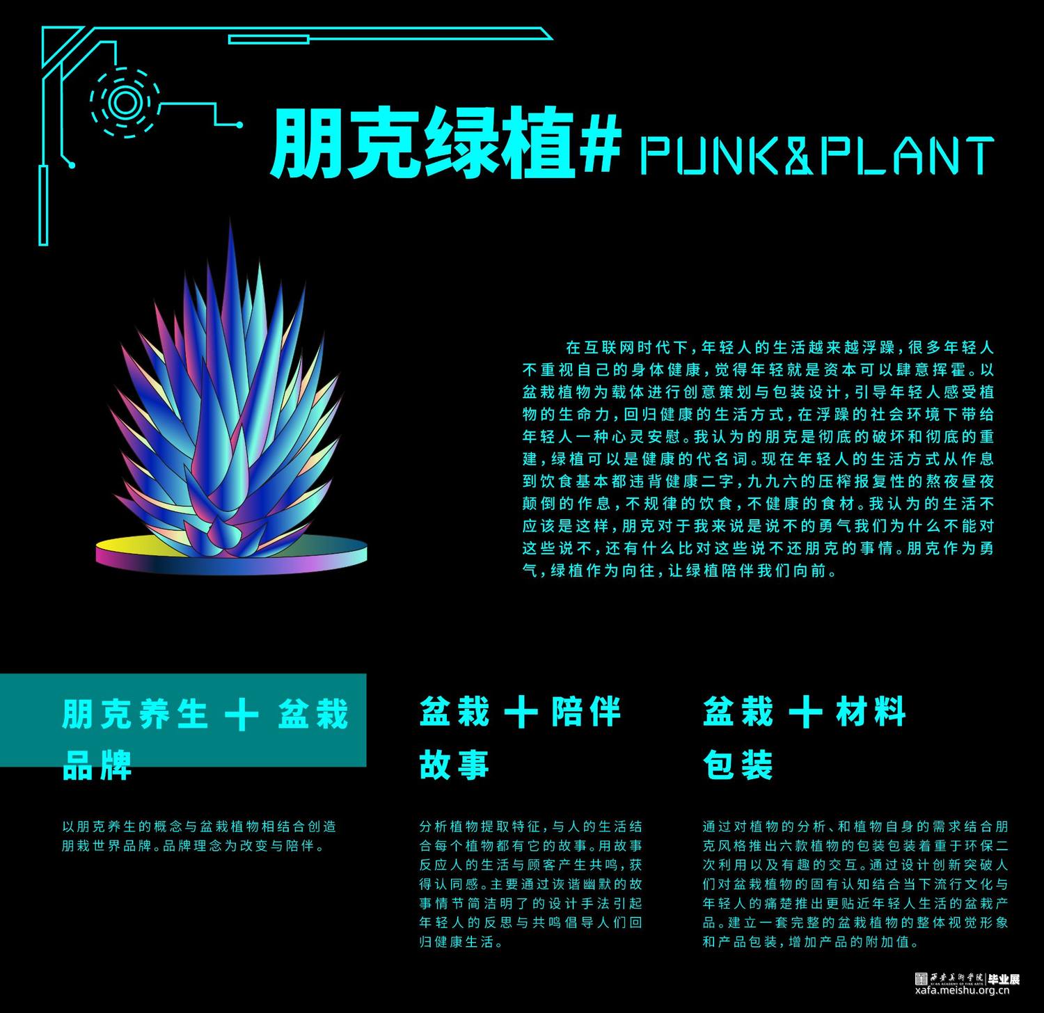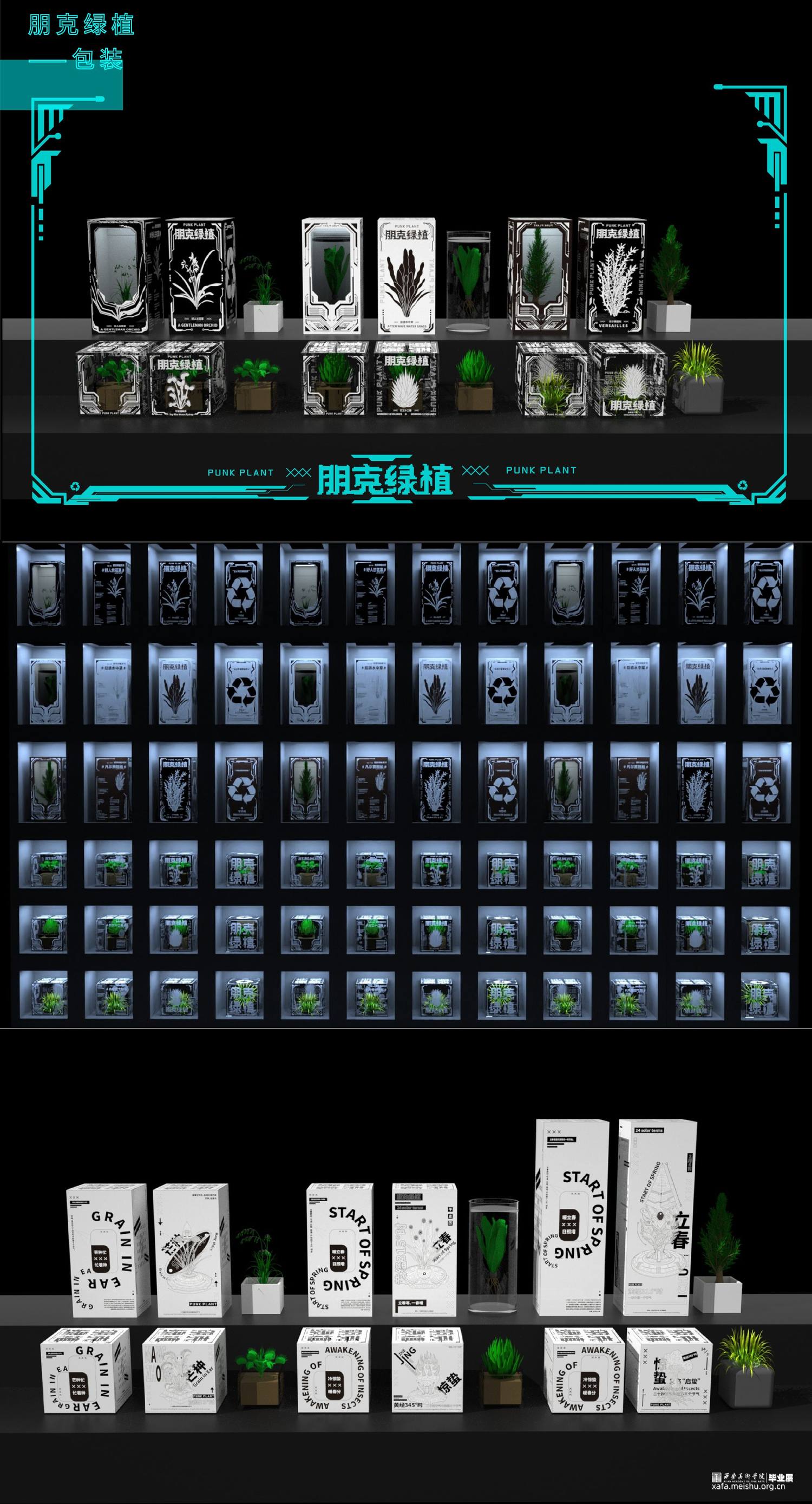 盆栽加包装:通过对植物的分析、和植物自身的需求结合朋克风格推出六款植物的包装包装着重于环保二次利用以及有趣的交互。通过设计创新突破人们对盆栽植物的固有认知结合当下流行文化与年轻人的痛楚推出更贴近年轻人生活的盆栽产品。建立一套完整的盆栽植物的整体视觉形象和产品包装,增加产品的附加值。