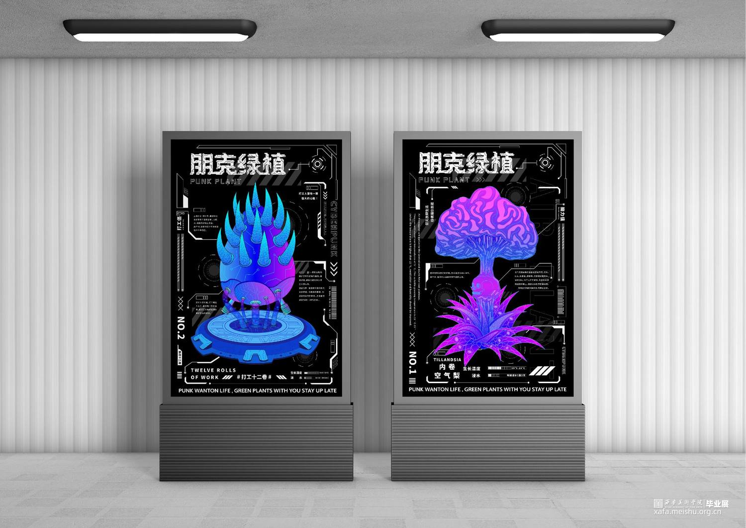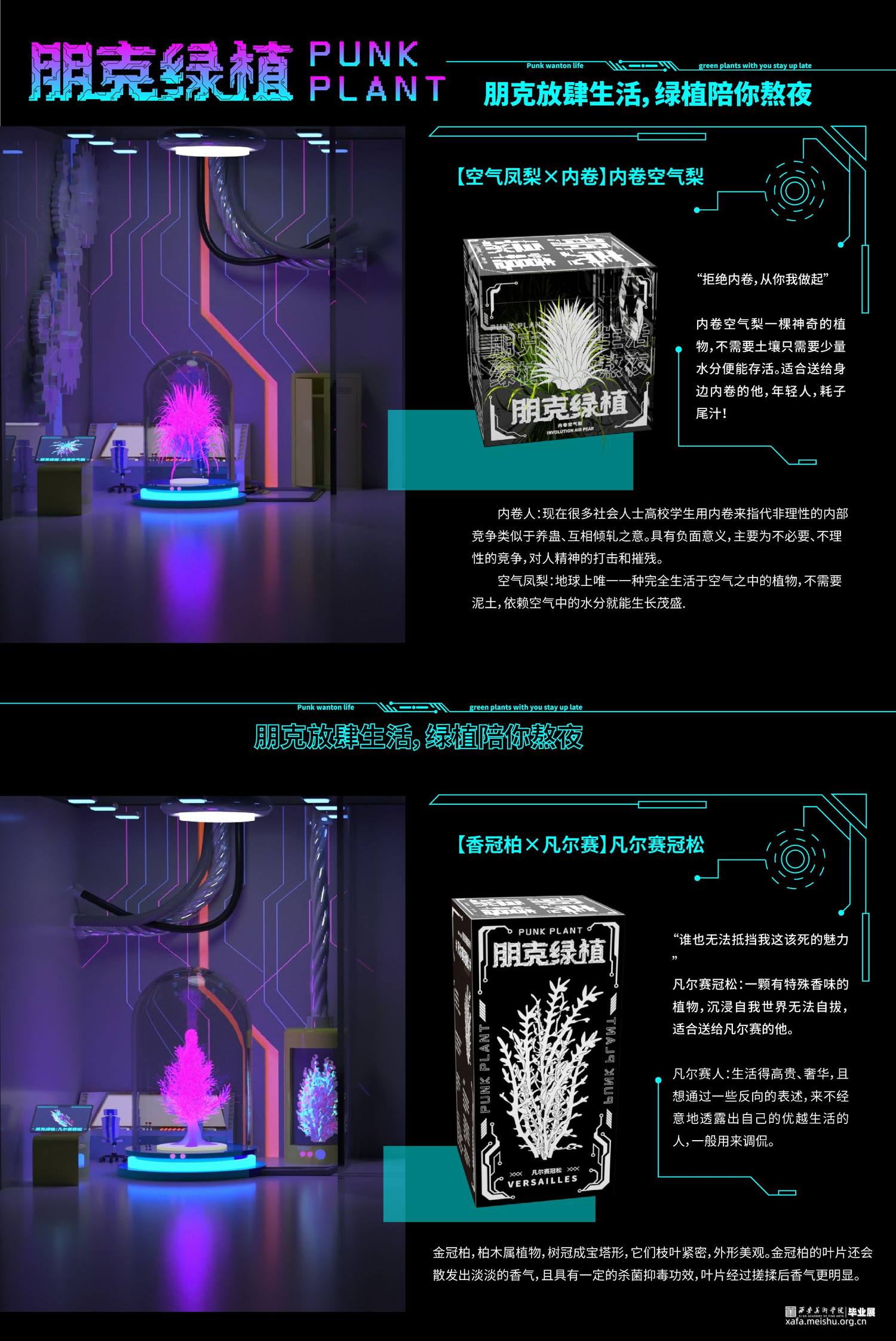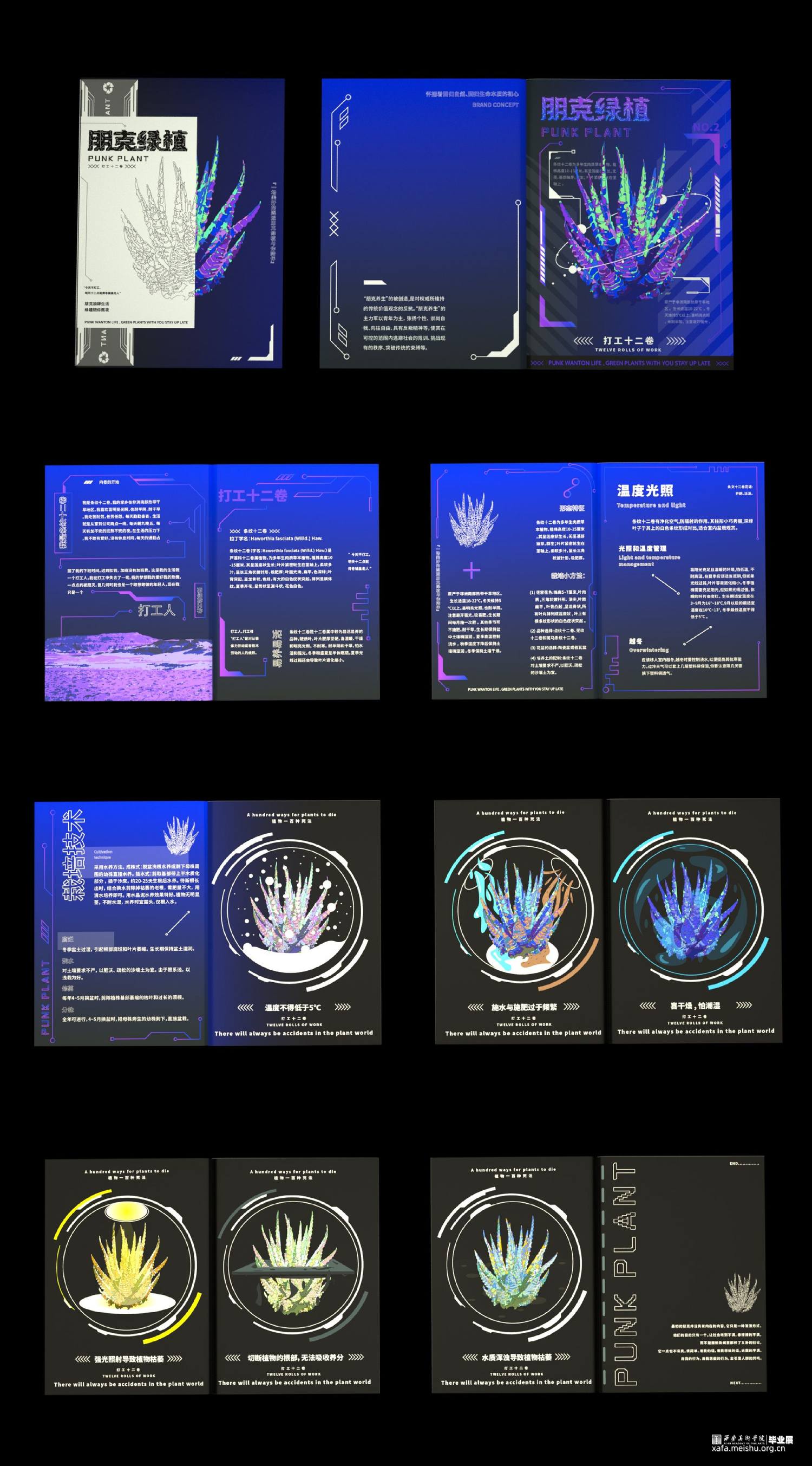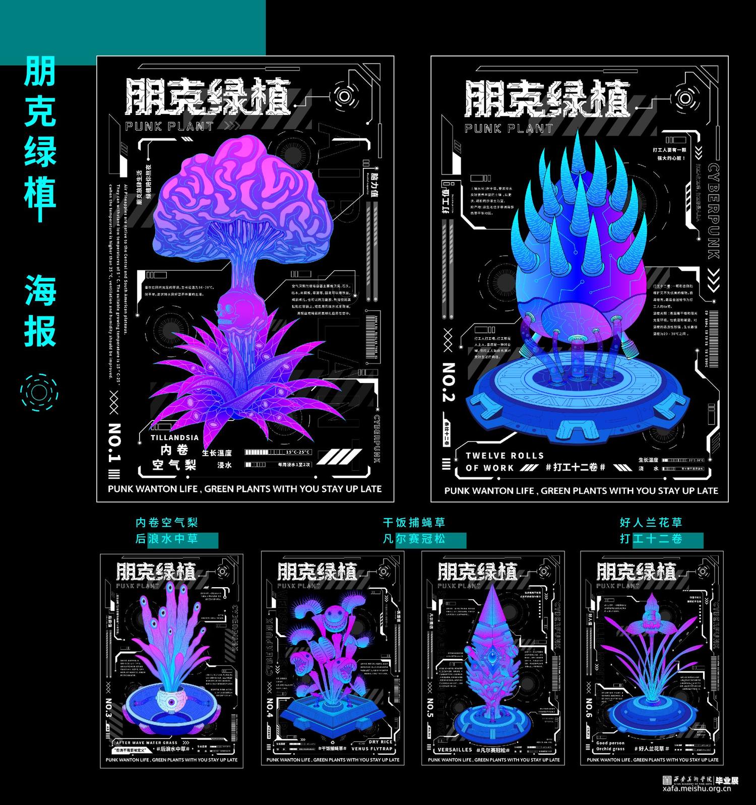 盆栽加包装:通过对植物的分析、和植物自身的需求结合朋克风格推出六款植物的包装包装着重于环保二次利用以及有趣的交互。通过设计创新突破人们对盆栽植物的固有认知结合当下流行文化与年轻人的痛楚推出更贴近年轻人生活的盆栽产品。建立一套完整的盆栽植物的整体视觉形象和产品包装,增加产品的附加值。