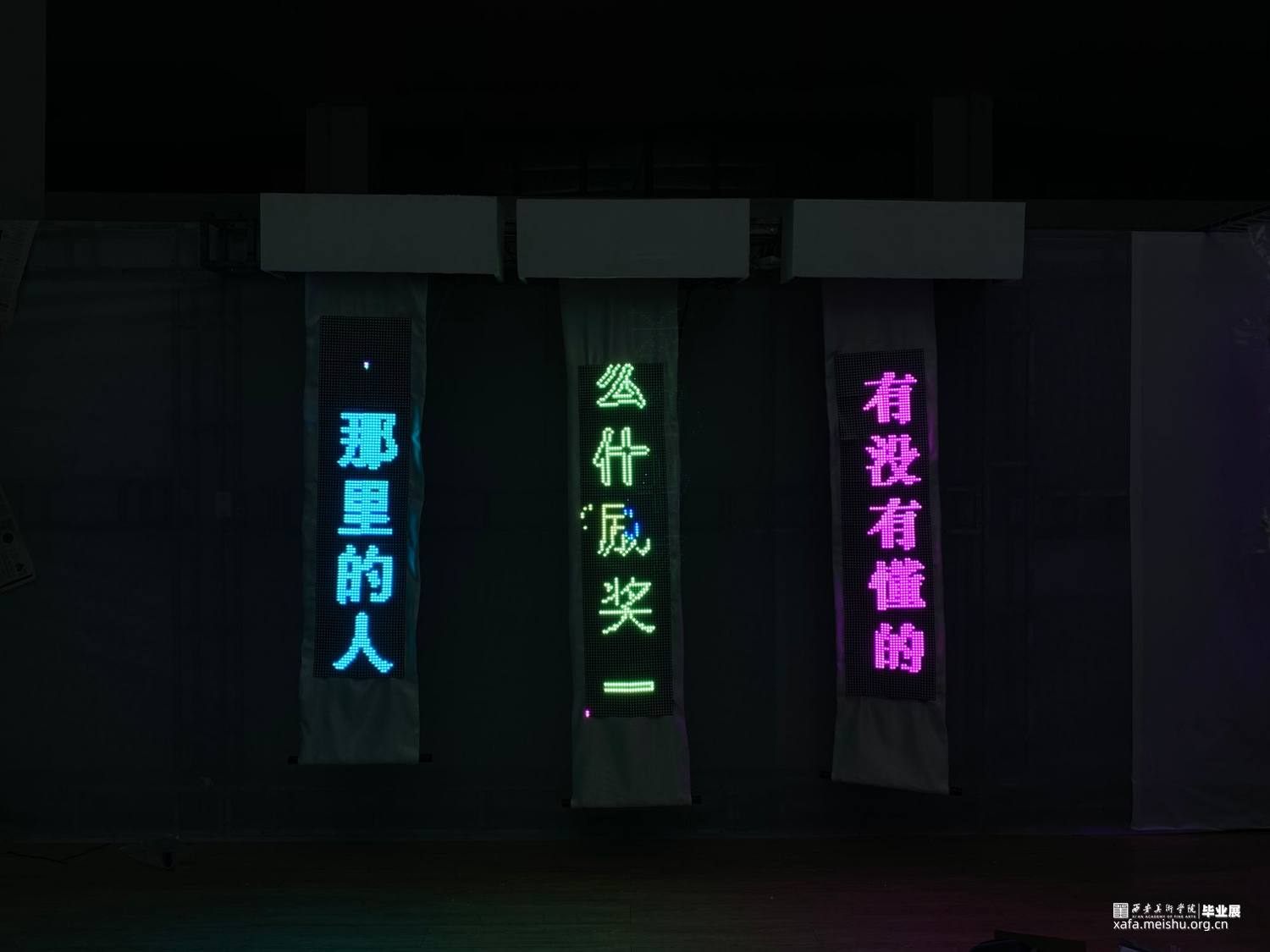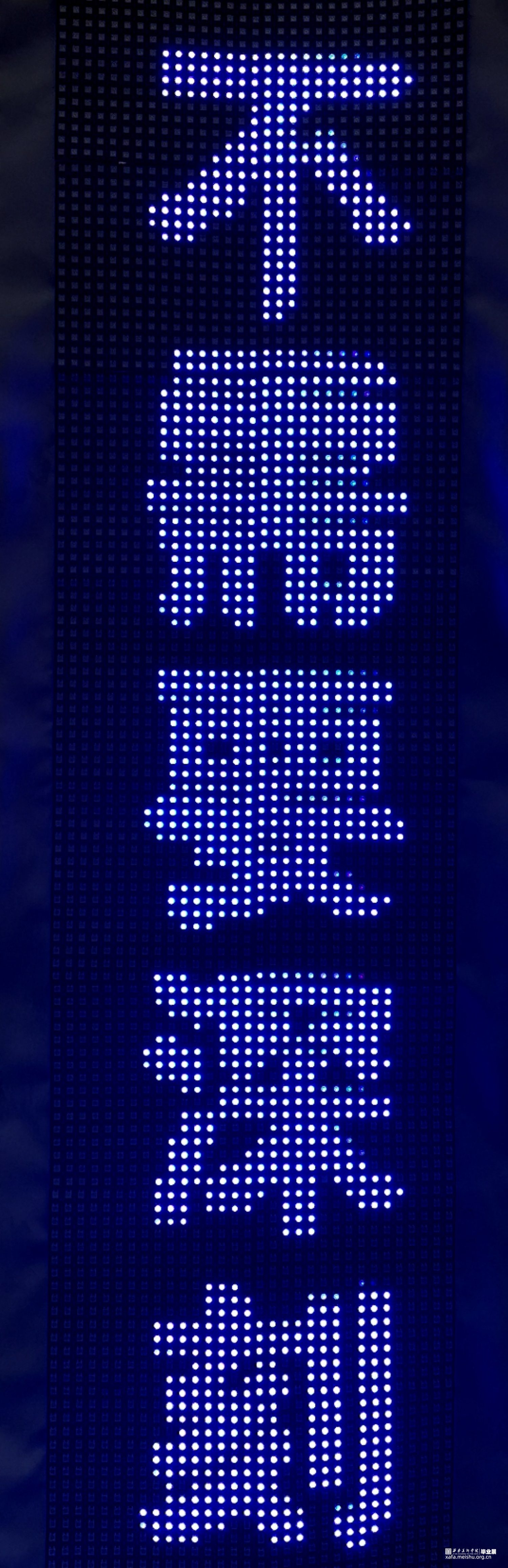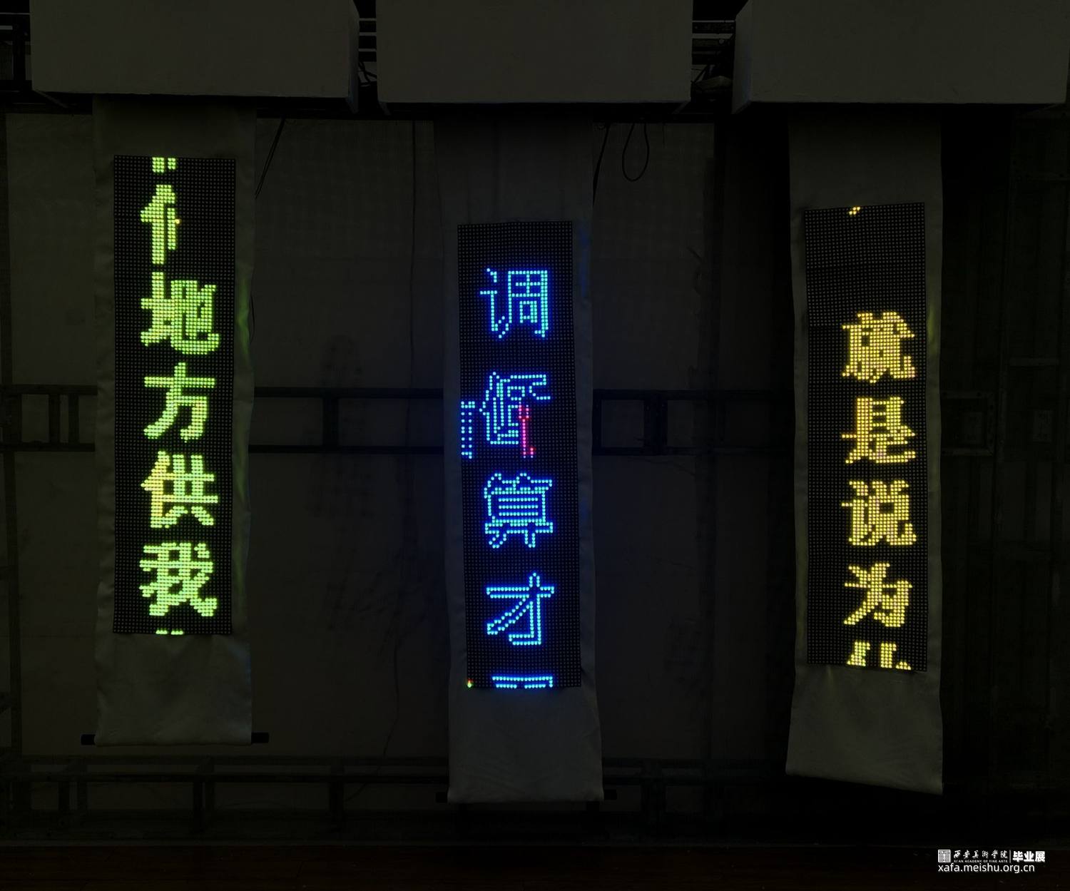 窗帘布仿制的卷轴上装有led屏,三条屏显示的文字来源于街头和网络,组成现实与虚拟混合成的超文本。卷轴往往与典雅、严肃相联系,卷轴的内容也往往是经典、箴言,作品用卷轴的所指,使用窗帘布与LED屏等与生活息息相关的物品组成仿制的伪卷轴。文字内容来源于街头以及网络迷因,以当代青年亚文化的网络语言为例,将他们粉碎拼贴,有选择地组成超文本诗句上下滚动,这些句子无中心化、非线性,可以从文本链接的任意一点阅读。使用窗帘布、闪烁的乱码像素、破碎的语言体系呈现作品,颇具坏画主义和达达主义的讽刺意味。不明所以的闪烁文本与卷