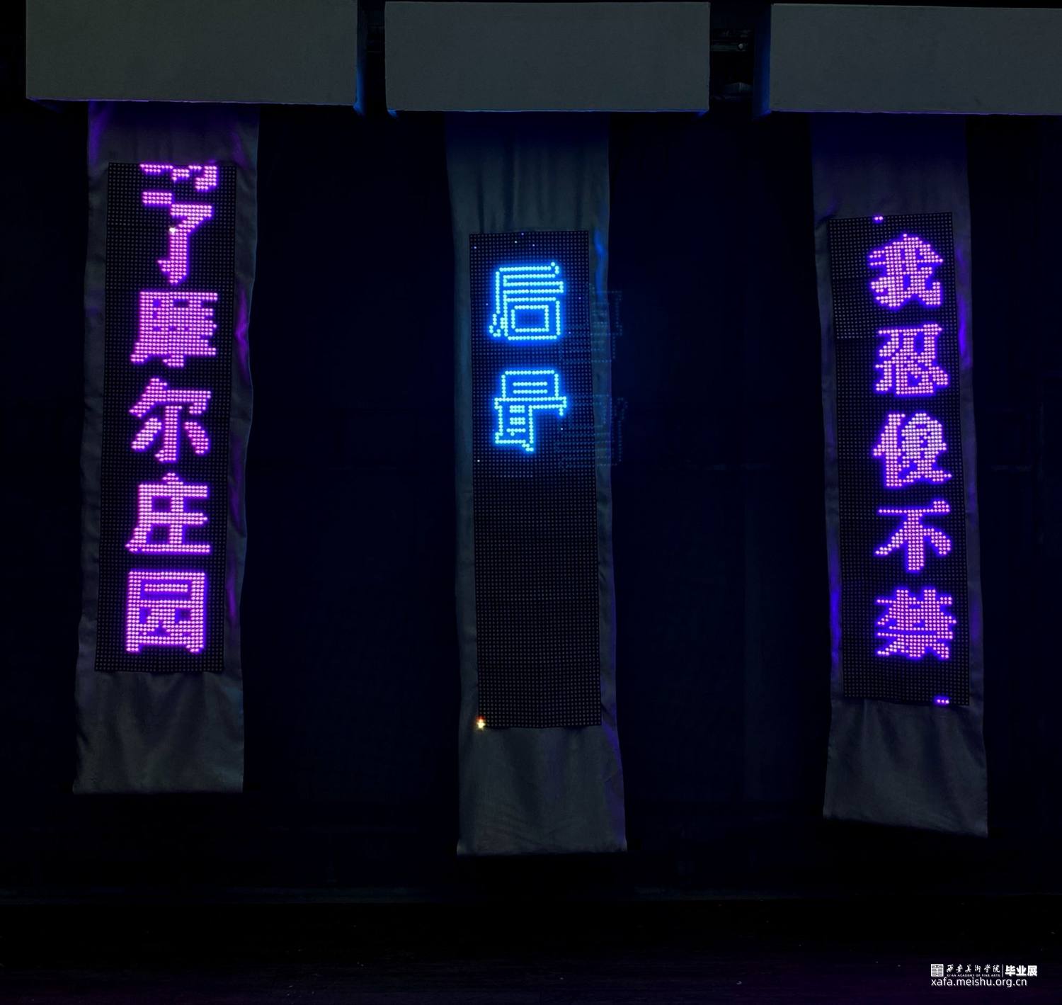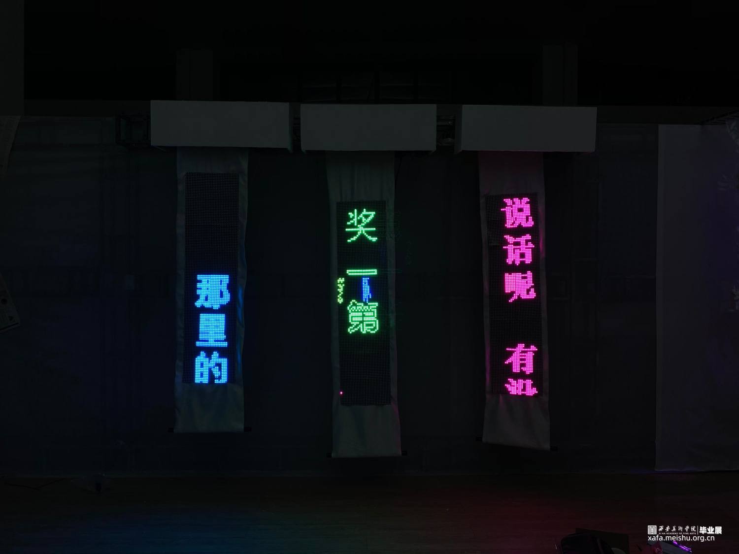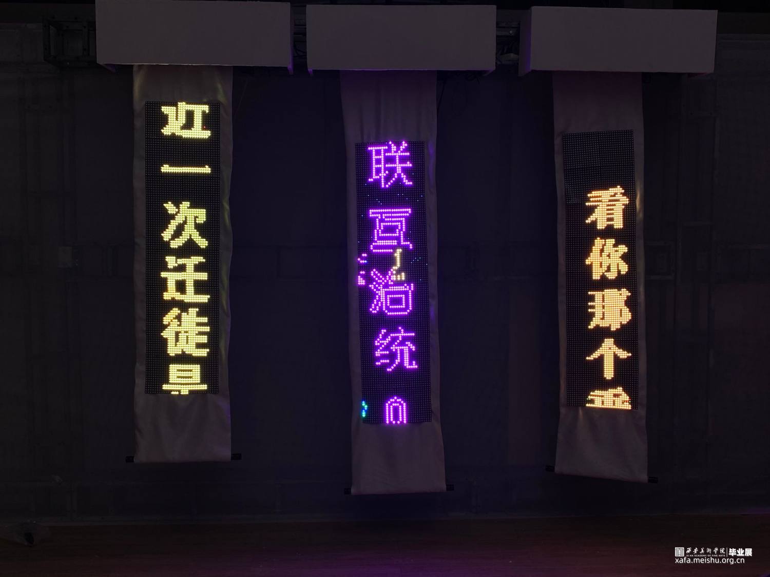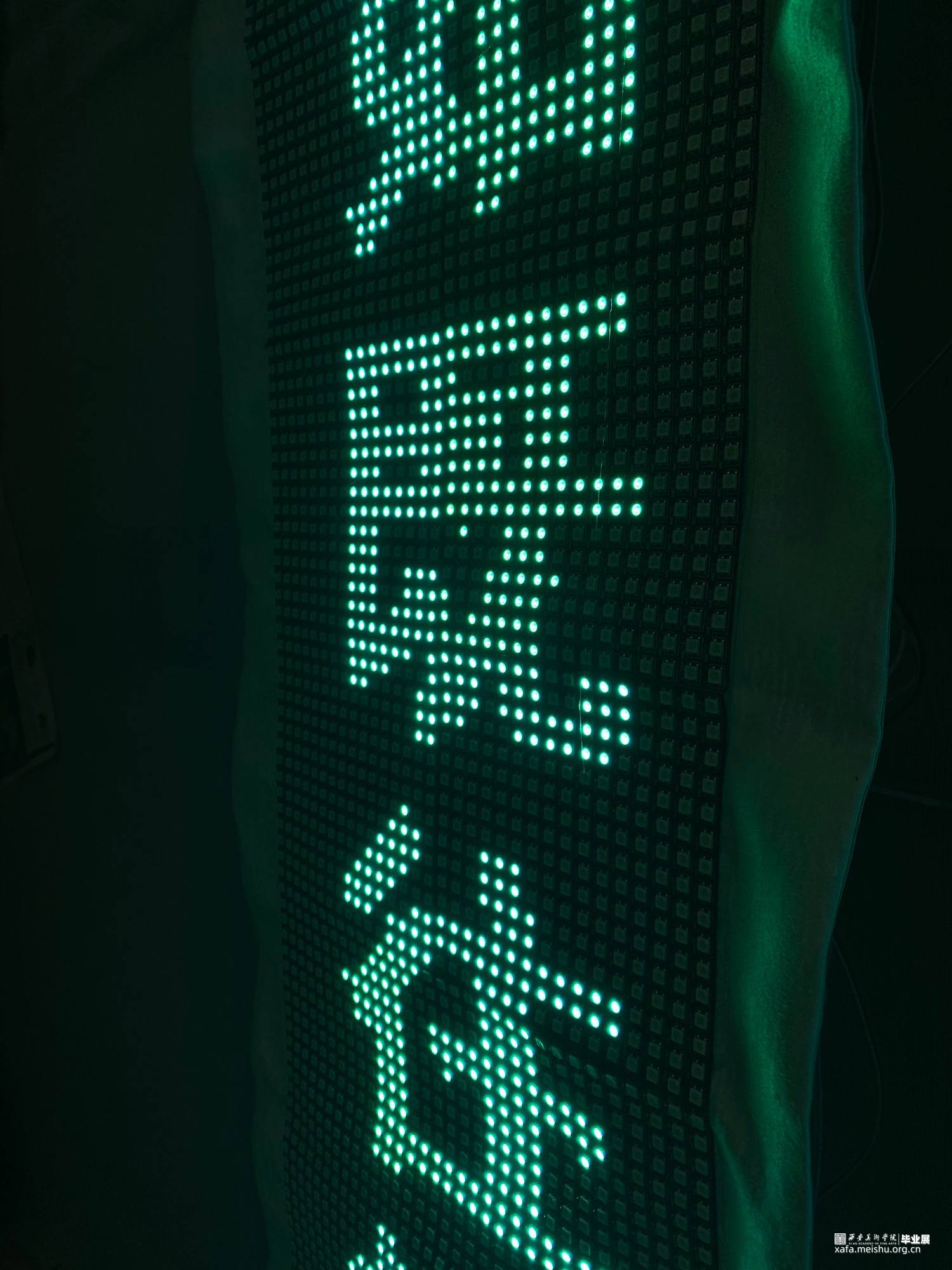 窗帘布仿制的卷轴上装有led屏,三条屏显示的文字来源于街头和网络,组成现实与虚拟混合成的超文本。卷轴往往与典雅、严肃相联系,卷轴的内容也往往是经典、箴言,作品用卷轴的所指,使用窗帘布与LED屏等与生活息息相关的物品组成仿制的伪卷轴。文字内容来源于街头以及网络迷因,以当代青年亚文化的网络语言为例,将他们粉碎拼贴,有选择地组成超文本诗句上下滚动,这些句子无中心化、非线性,可以从文本链接的任意一点阅读。使用窗帘布、闪烁的乱码像素、破碎的语言体系呈现作品,颇具坏画主义和达达主义的讽刺意味。不明所以的闪烁文本与卷