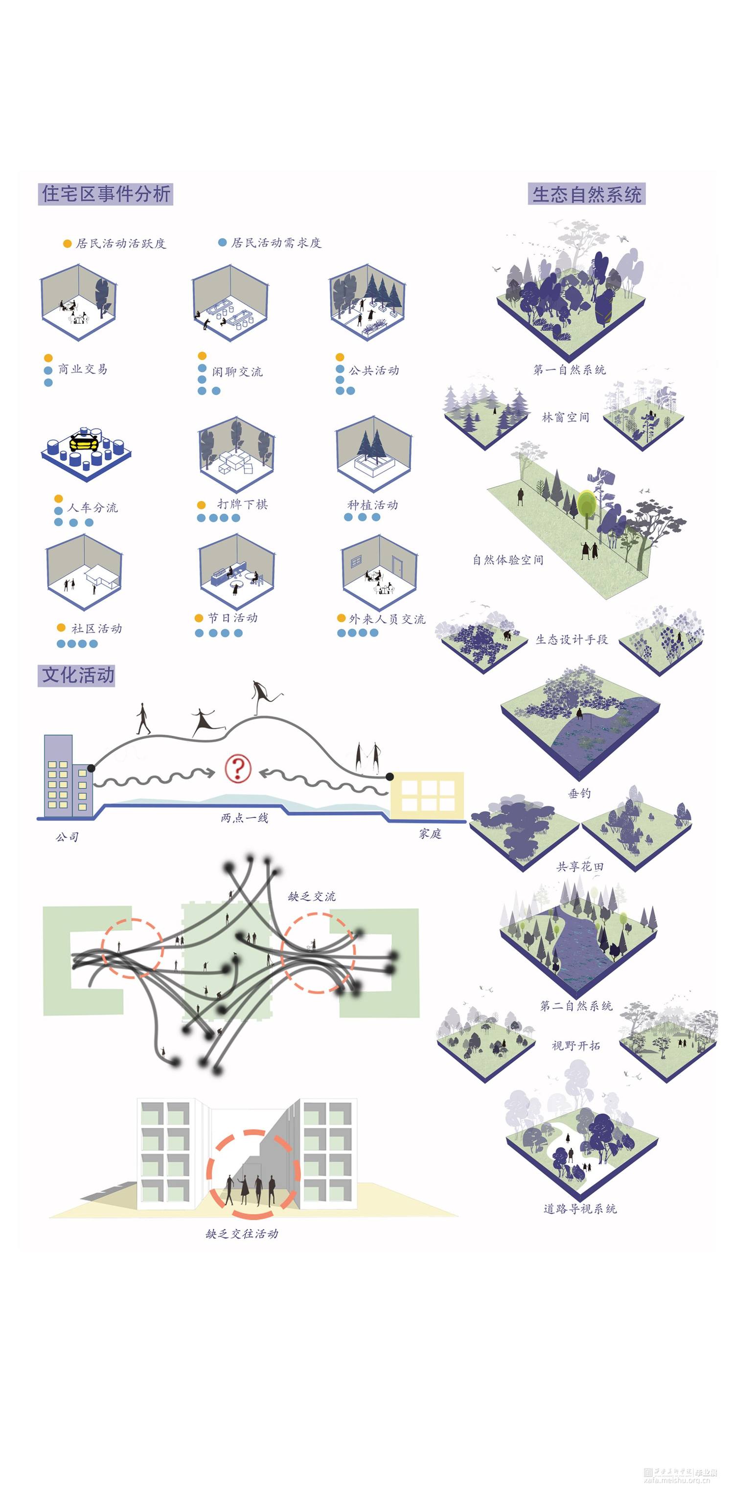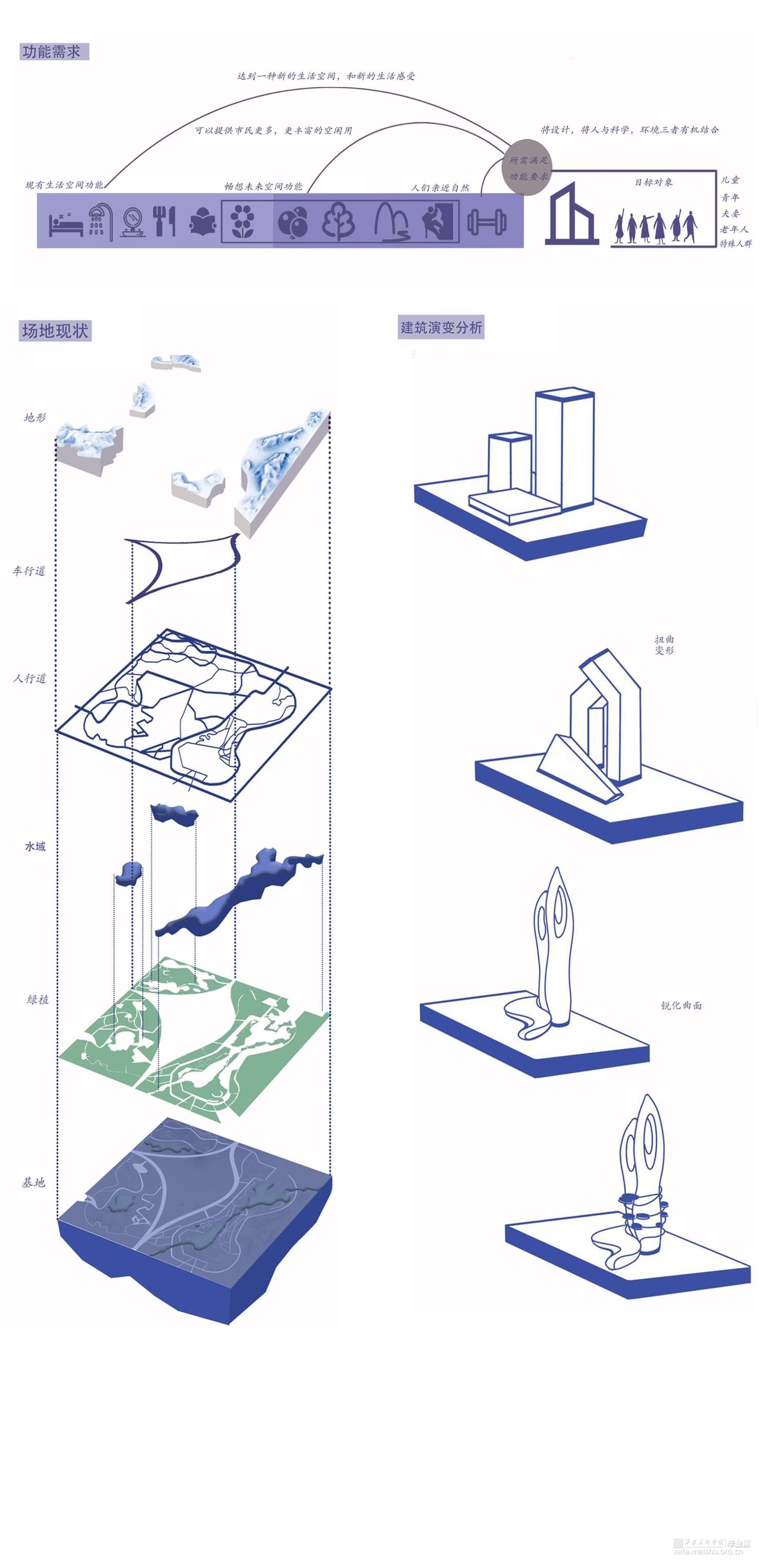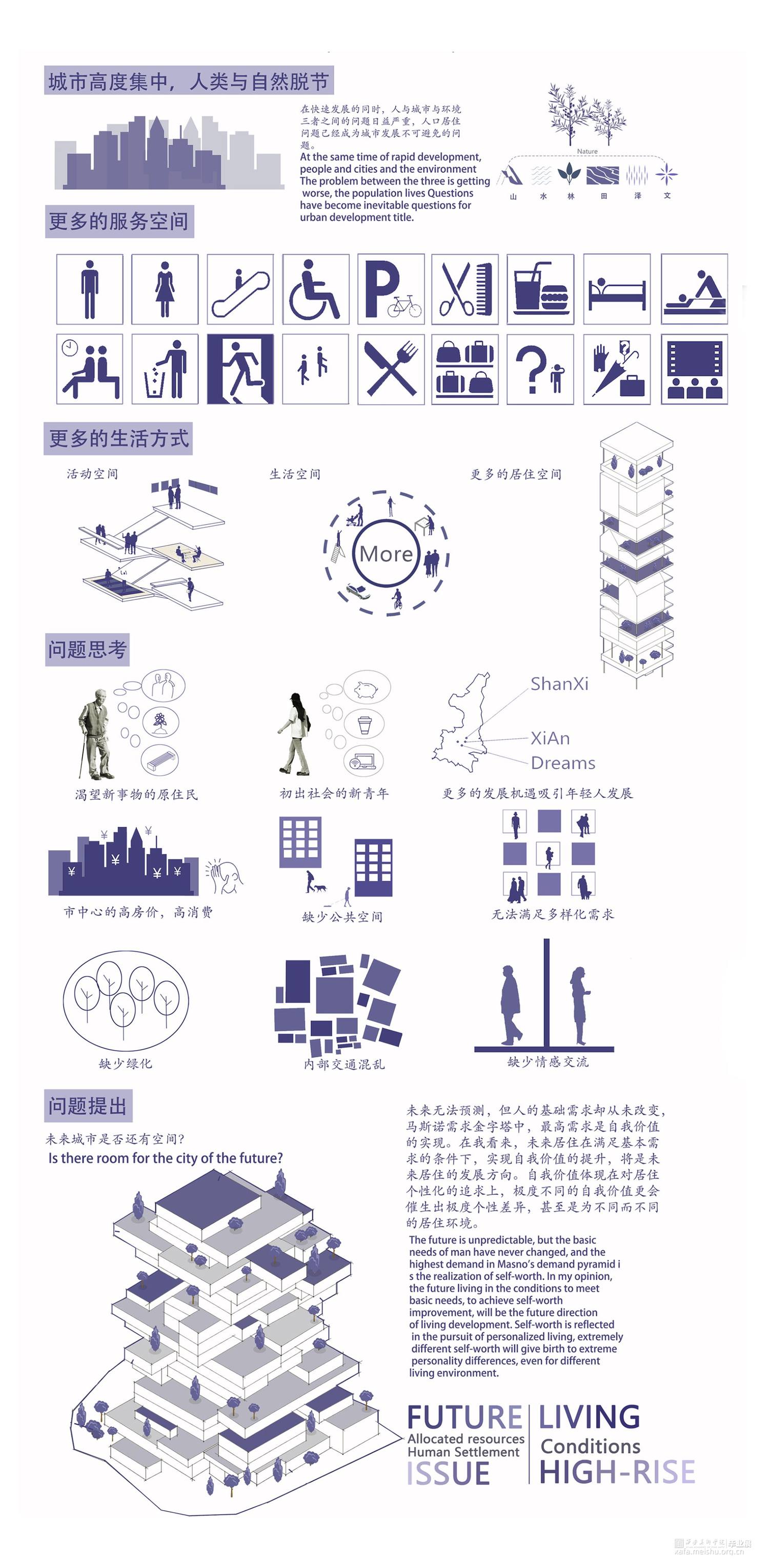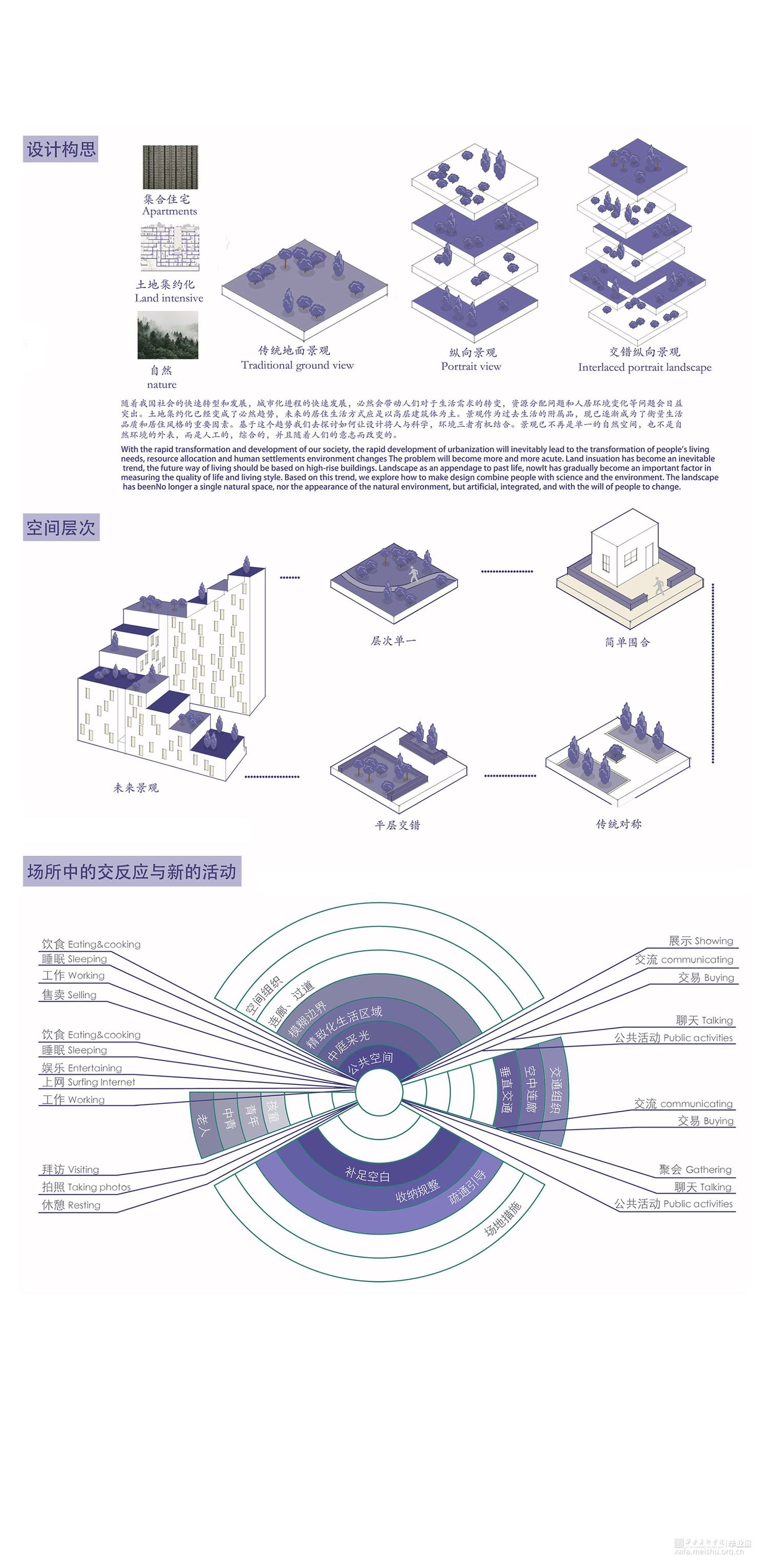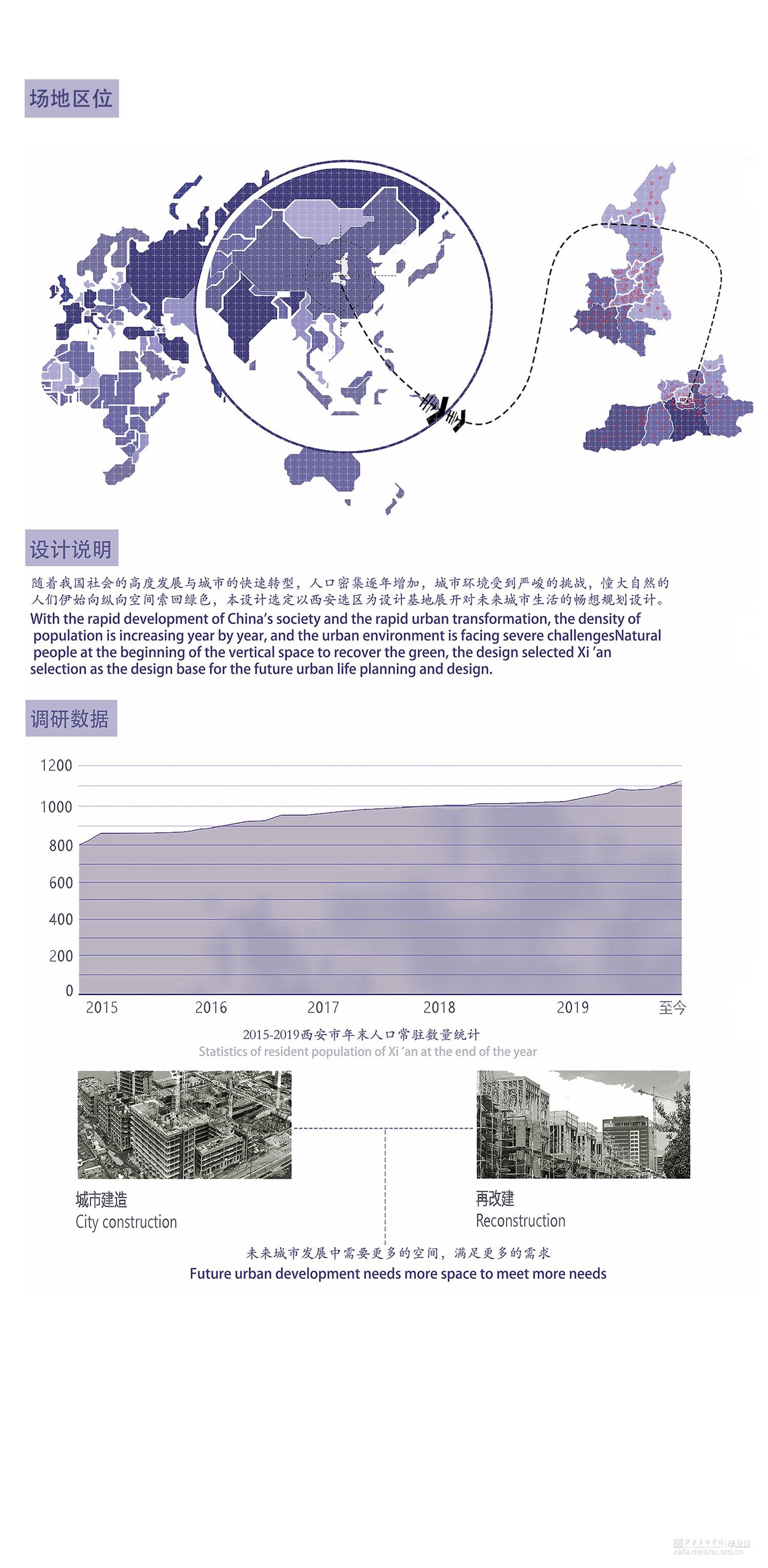 社会城市文明正处于高速发展的状态,人们口密集度逐年增长,城市环境受到严峻的挑战。目前的科技发展还不足以解决各种生态问题,现状让人担忧。文化的发展和传承的问题,西方文化的冲击和传统文化的断层致使不足以诞生好的设计项目,人们缺乏创新意识,无论是开发人员还是需求方都意识不到很多问题。基于这种现状,我们可以假想未来景观设计的模样,可以描绘一幅未来景观来展现二十年后后的环境和人们的生活状态。改变现状的途径有:对生态环境治理、环保技术、智能共享、创新城市的发展。再以这些事物发展为前提,我们构想出了本方案。